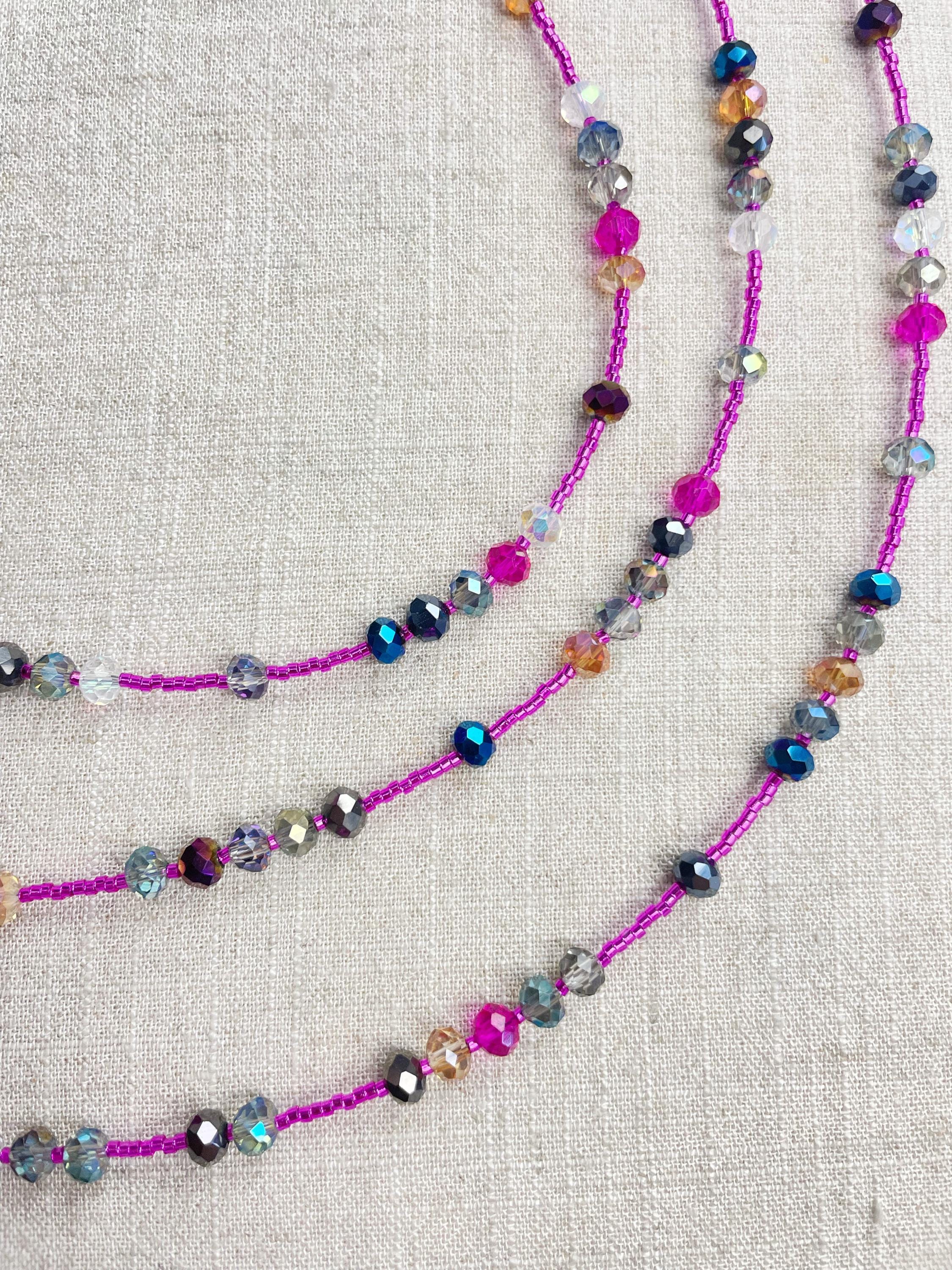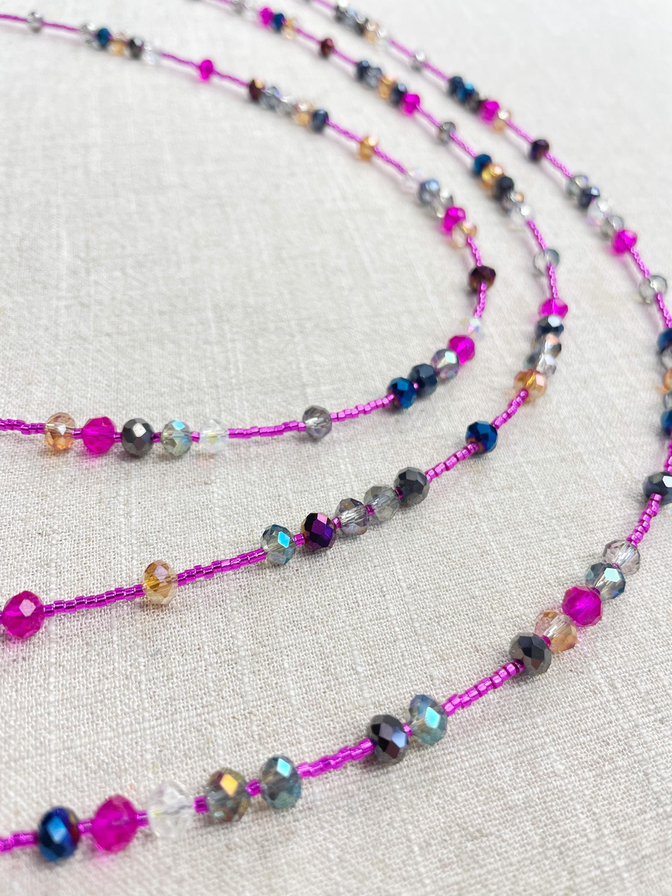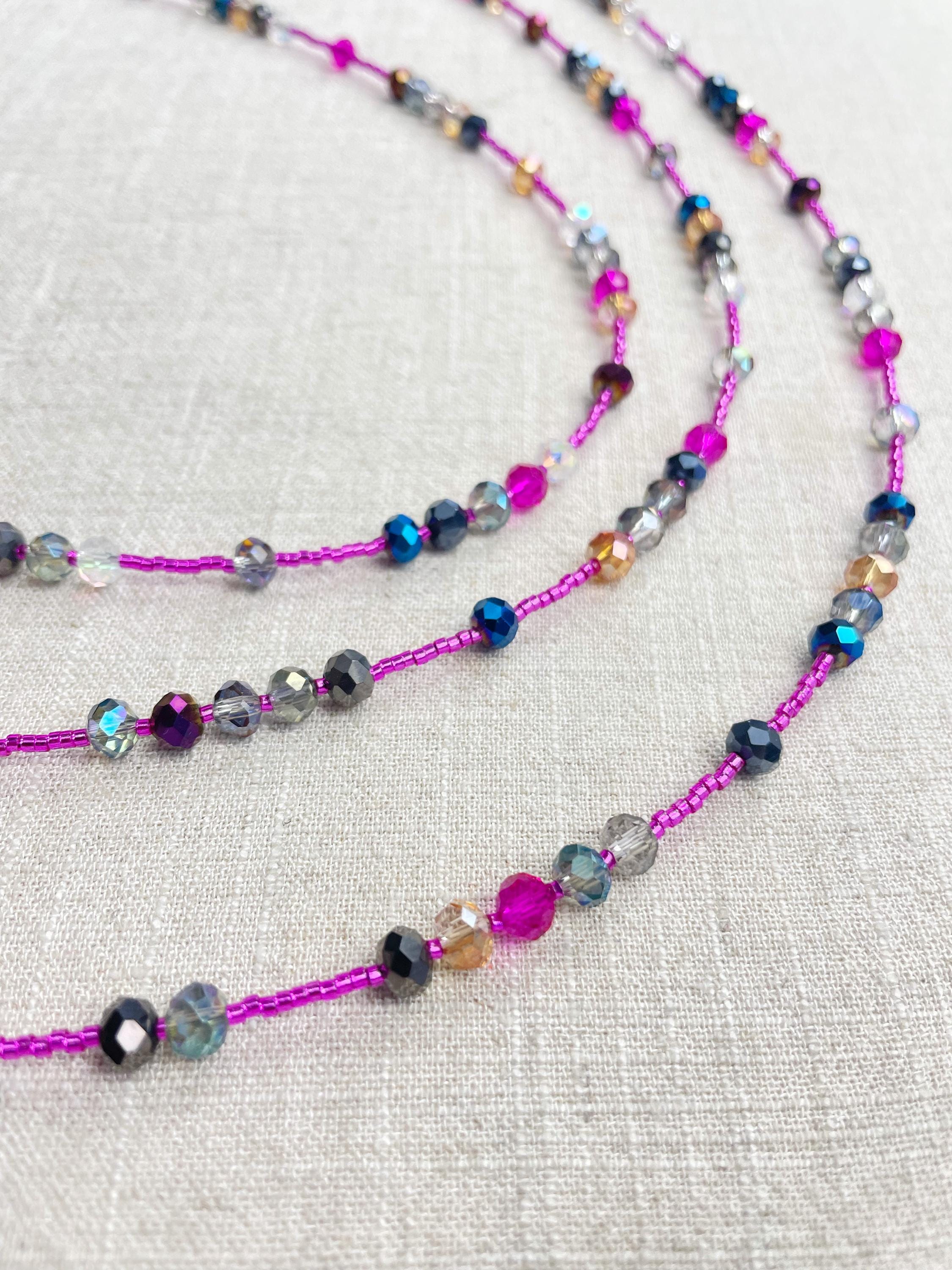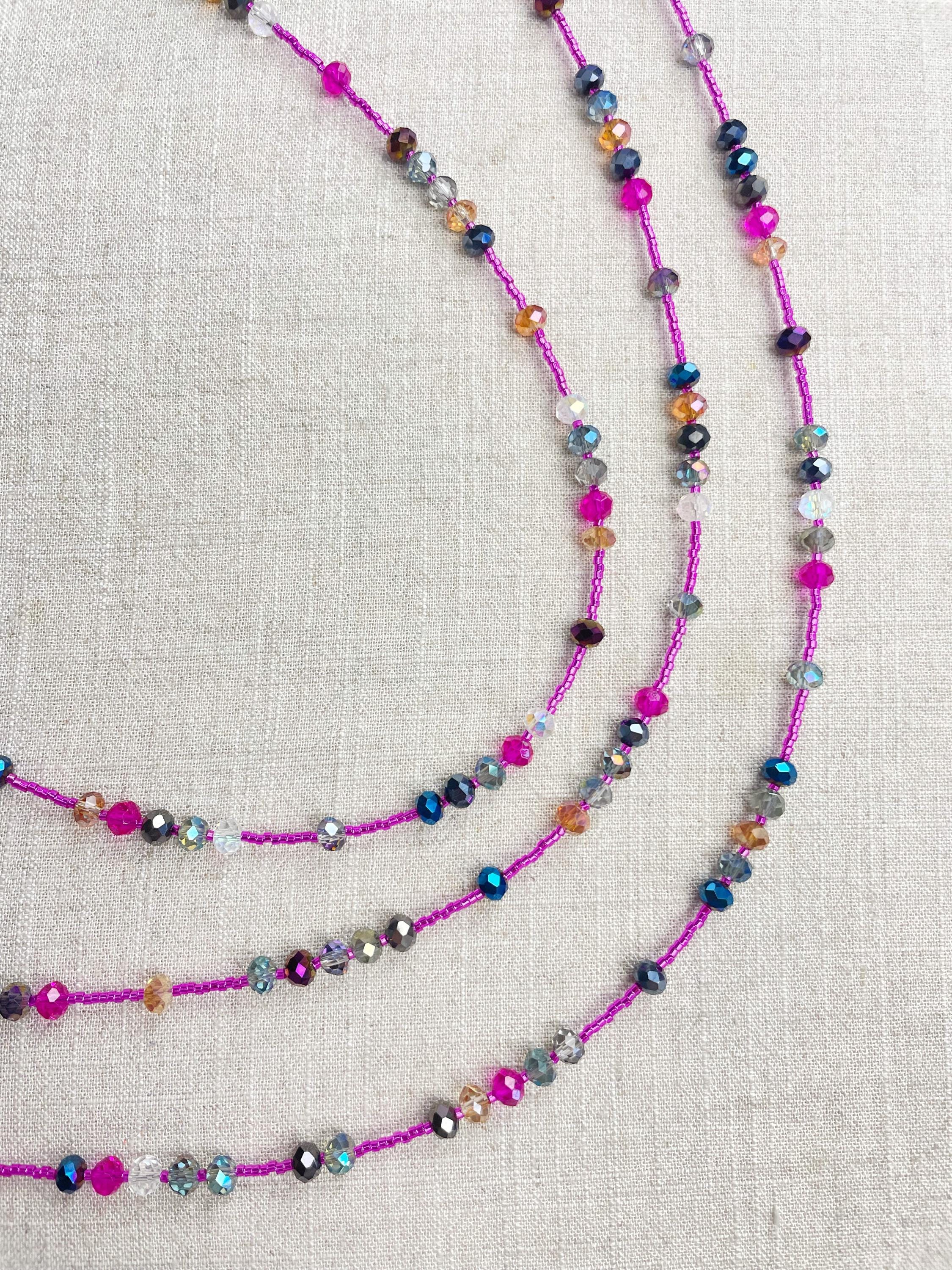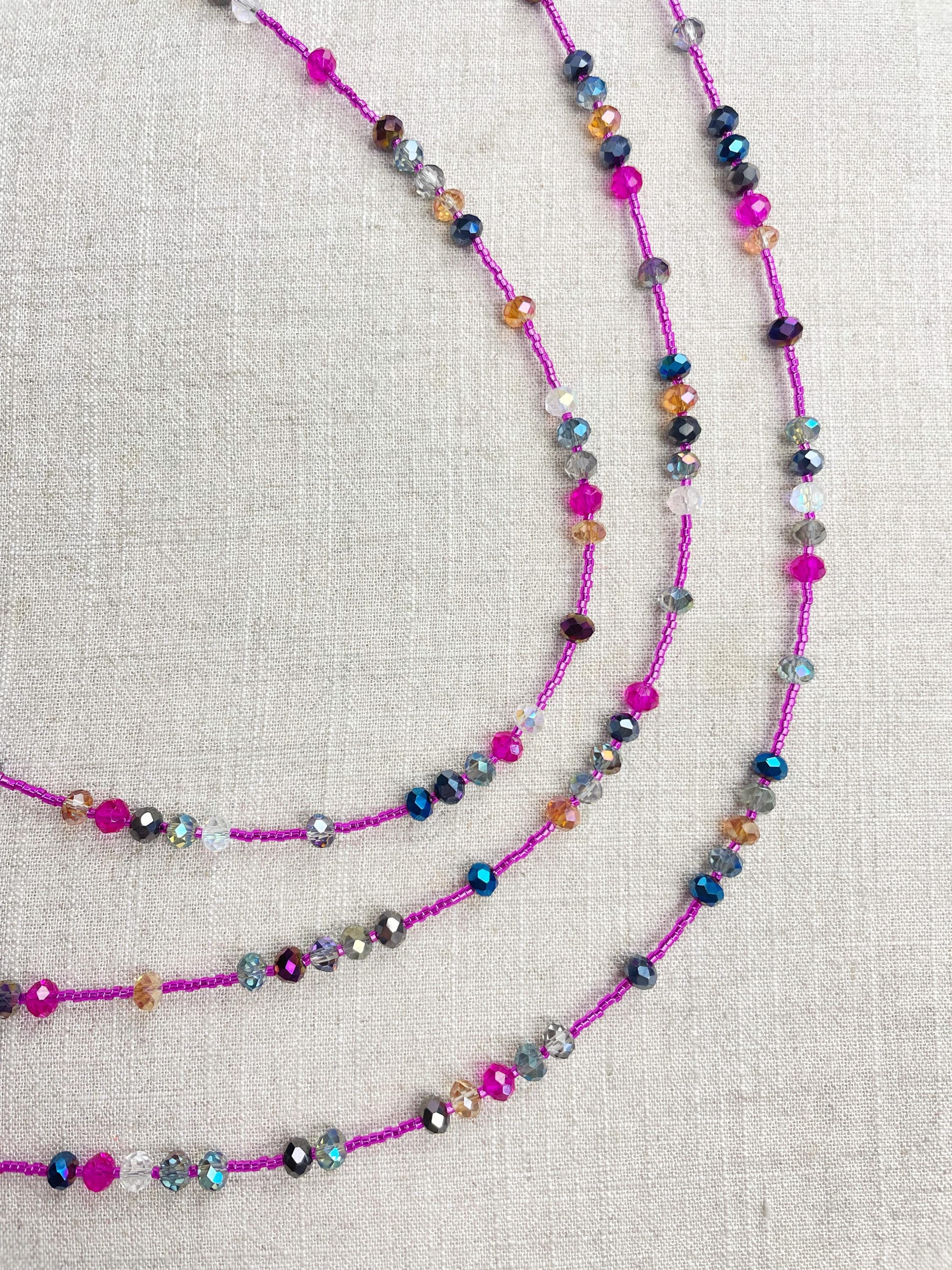 This necklace is made with pink silver lined 11/0 Miyuki glass seed beads. The seed beads are paired with iridescent crystal glass faceted rondelle beads in different colors. The beads are arranged in a pattern which enhances the sparkle in the necklace. Each necklace is strung on a stainless steel beading wire. The necklace is finished off with a gold plated stainless steel lobster clasp and a logo charm.