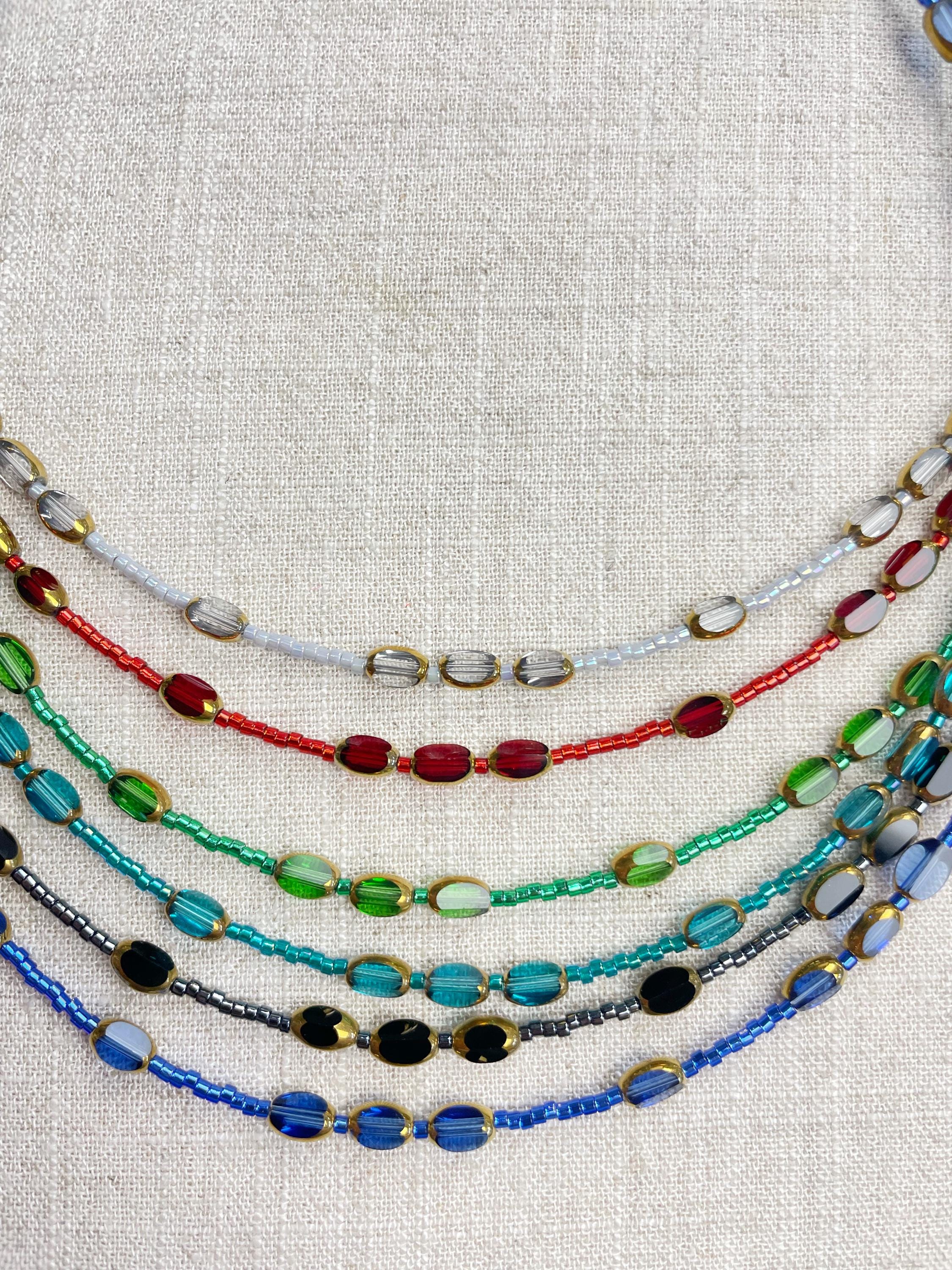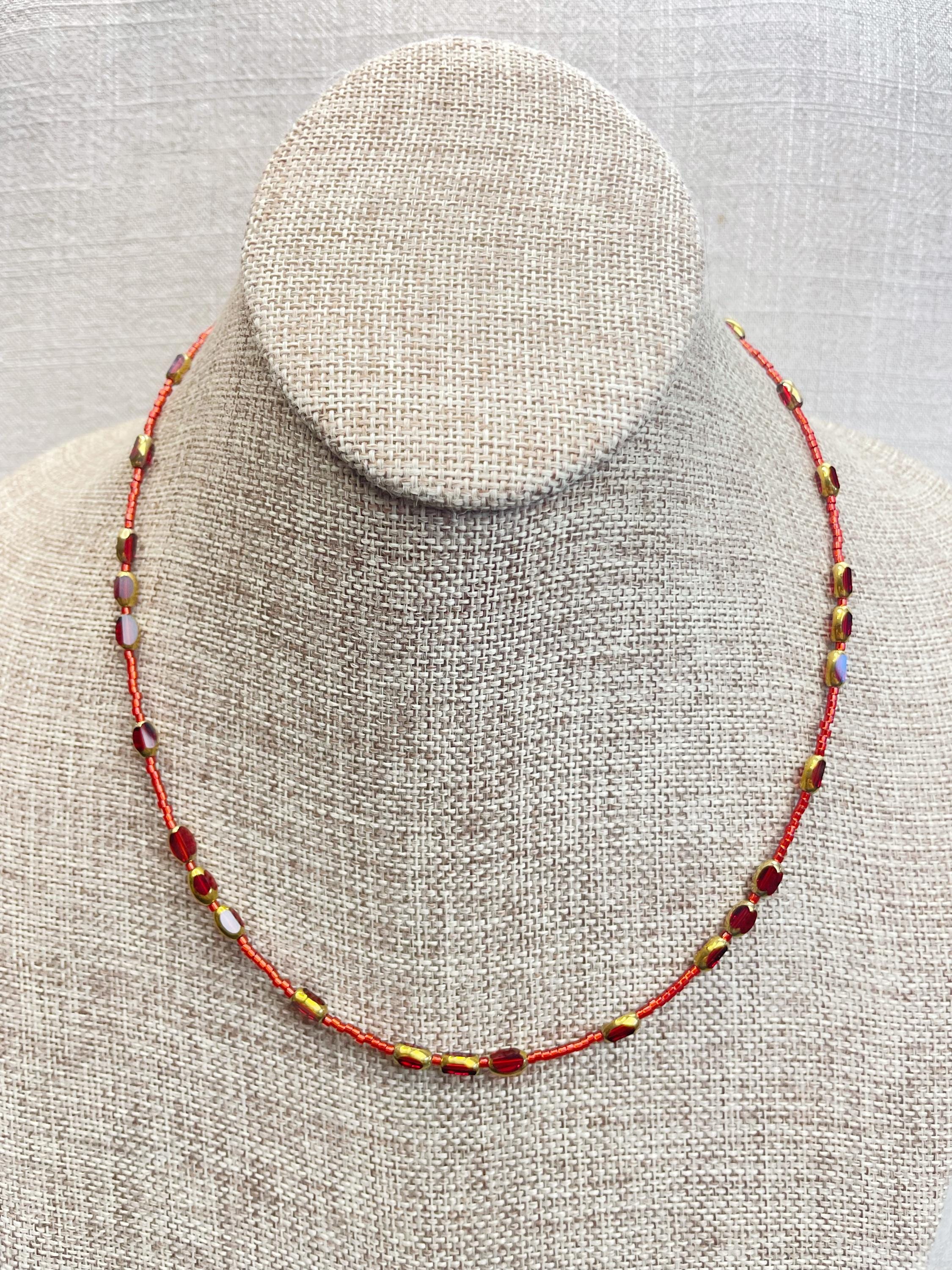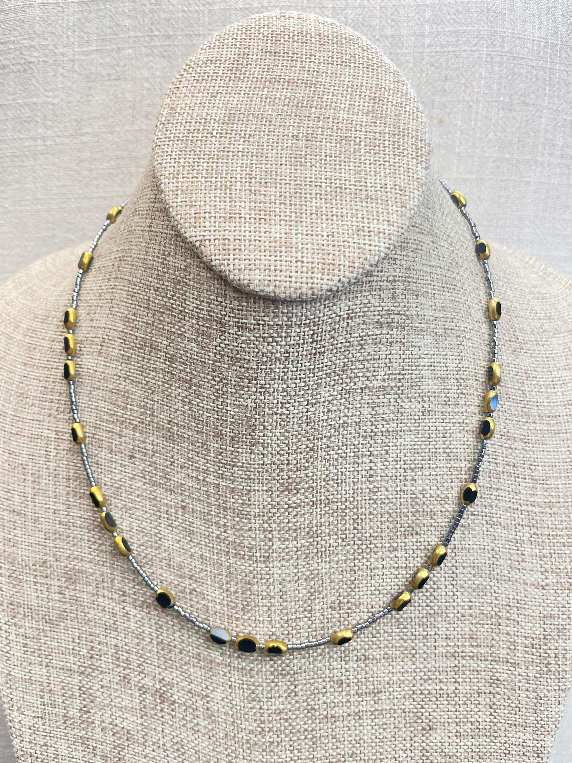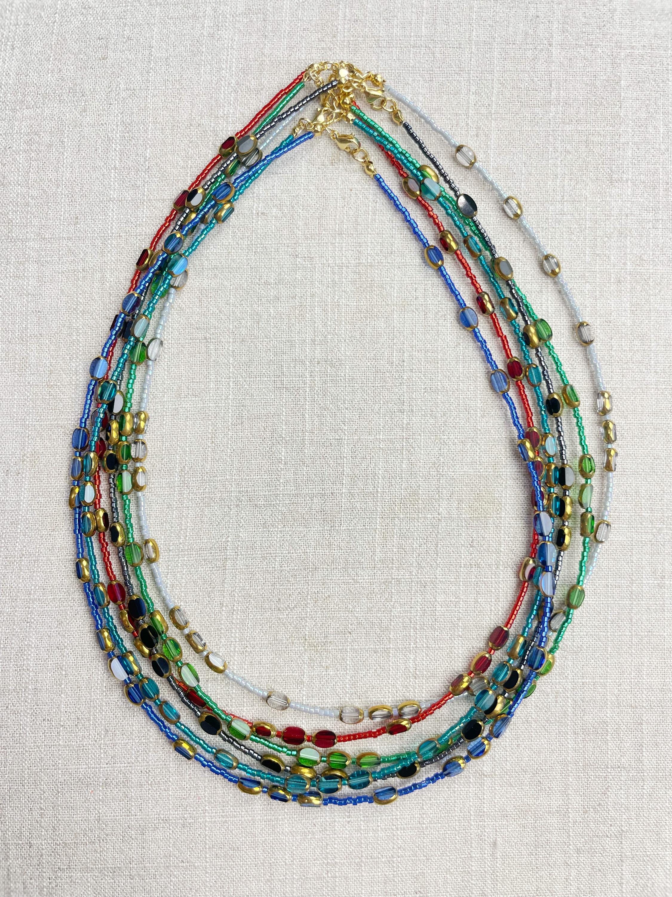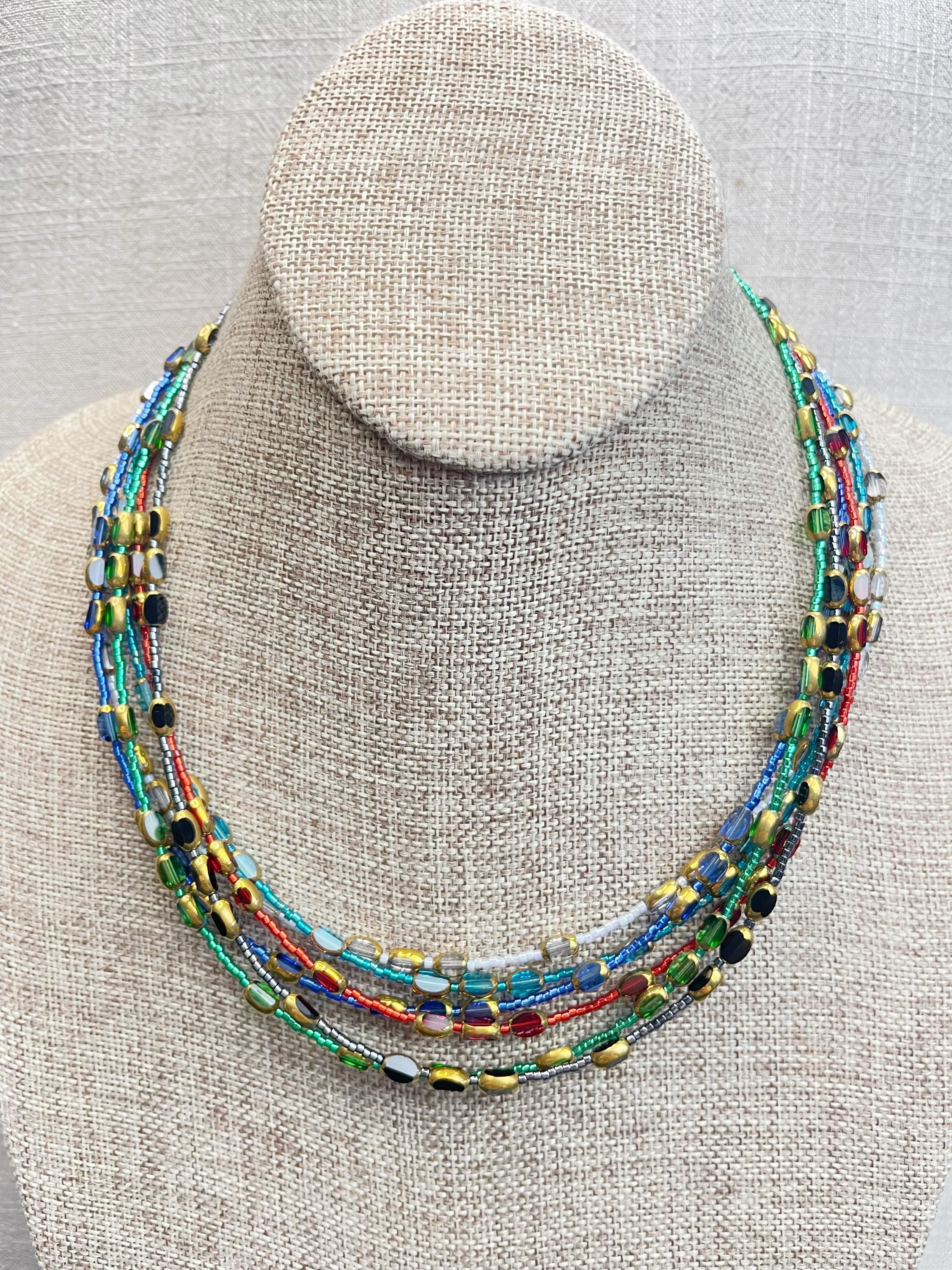 This necklace is made with 11/0 Miyuki glass seed beads. The seed beads are paired with colorful glass and gold vintage inspired beads. The beads are arranged in a pattern which enhances the sparkle and variety in the necklace. Each necklace is strung on a stainless steel beading wire. The necklace is finished off with a gold plated stainless steel lobster clasp and a logo charm.