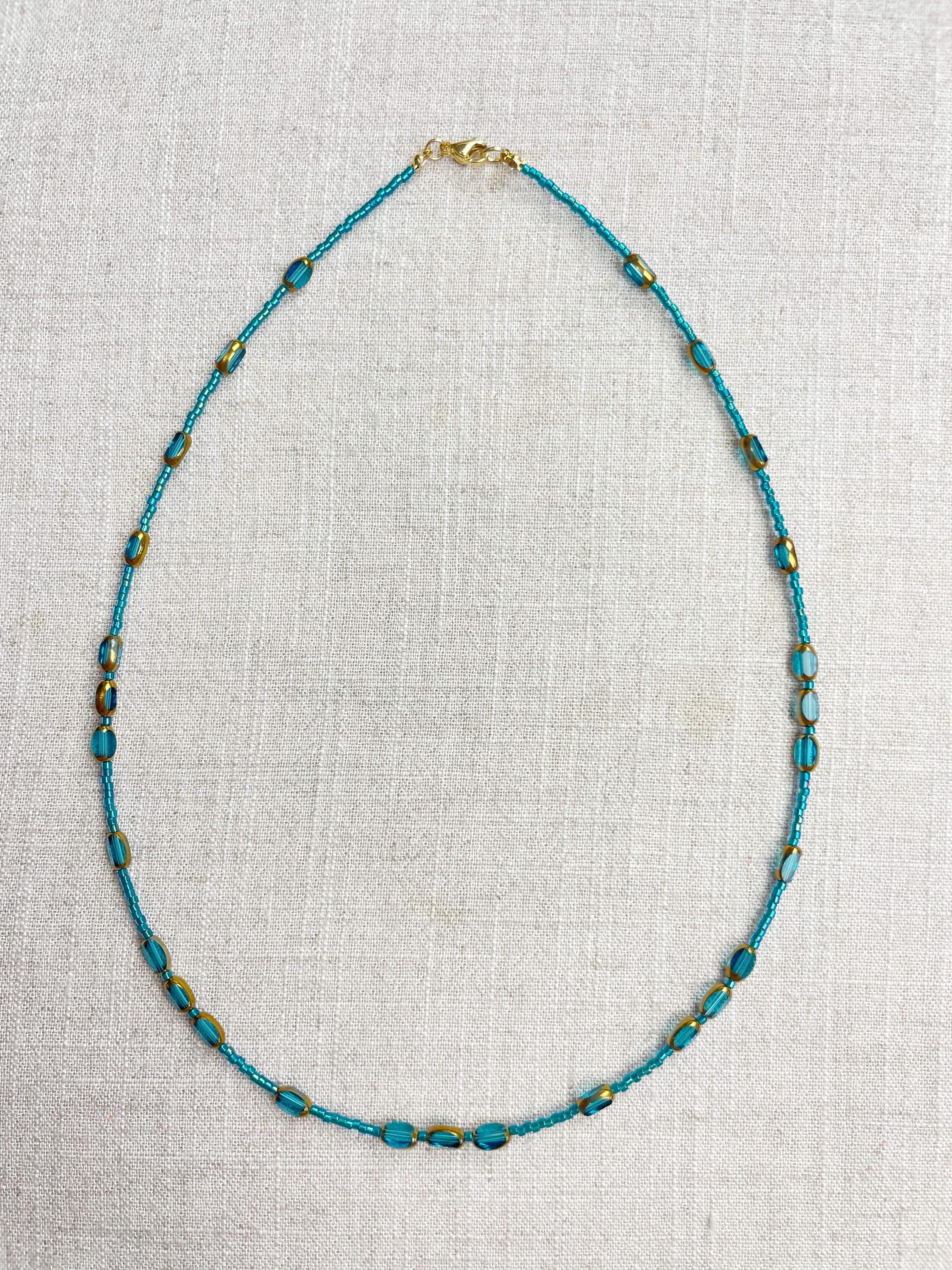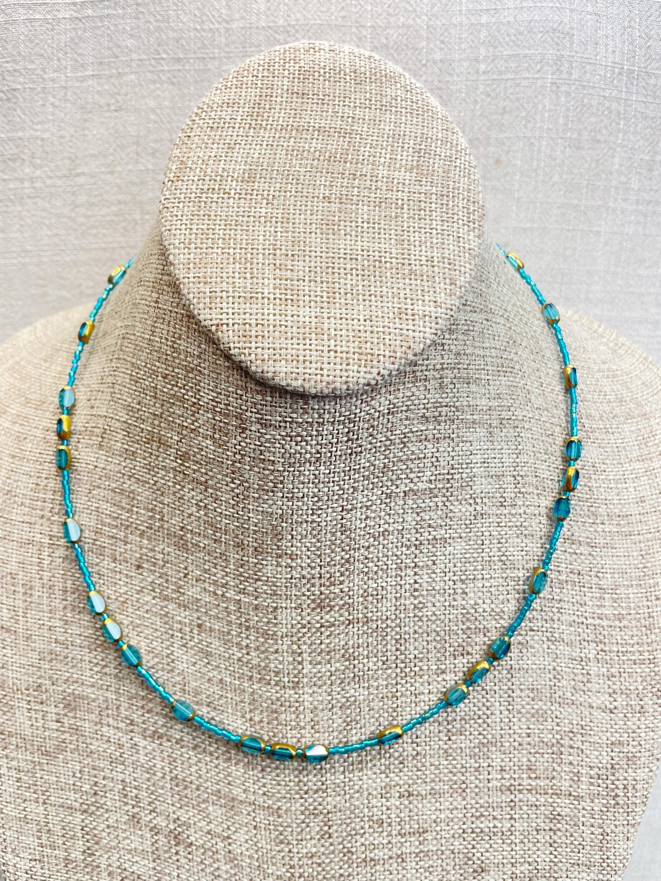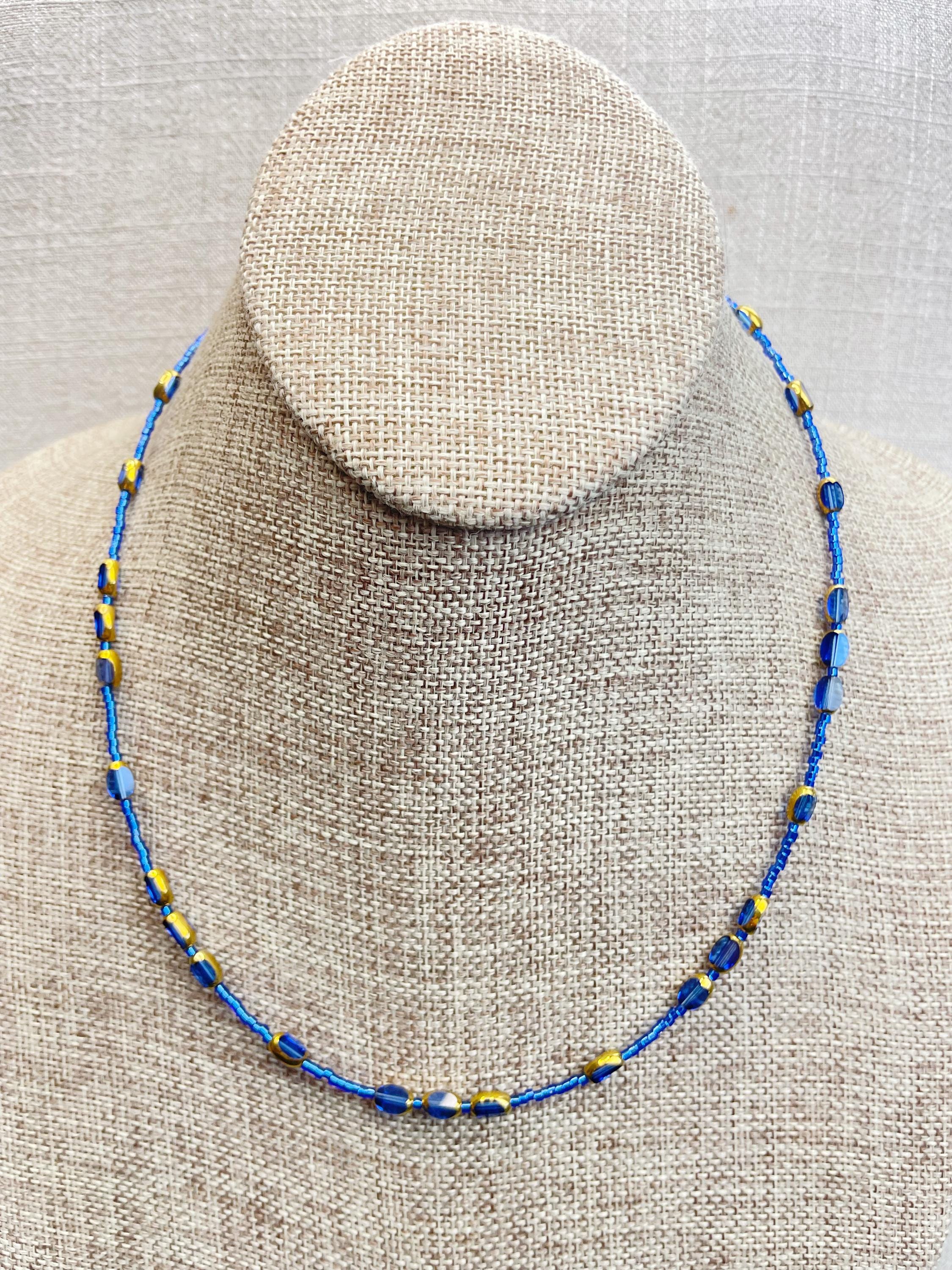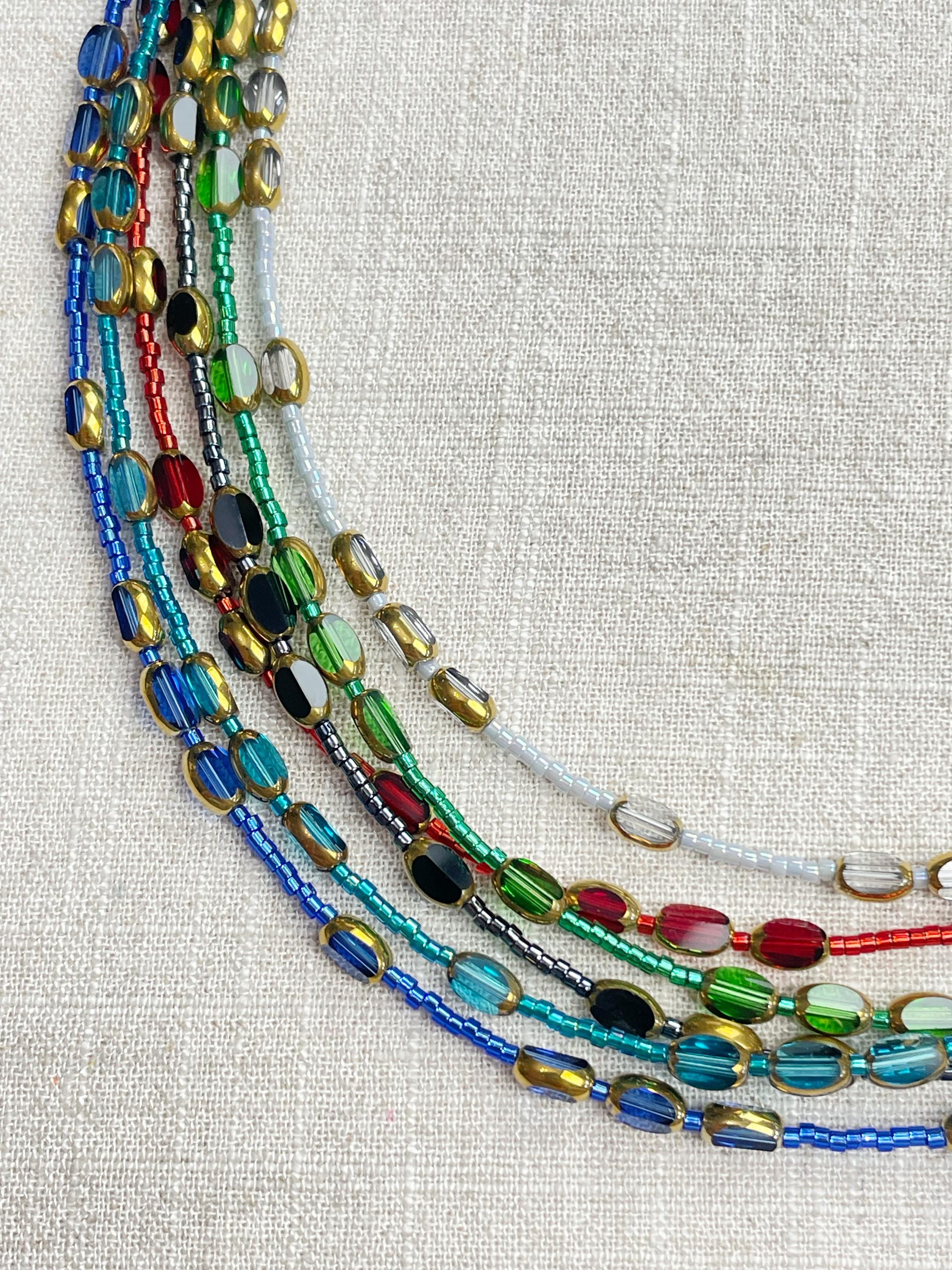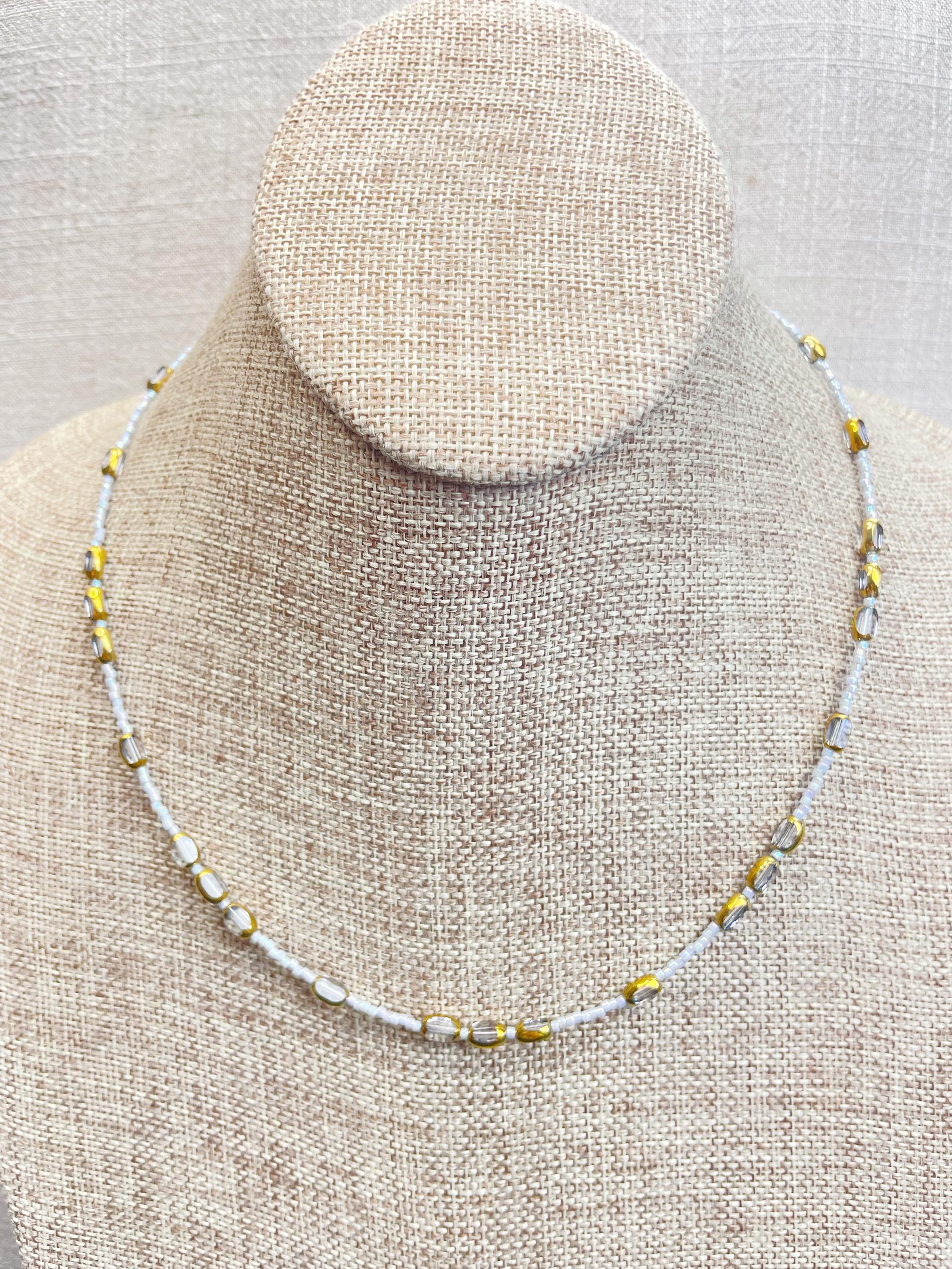 This necklace is made with 11/0 Miyuki glass seed beads. The seed beads are paired with colorful glass and gold vintage inspired beads. The beads are arranged in a pattern which enhances the sparkle and variety in the necklace. Each necklace is strung on a stainless steel beading wire. The necklace is finished off with a gold plated stainless steel lobster clasp and a logo charm.