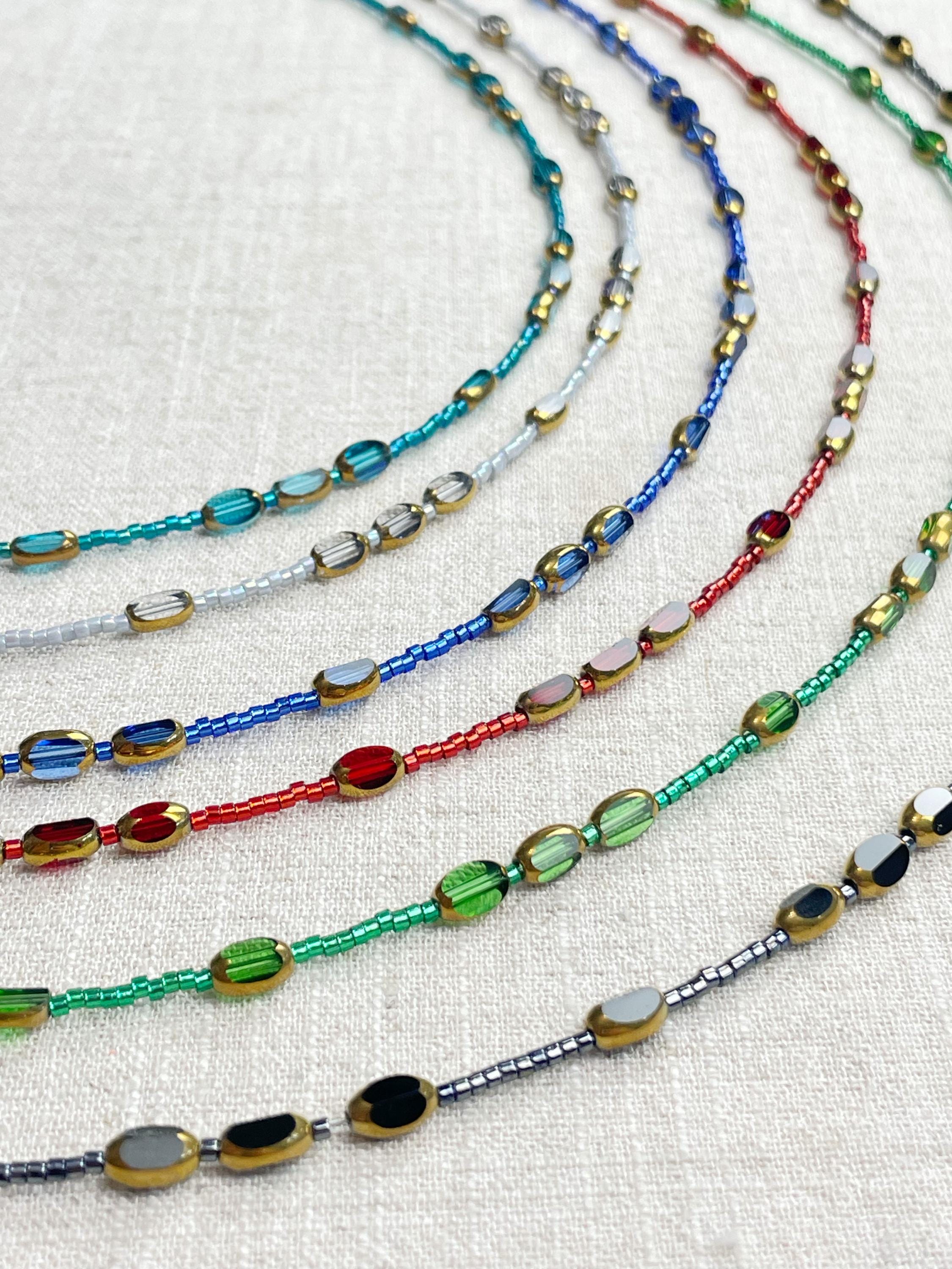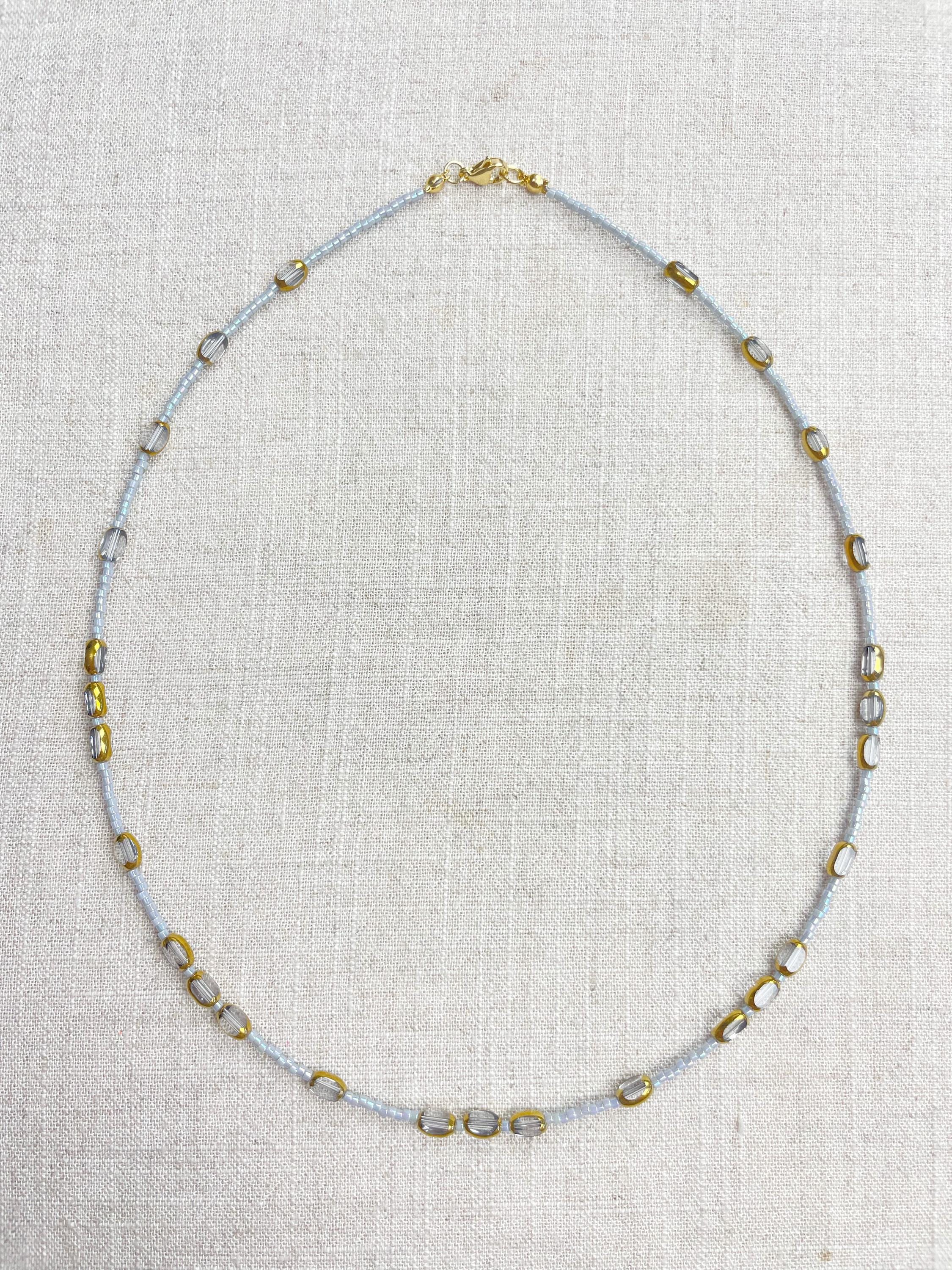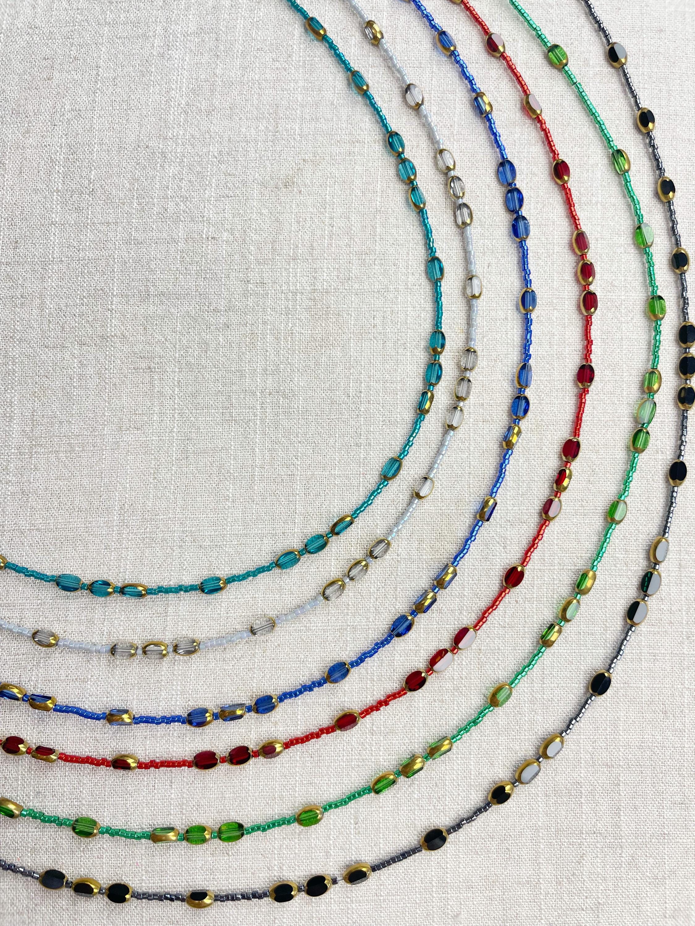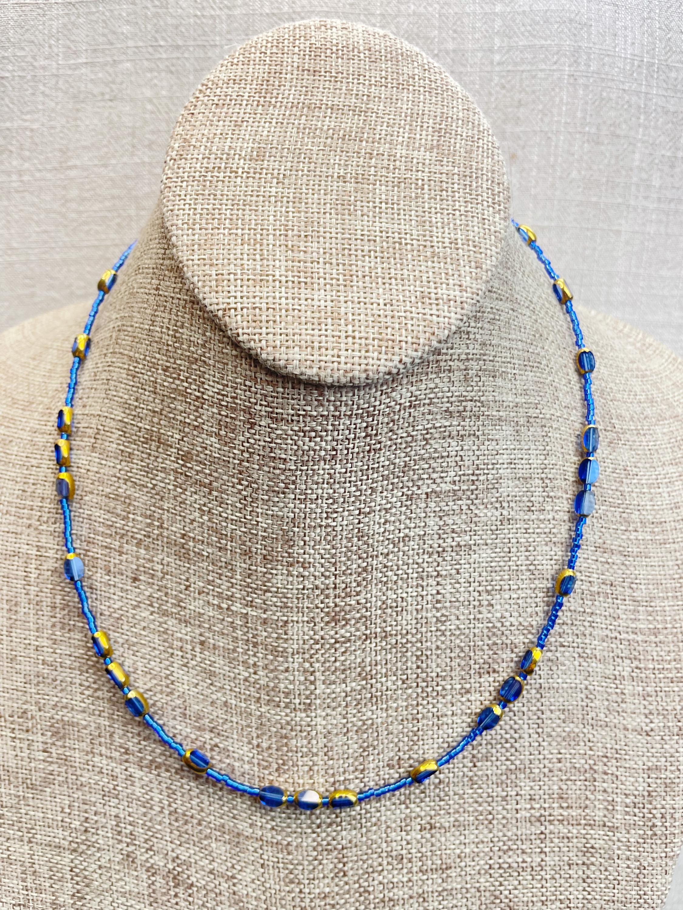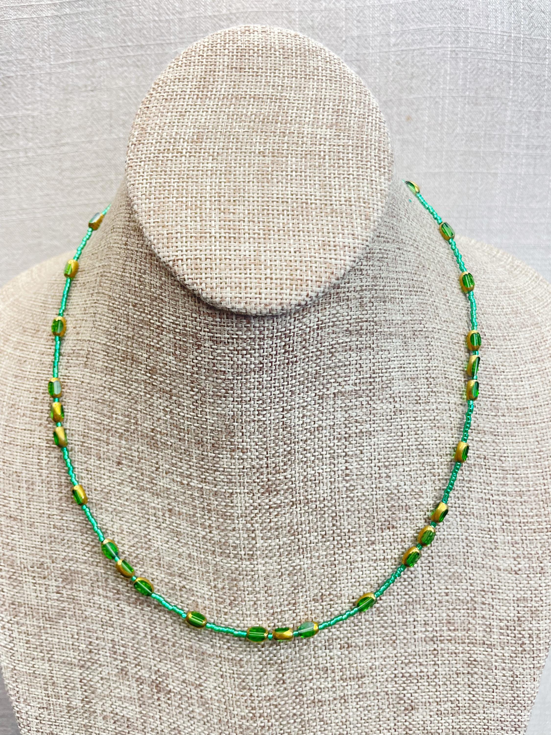 This necklace is made with 11/0 Miyuki glass seed beads. The seed beads are paired with colorful glass and gold vintage inspired beads. The beads are arranged in a pattern which enhances the sparkle and variety in the necklace. Each necklace is strung on a stainless steel beading wire. The necklace is finished off with a gold plated stainless steel lobster clasp and a logo charm.