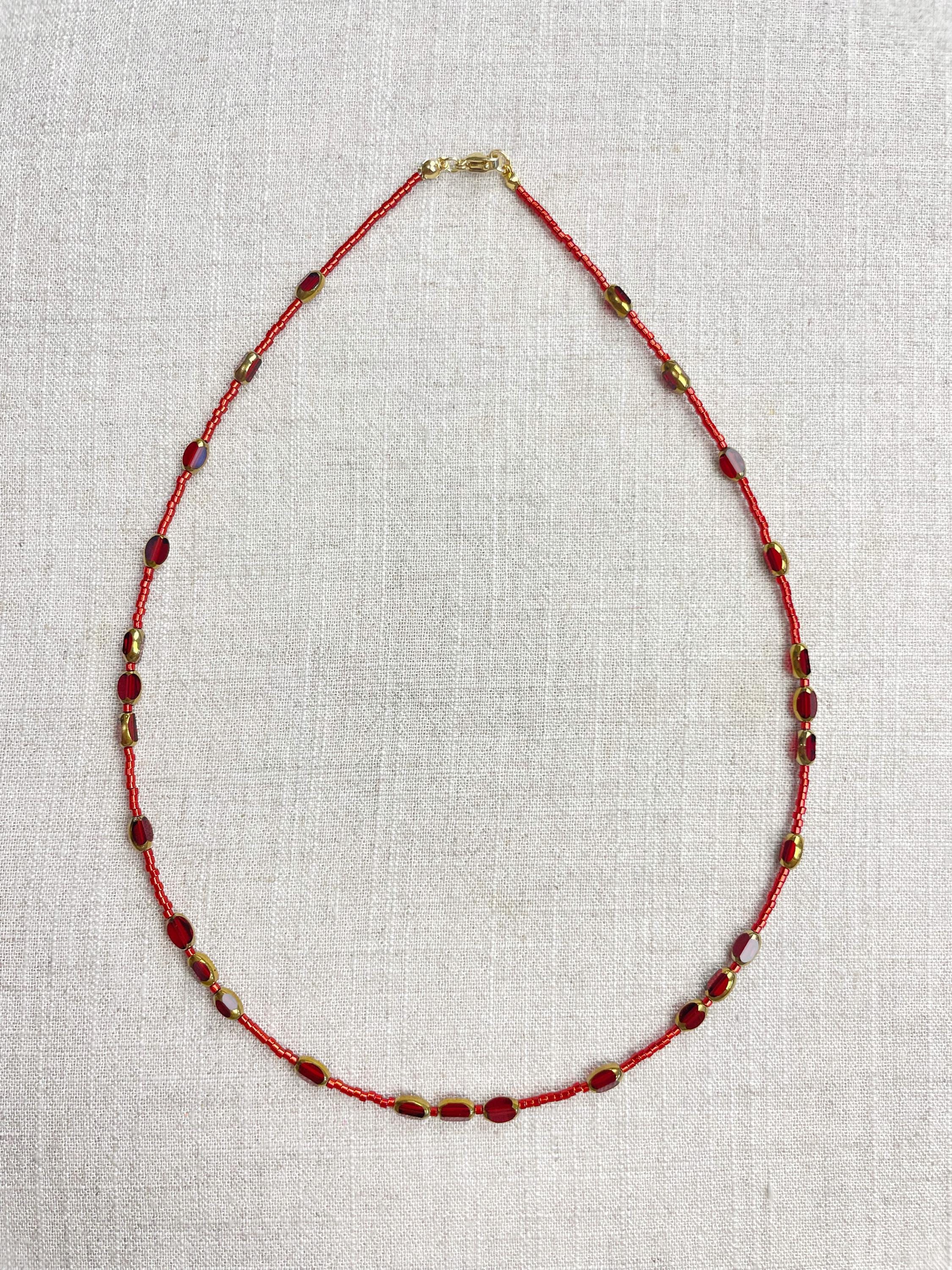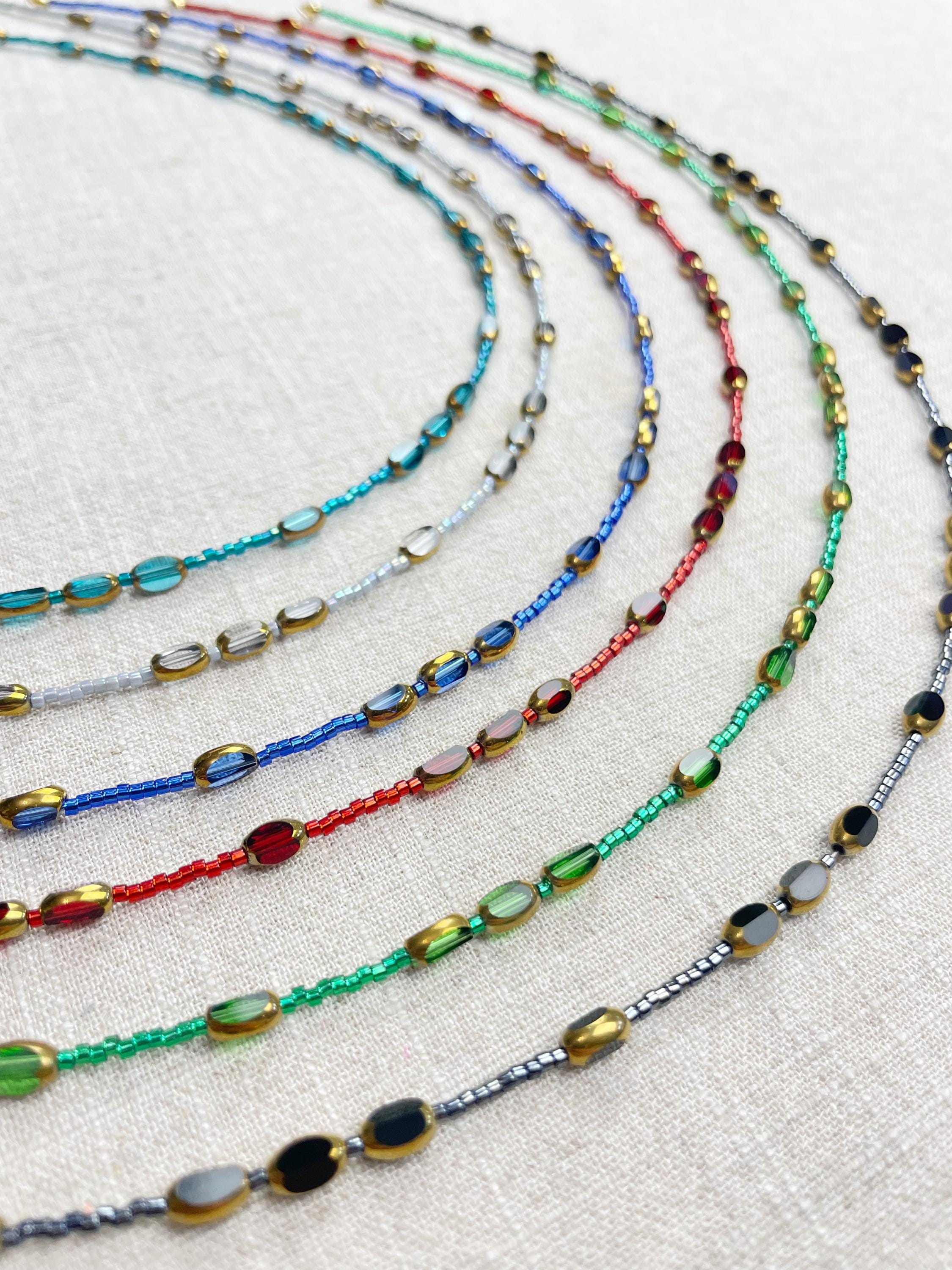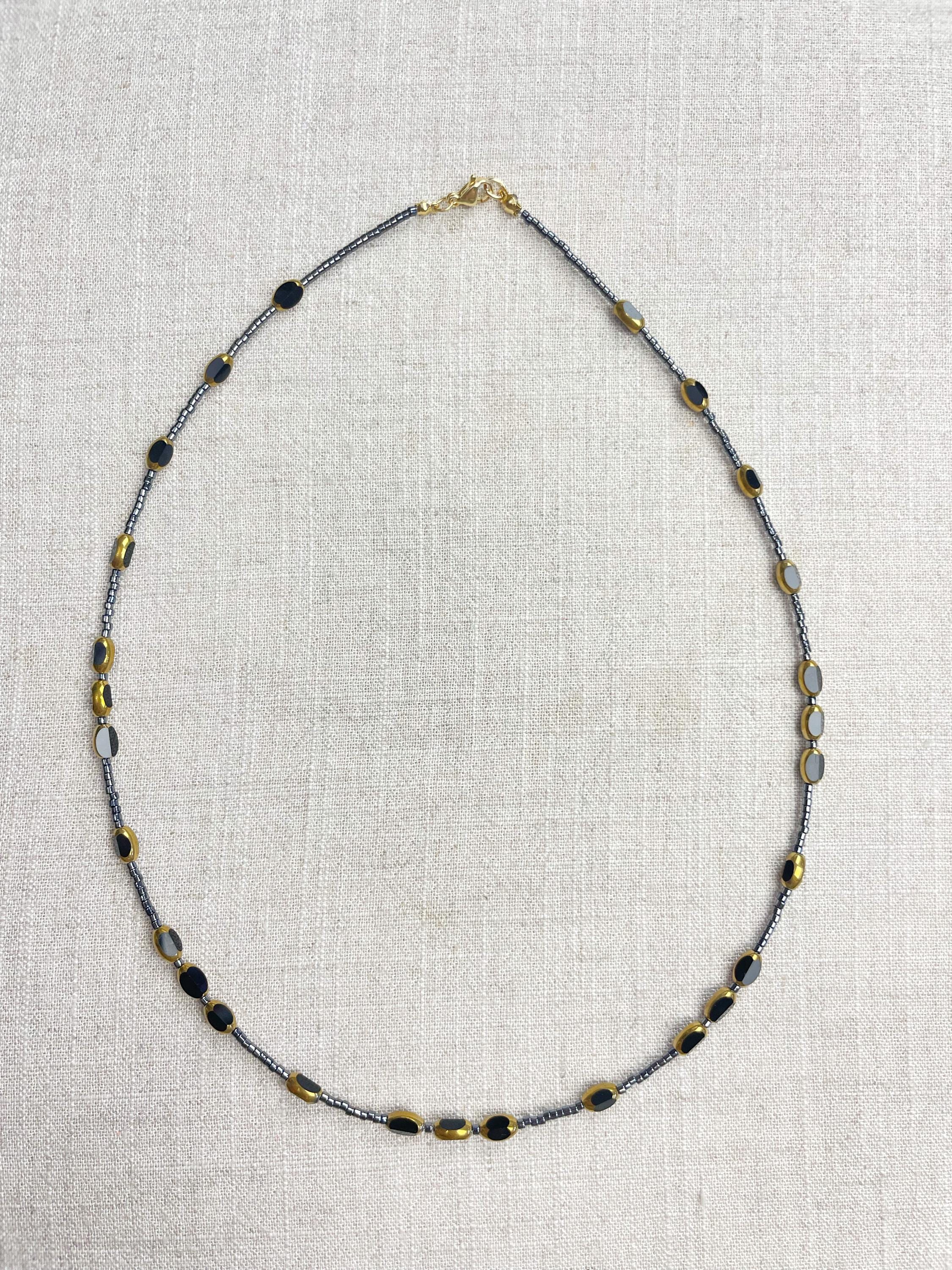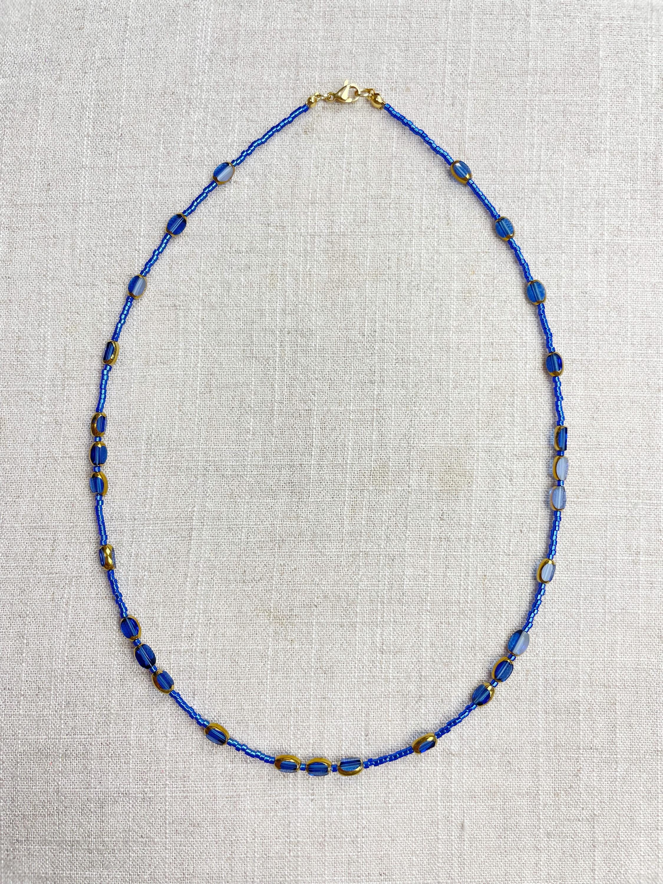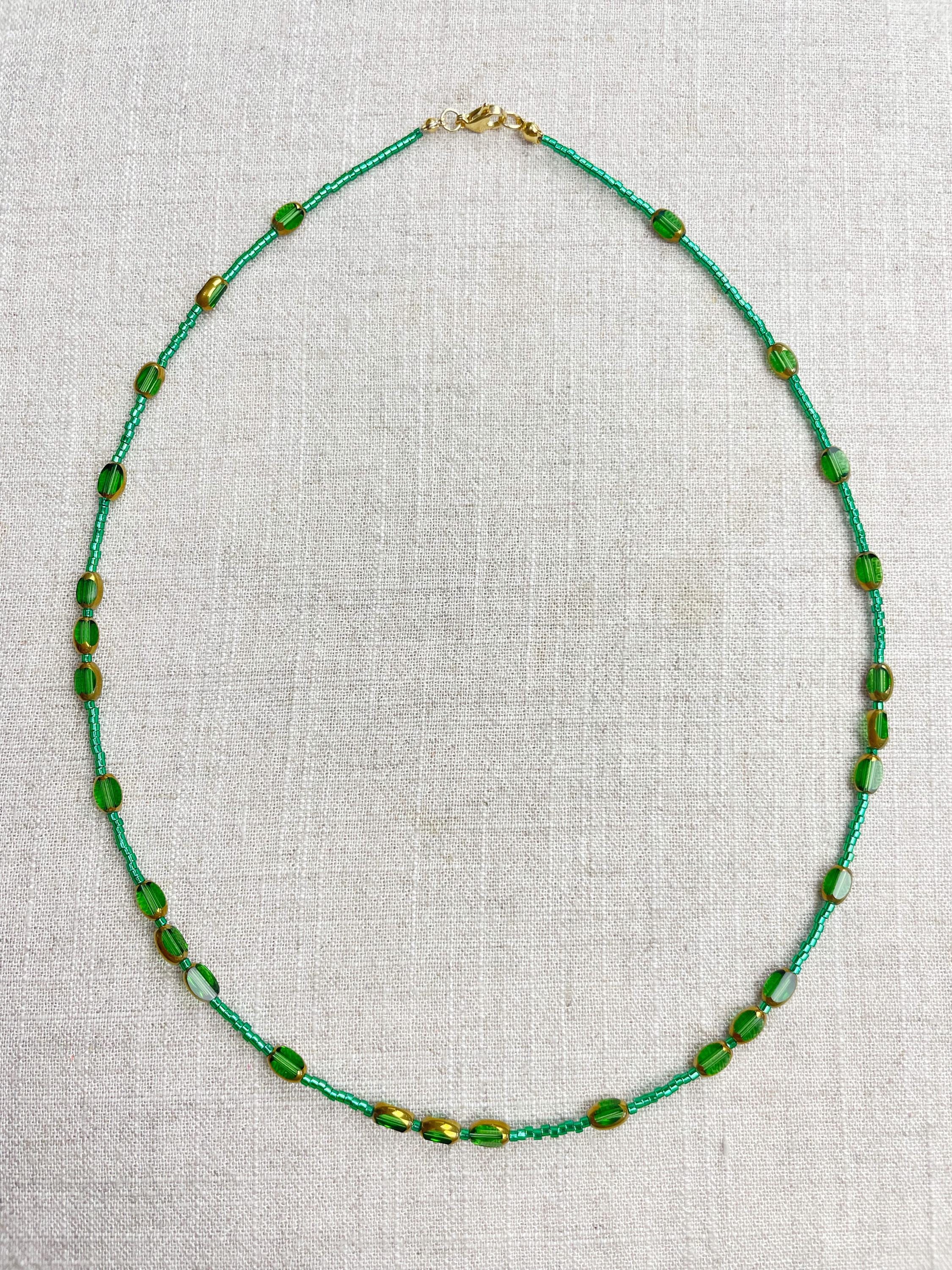 This necklace is made with 11/0 Miyuki glass seed beads. The seed beads are paired with colorful glass and gold vintage inspired beads. The beads are arranged in a pattern which enhances the sparkle and variety in the necklace. Each necklace is strung on a stainless steel beading wire. The necklace is finished off with a gold plated stainless steel lobster clasp and a logo charm.