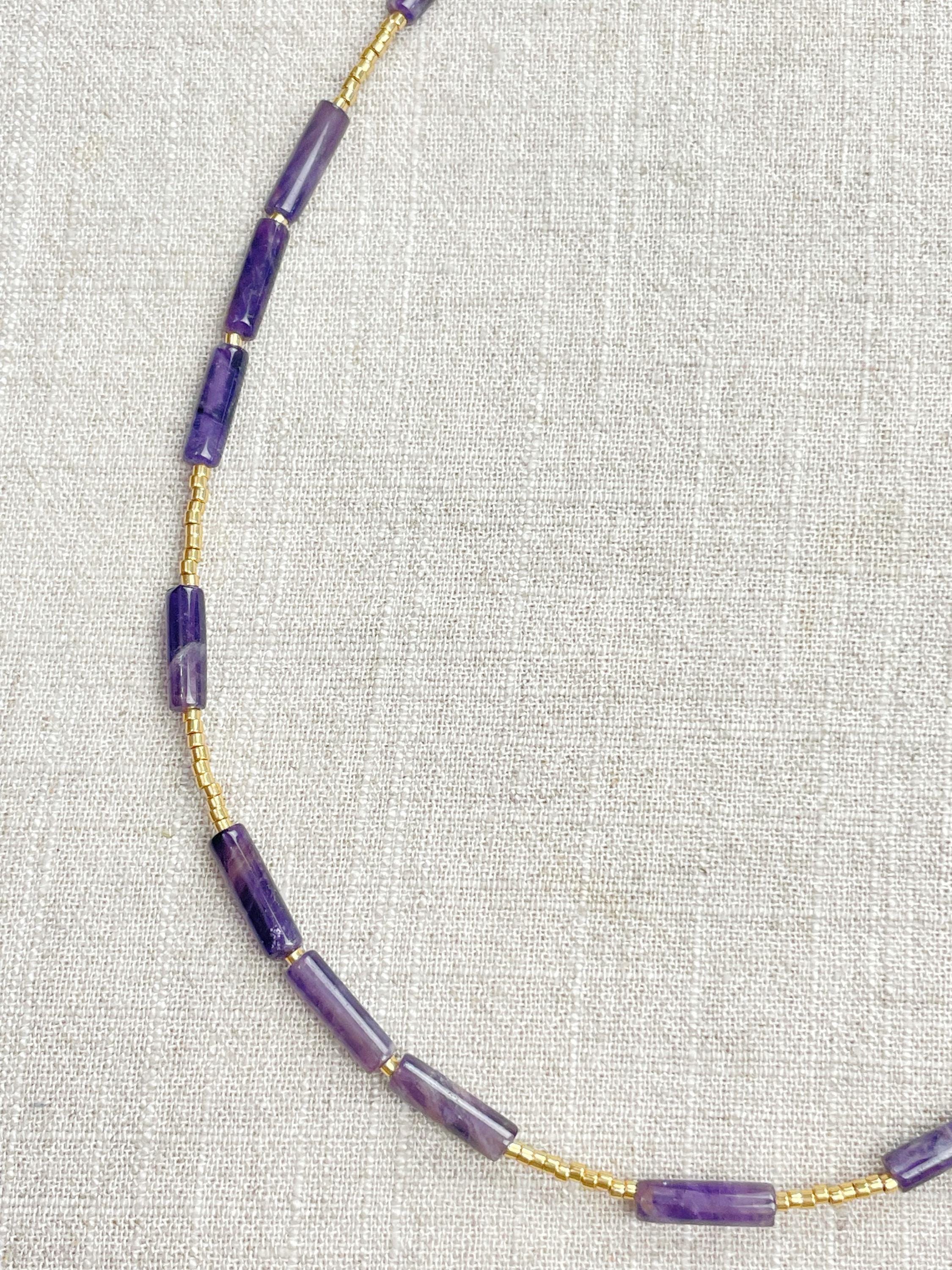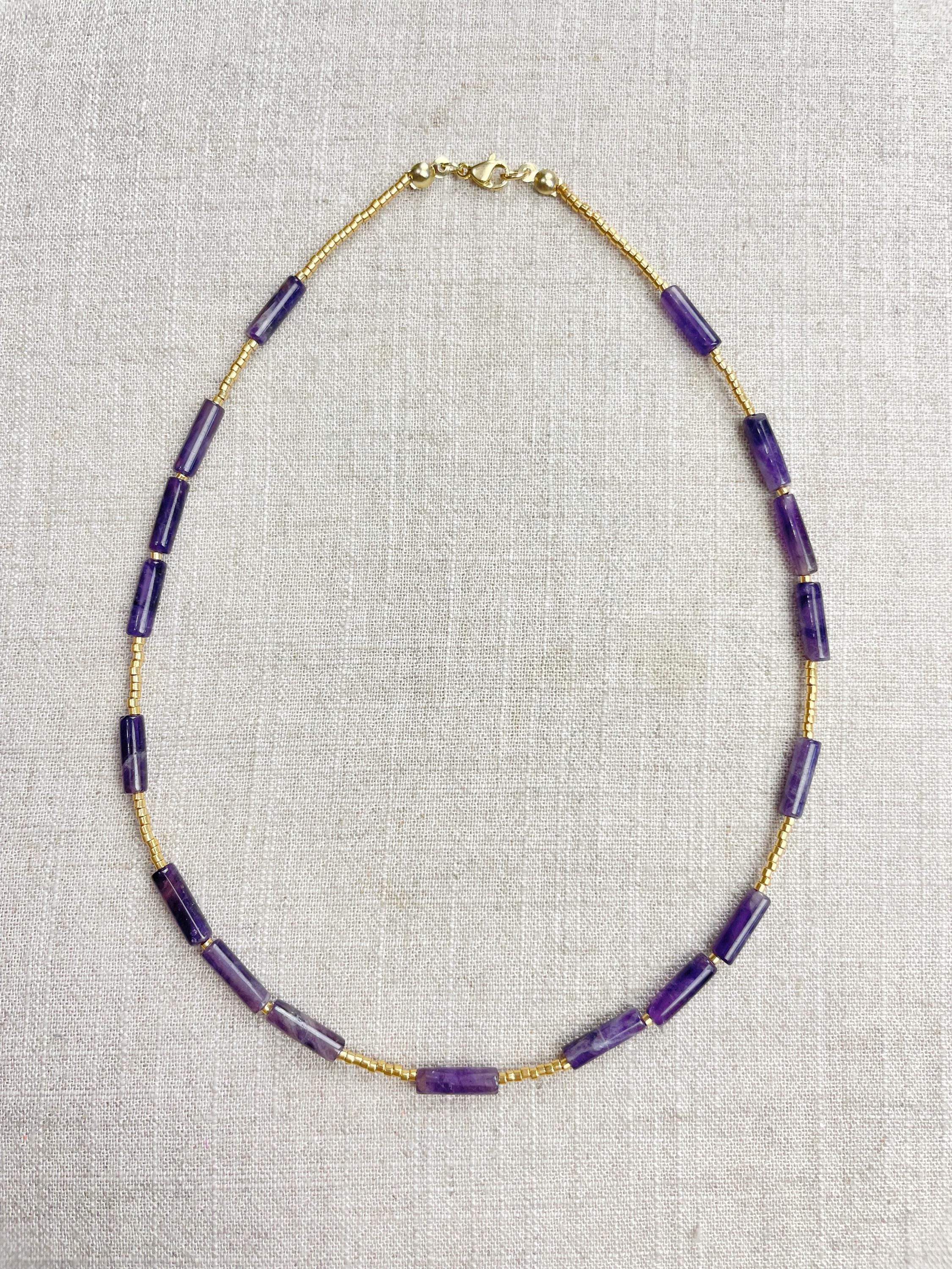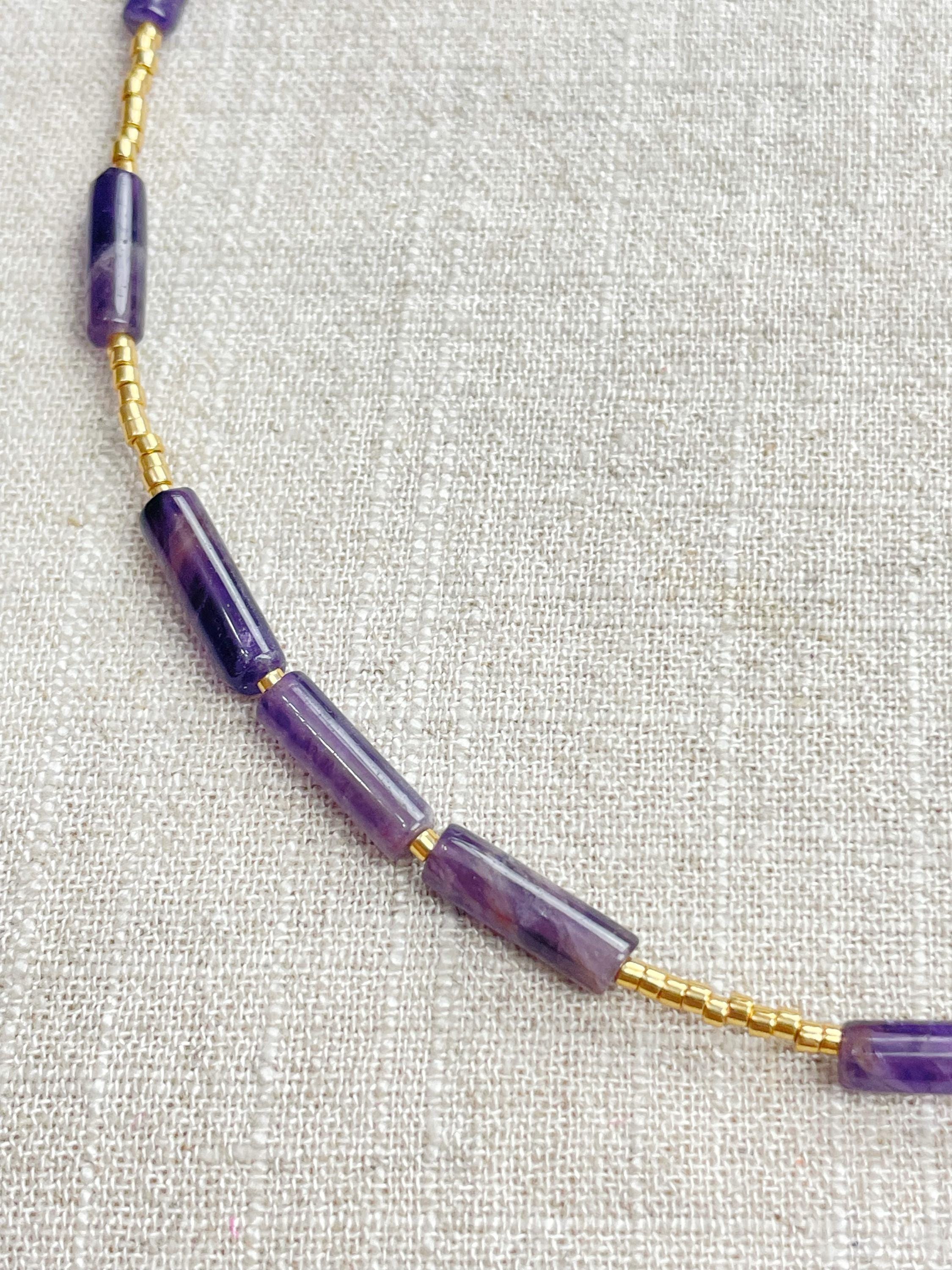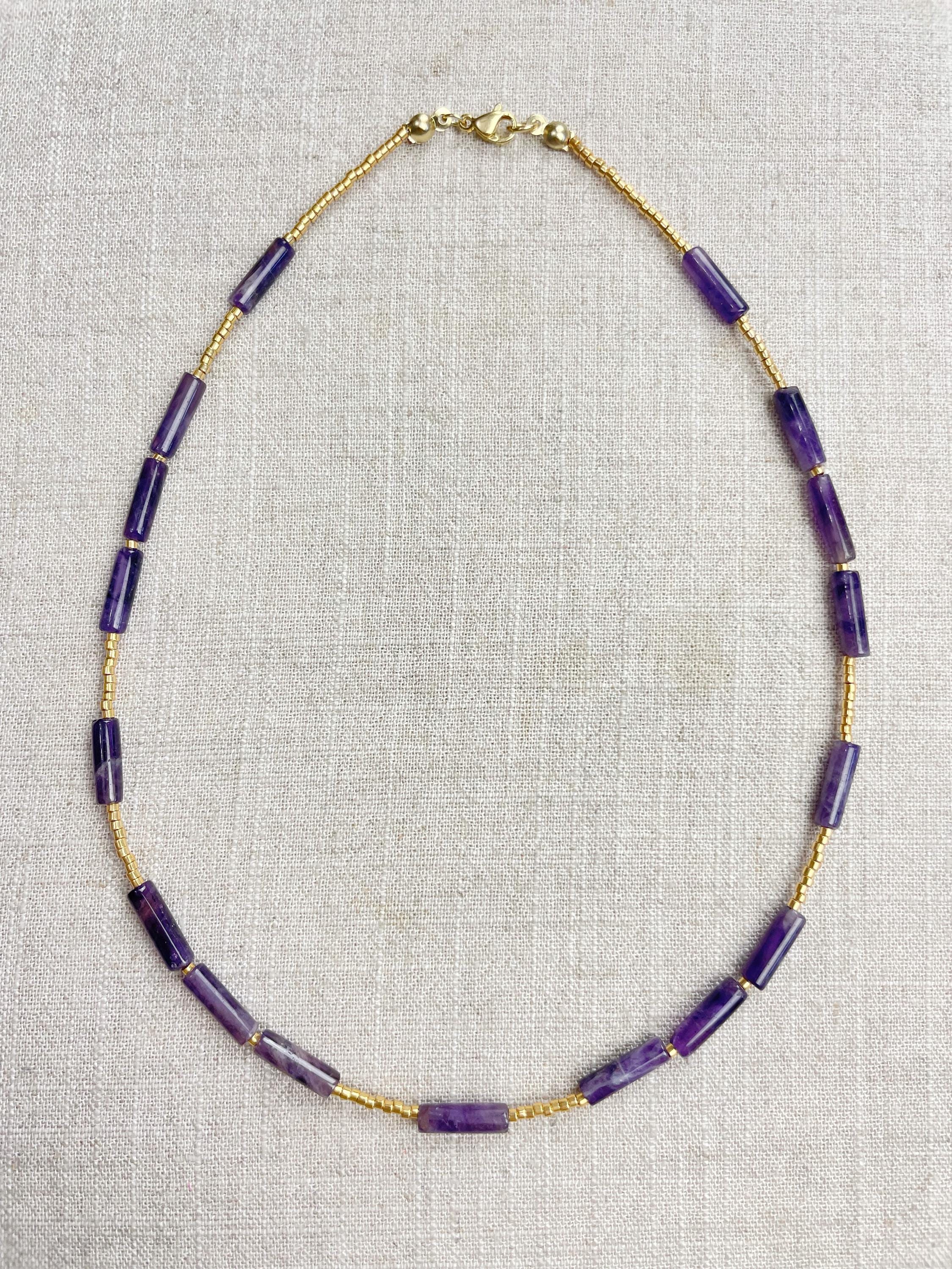 This necklace is made with galvanized gold 11/0 Miyuki glass seed beads. The seed beads are paired with beautiful amethyst stone tube beads. Each necklace is strung on a stainless steel beading wire. The necklace is finished off with a gold plated stainless steel lobster clasp and a logo charm.