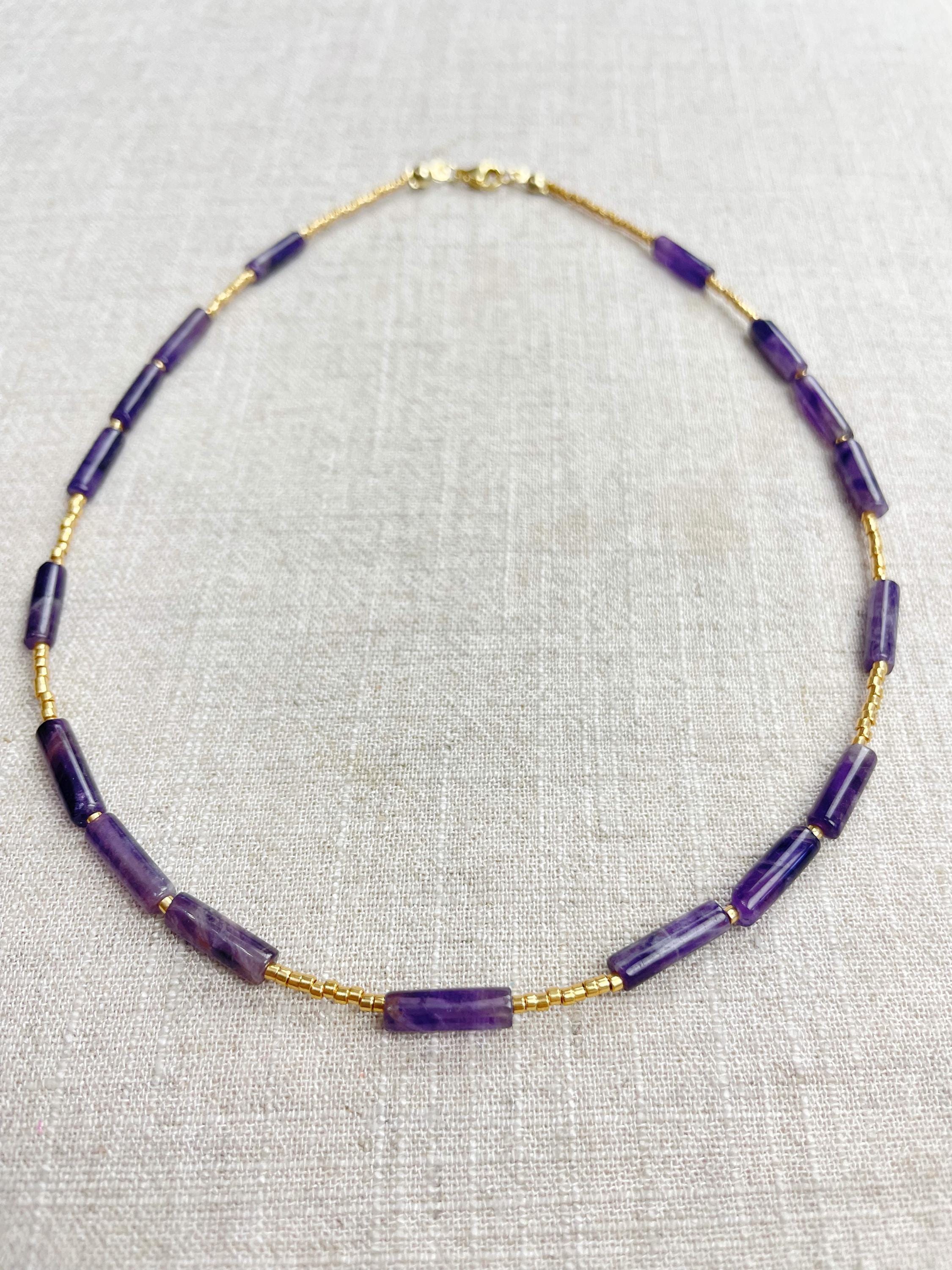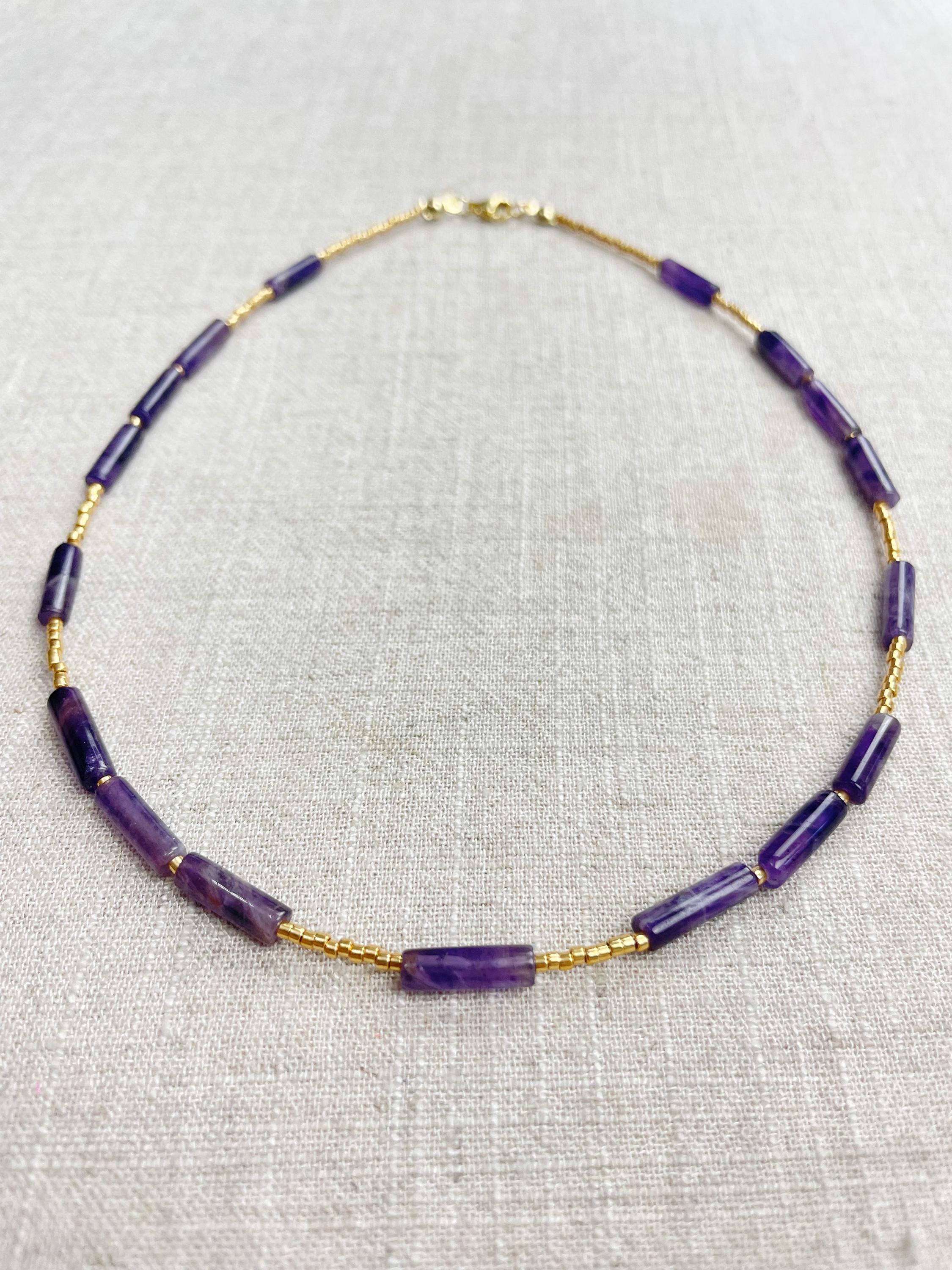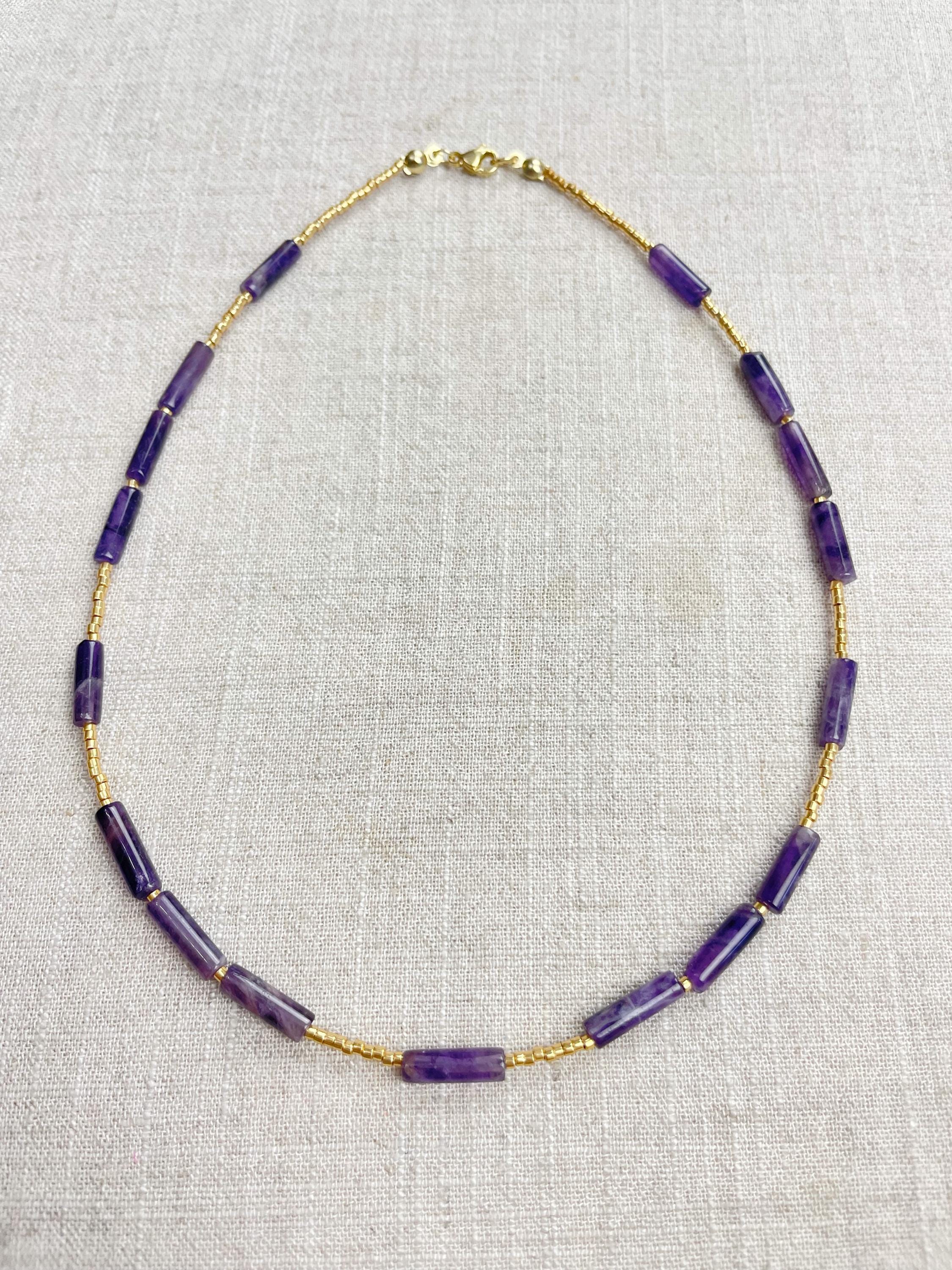 This necklace is made with galvanized gold 11/0 Miyuki glass seed beads. The seed beads are paired with beautiful amethyst stone tube beads. Each necklace is strung on a stainless steel beading wire. The necklace is finished off with a gold plated stainless steel lobster clasp and a logo charm.
