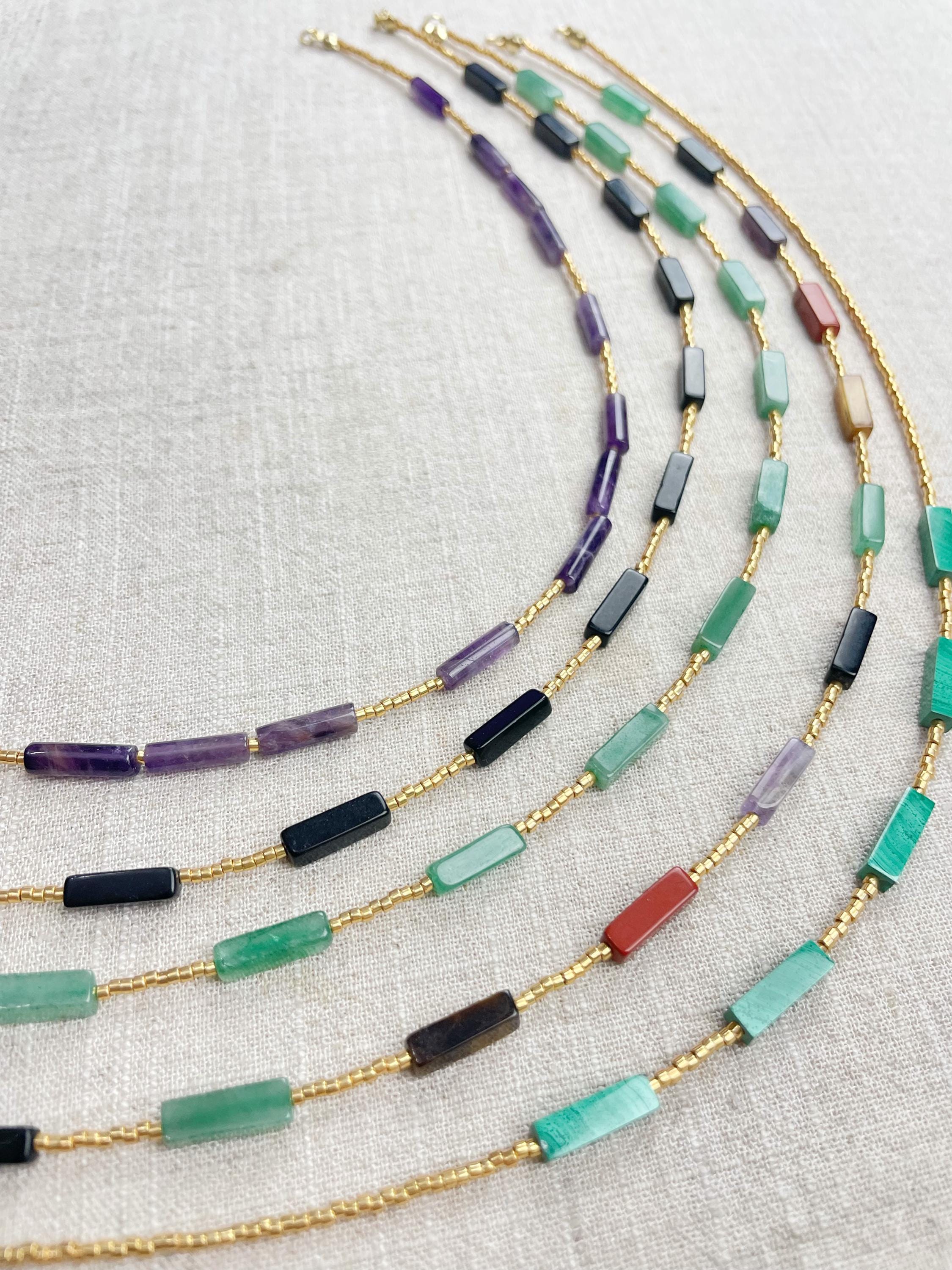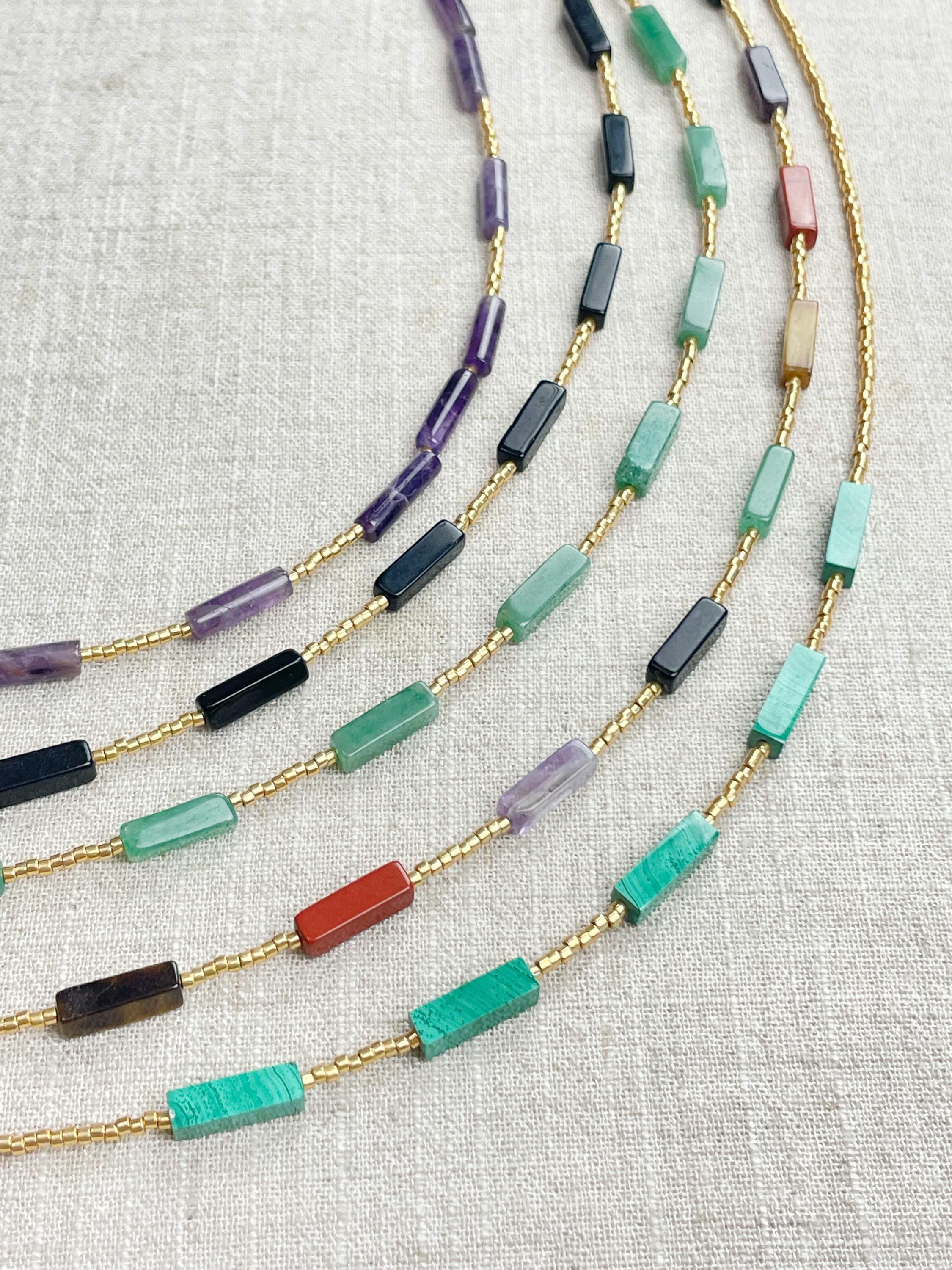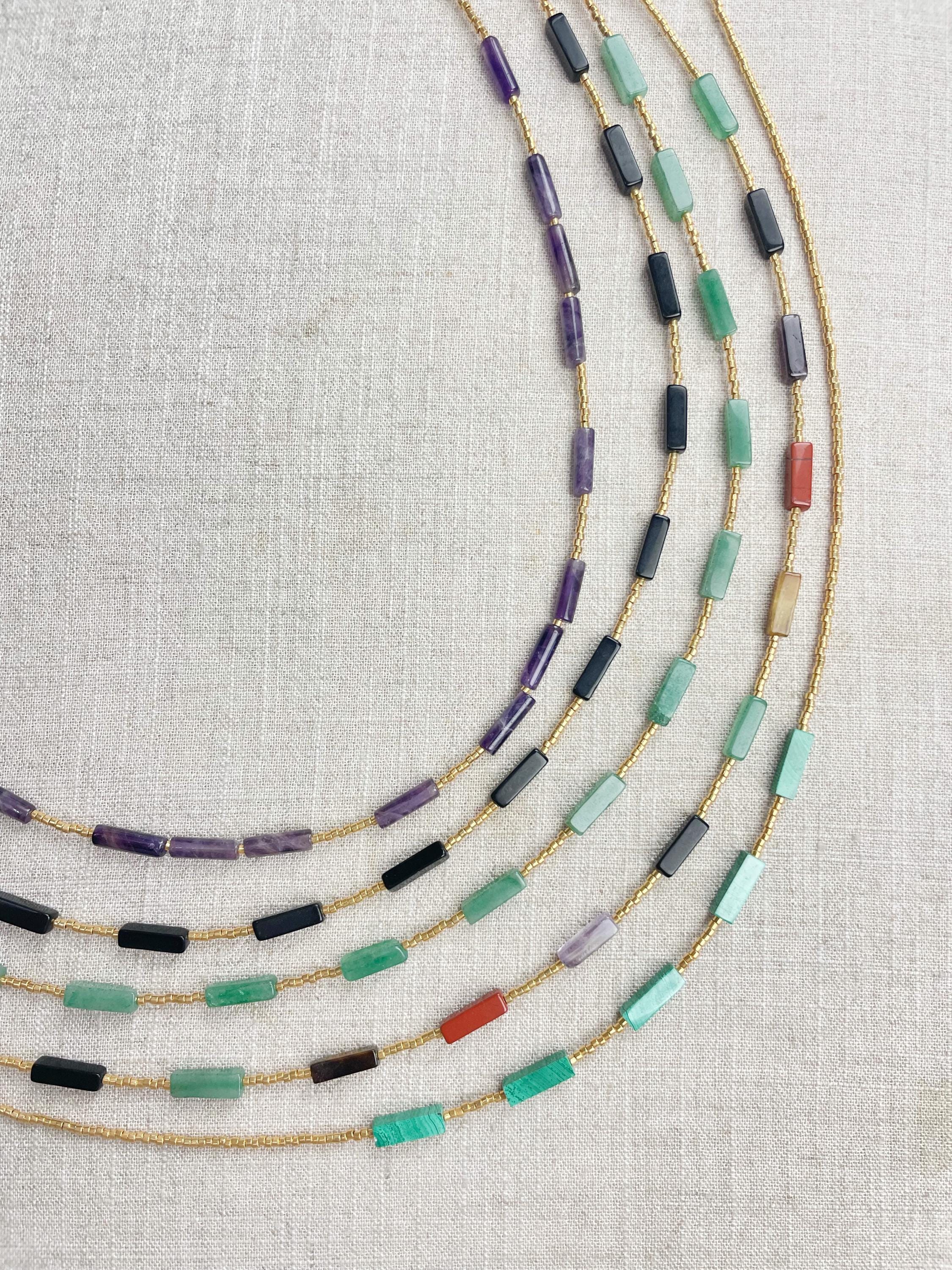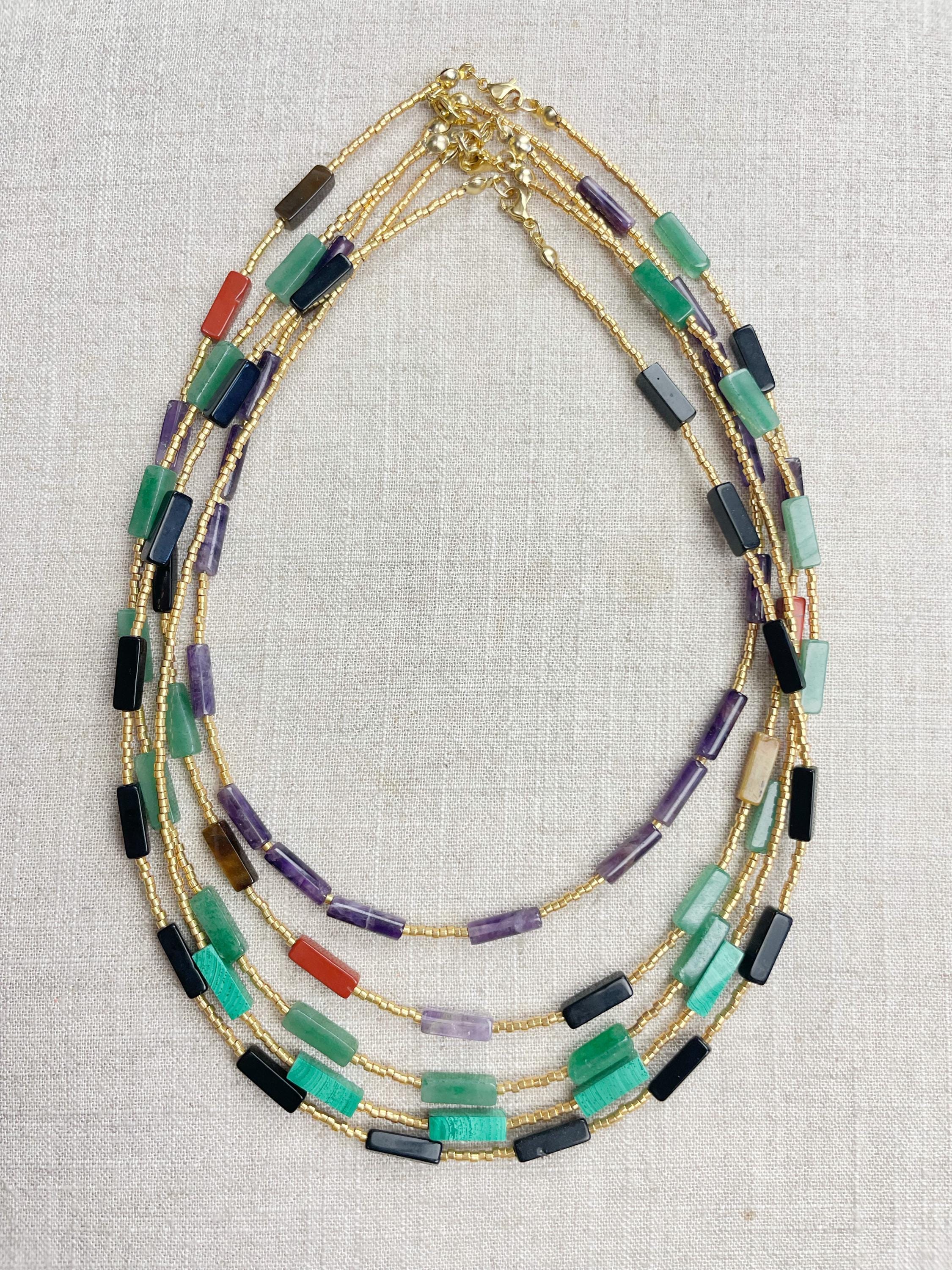 This necklace is made with galvanized gold 11/0 Miyuki glass seed beads. The seed beads are paired with beautiful amethyst stone tube beads. Each necklace is strung on a stainless steel beading wire. The necklace is finished off with a gold plated stainless steel lobster clasp and a logo charm.