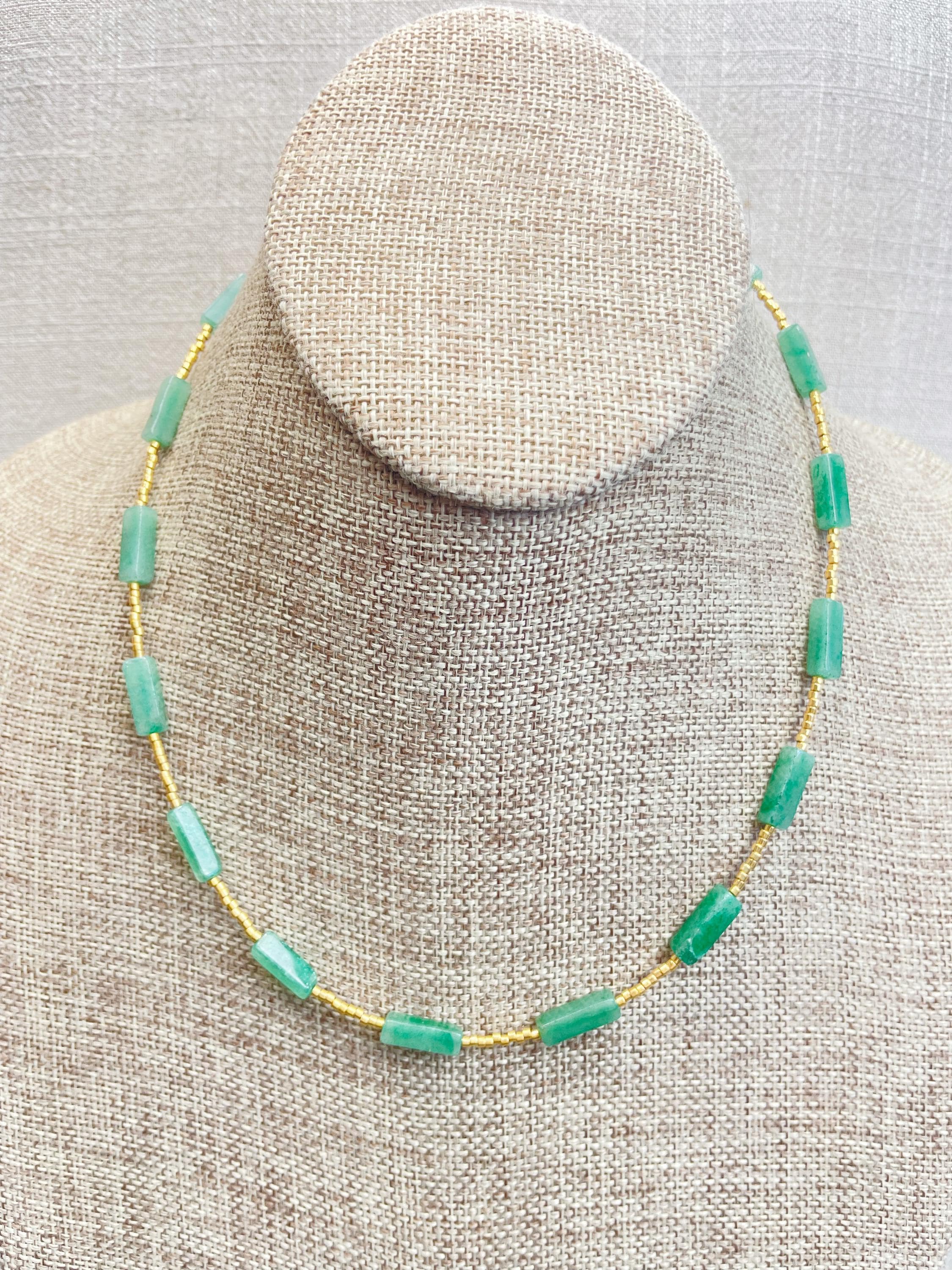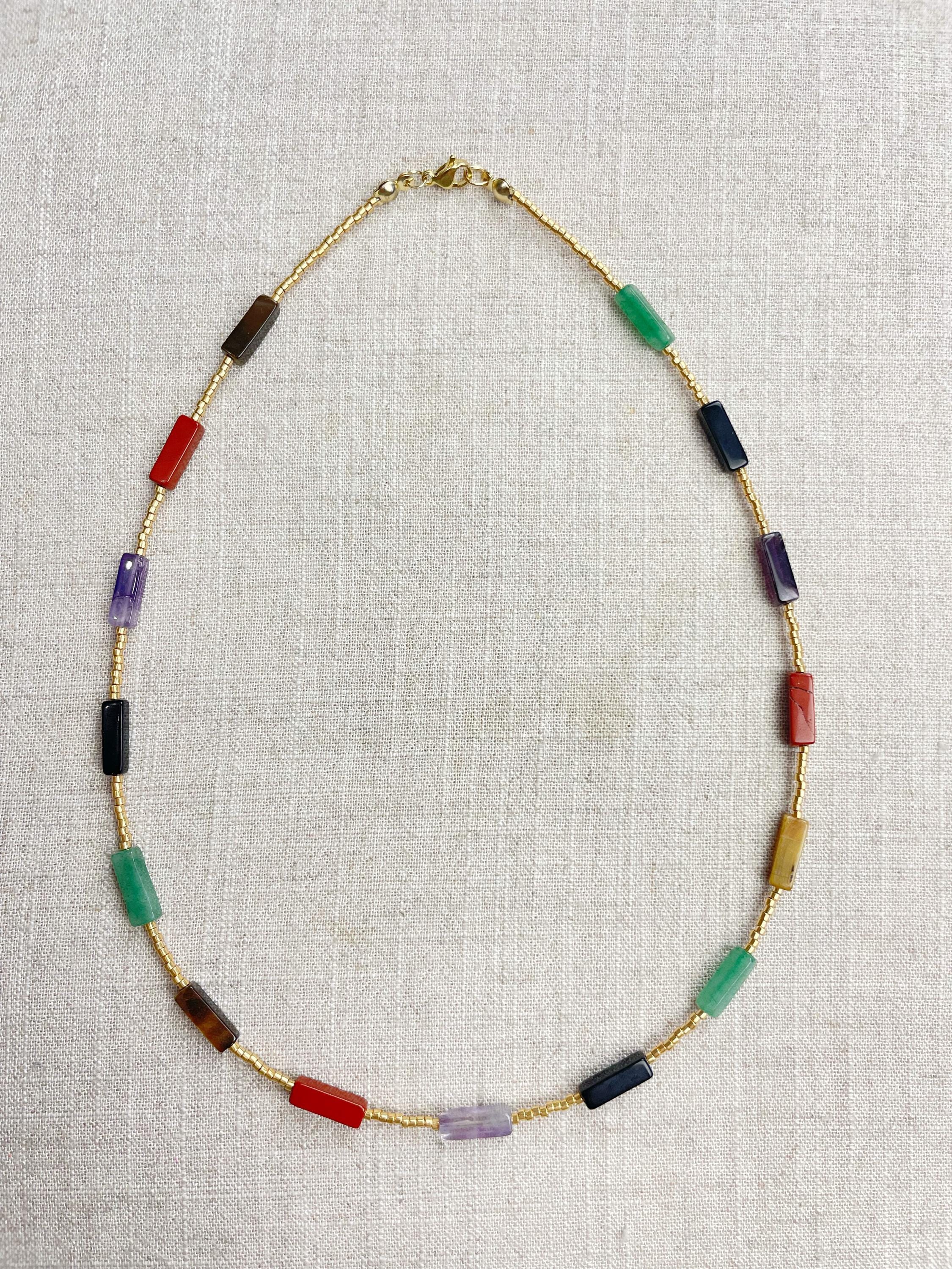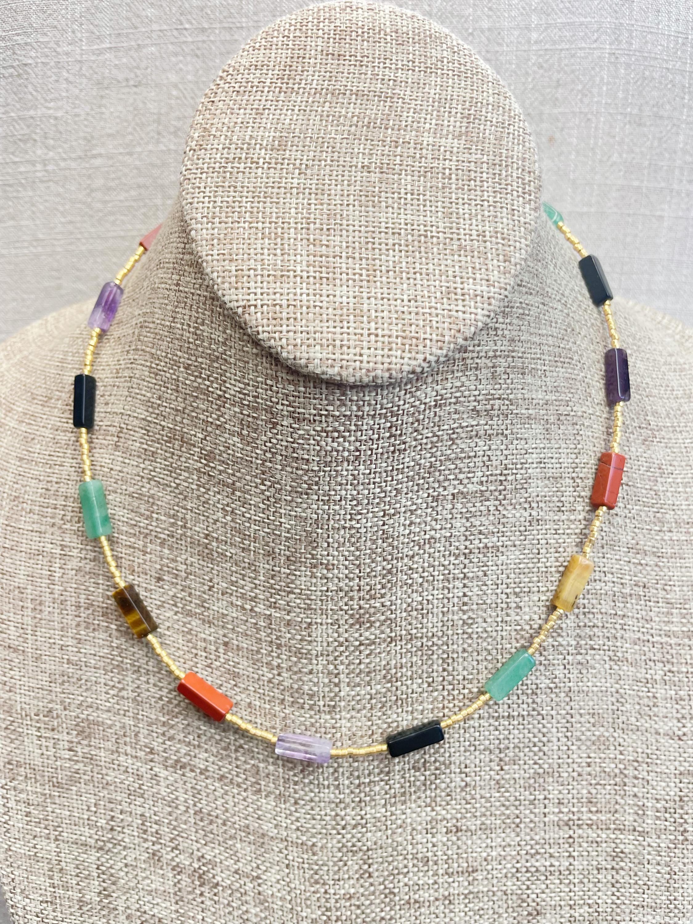 This necklace is made with galvanized gold 11/0 Miyuki glass seed beads. The seed beads are paired with beautiful gemstone necklaces stone rectangle tube beads. Each necklace is strung on a stainless steel beading wire. The necklace is finished off with a gold plated stainless steel lobster clasp and a logo charm.