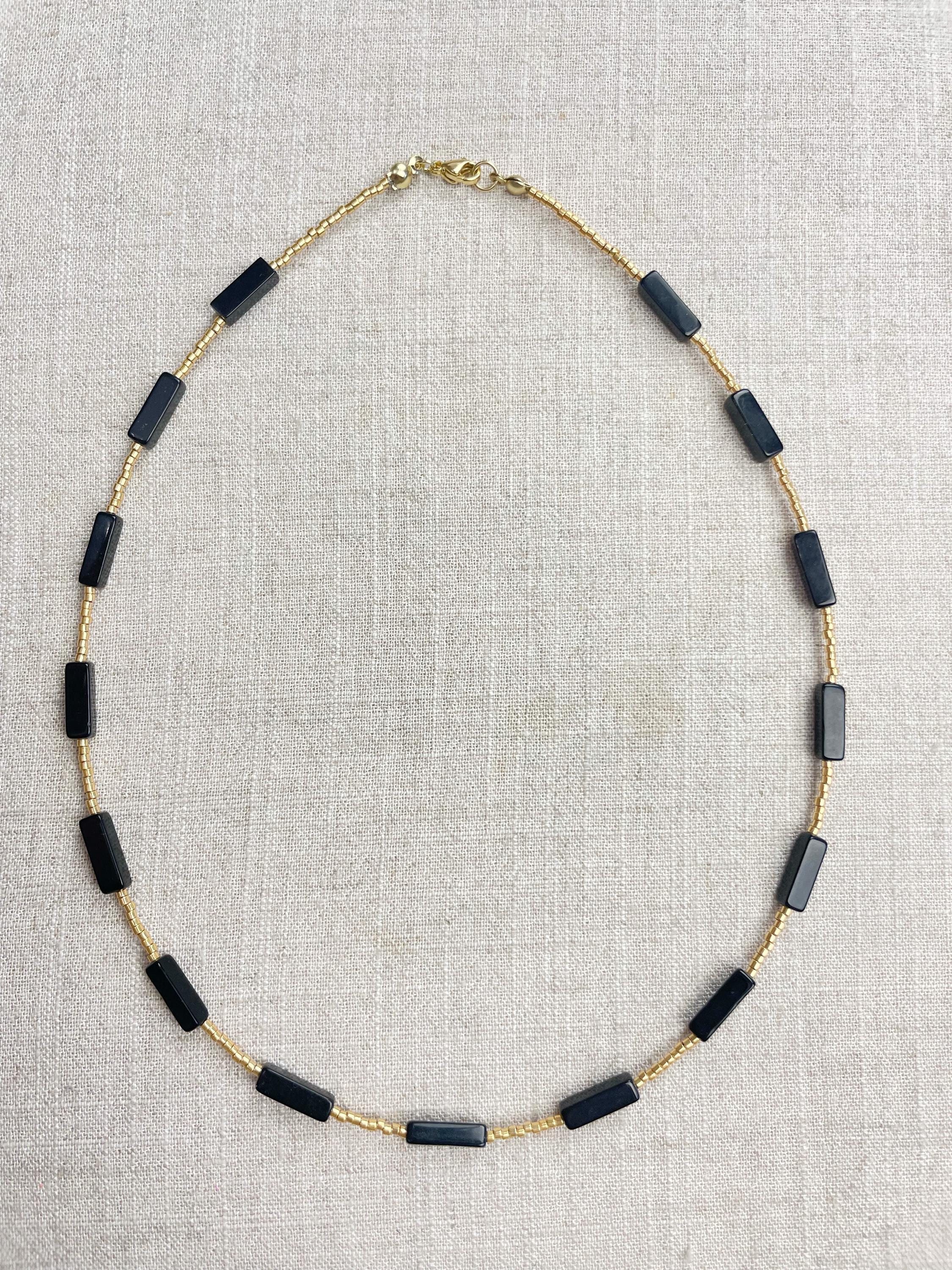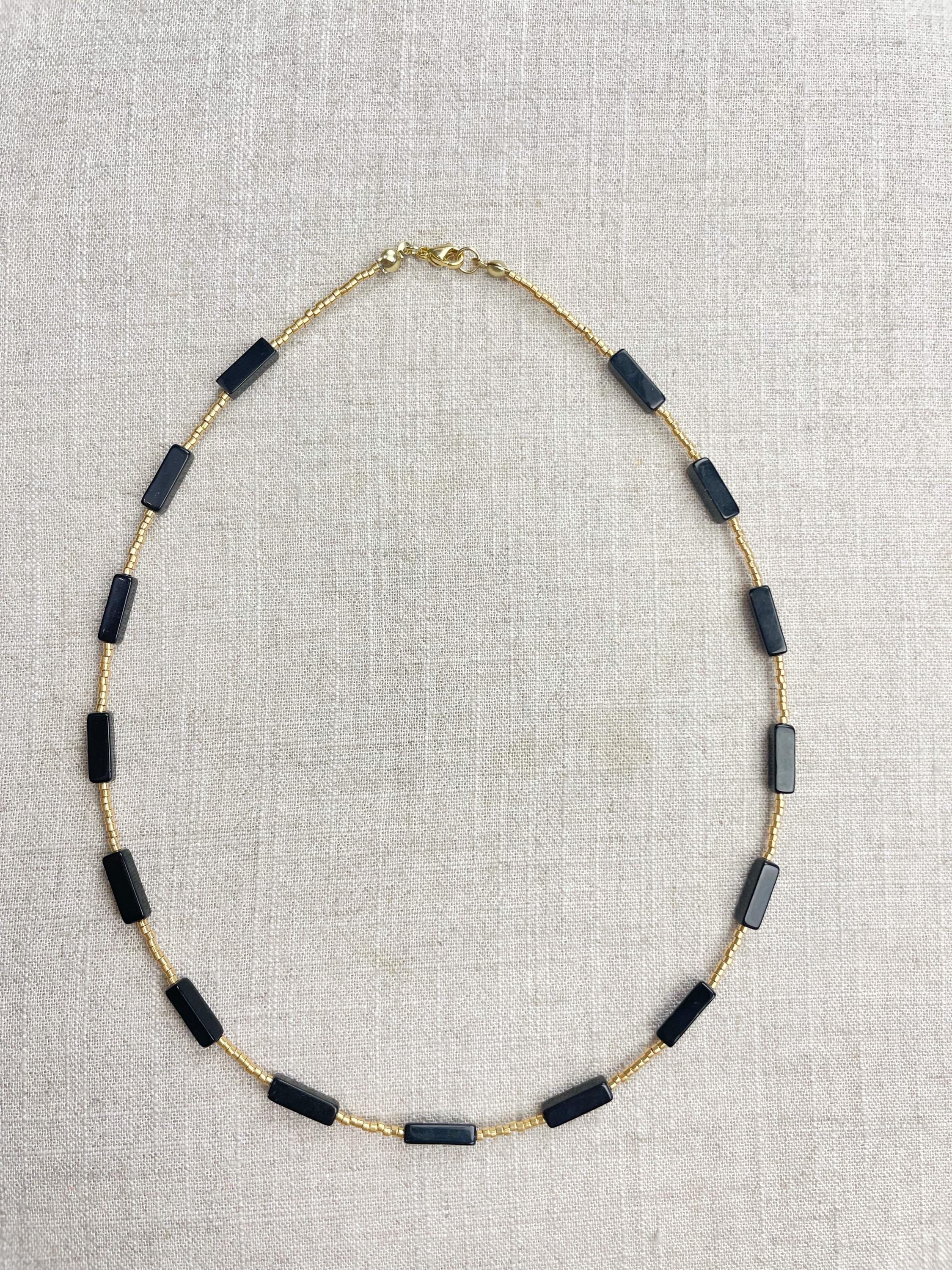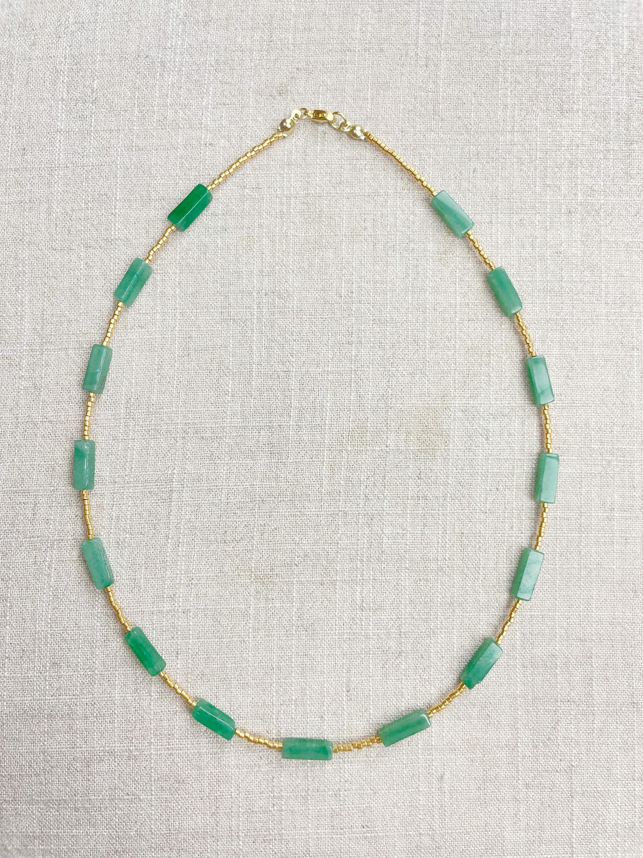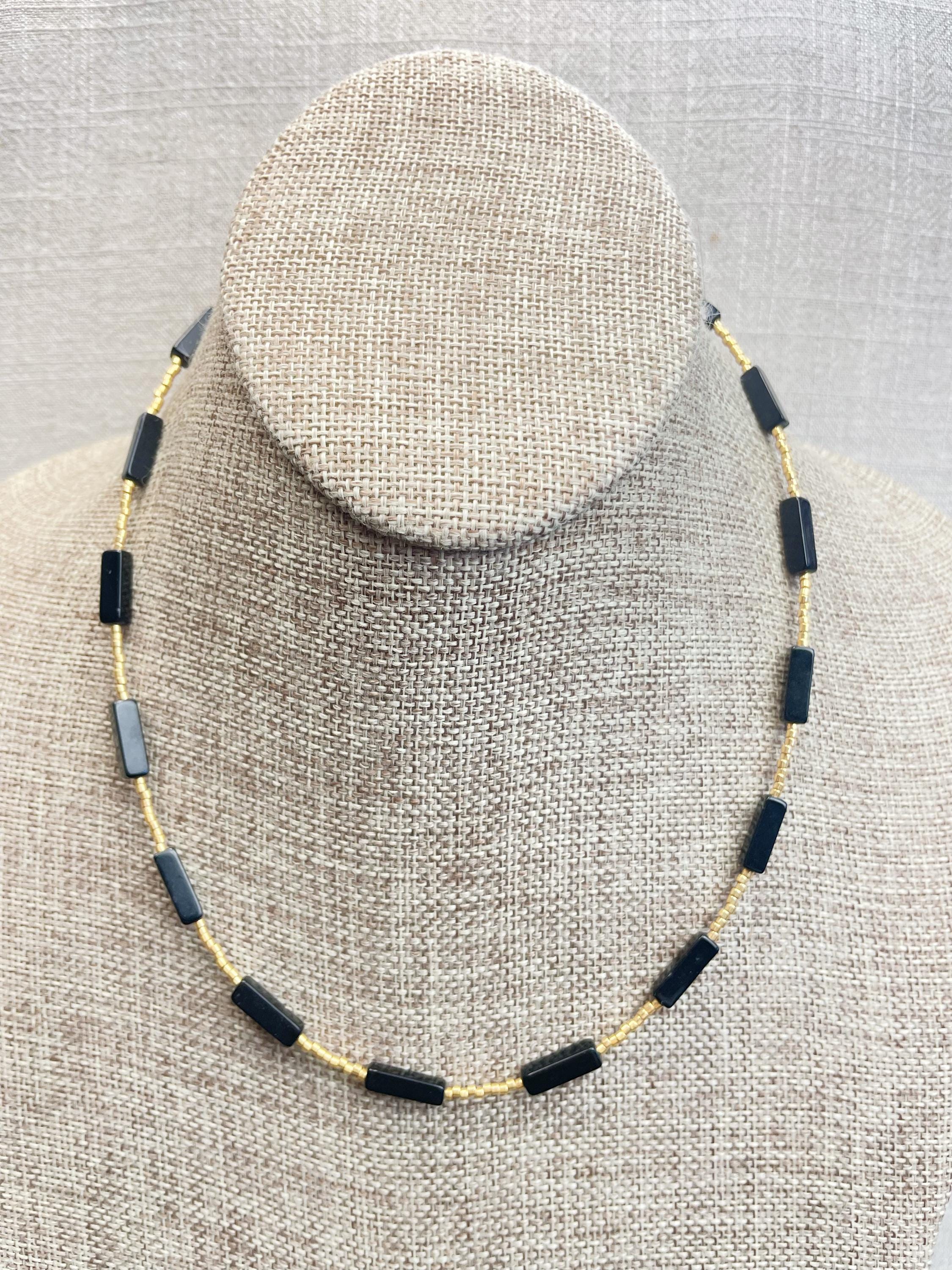 This necklace is made with galvanized gold 11/0 Miyuki glass seed beads. The seed beads are paired with beautiful gemstone necklaces stone rectangle tube beads. Each necklace is strung on a stainless steel beading wire. The necklace is finished off with a gold plated stainless steel lobster clasp and a logo charm.