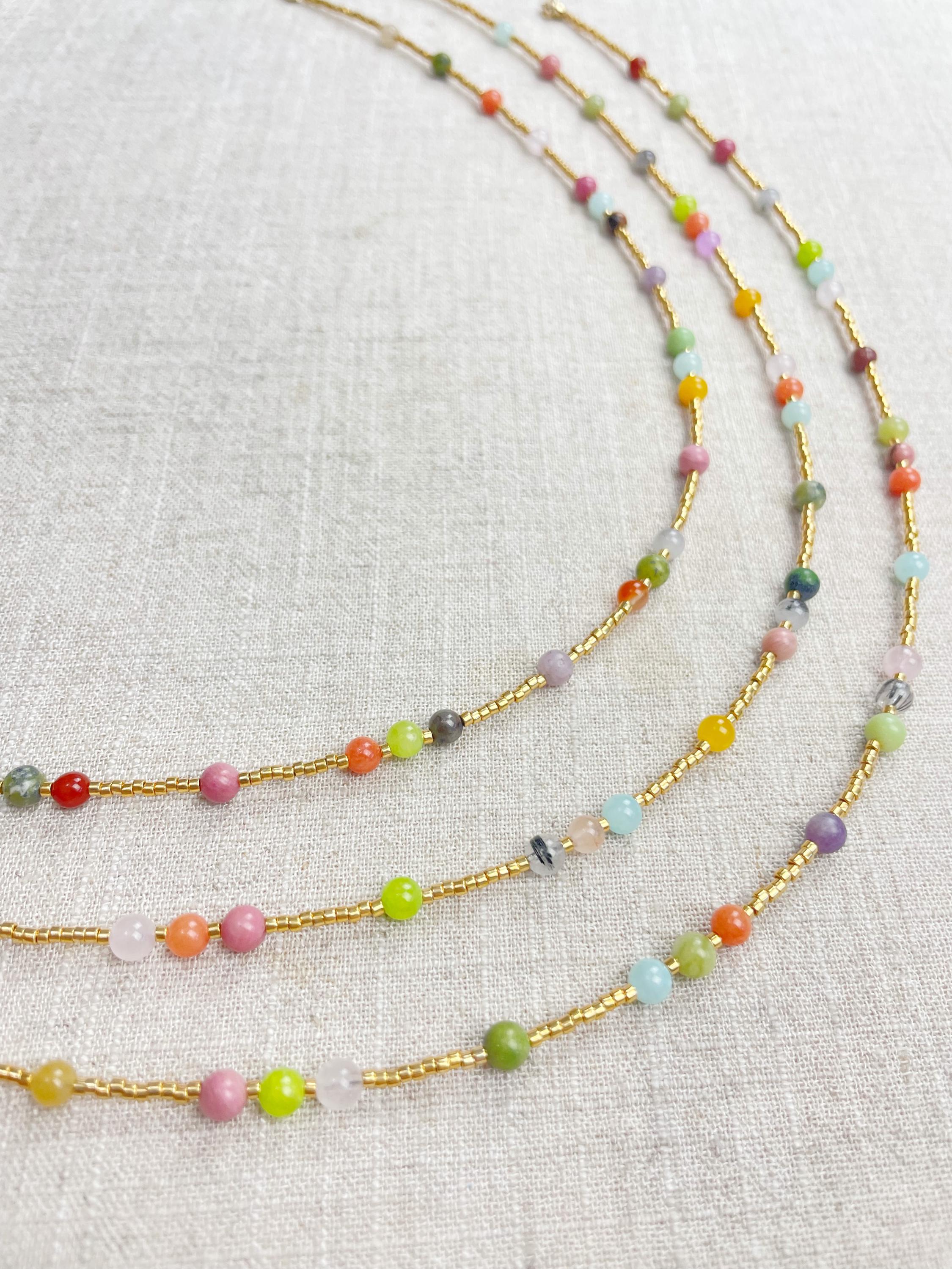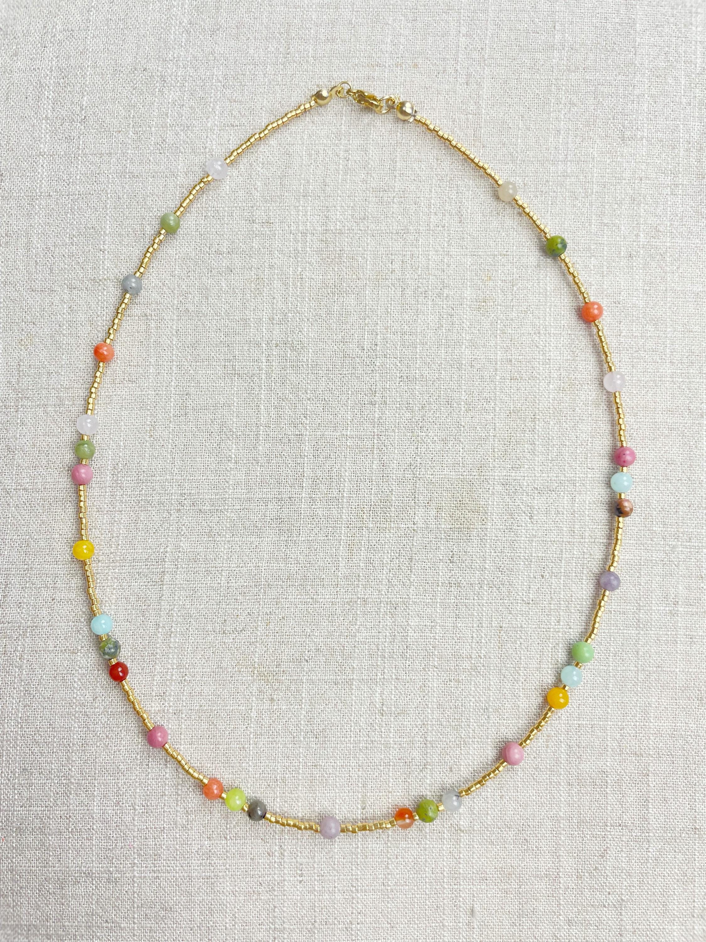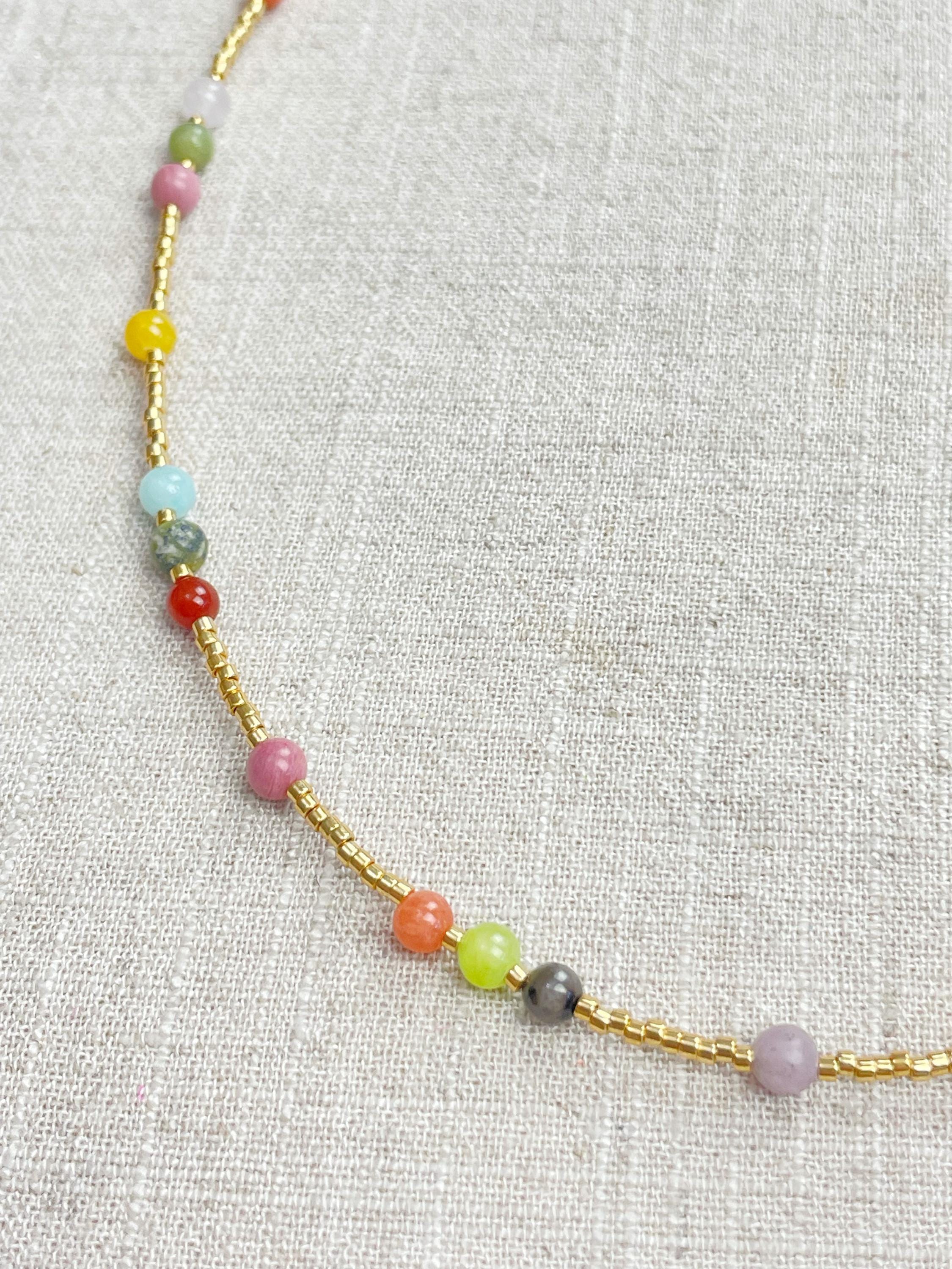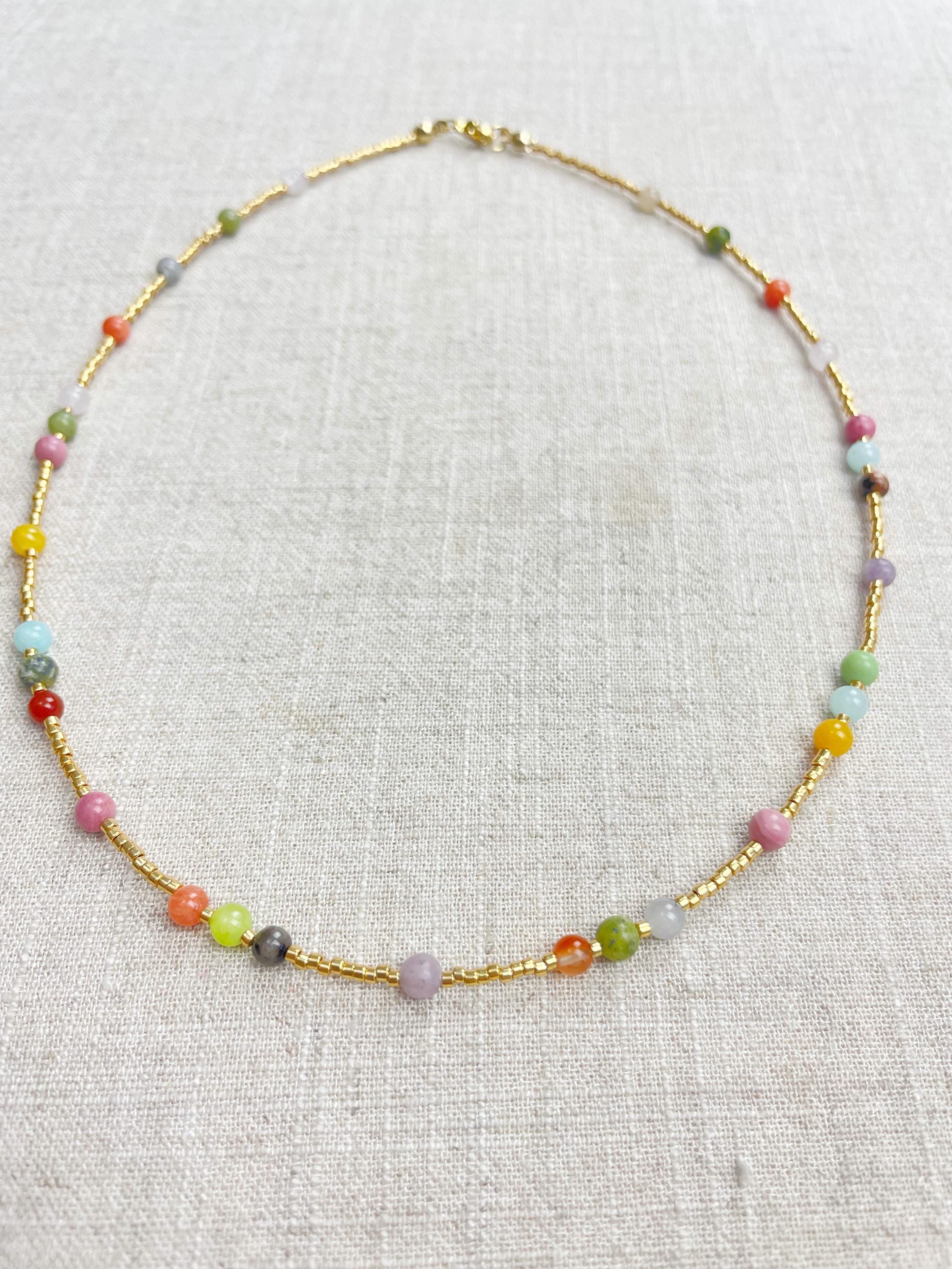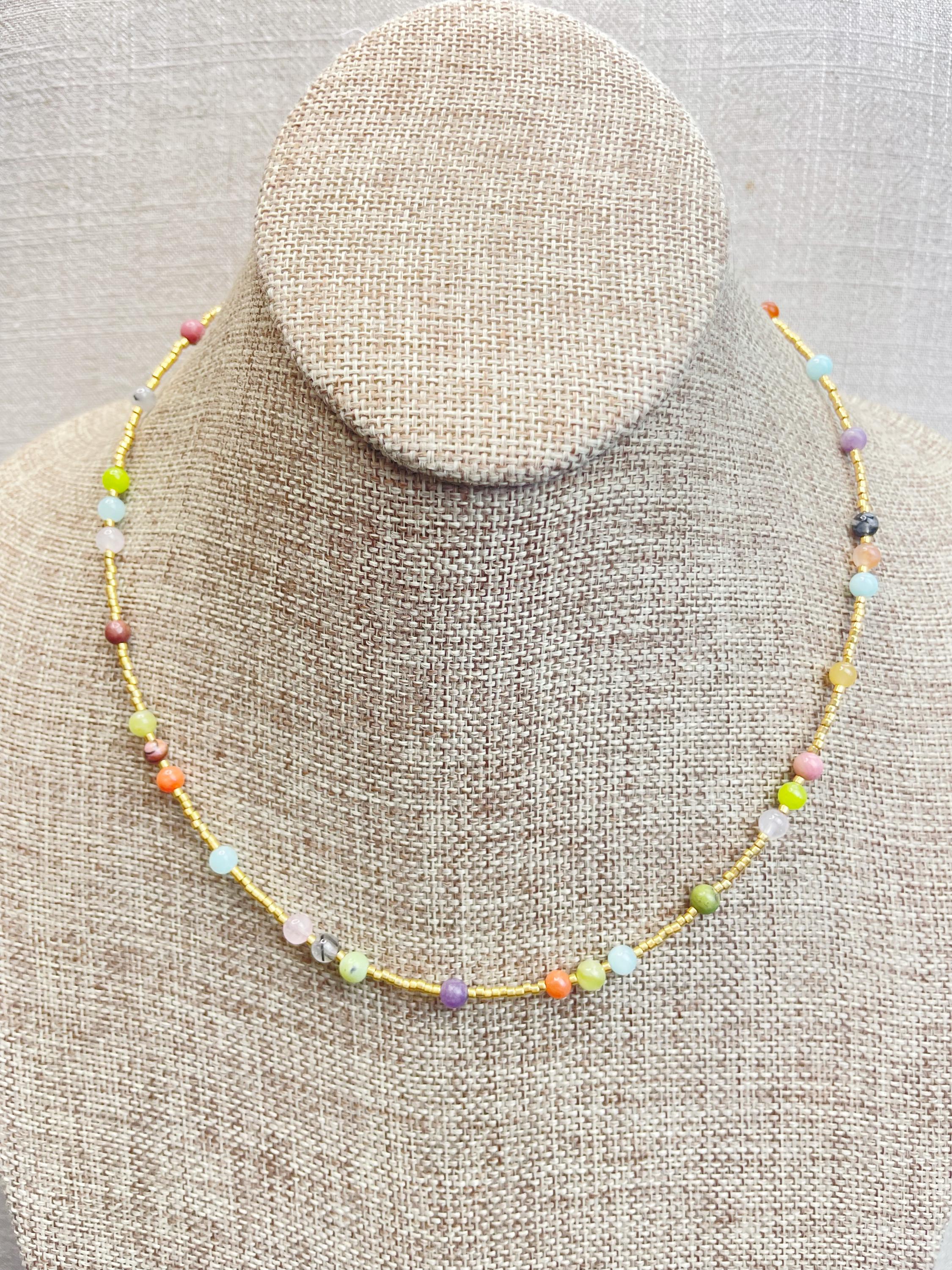 This necklace is made with galvanized gold 11/0 Miyuki glass seed beads. The seed beads are paired with beautiful gemstone stone round beads. Each necklace is strung on a stainless steel beading wire. The necklace is finished off with a gold plated stainless steel lobster clasp and a logo charm.