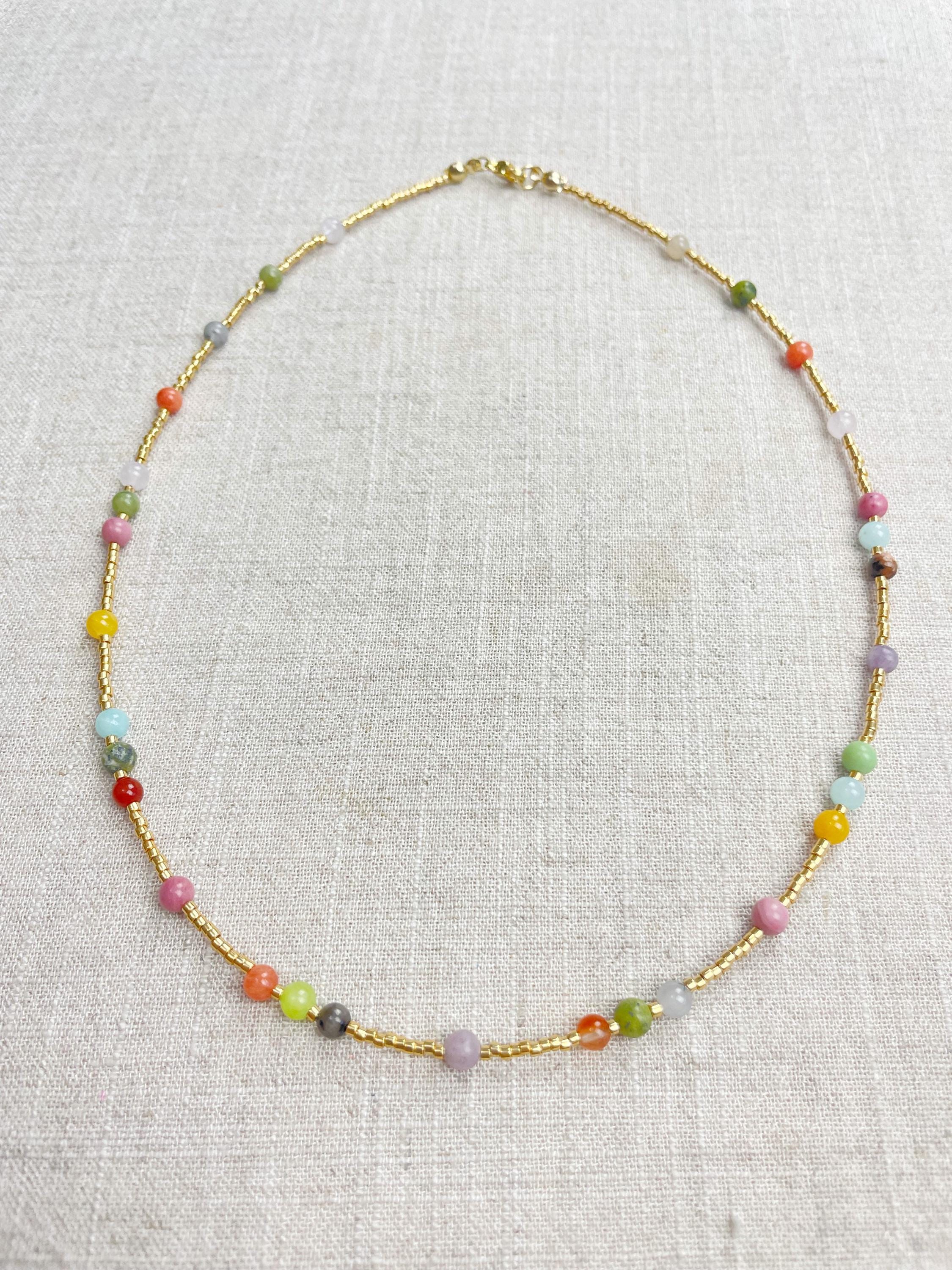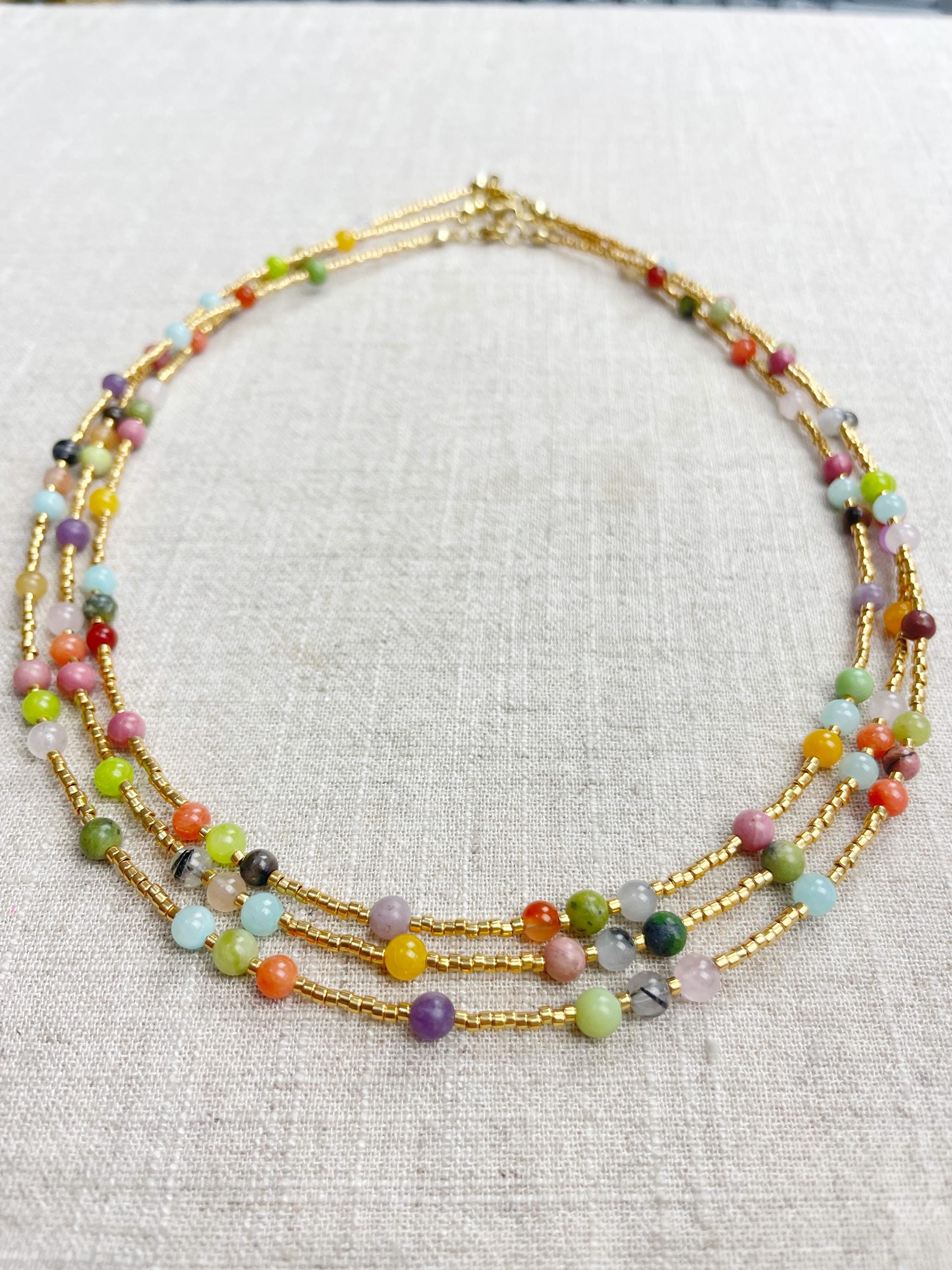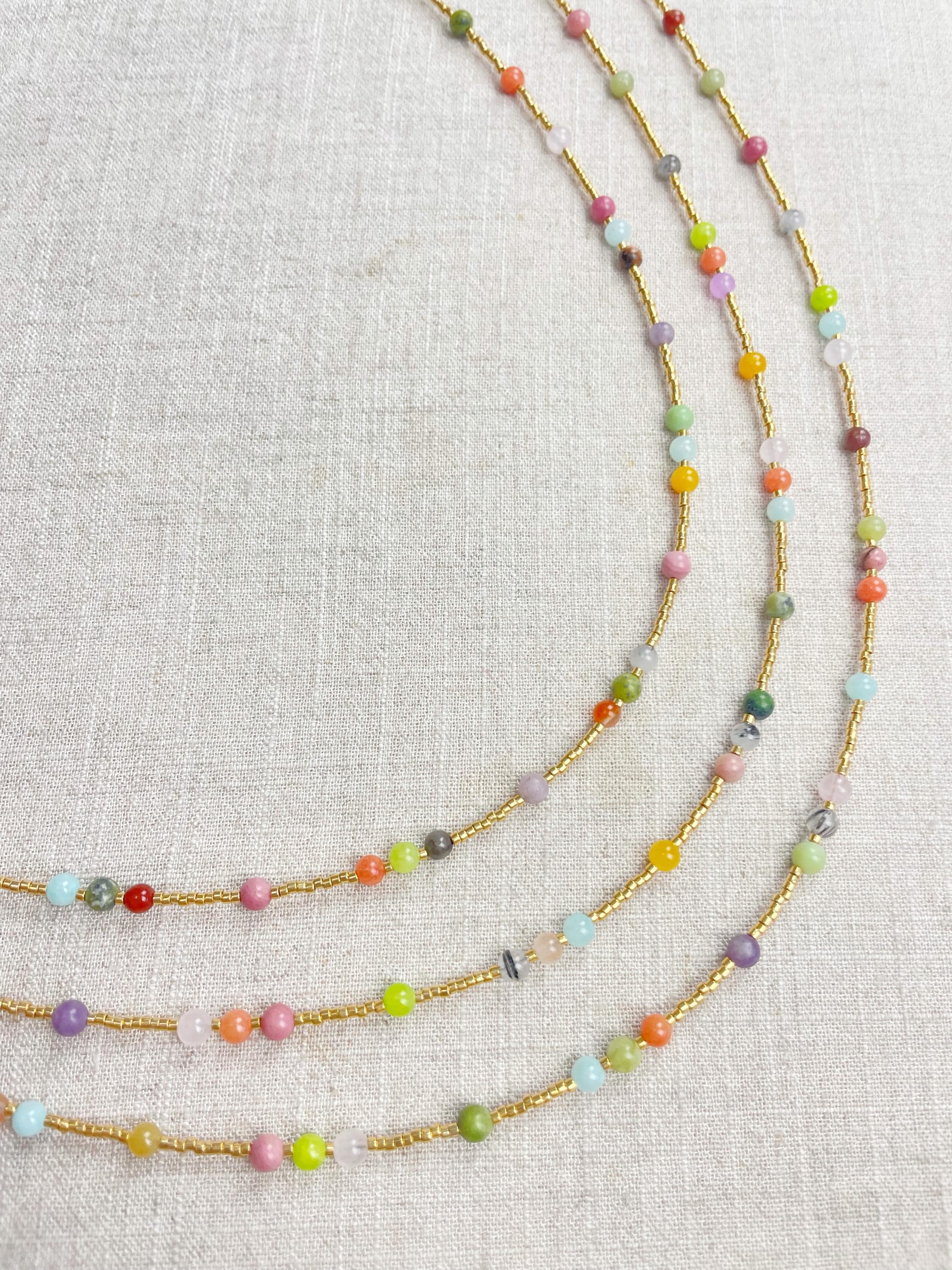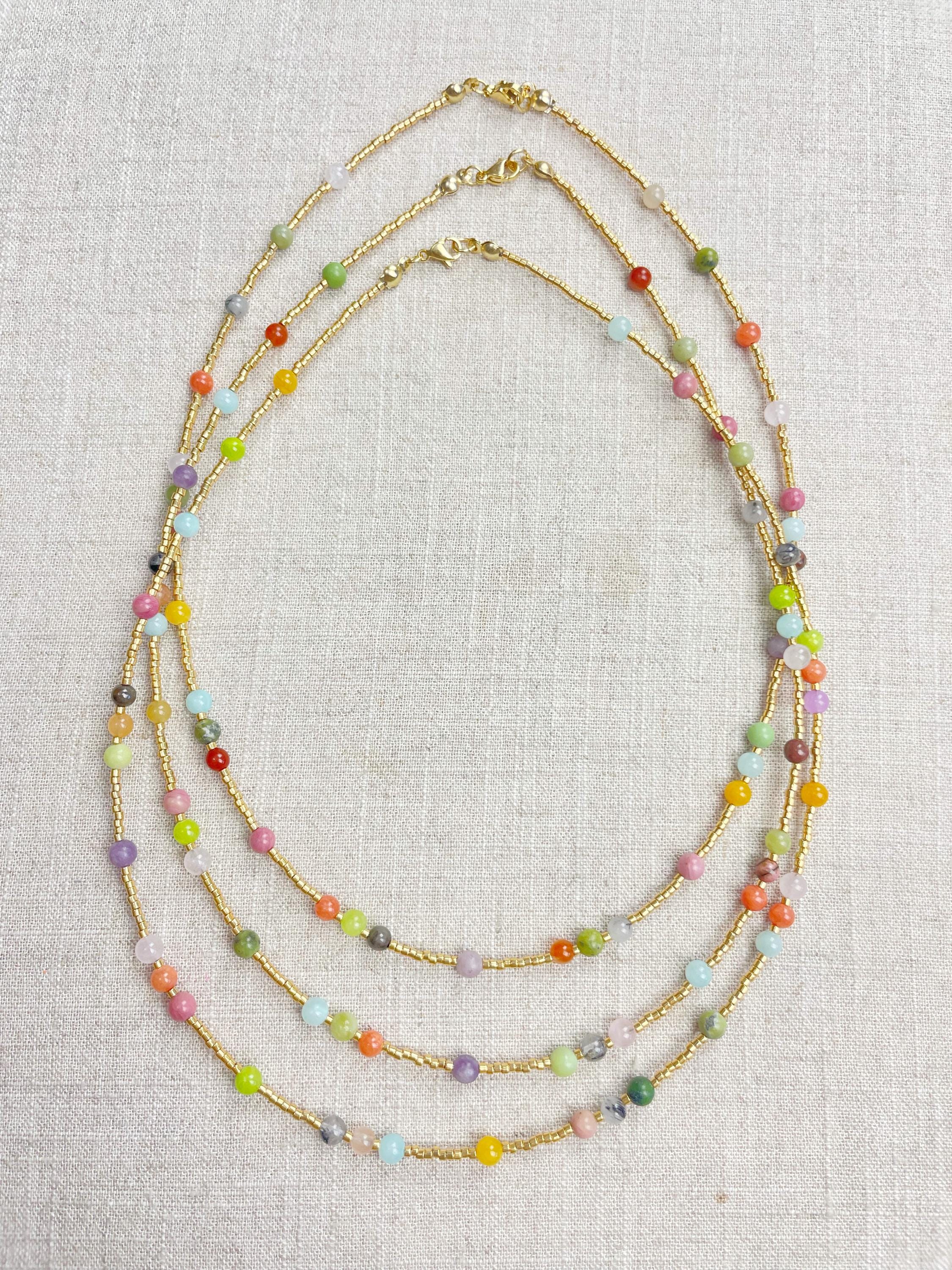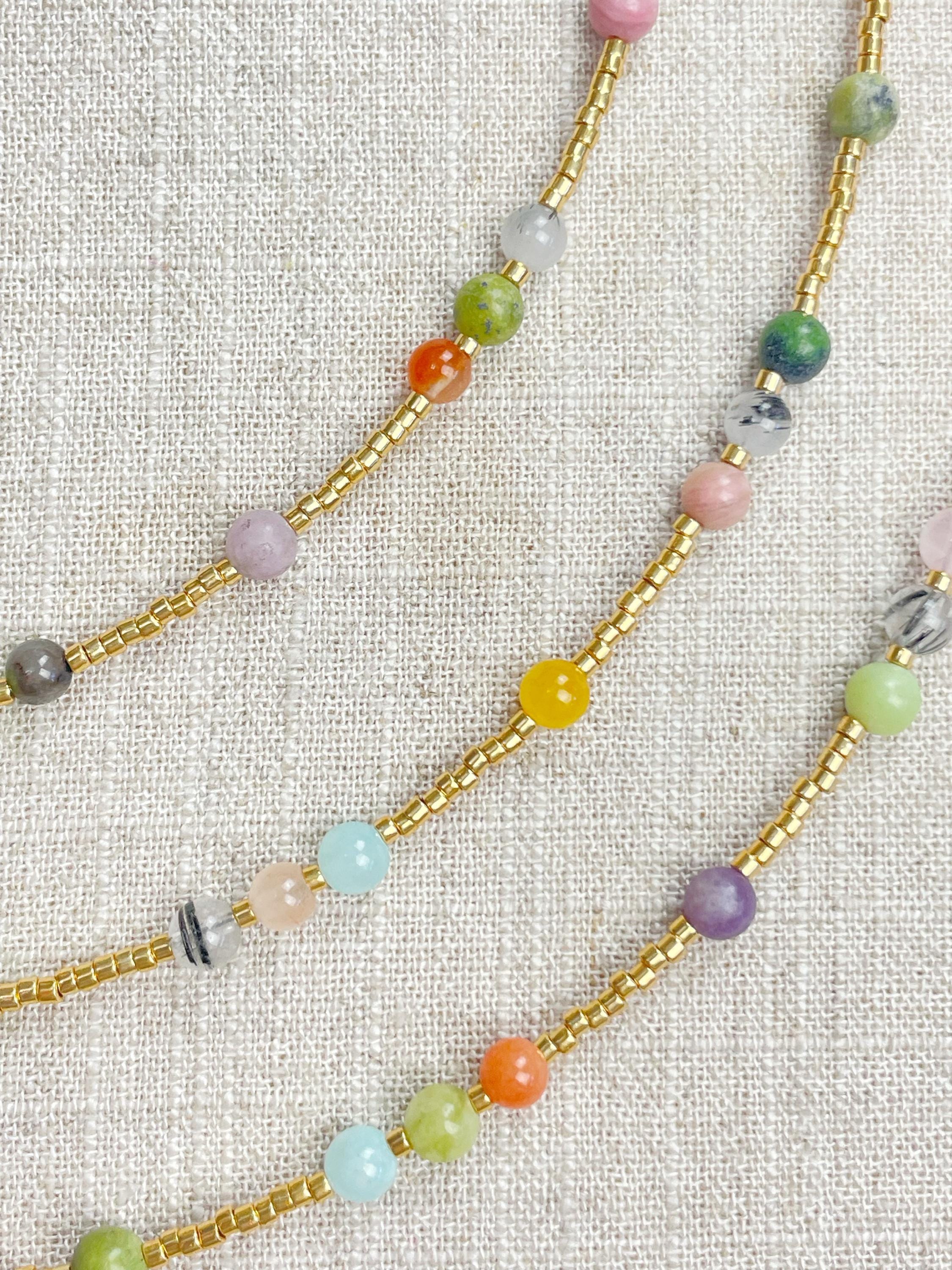 This necklace is made with galvanized gold 11/0 Miyuki glass seed beads. The seed beads are paired with beautiful gemstone stone round beads. Each necklace is strung on a stainless steel beading wire. The necklace is finished off with a gold plated stainless steel lobster clasp and a logo charm.