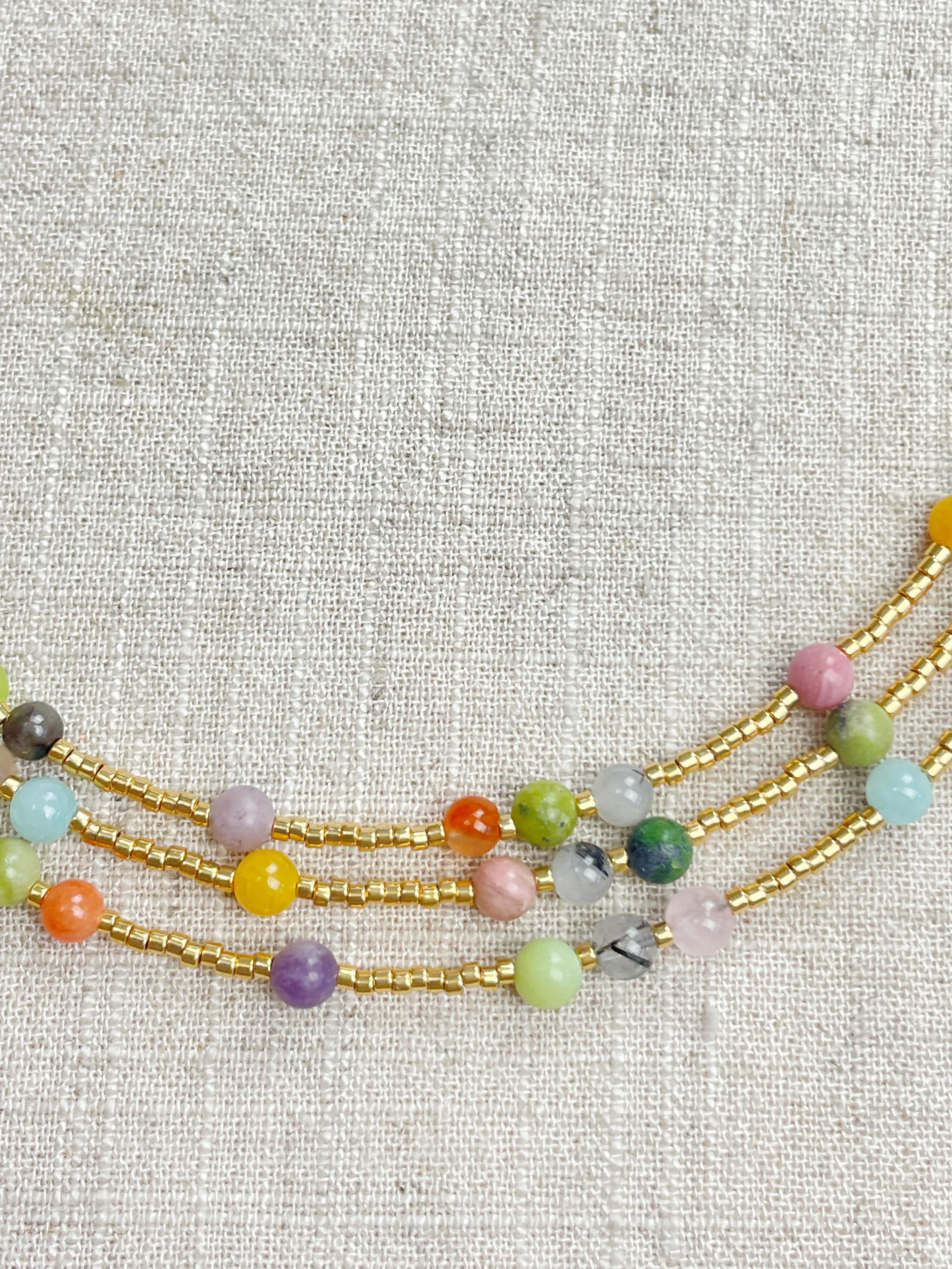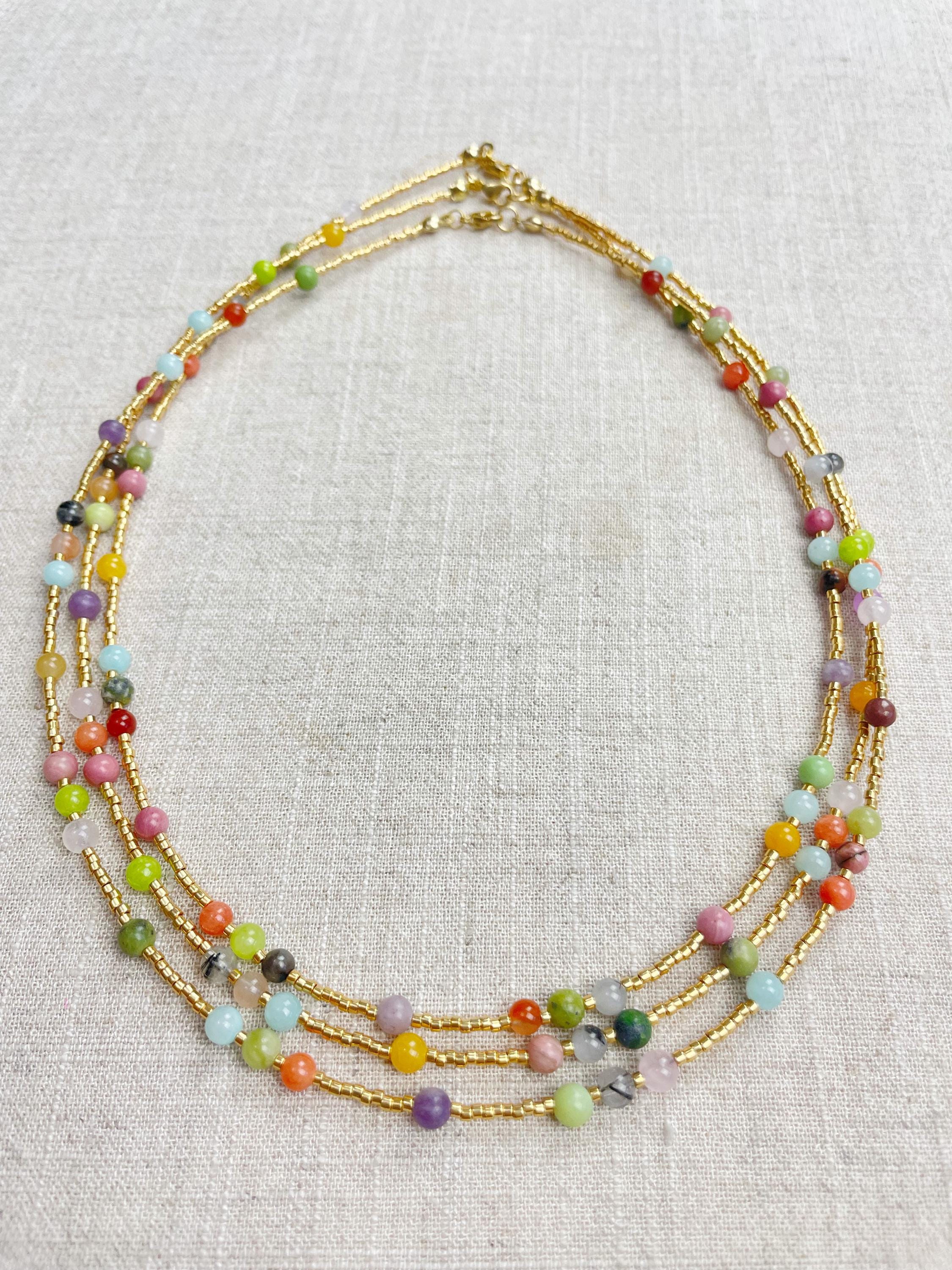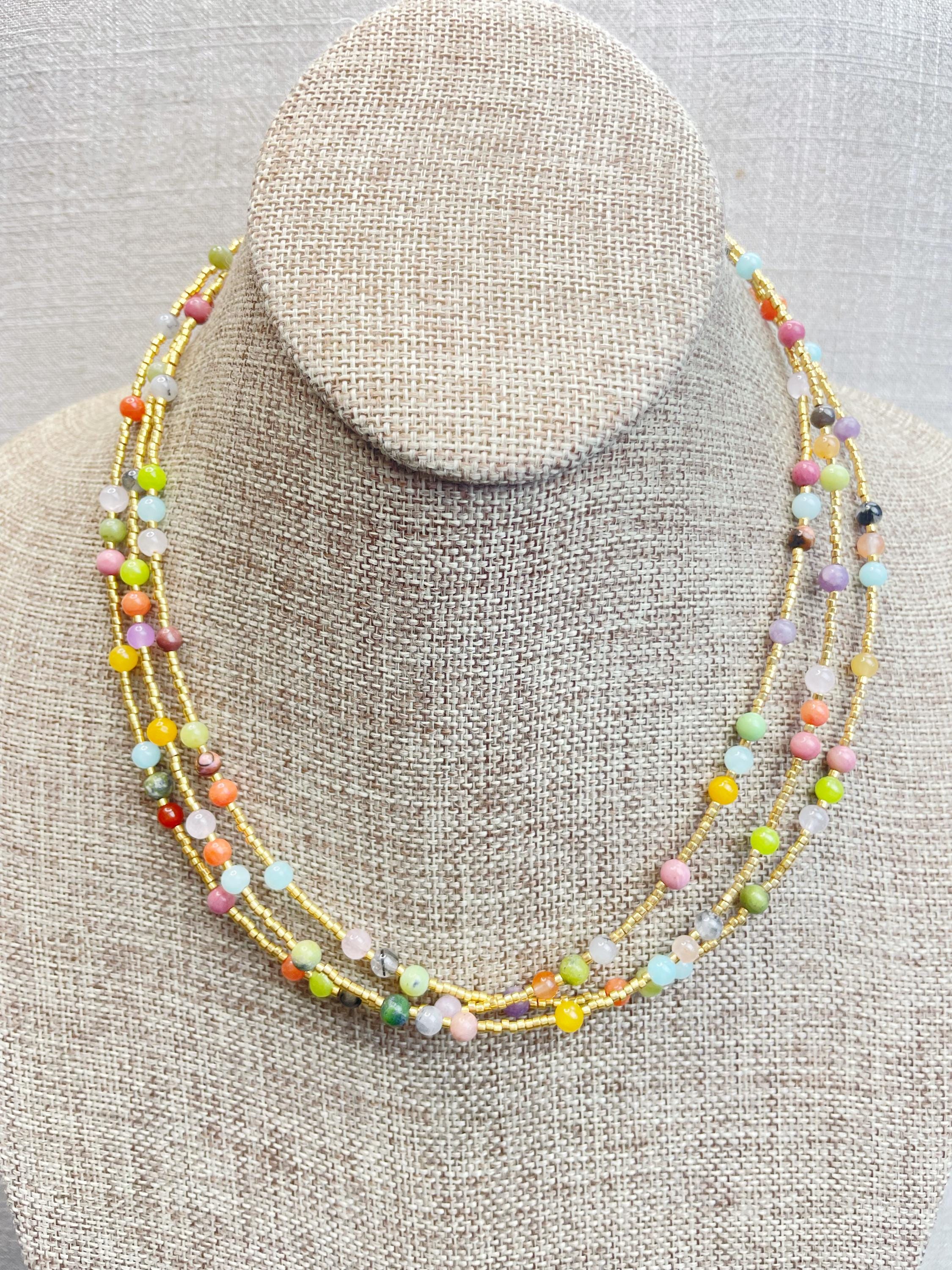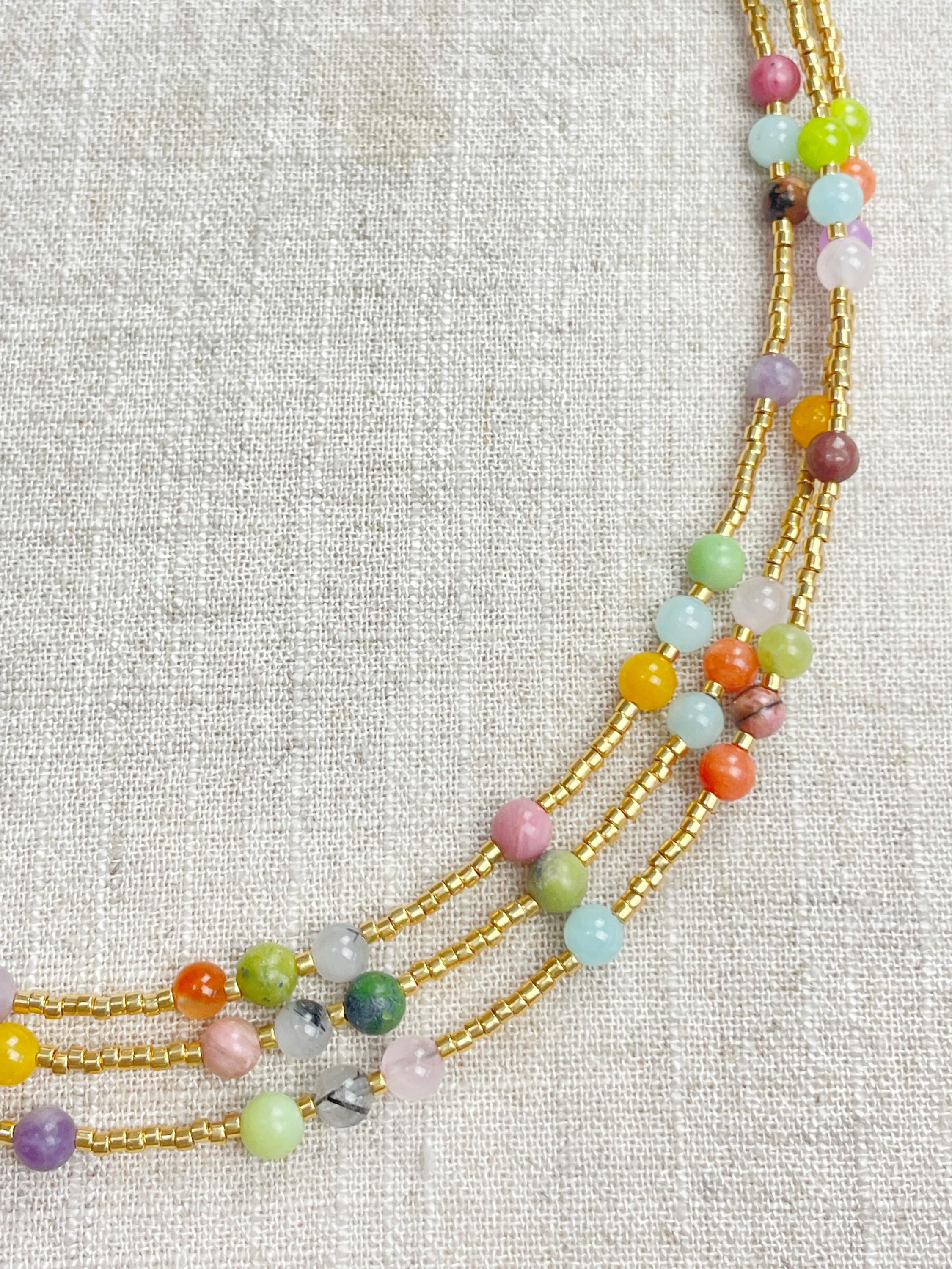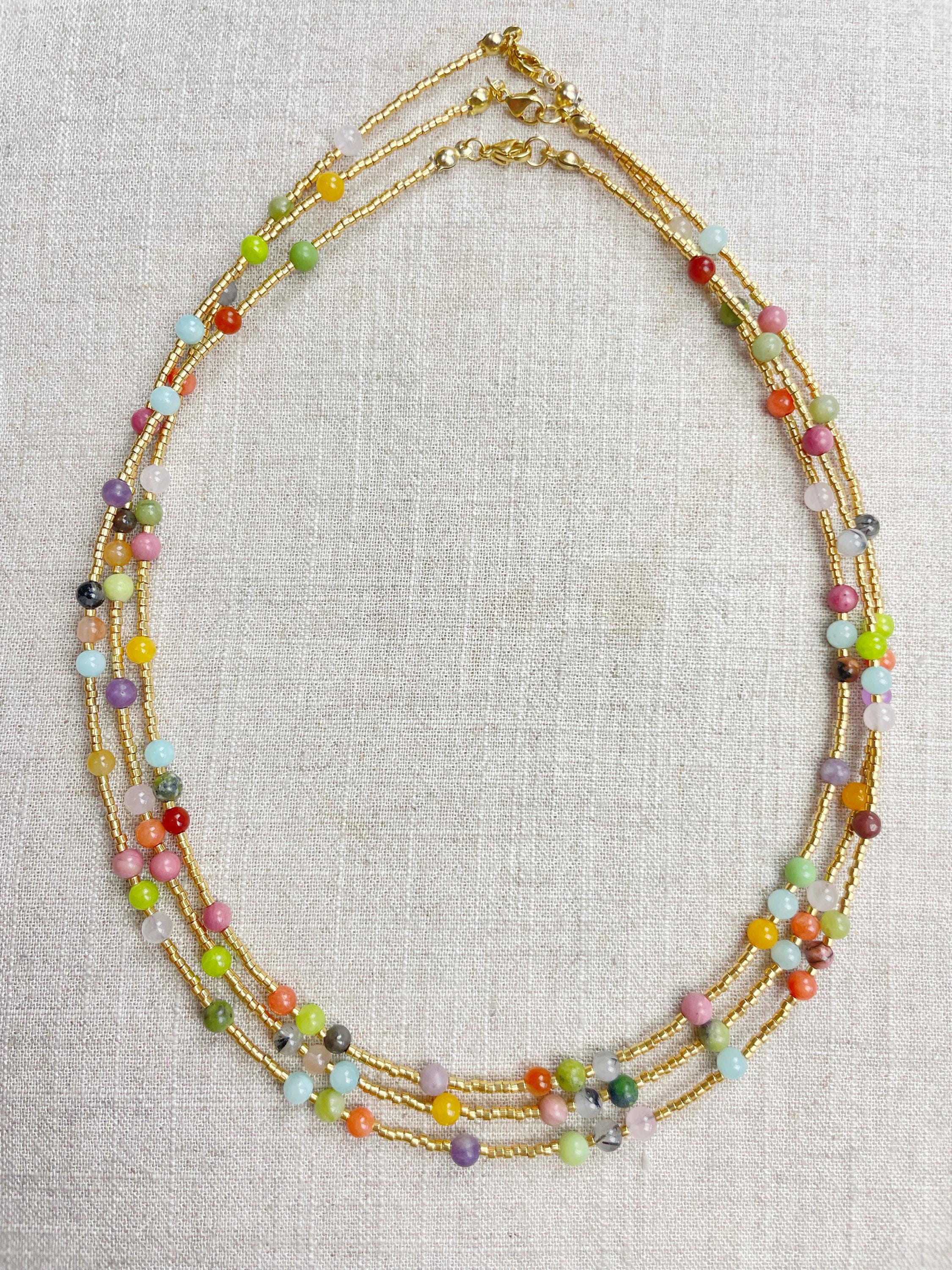 This necklace is made with galvanized gold 11/0 Miyuki glass seed beads. The seed beads are paired with beautiful gemstone stone round beads. Each necklace is strung on a stainless steel beading wire. The necklace is finished off with a gold plated stainless steel lobster clasp and a logo charm.