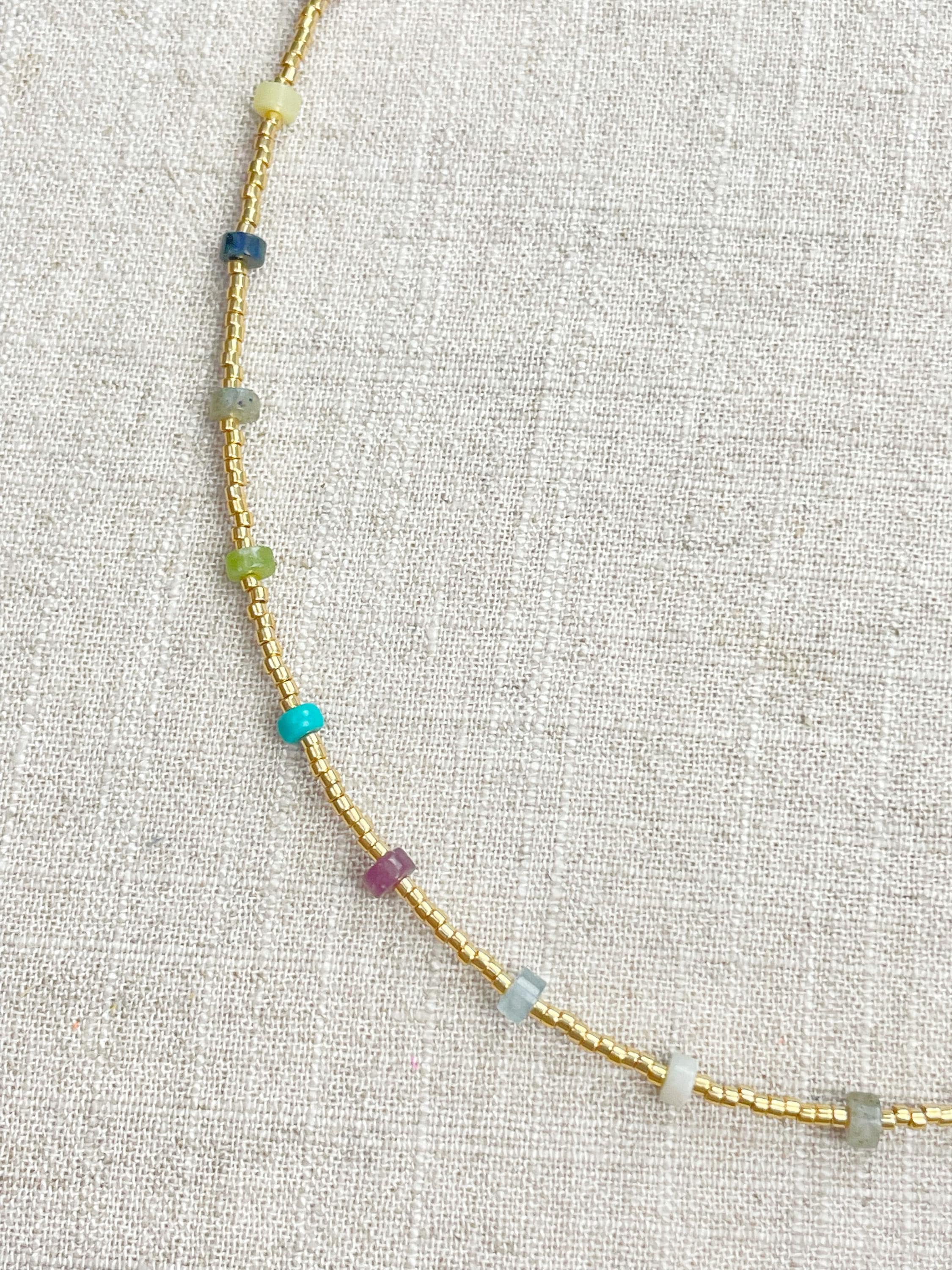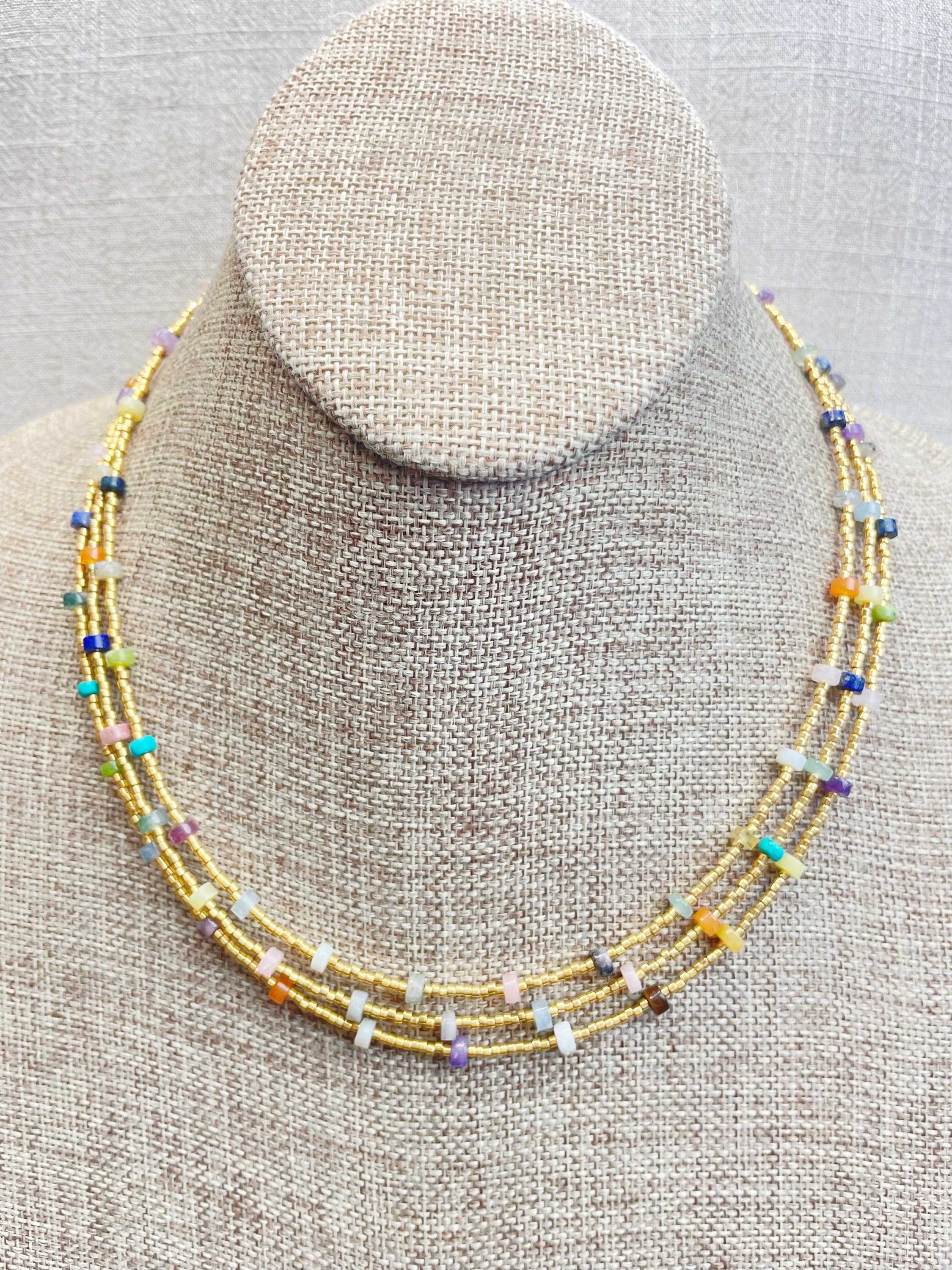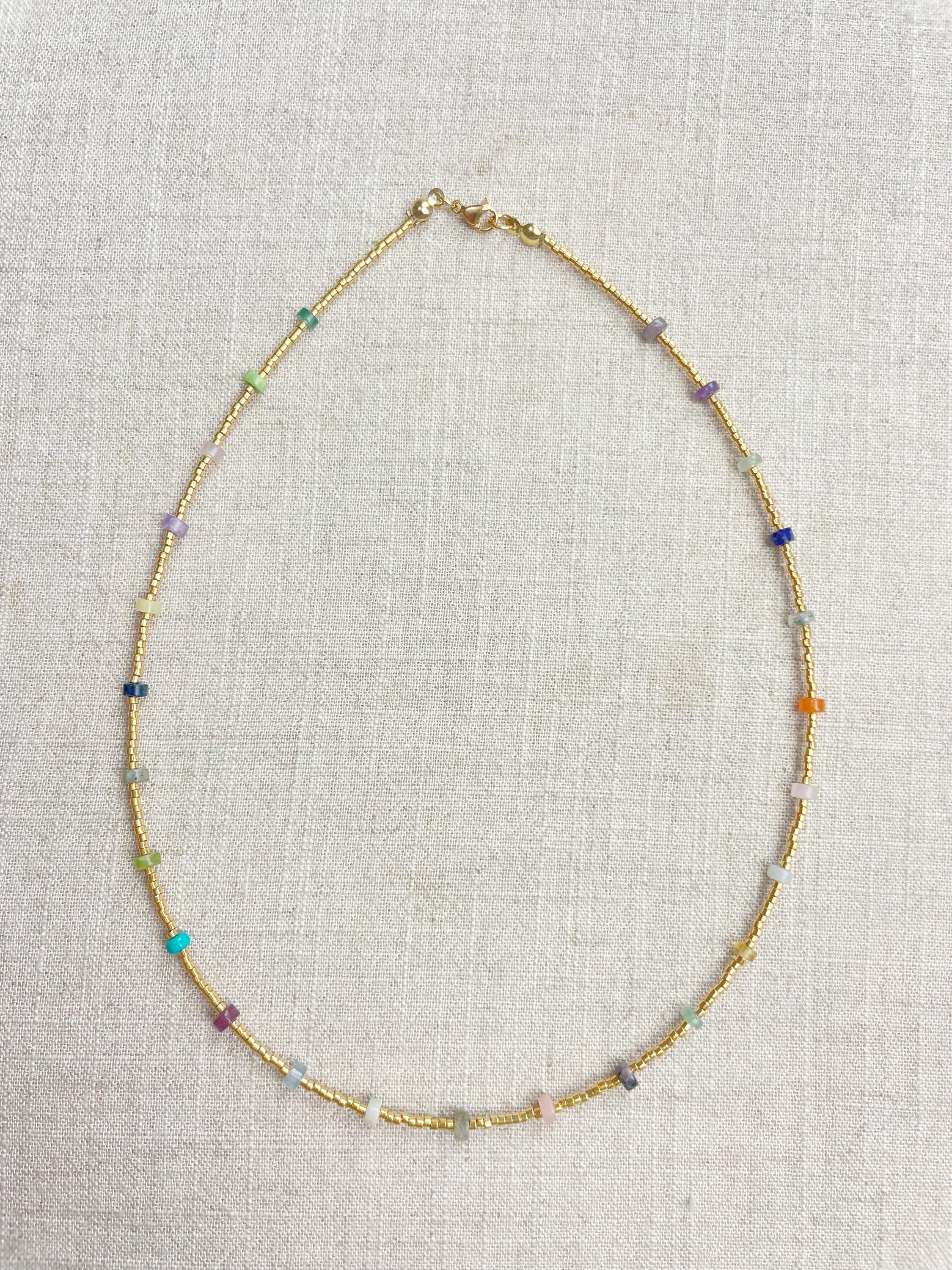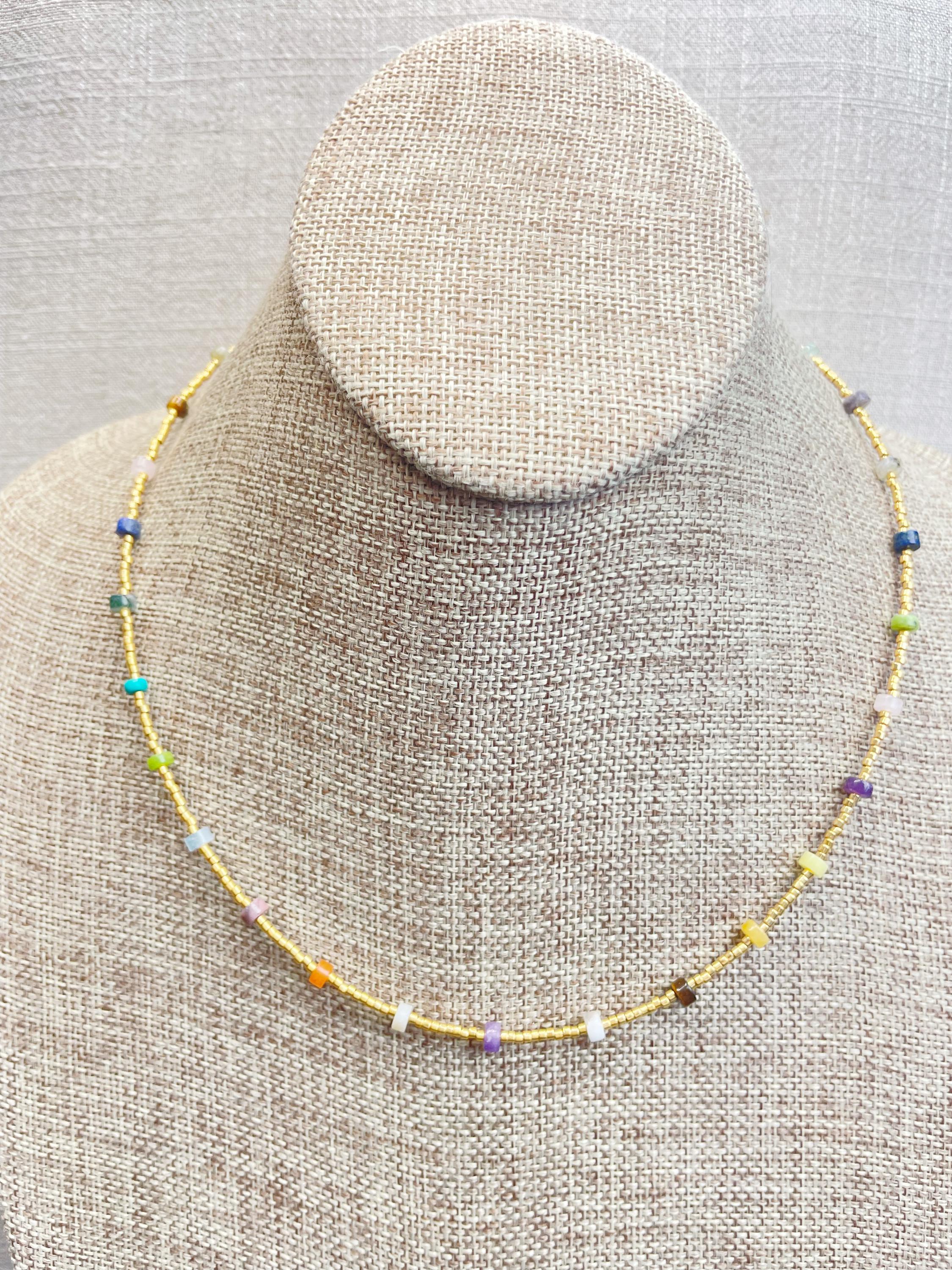 This necklace is made with galvanized gold 11/0 Miyuki glass seed beads. The seed beads are paired with beautiful gemstone stone heishi beads. Each necklace is strung on a stainless steel beading wire. The necklace is finished off with a gold plated stainless steel lobster clasp and a logo charm.