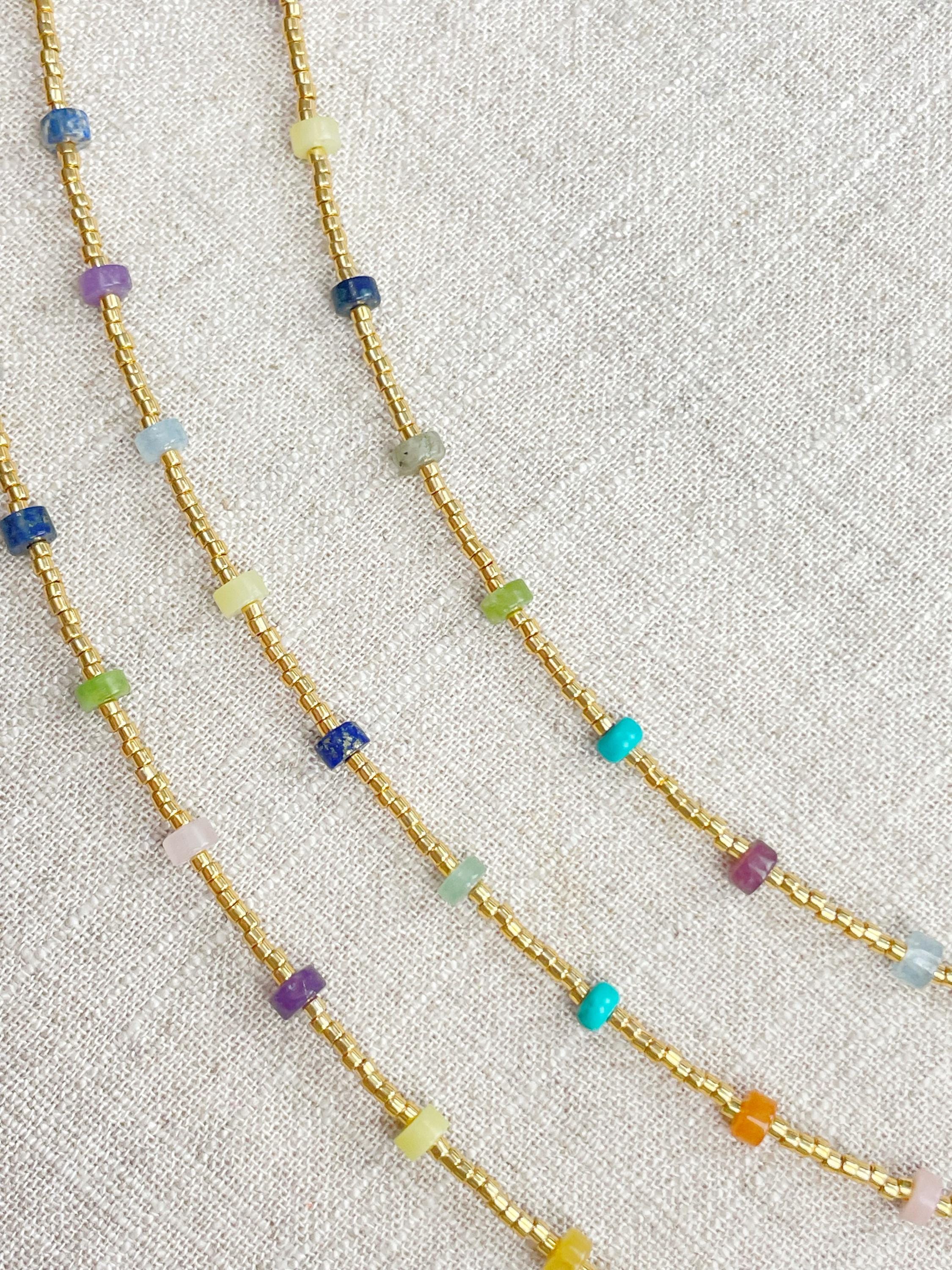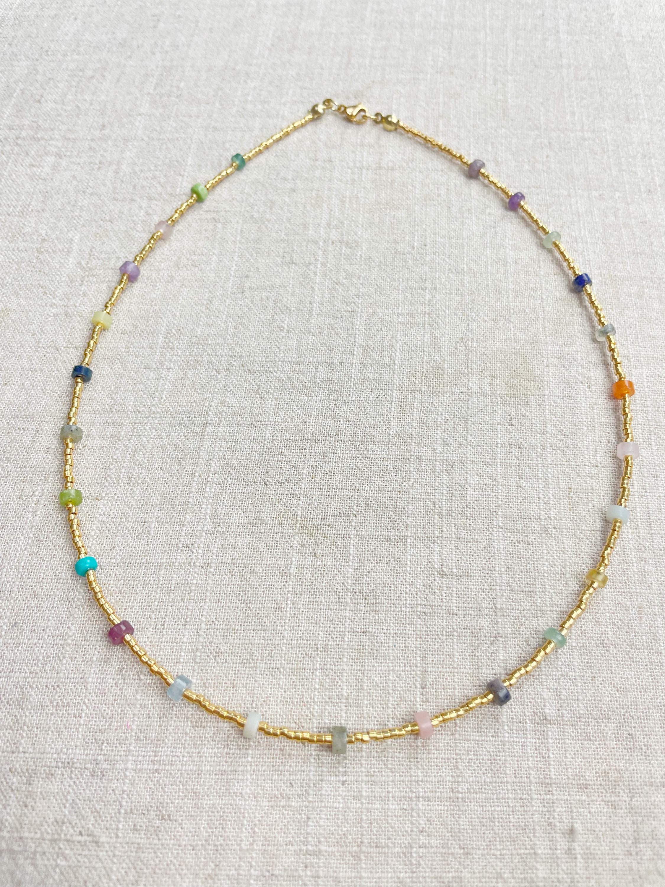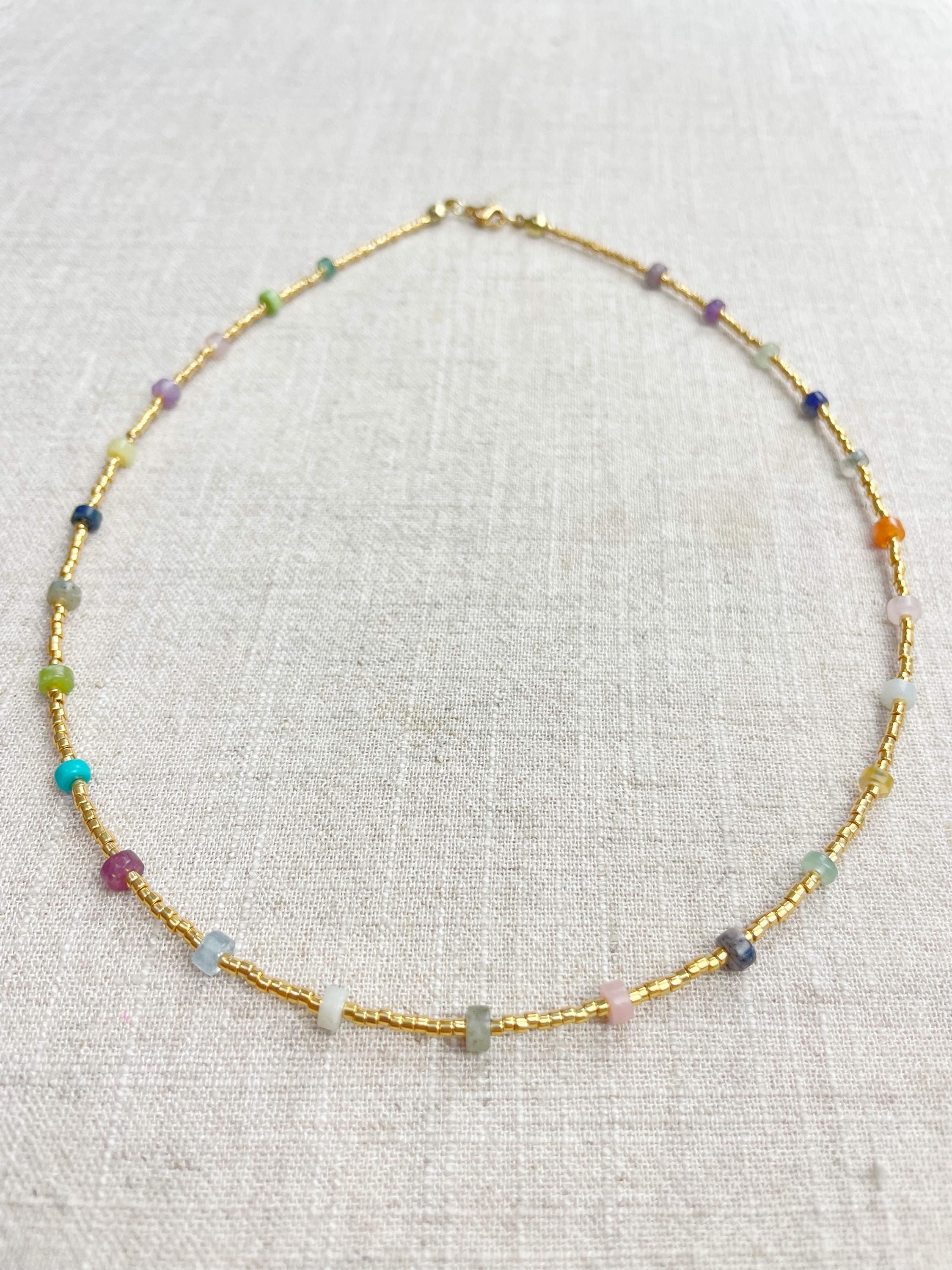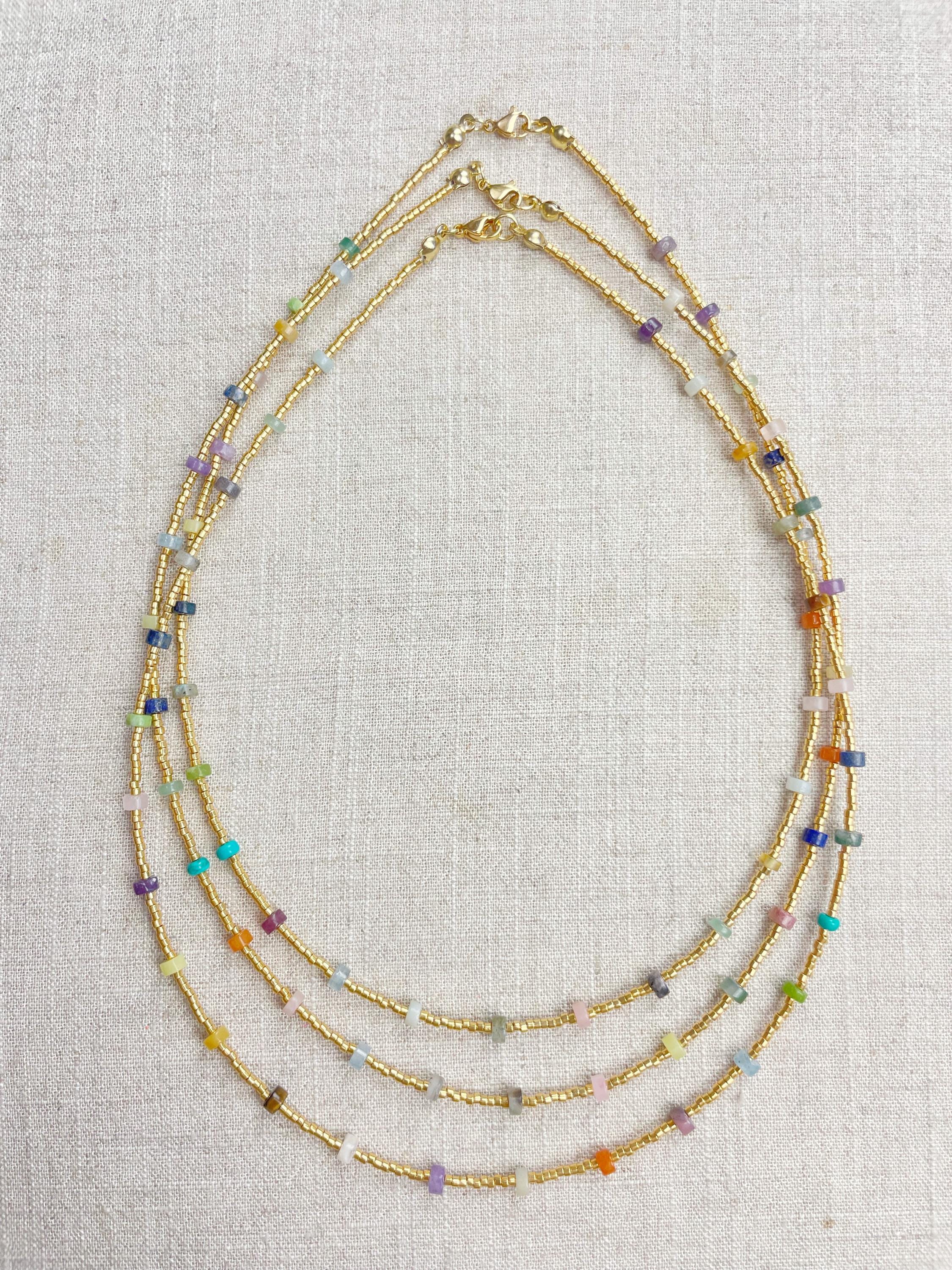 This necklace is made with galvanized gold 11/0 Miyuki glass seed beads. The seed beads are paired with beautiful gemstone stone heishi beads. Each necklace is strung on a stainless steel beading wire. The necklace is finished off with a gold plated stainless steel lobster clasp and a logo charm.