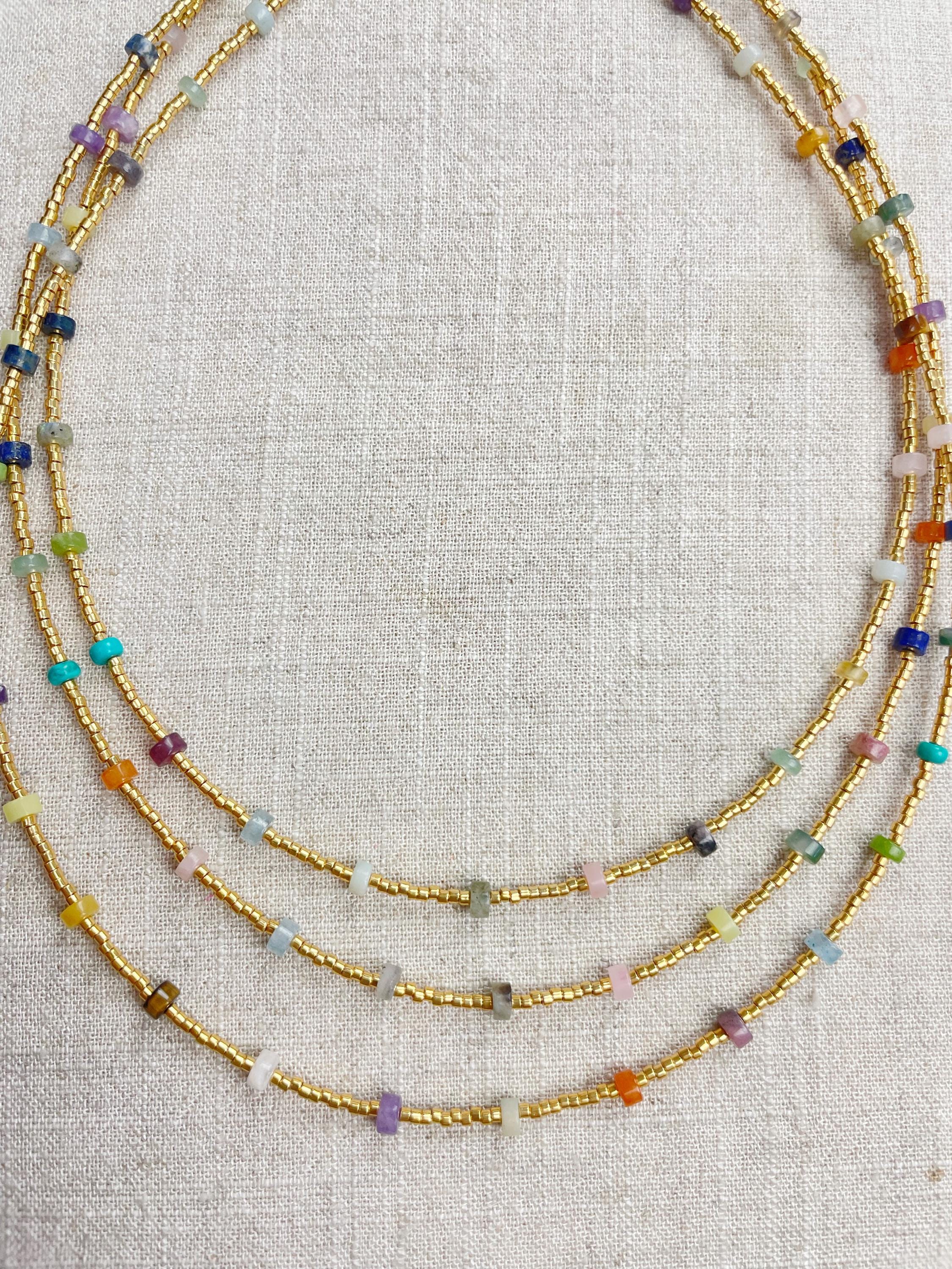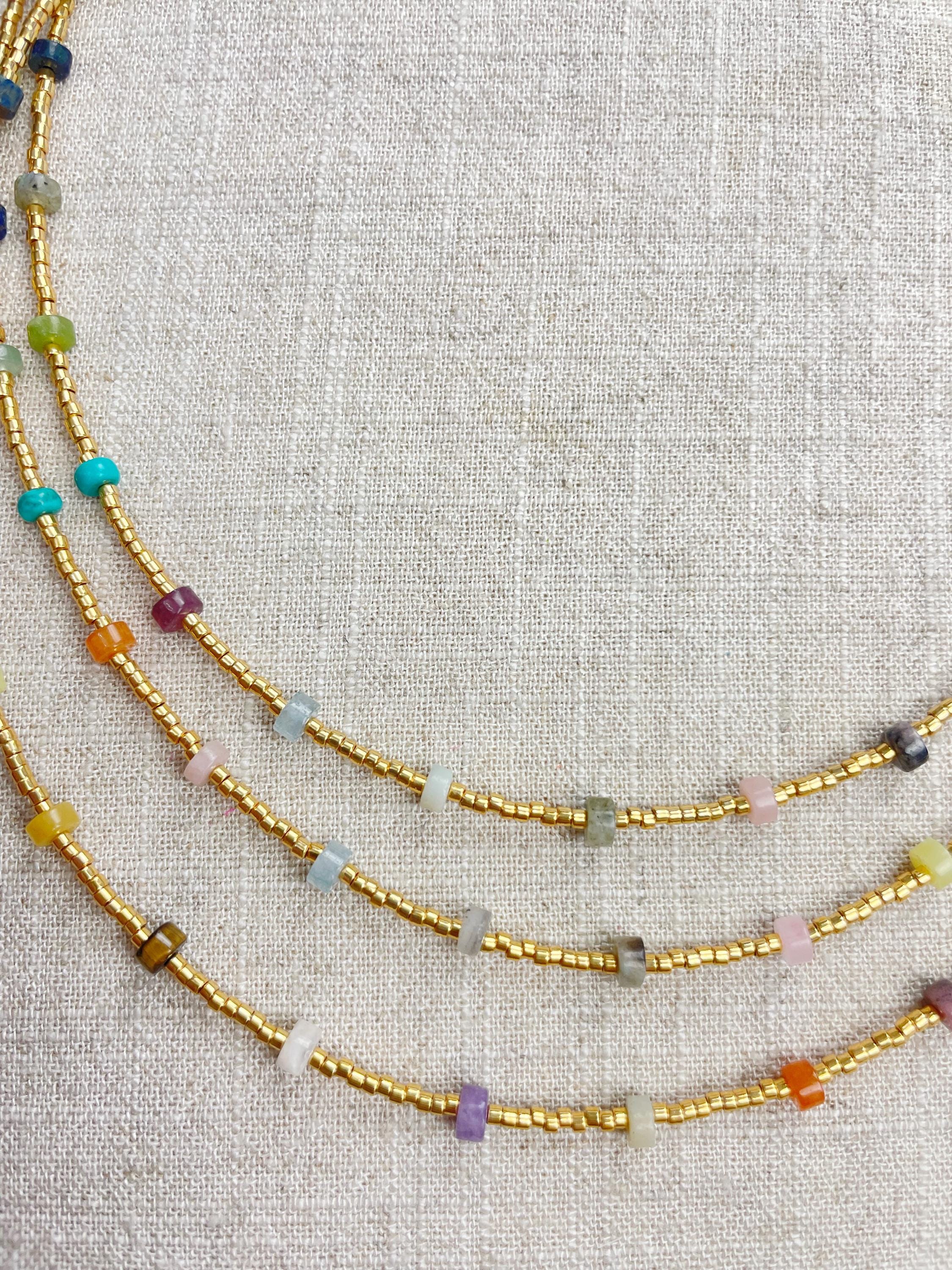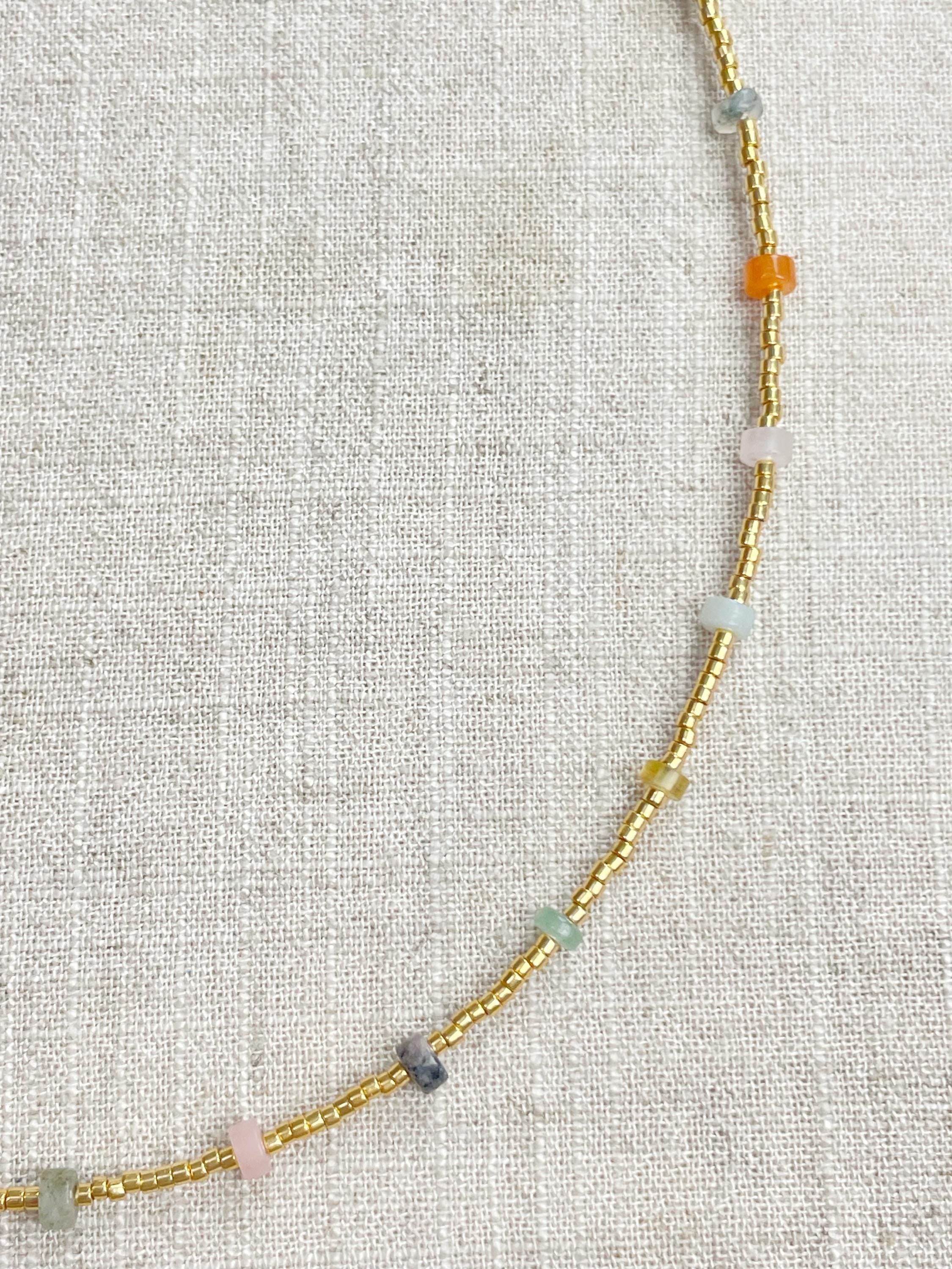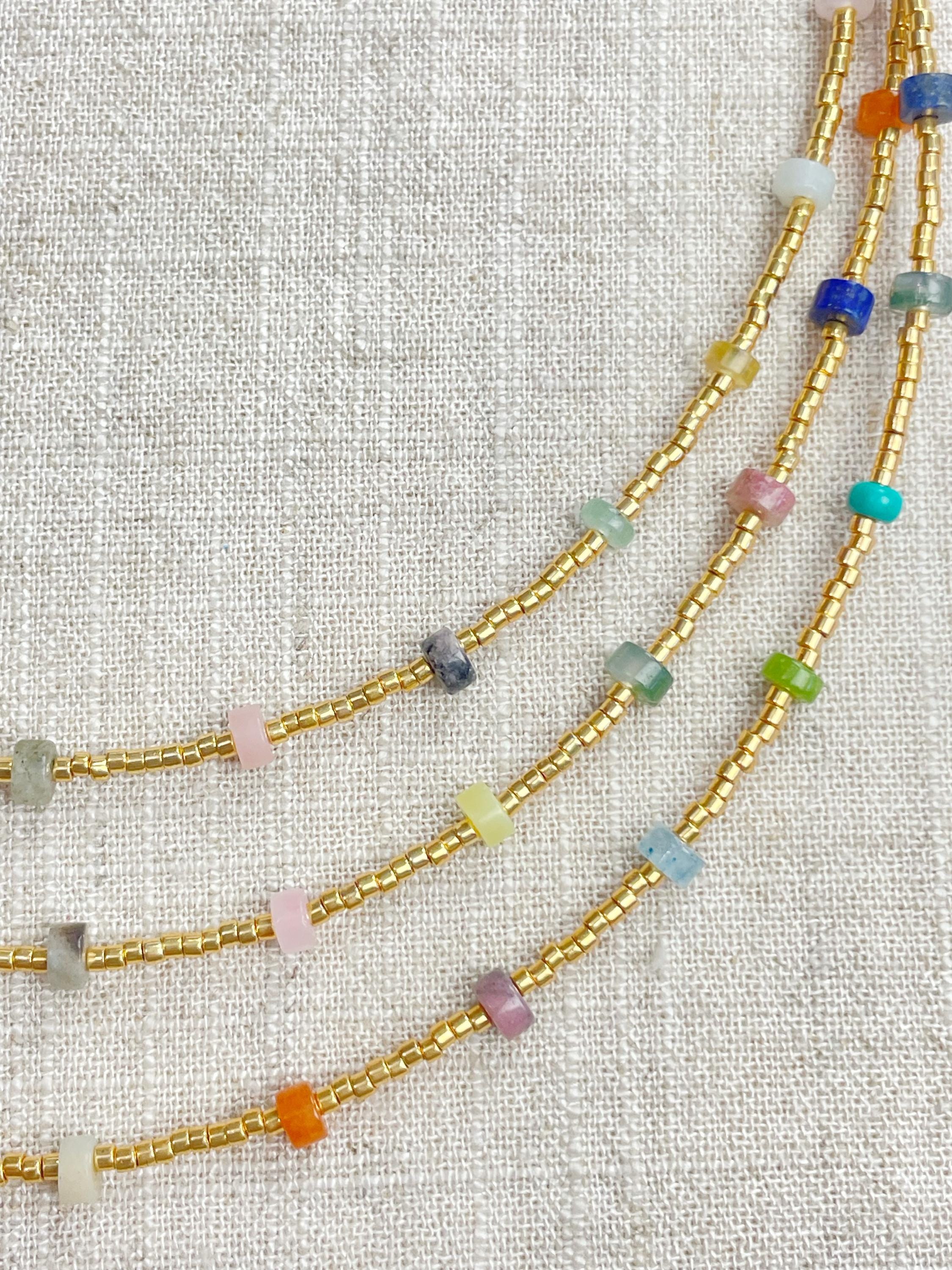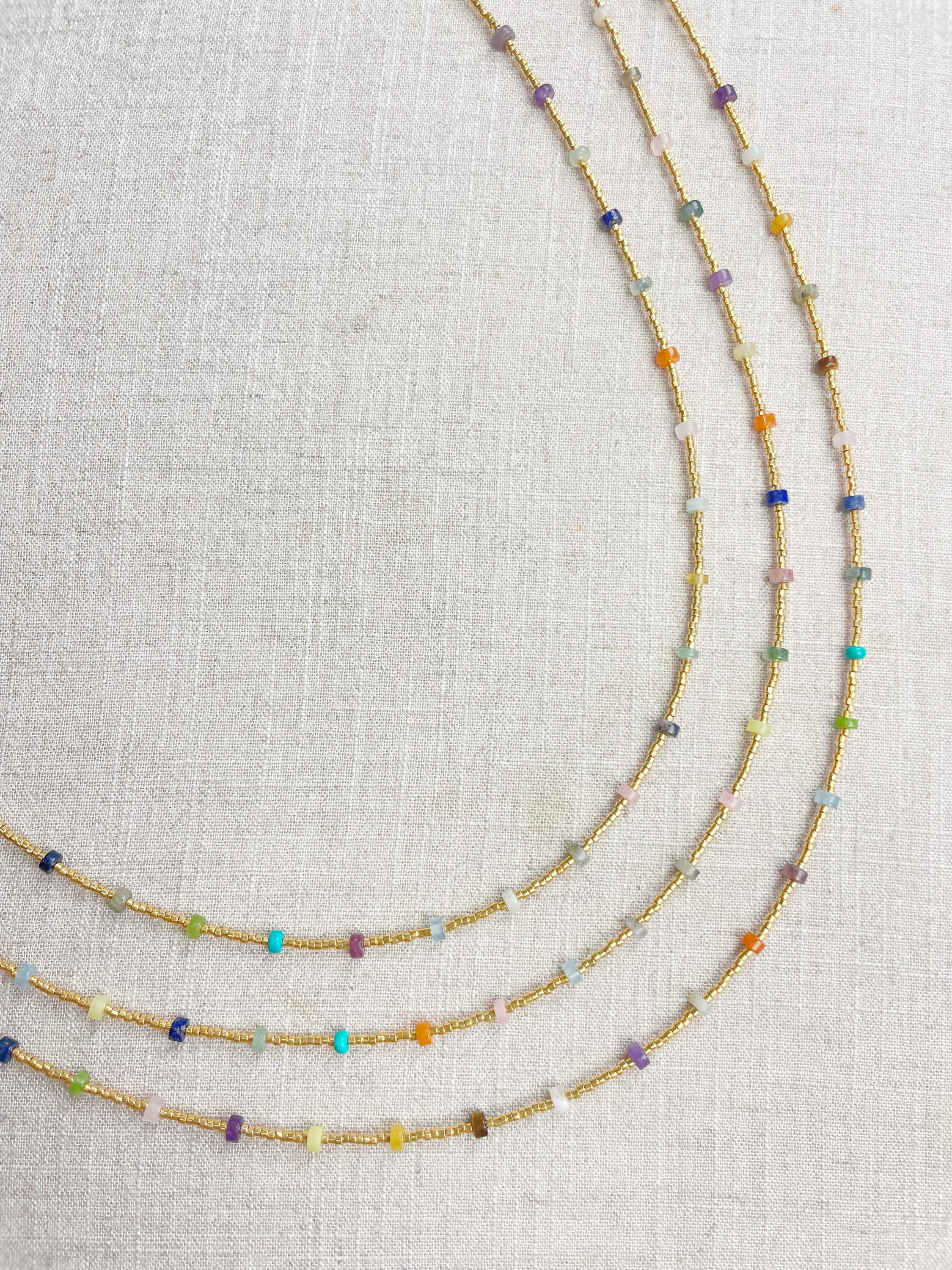 This necklace is made with galvanized gold 11/0 Miyuki glass seed beads. The seed beads are paired with beautiful gemstone stone heishi beads. Each necklace is strung on a stainless steel beading wire. The necklace is finished off with a gold plated stainless steel lobster clasp and a logo charm.