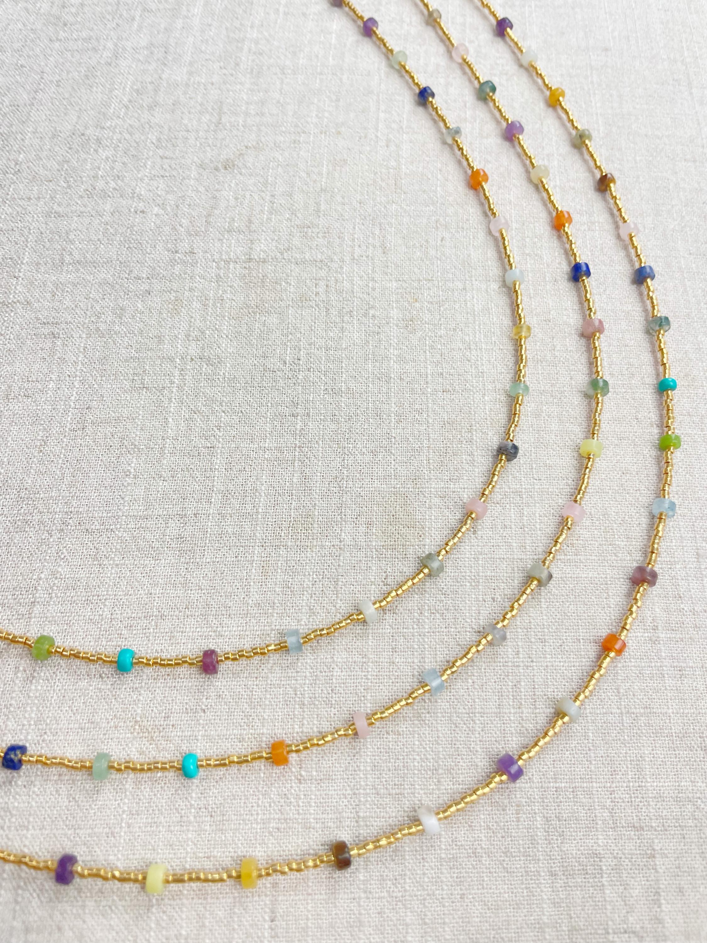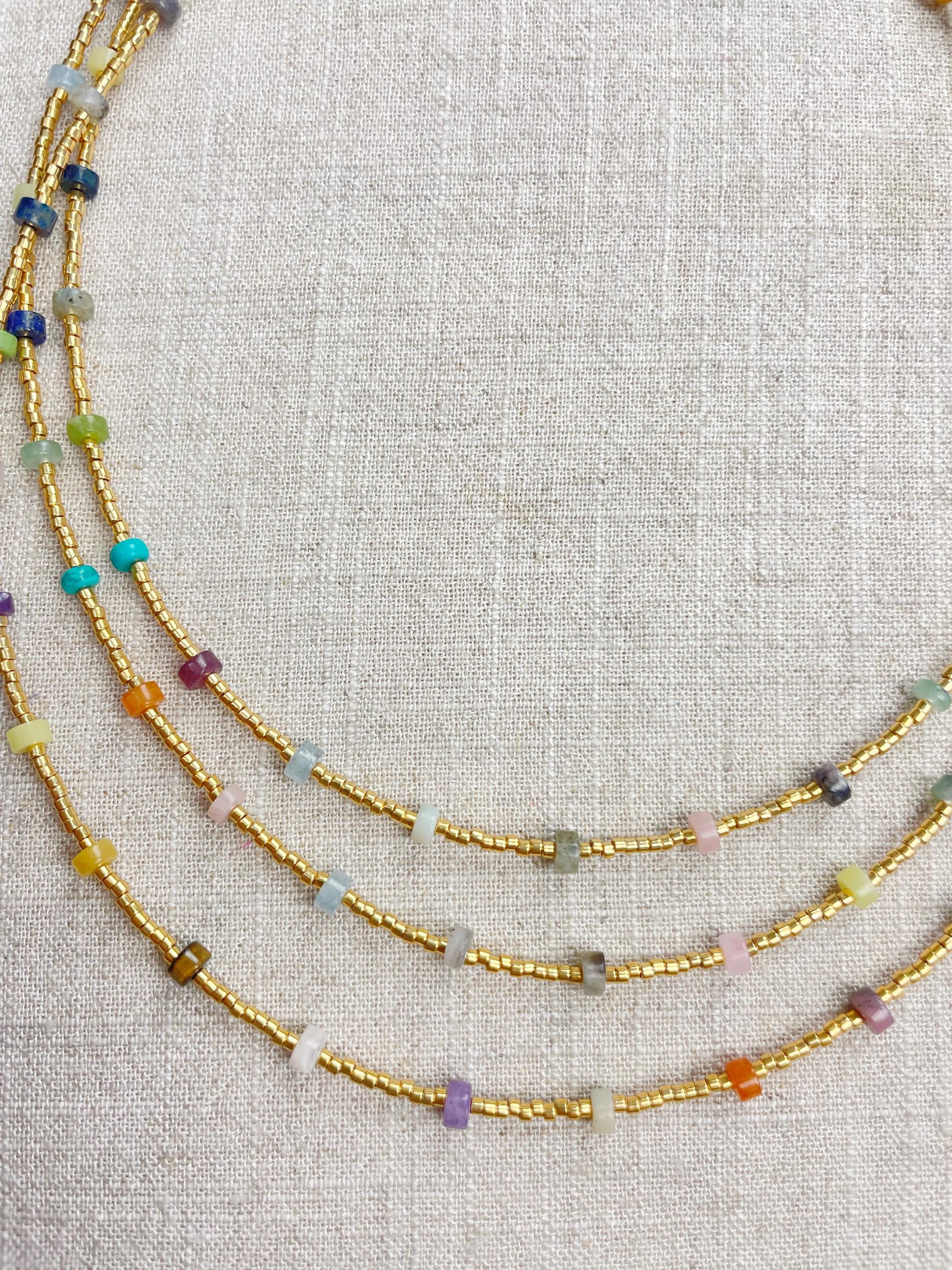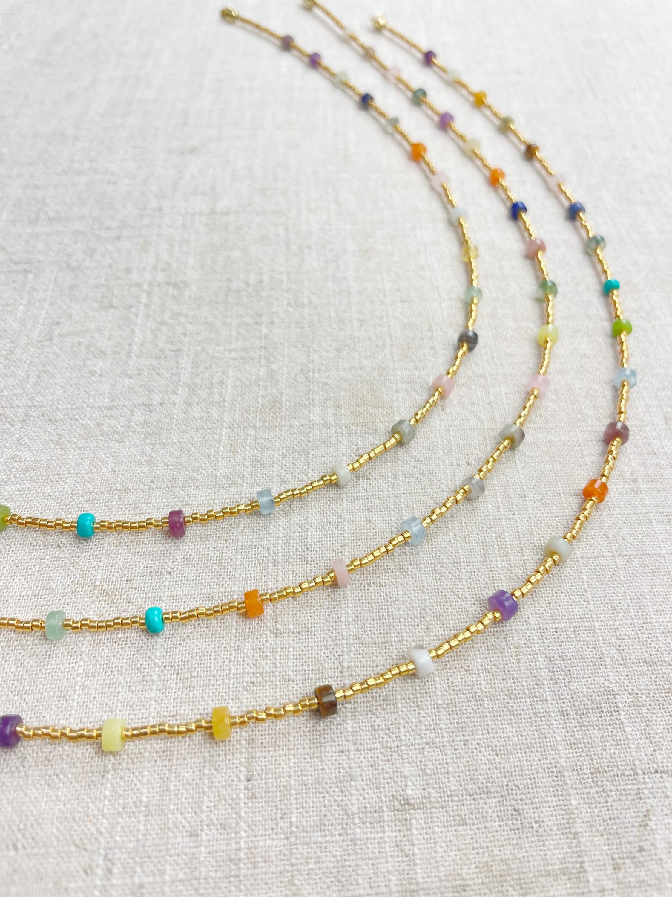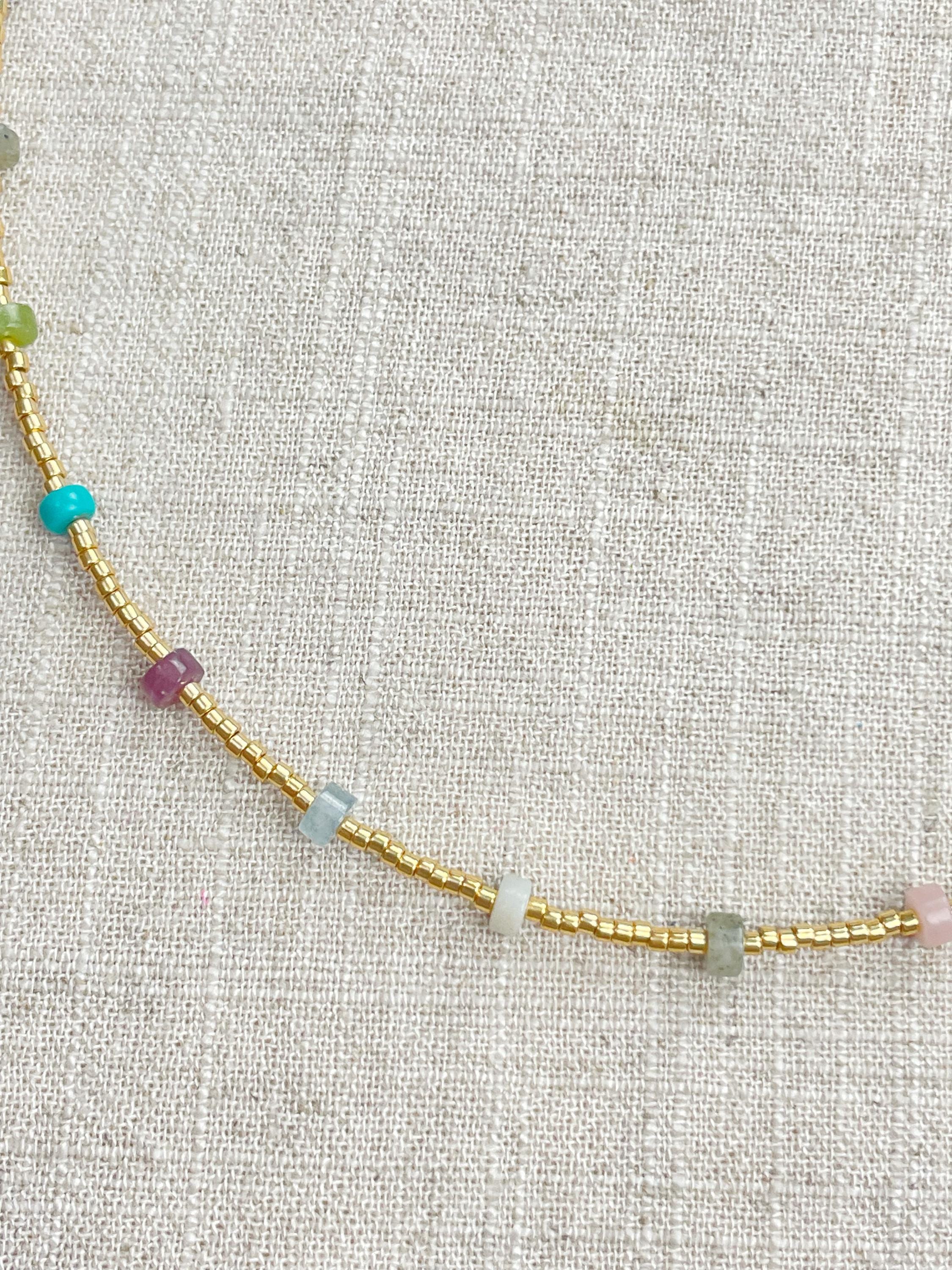 This necklace is made with galvanized gold 11/0 Miyuki glass seed beads. The seed beads are paired with beautiful gemstone stone heishi beads. Each necklace is strung on a stainless steel beading wire. The necklace is finished off with a gold plated stainless steel lobster clasp and a logo charm.