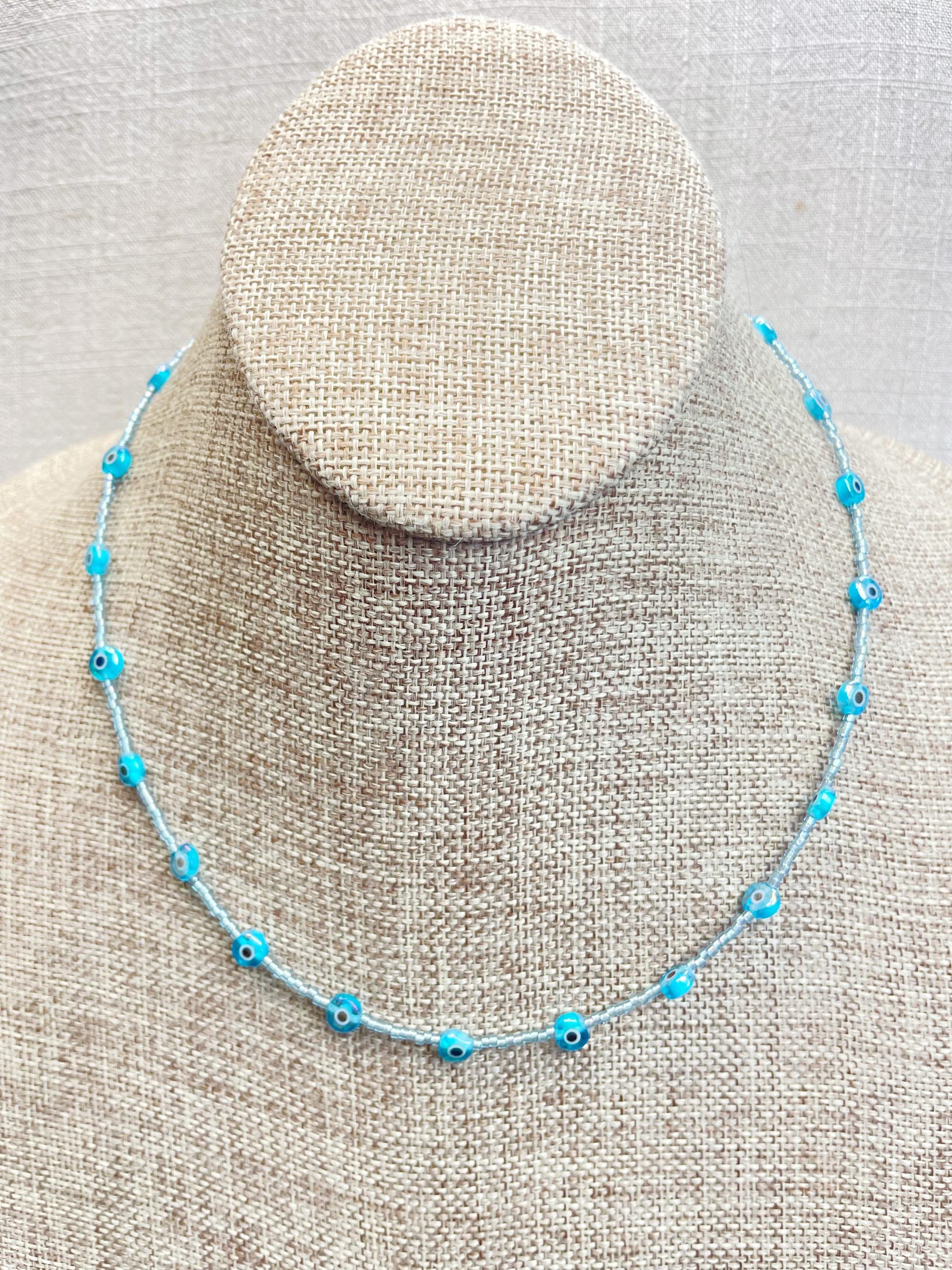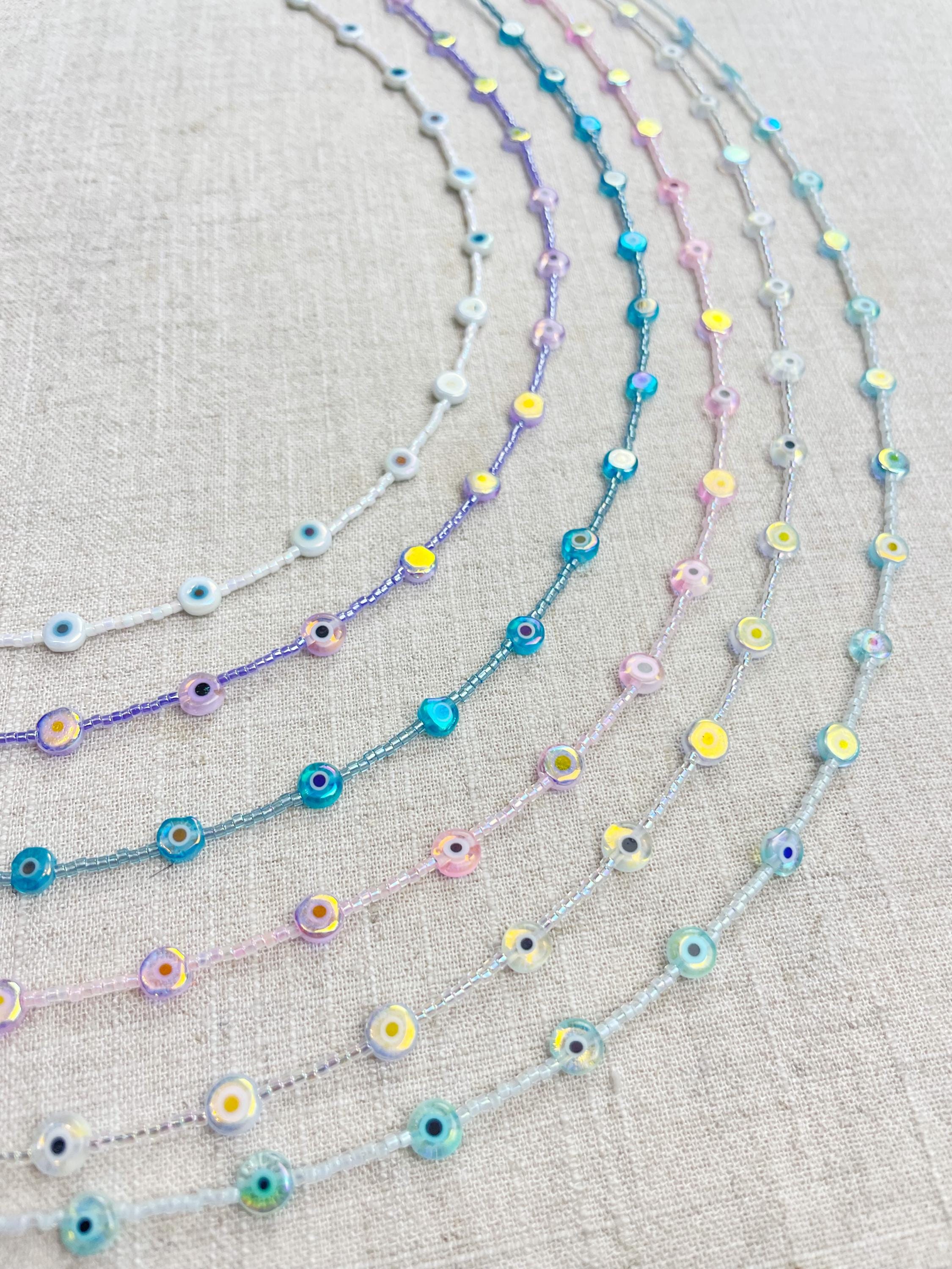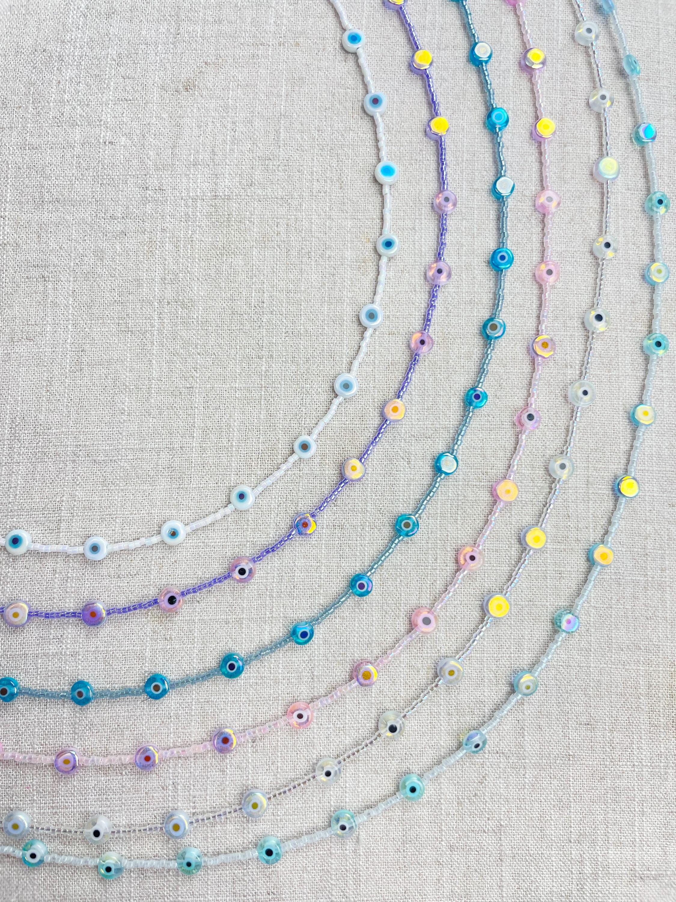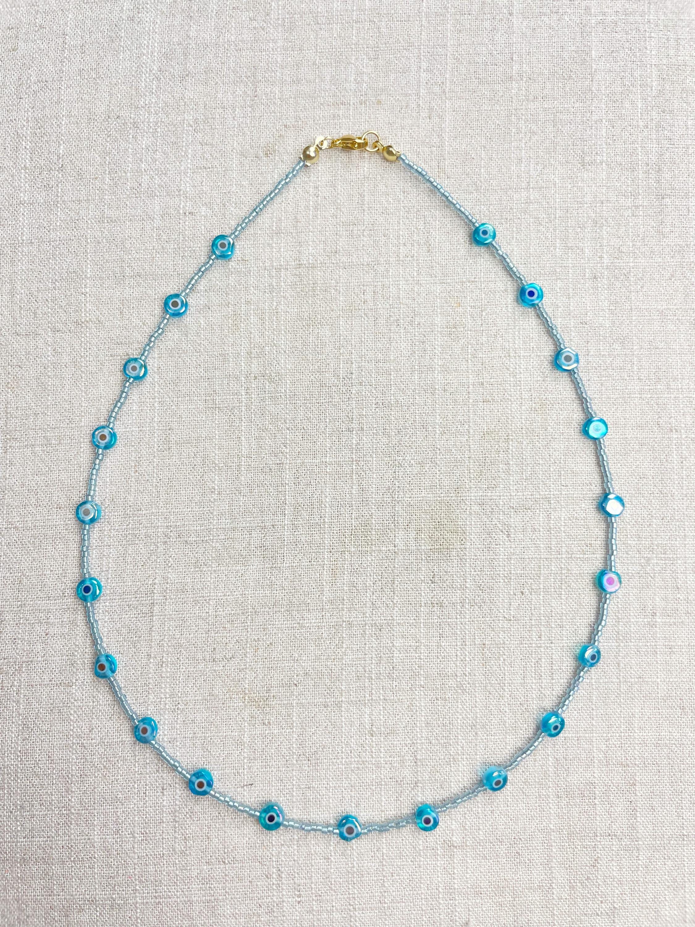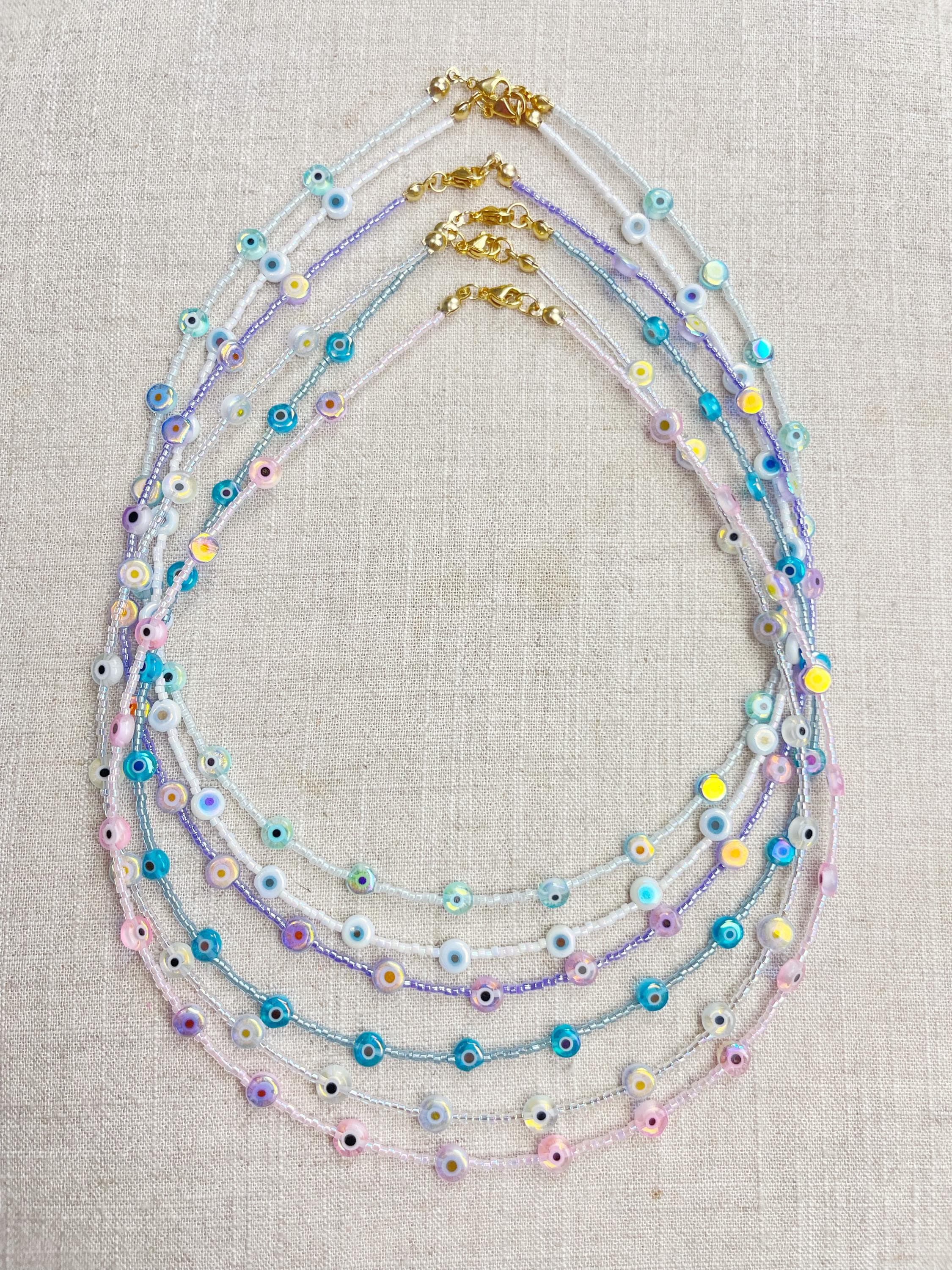 This necklace is made with 11/0 Miyuki glass seed beads. The seed beads are paired with beautiful glass evil eye beads which are iridescent on one side. Each necklace is strung on a stainless steel beading wire. The necklace is finished off with a gold plated stainless steel lobster clasp and a logo charm.