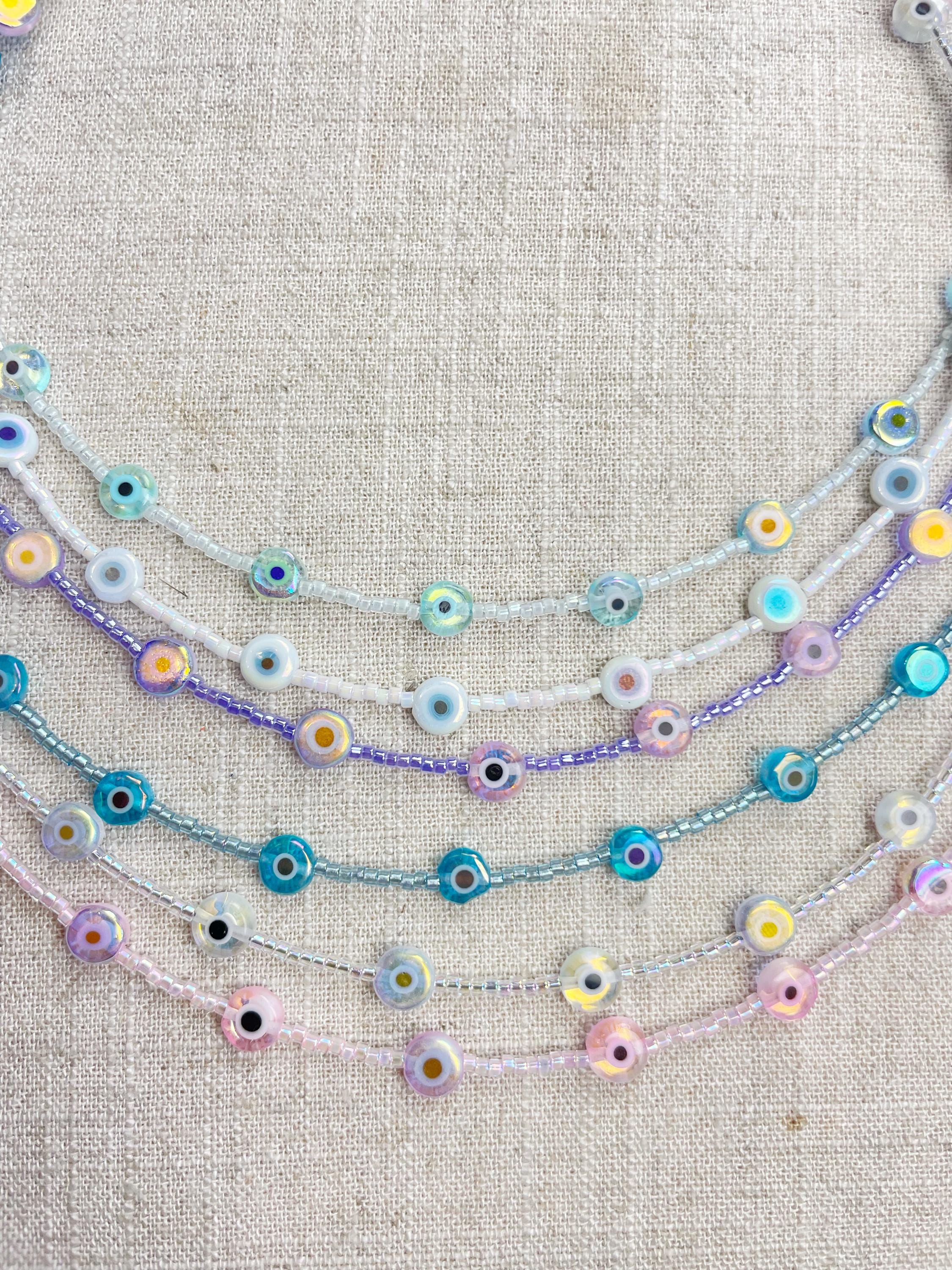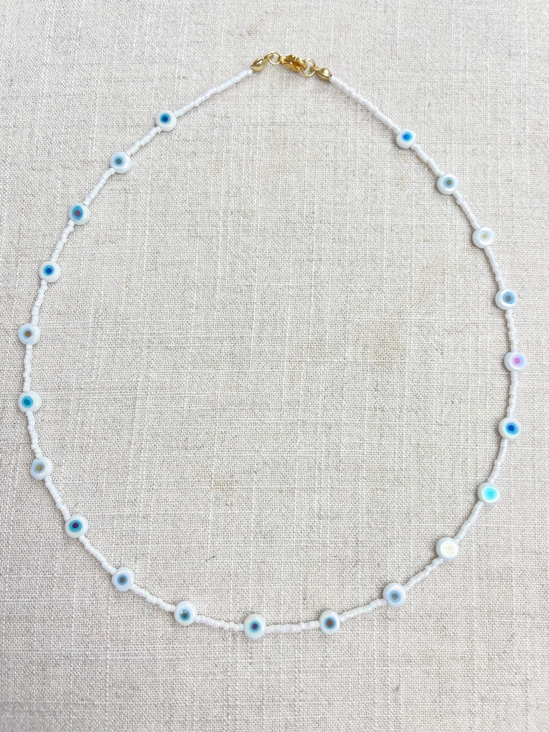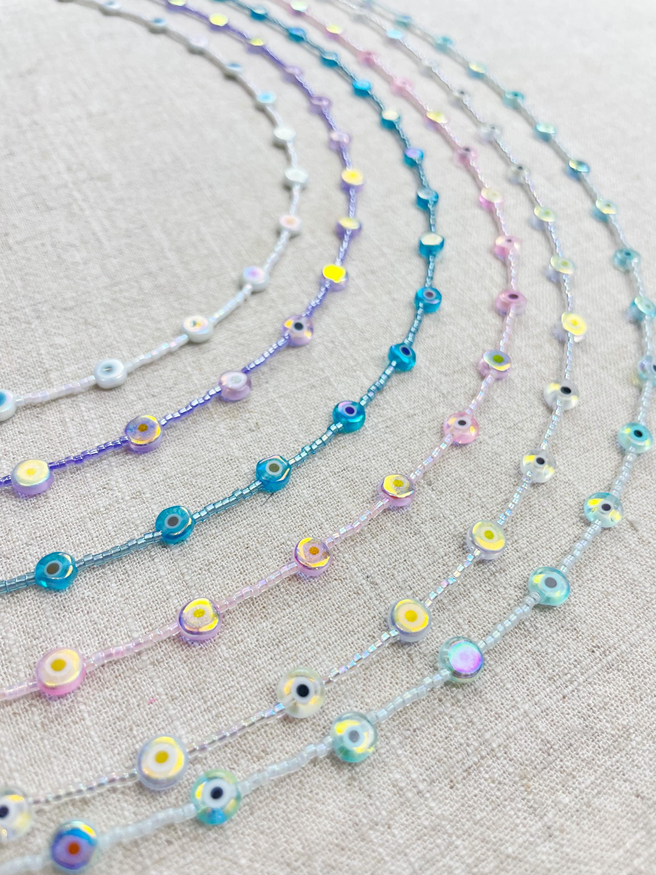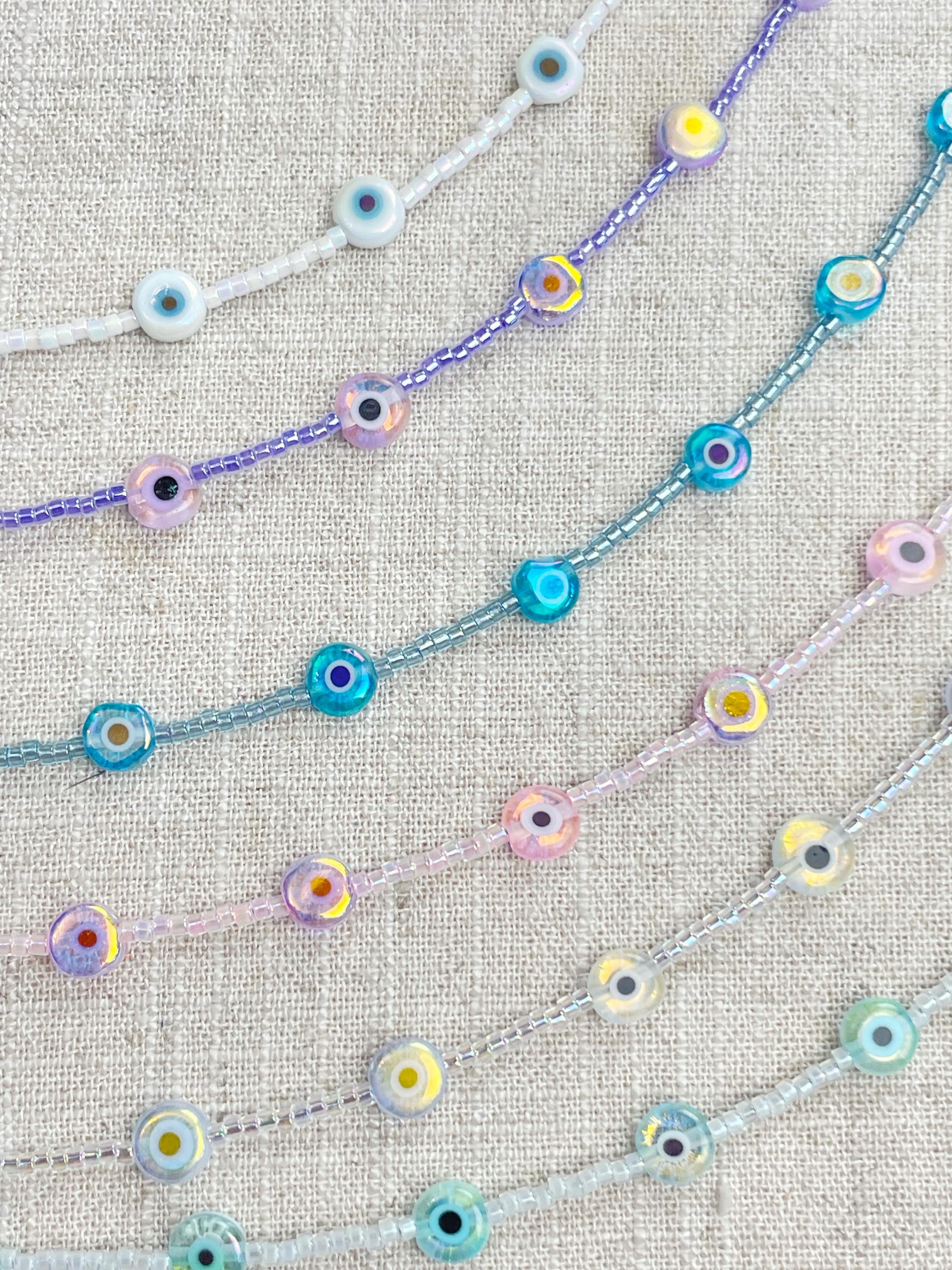 This necklace is made with 11/0 Miyuki glass seed beads. The seed beads are paired with beautiful glass evil eye beads which are iridescent on one side. Each necklace is strung on a stainless steel beading wire. The necklace is finished off with a gold plated stainless steel lobster clasp and a logo charm.