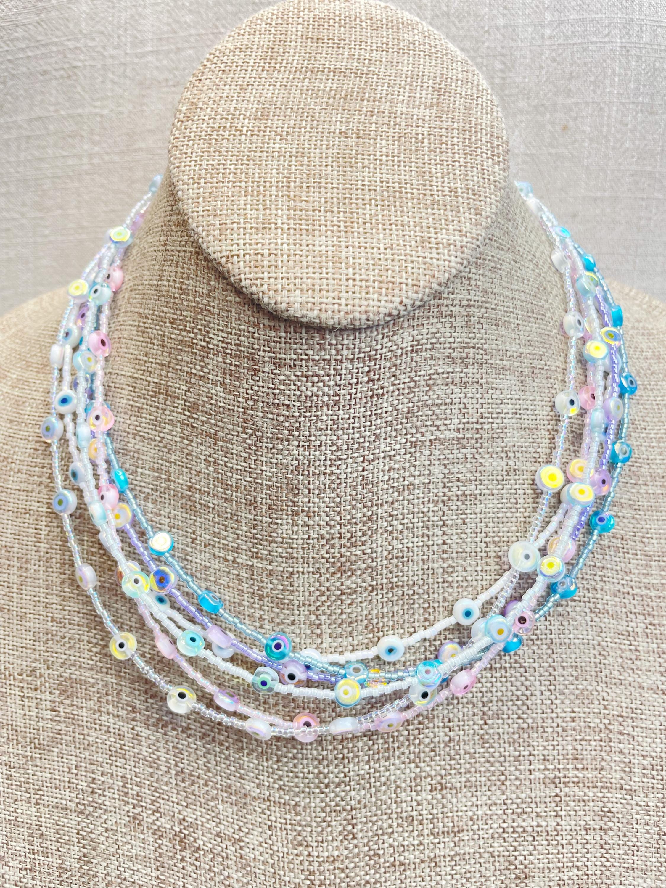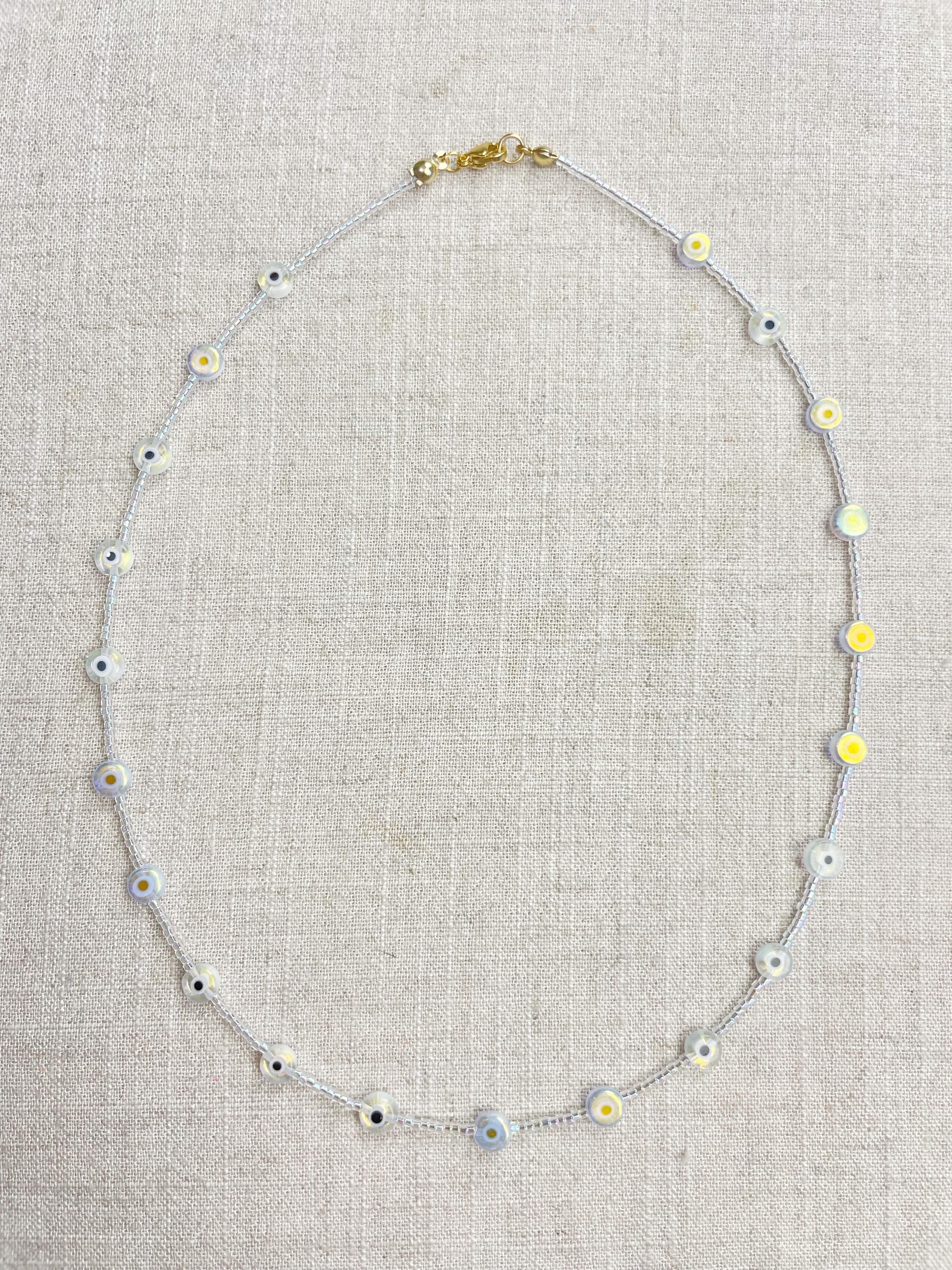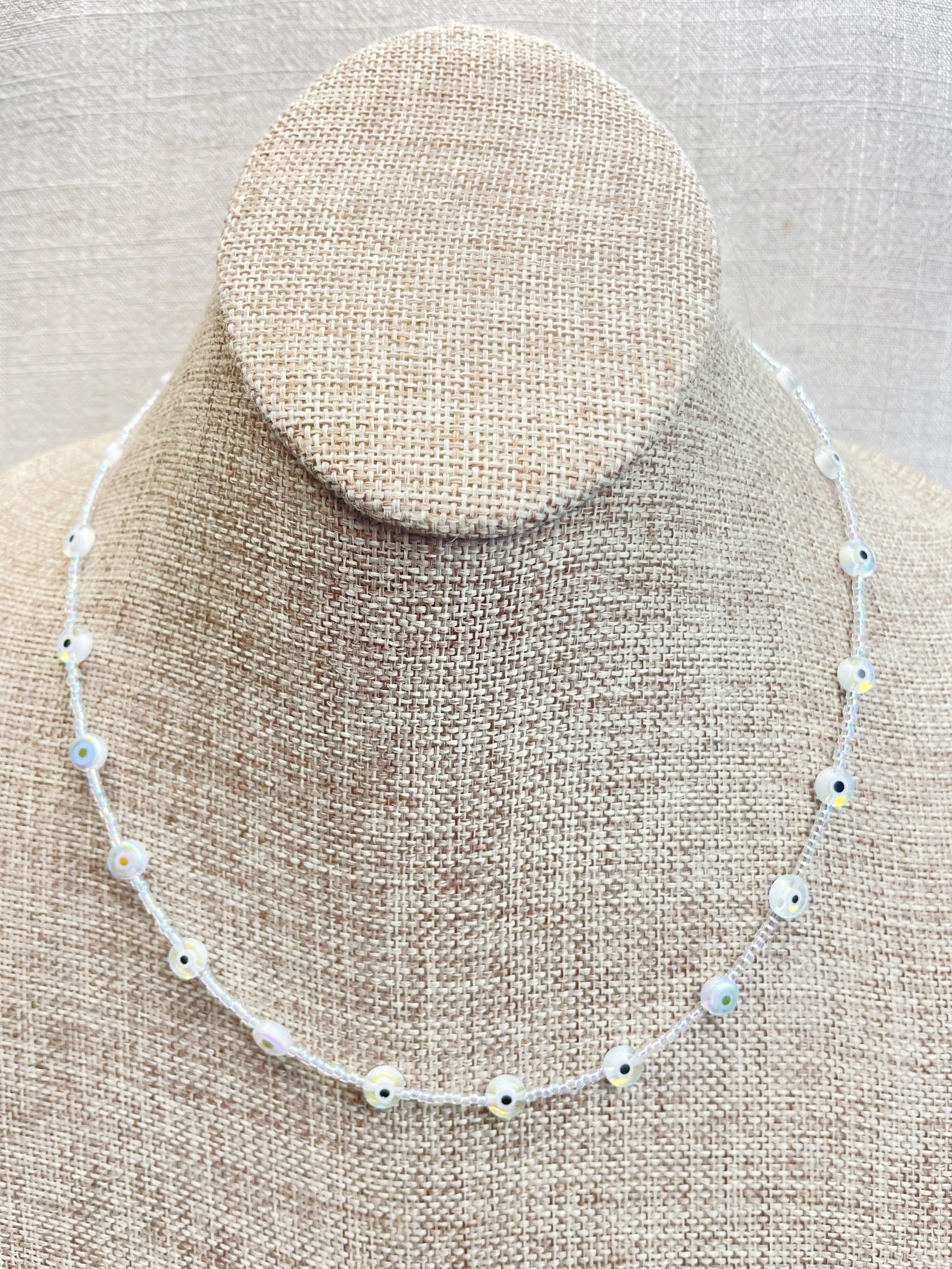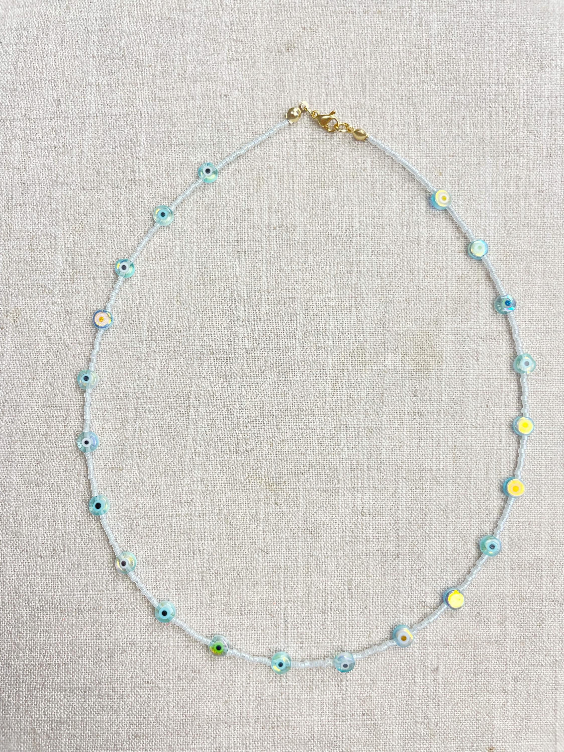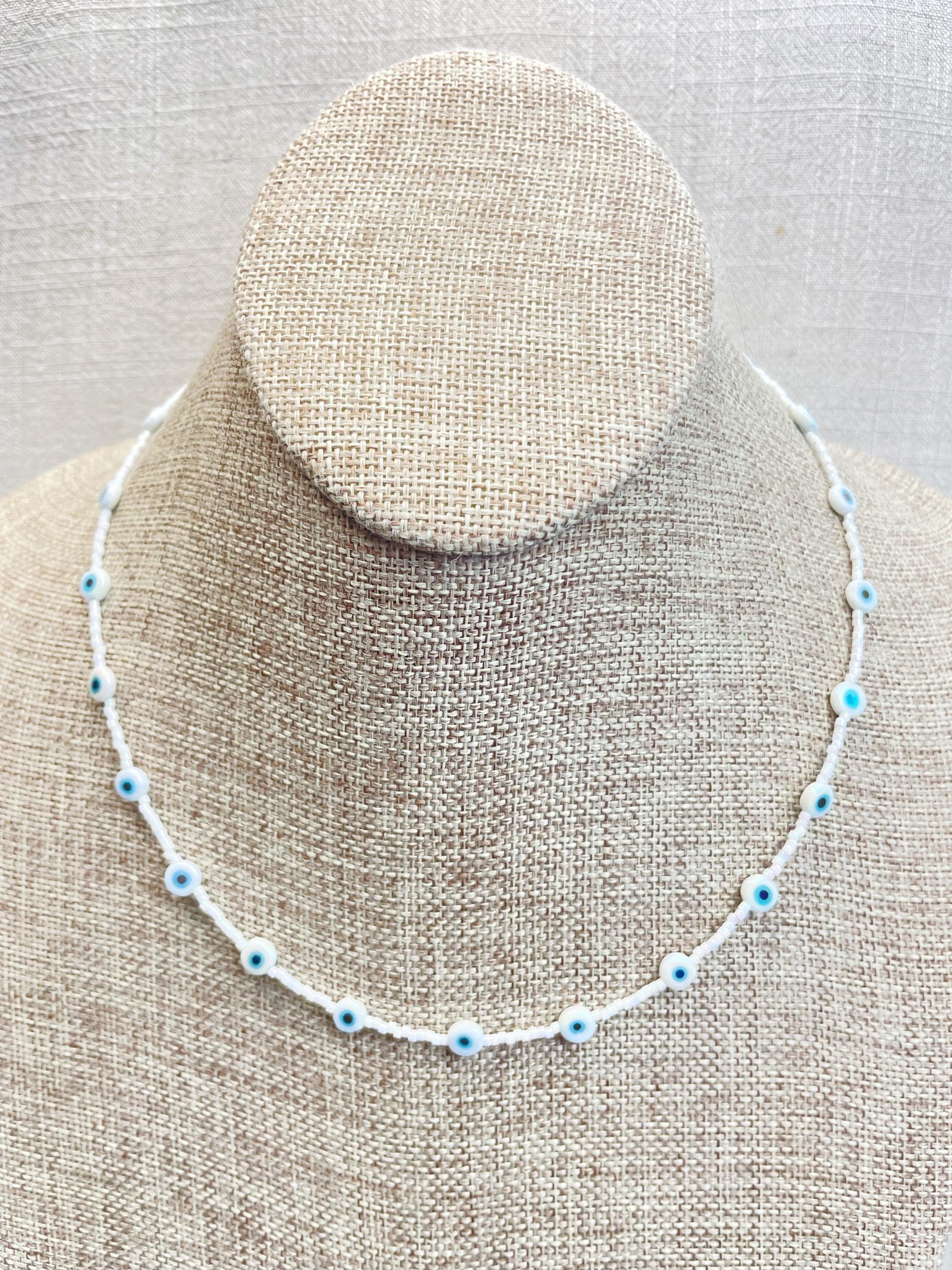 This necklace is made with 11/0 Miyuki glass seed beads. The seed beads are paired with beautiful glass evil eye beads which are iridescent on one side. Each necklace is strung on a stainless steel beading wire. The necklace is finished off with a gold plated stainless steel lobster clasp and a logo charm.