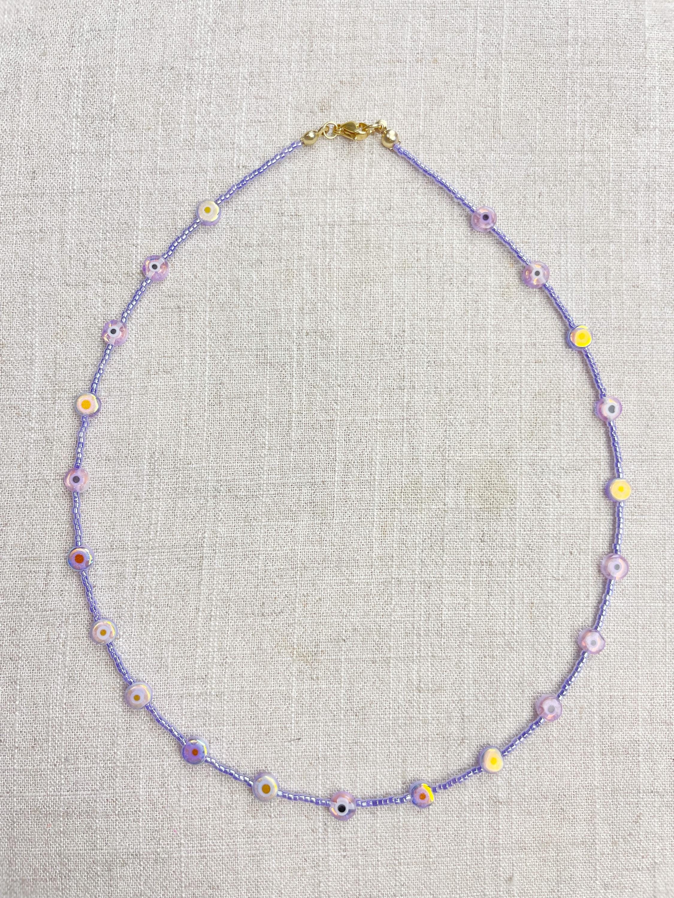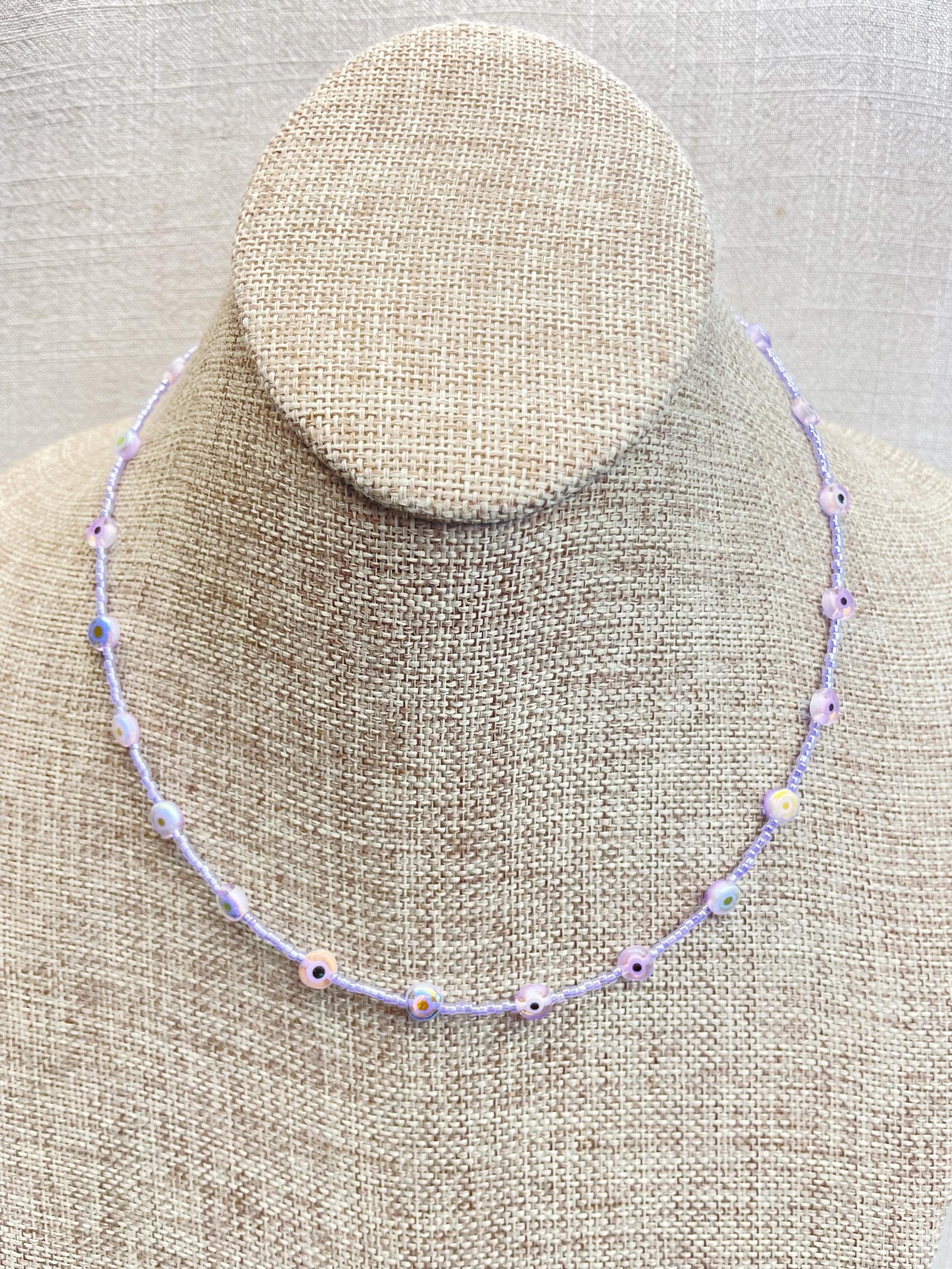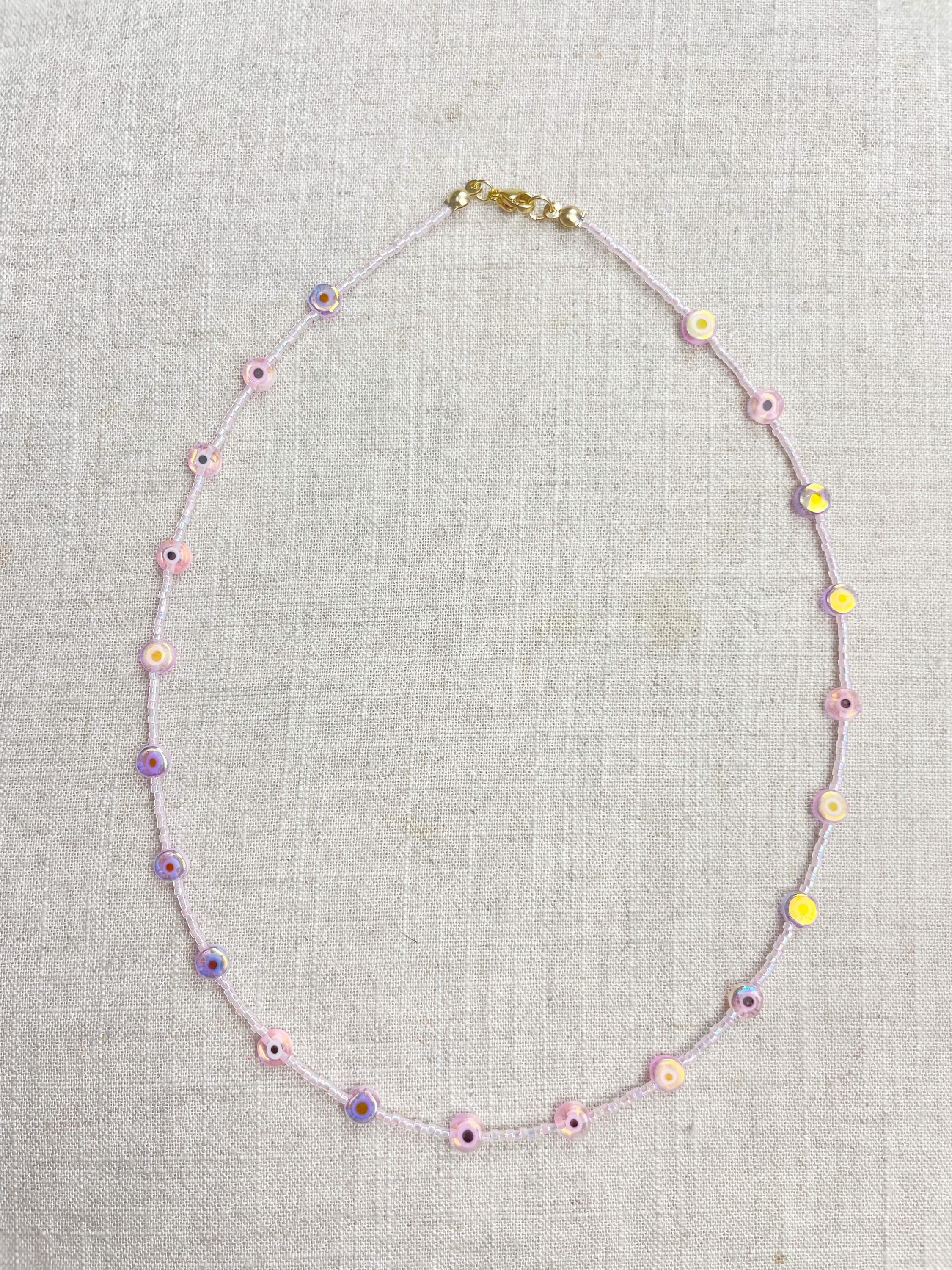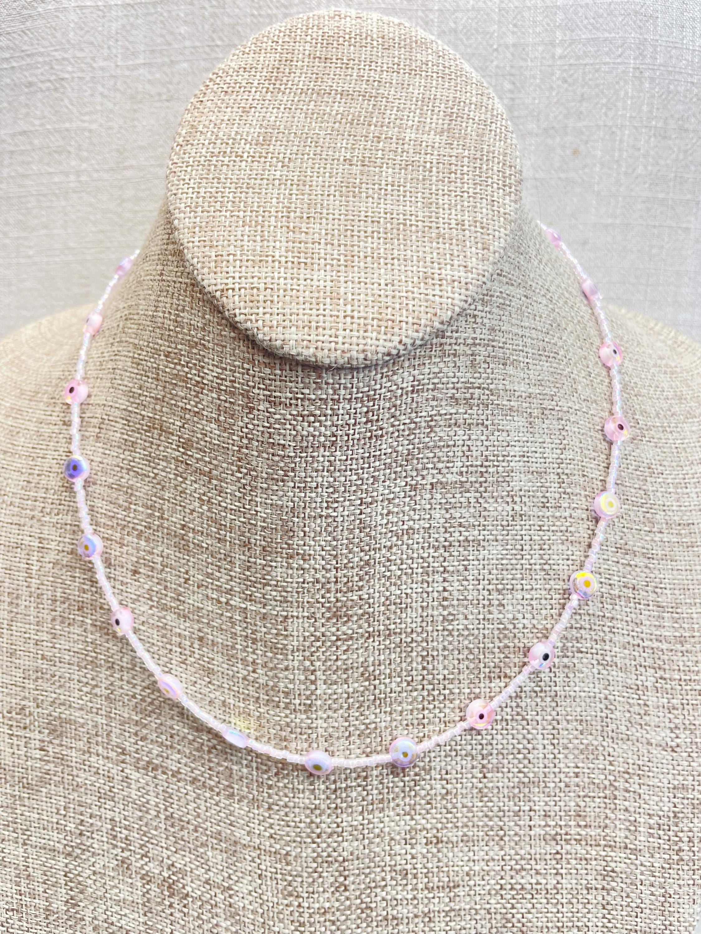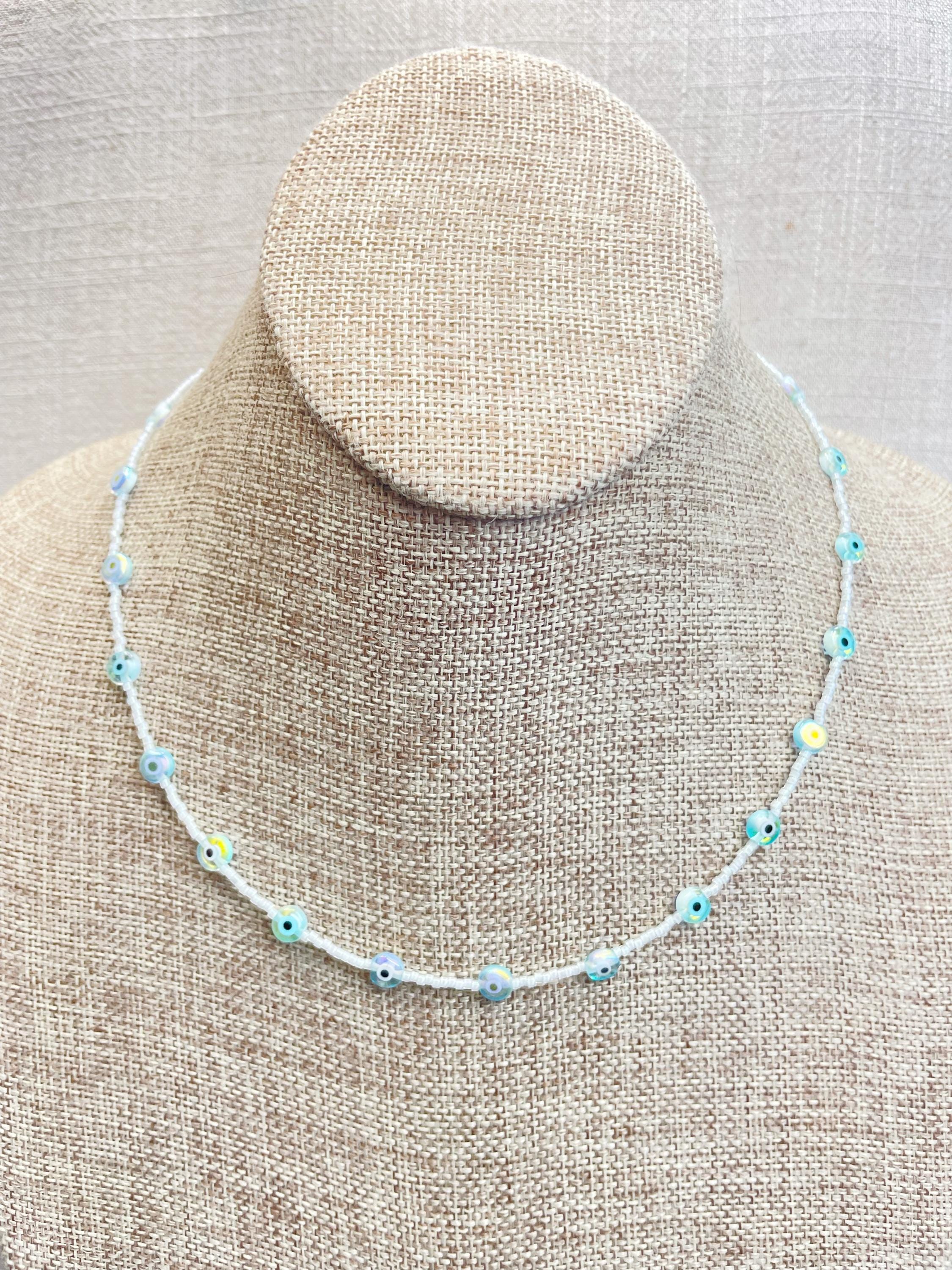 This necklace is made with 11/0 Miyuki glass seed beads. The seed beads are paired with beautiful glass evil eye beads which are iridescent on one side. Each necklace is strung on a stainless steel beading wire. The necklace is finished off with a gold plated stainless steel lobster clasp and a logo charm.