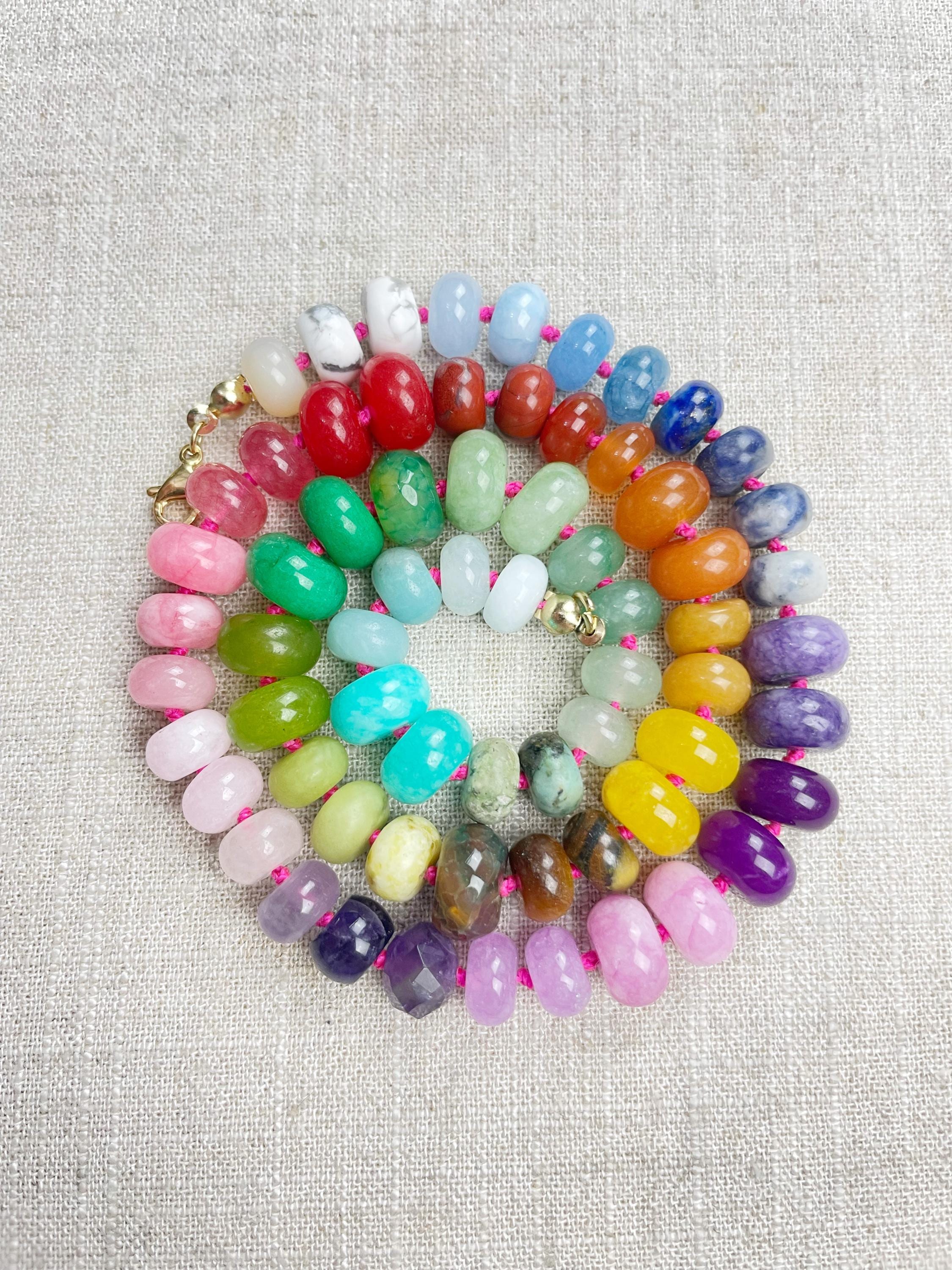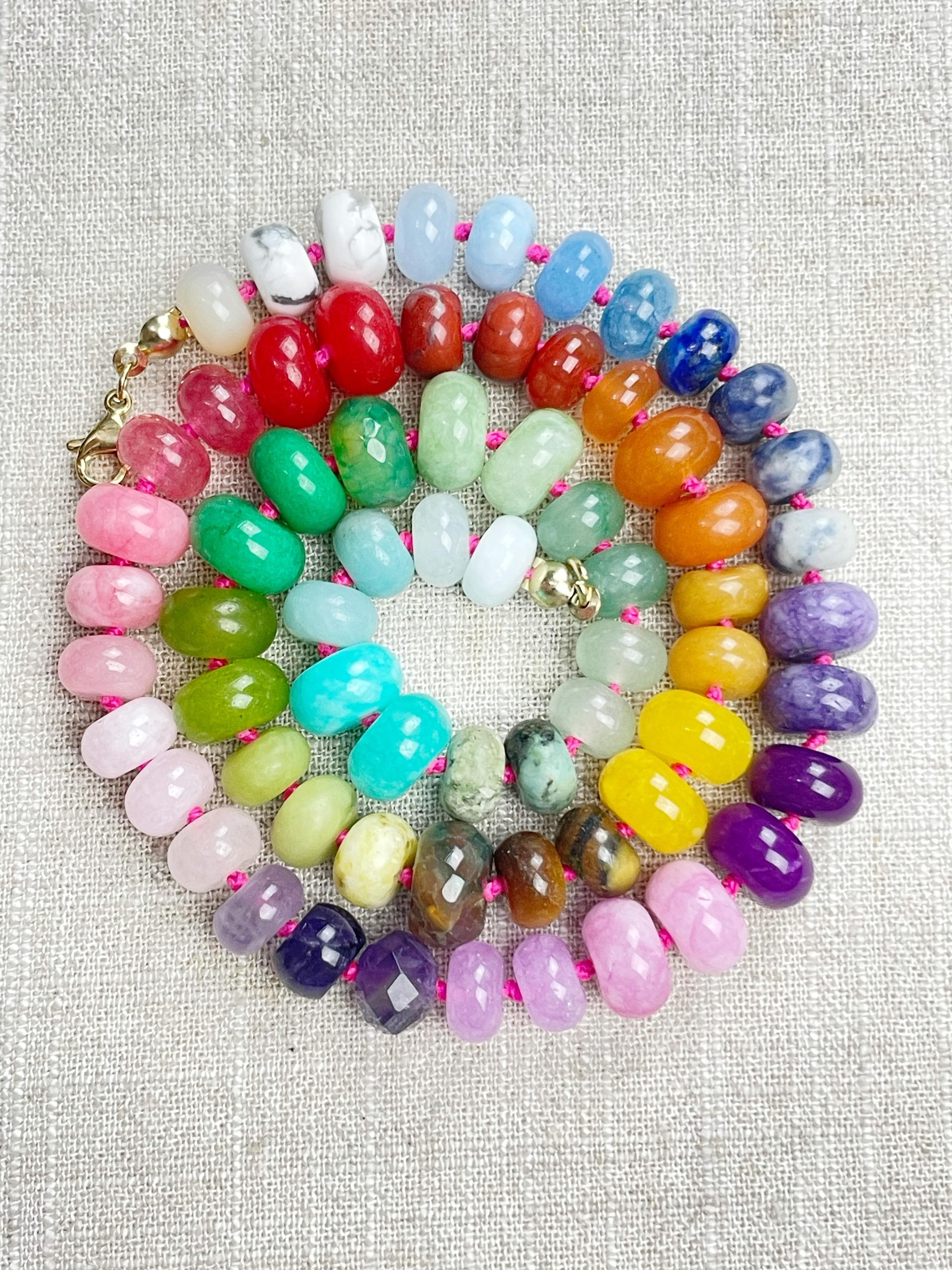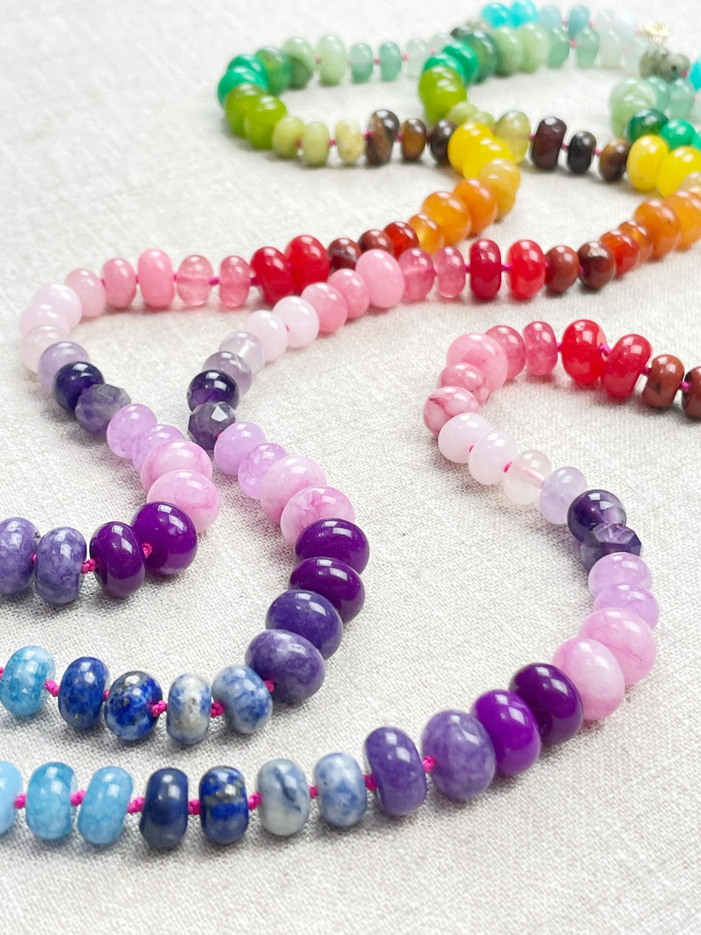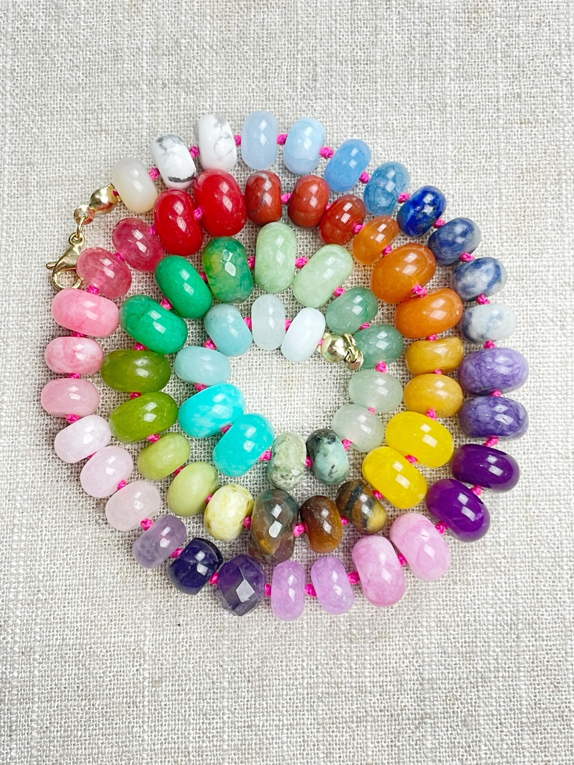 This necklace is made with gemstone beads. The beads are about 5x8mm. and some that are 5x10mm The necklace includes: dyed jade, African Turquoise, green aventurine, dyed agate, green jadeite, yellow turquoise, tigers eye, yellow aventurine, carnelian, red jasper, rose quartz, amethyst, sodalite, lapis lazuli, white howlite and grey agate.The beads are strung on a nylon cording. The necklace is hand-knotted in between each bead. The necklace is finished off with a gold plated stainless steel clasp and logo charm.