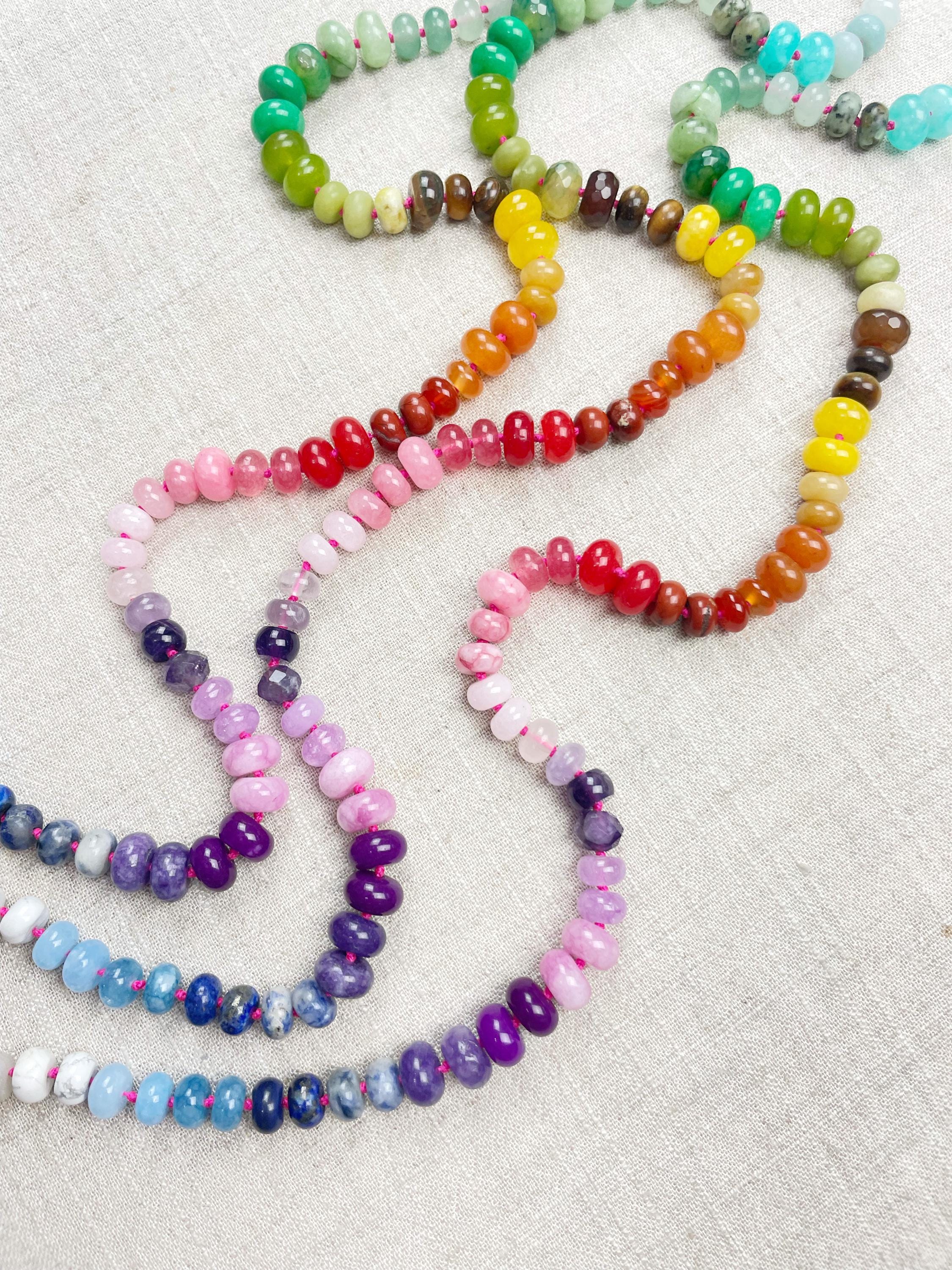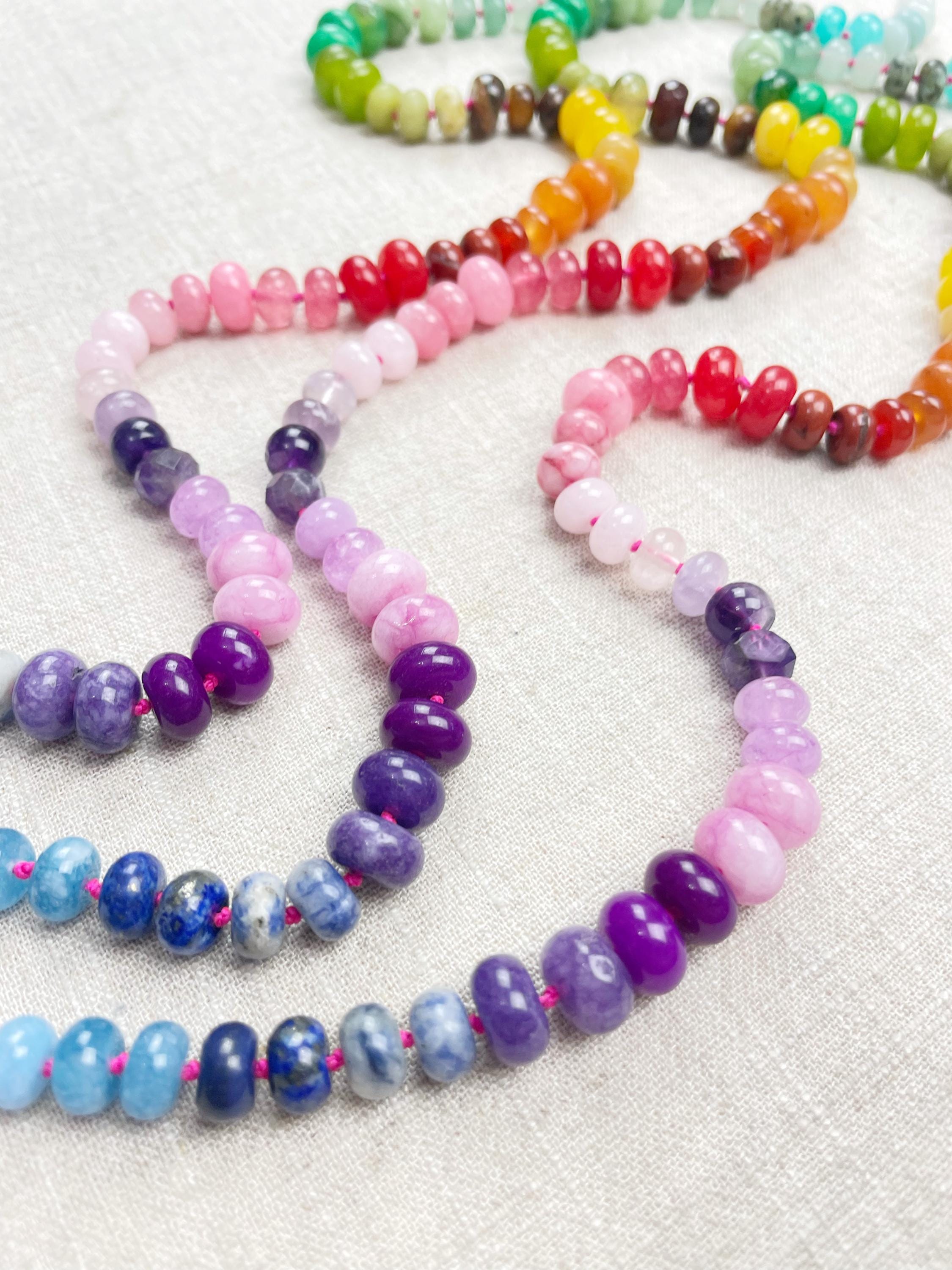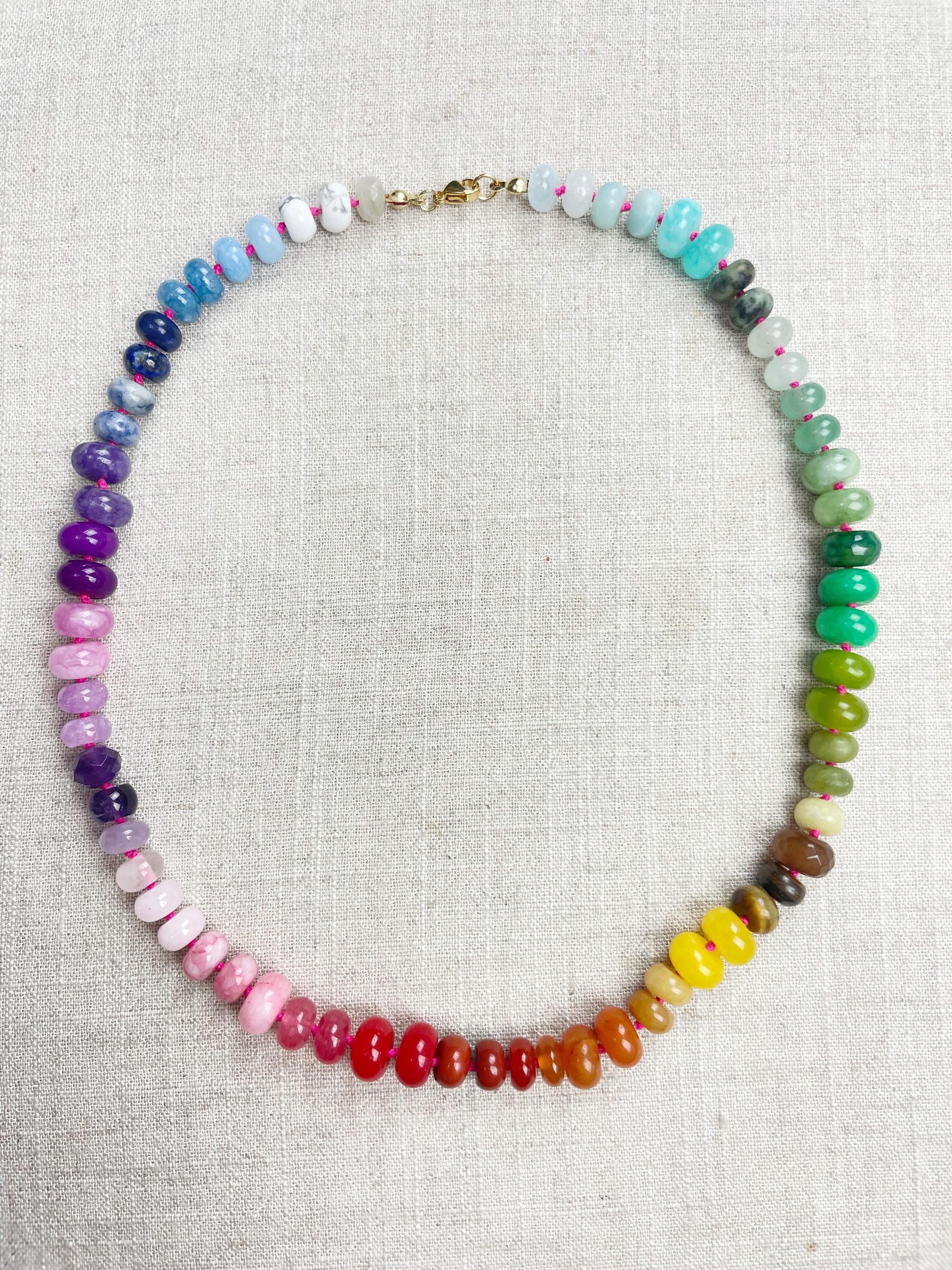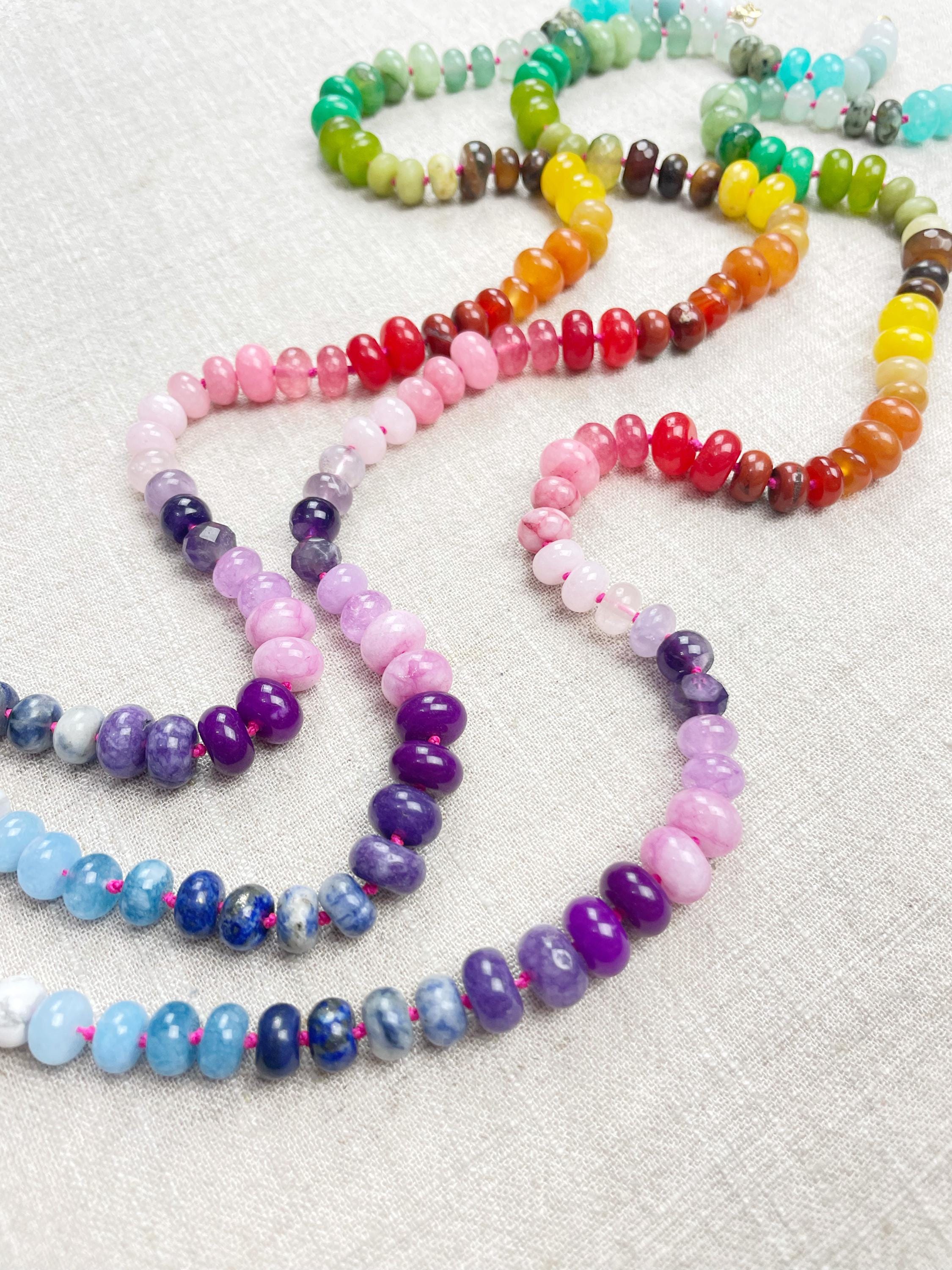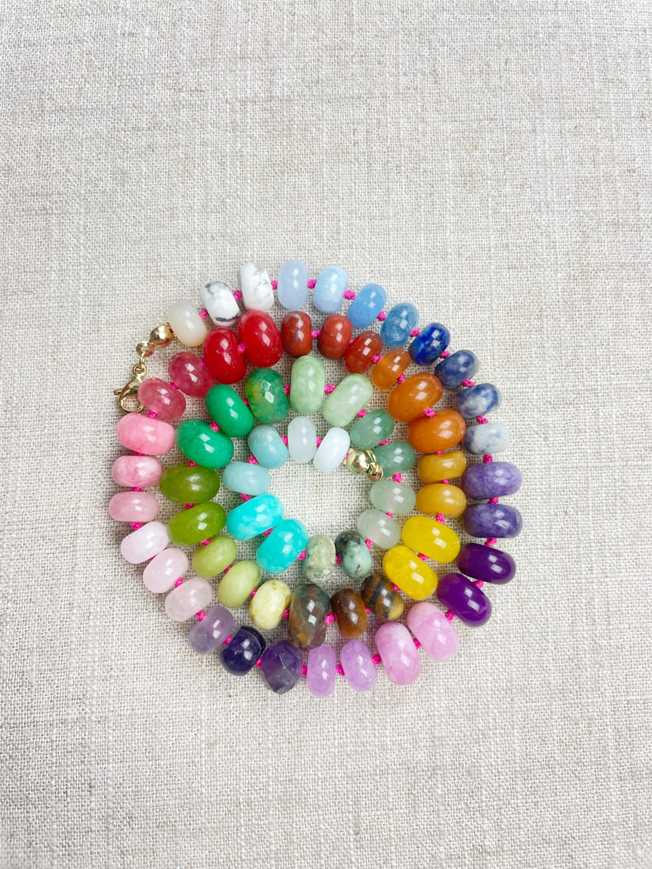 This necklace is made with gemstone beads. The beads are about 5x8mm. and some that are 5x10mm The necklace includes: dyed jade, African Turquoise, green aventurine, dyed agate, green jadeite, yellow turquoise, tigers eye, yellow aventurine, carnelian, red jasper, rose quartz, amethyst, sodalite, lapis lazuli, white howlite and grey agate.The beads are strung on a nylon cording. The necklace is hand-knotted in between each bead. The necklace is finished off with a gold plated stainless steel clasp and logo charm.