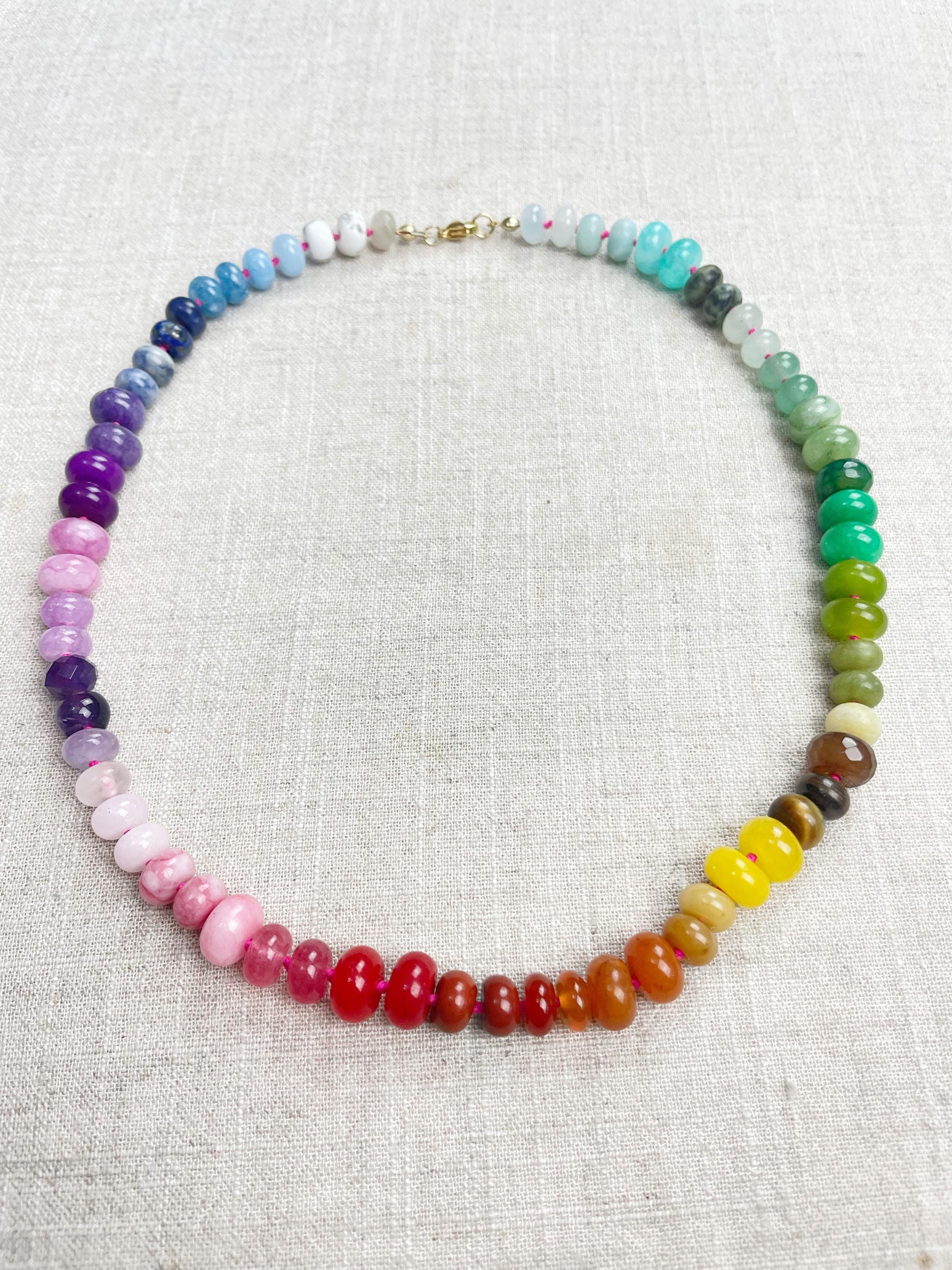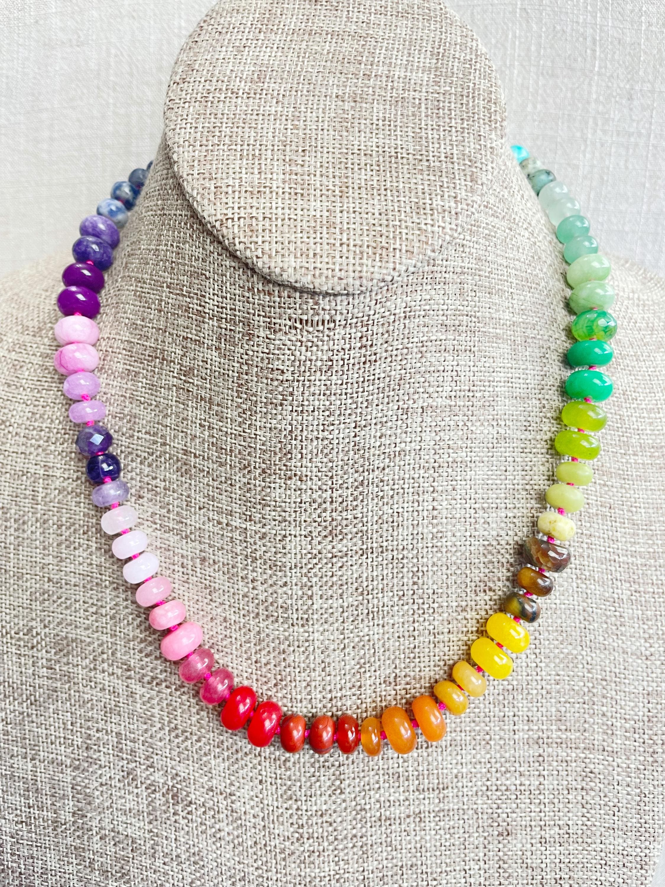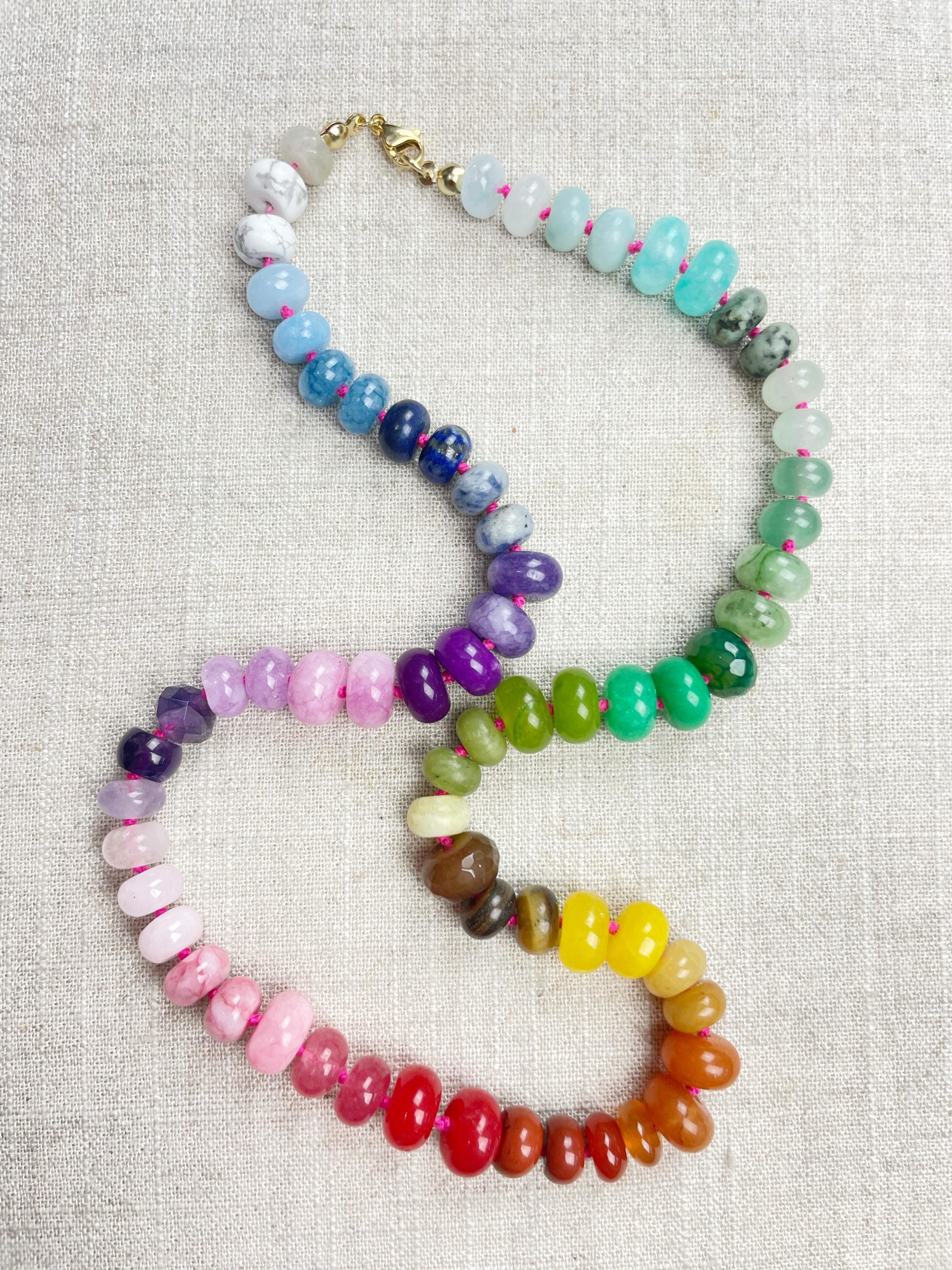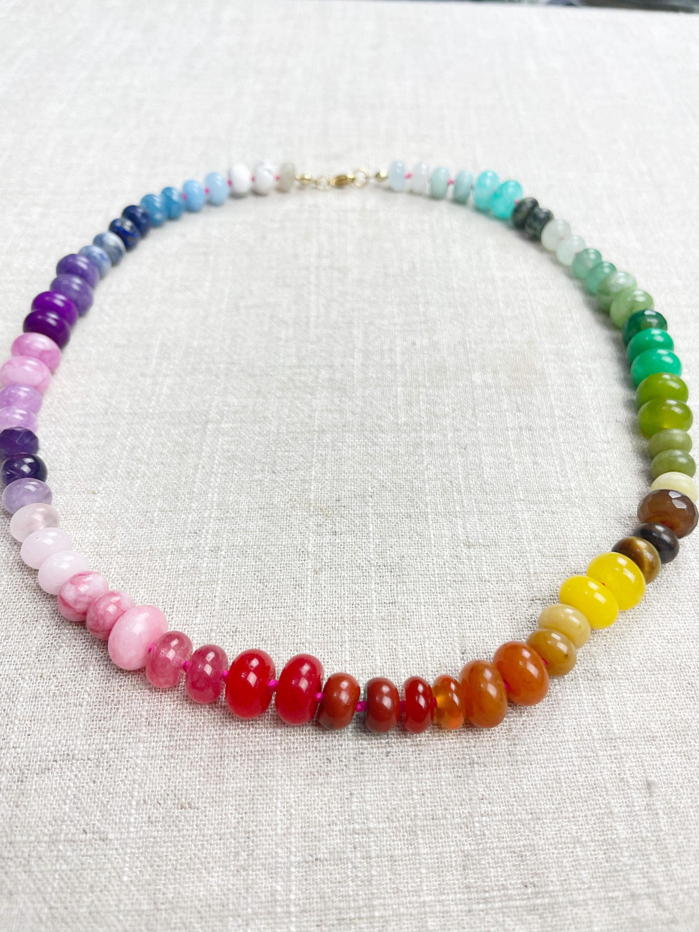 This necklace is made with gemstone beads. The beads are about 5x8mm. and some that are 5x10mm The necklace includes: dyed jade, African Turquoise, green aventurine, dyed agate, green jadeite, yellow turquoise, tigers eye, yellow aventurine, carnelian, red jasper, rose quartz, amethyst, sodalite, lapis lazuli, white howlite and grey agate.The beads are strung on a nylon cording. The necklace is hand-knotted in between each bead. The necklace is finished off with a gold plated stainless steel clasp and logo charm.