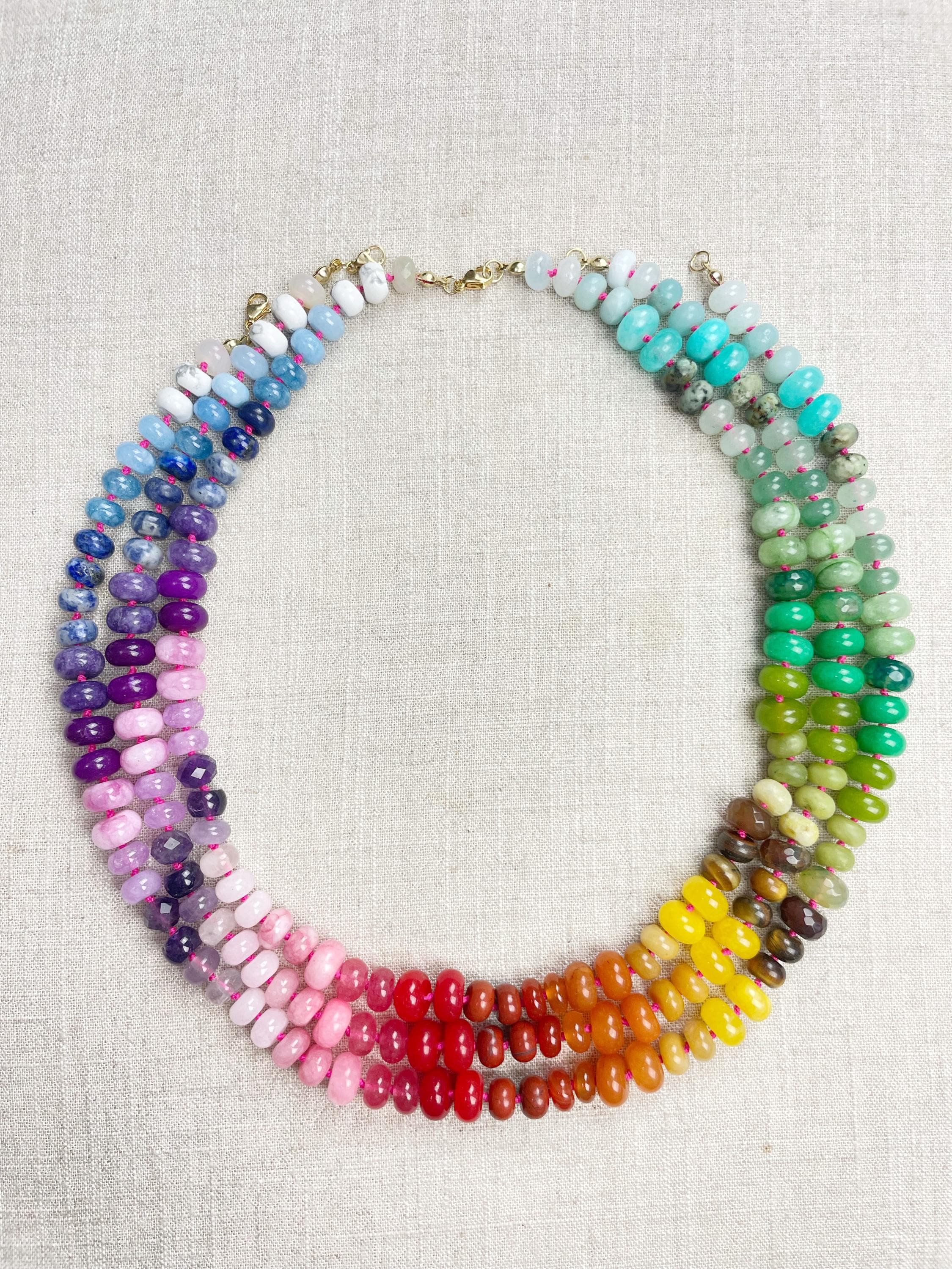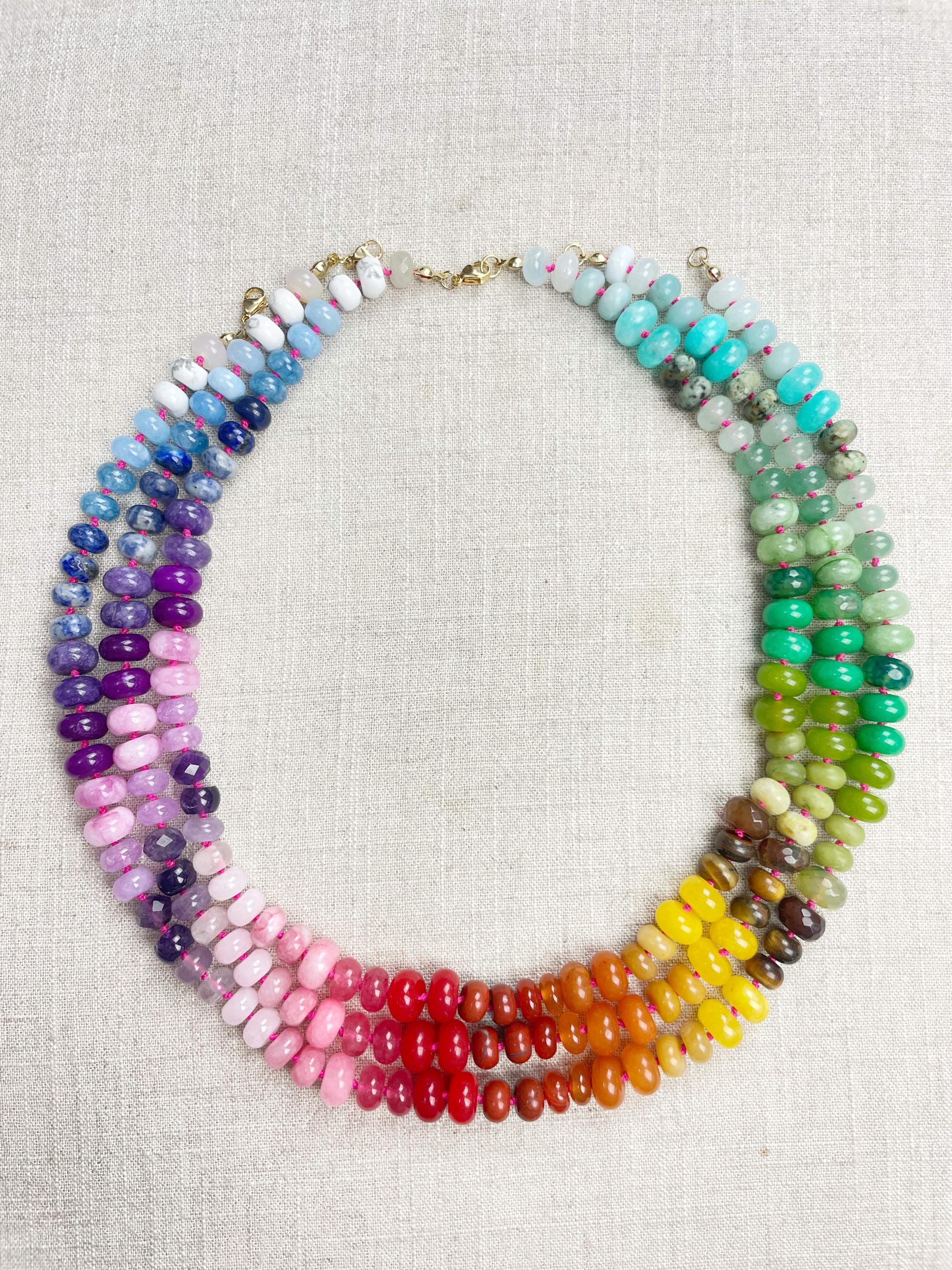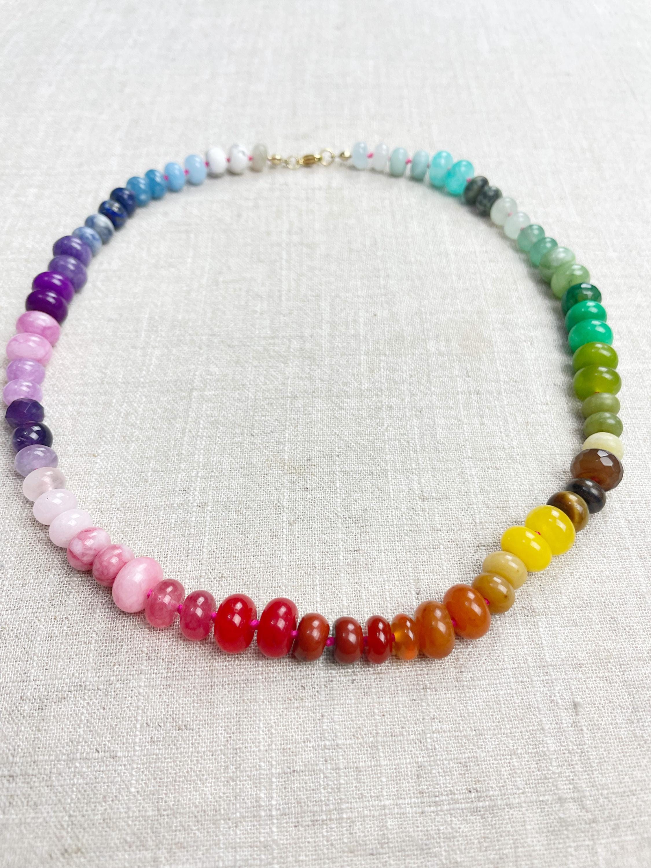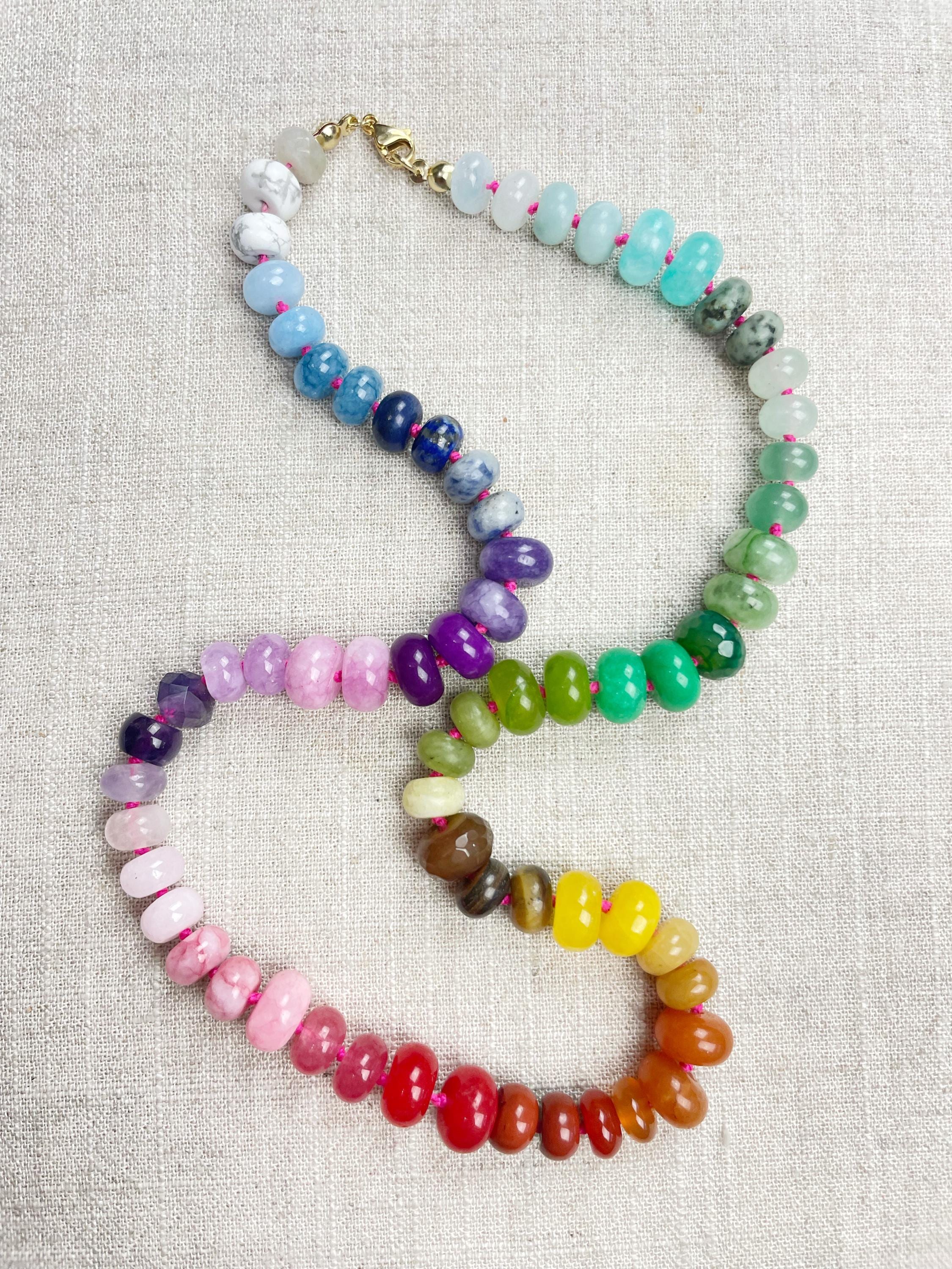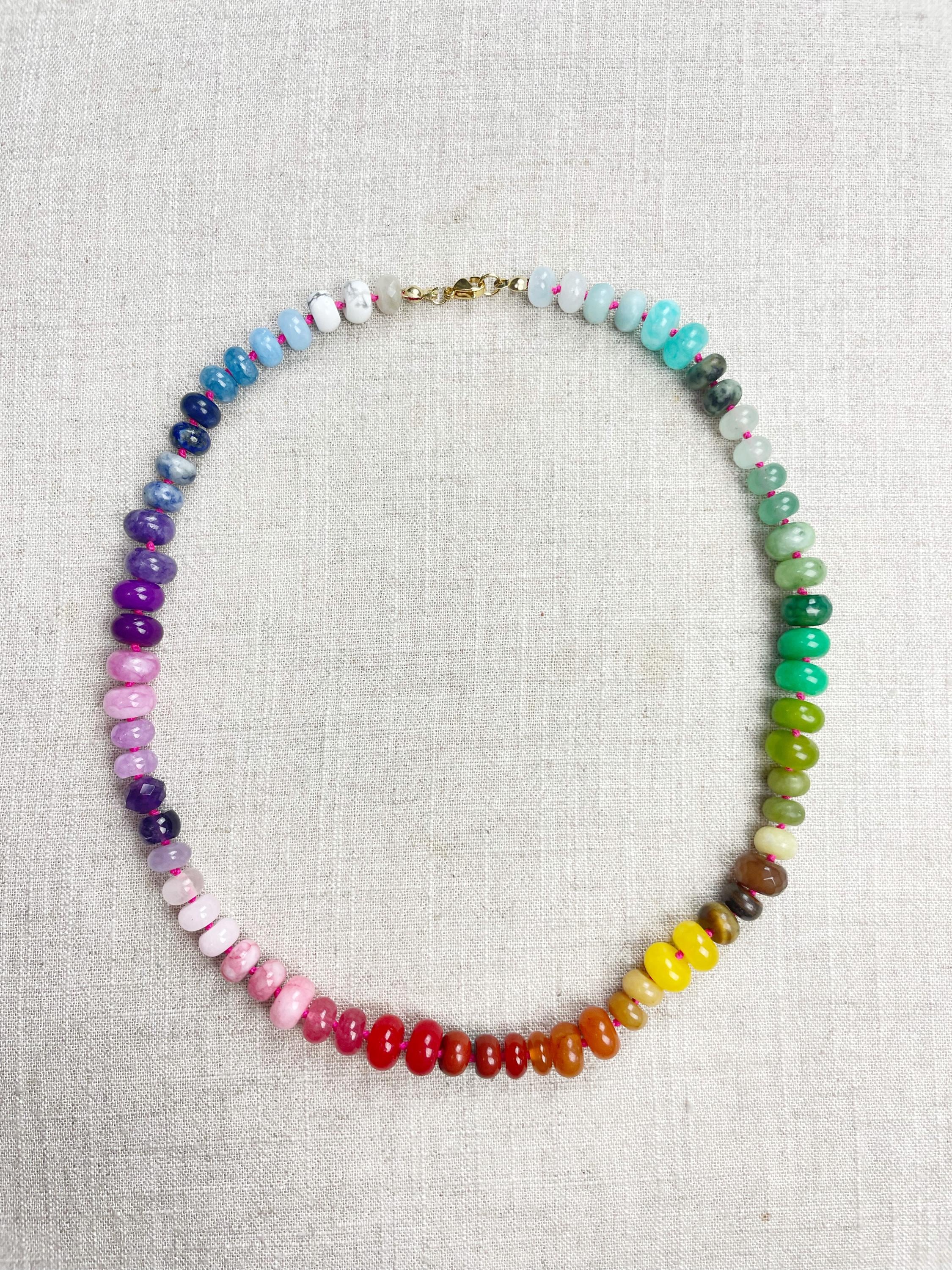 This necklace is made with gemstone beads. The beads are about 5x8mm. and some that are 5x10mm The necklace includes: dyed jade, African Turquoise, green aventurine, dyed agate, green jadeite, yellow turquoise, tigers eye, yellow aventurine, carnelian, red jasper, rose quartz, amethyst, sodalite, lapis lazuli, white howlite and grey agate.The beads are strung on a nylon cording. The necklace is hand-knotted in between each bead. The necklace is finished off with a gold plated stainless steel clasp and logo charm.
