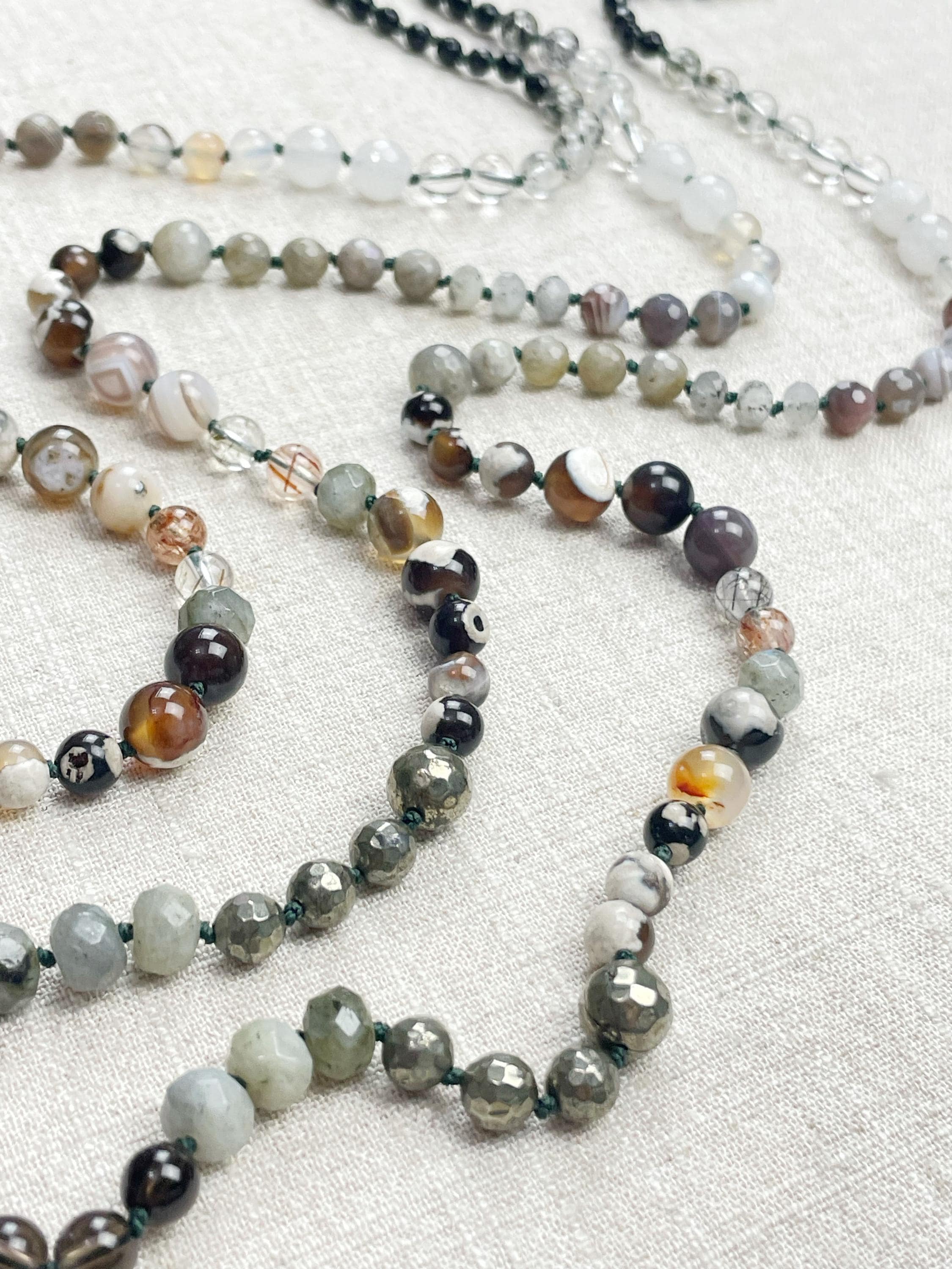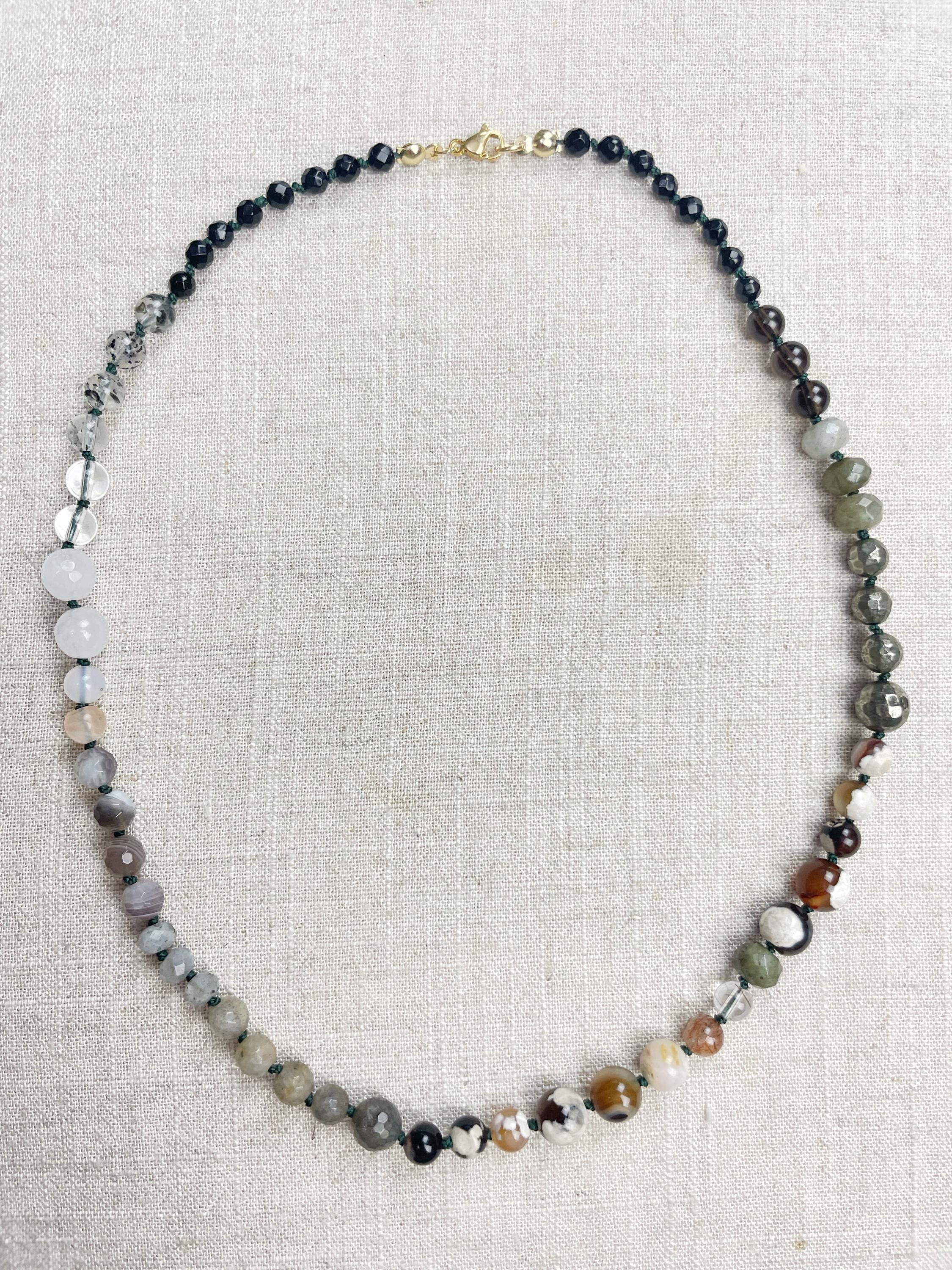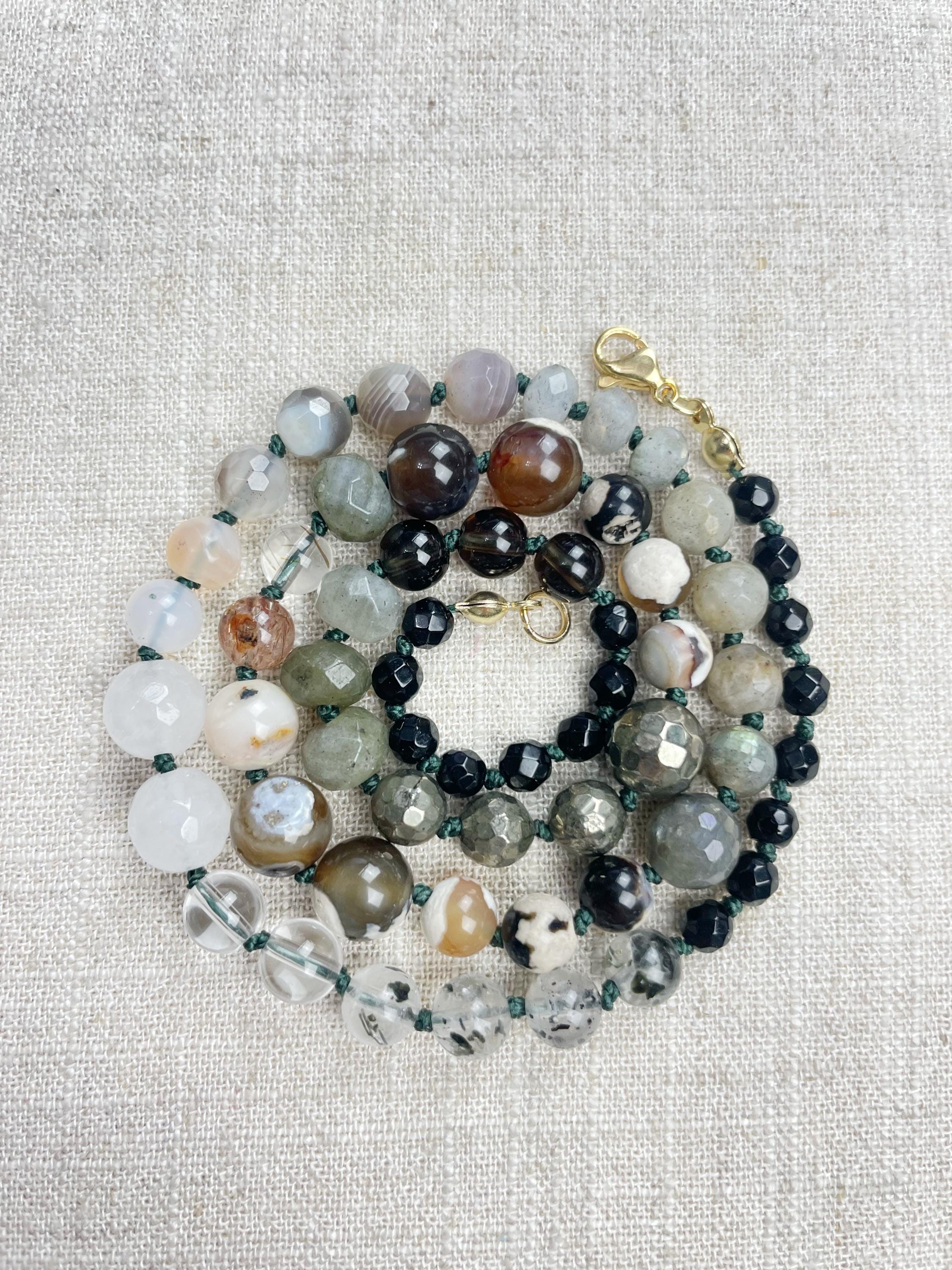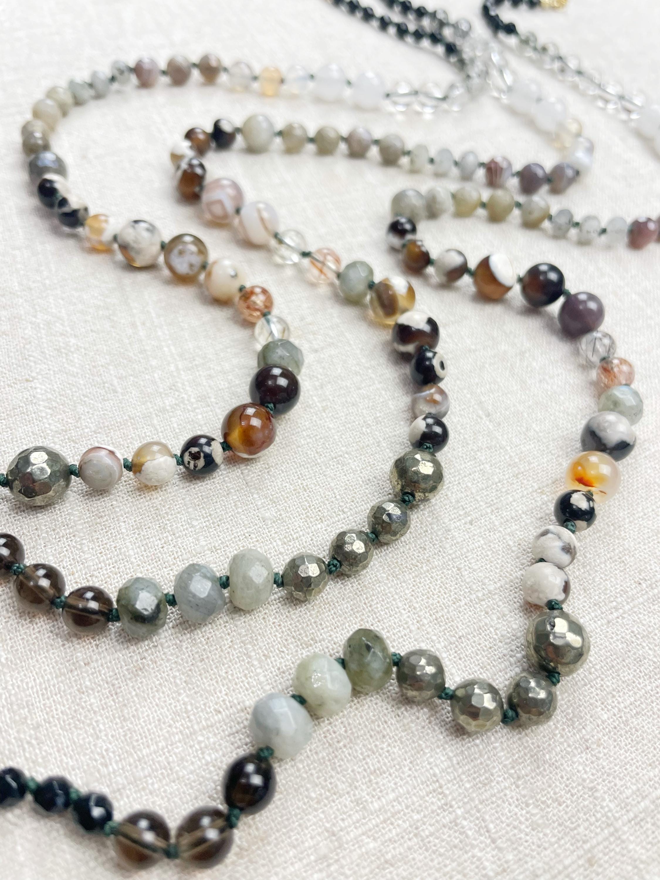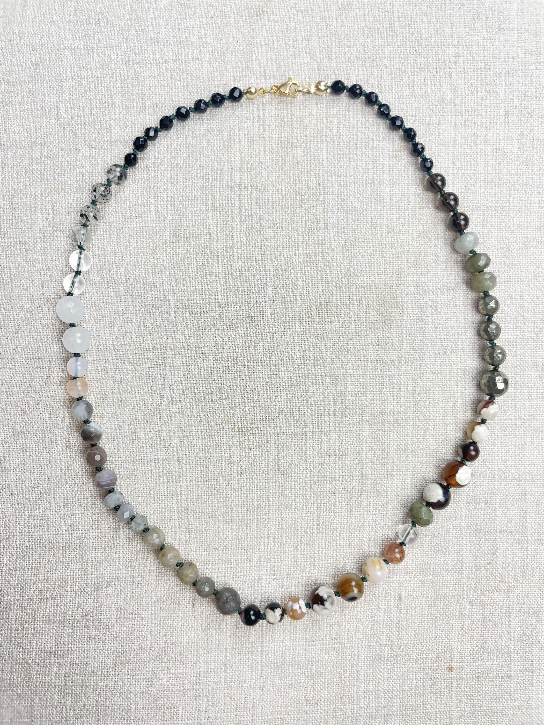 This necklace is made with gemstone beads. The beads range from 4mm to 8mm in size. The necklace includes: black agate, smoky quartz, labradorite, pyrite, orca agate, included quartz, jade, clear quartz, tourmaline included quartz. The beads are strung on a nylon cording. The necklace is hand-knotted in between each bead. The necklace is finished off with a gold plated stainless steel clasp and logo charm.