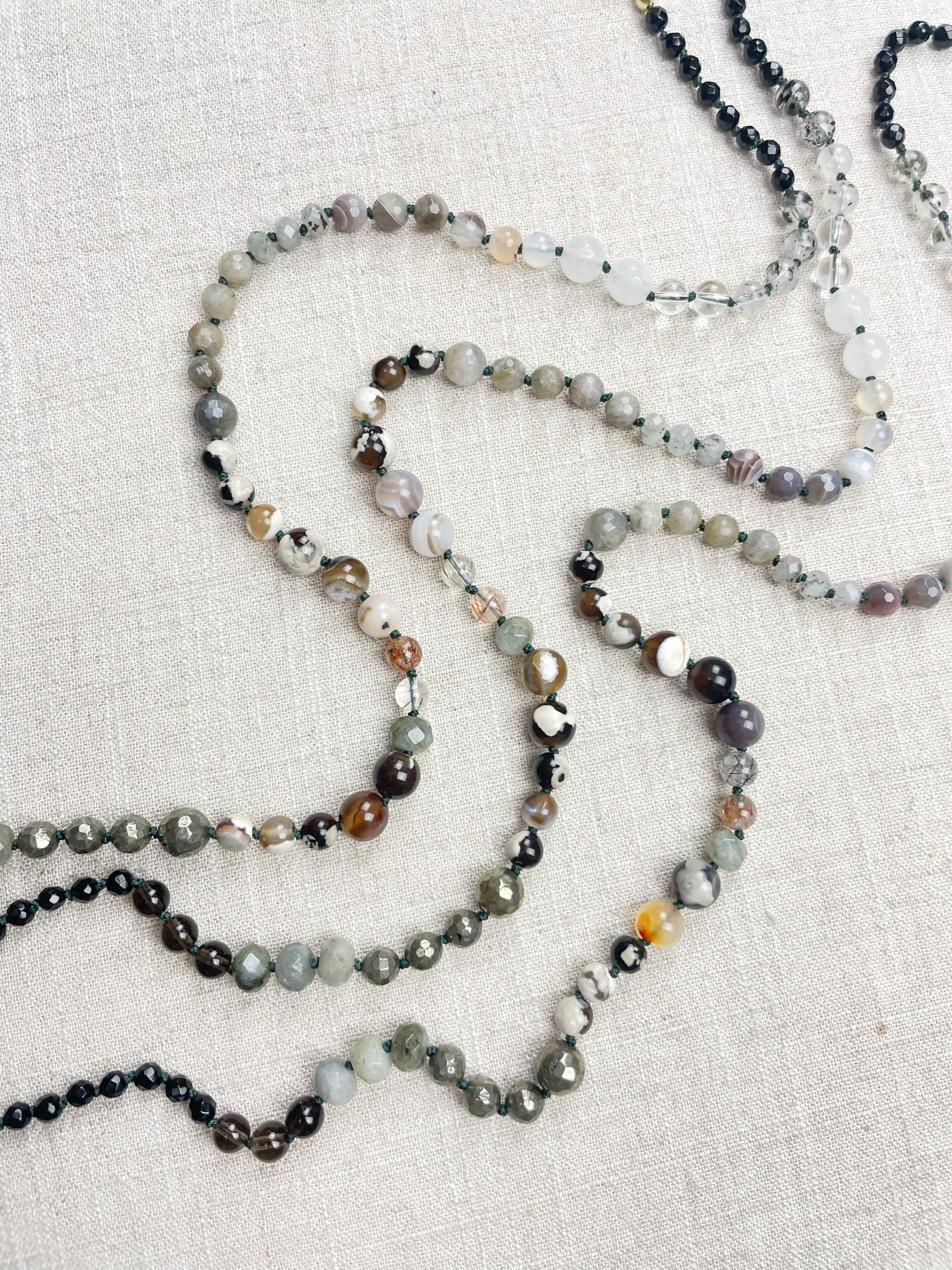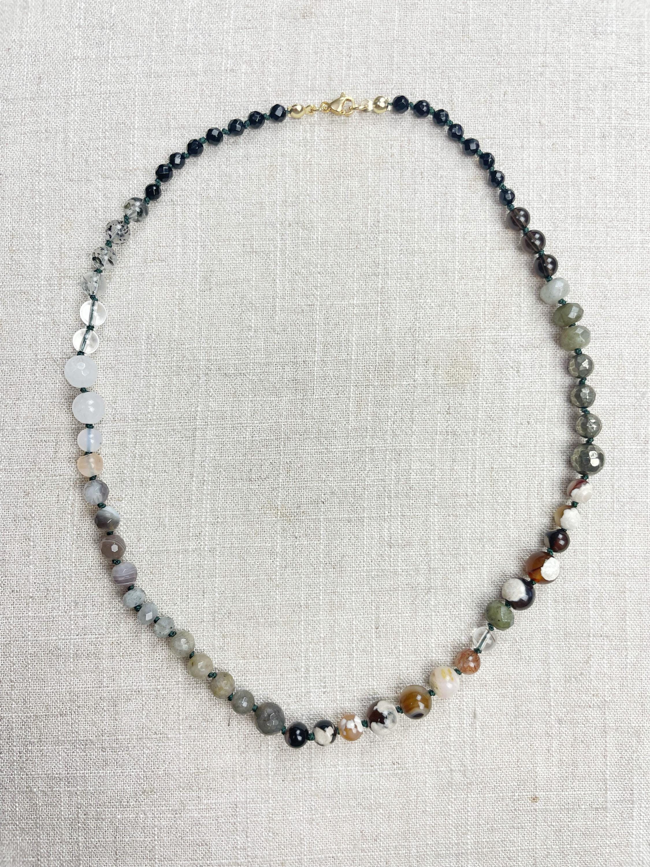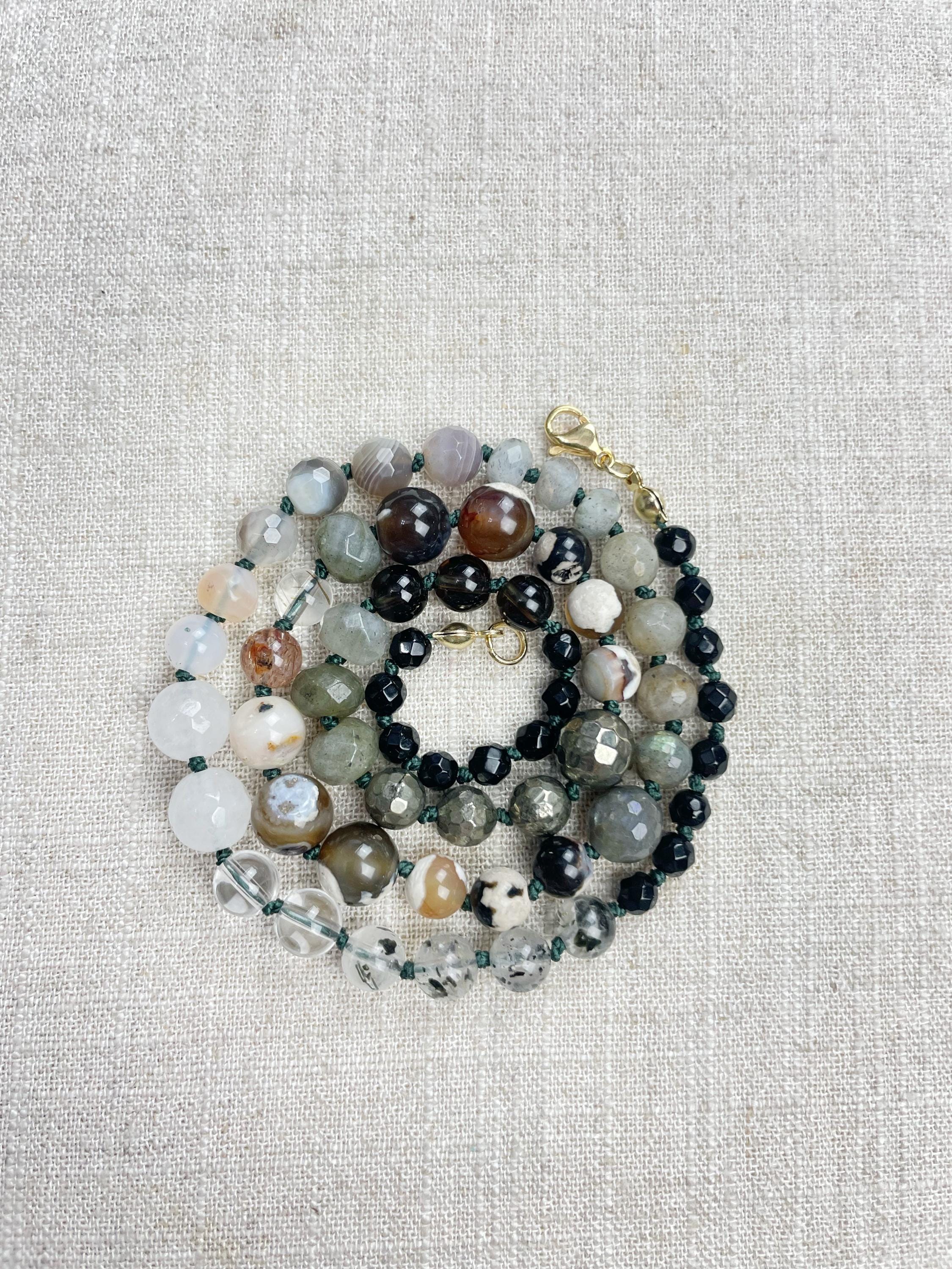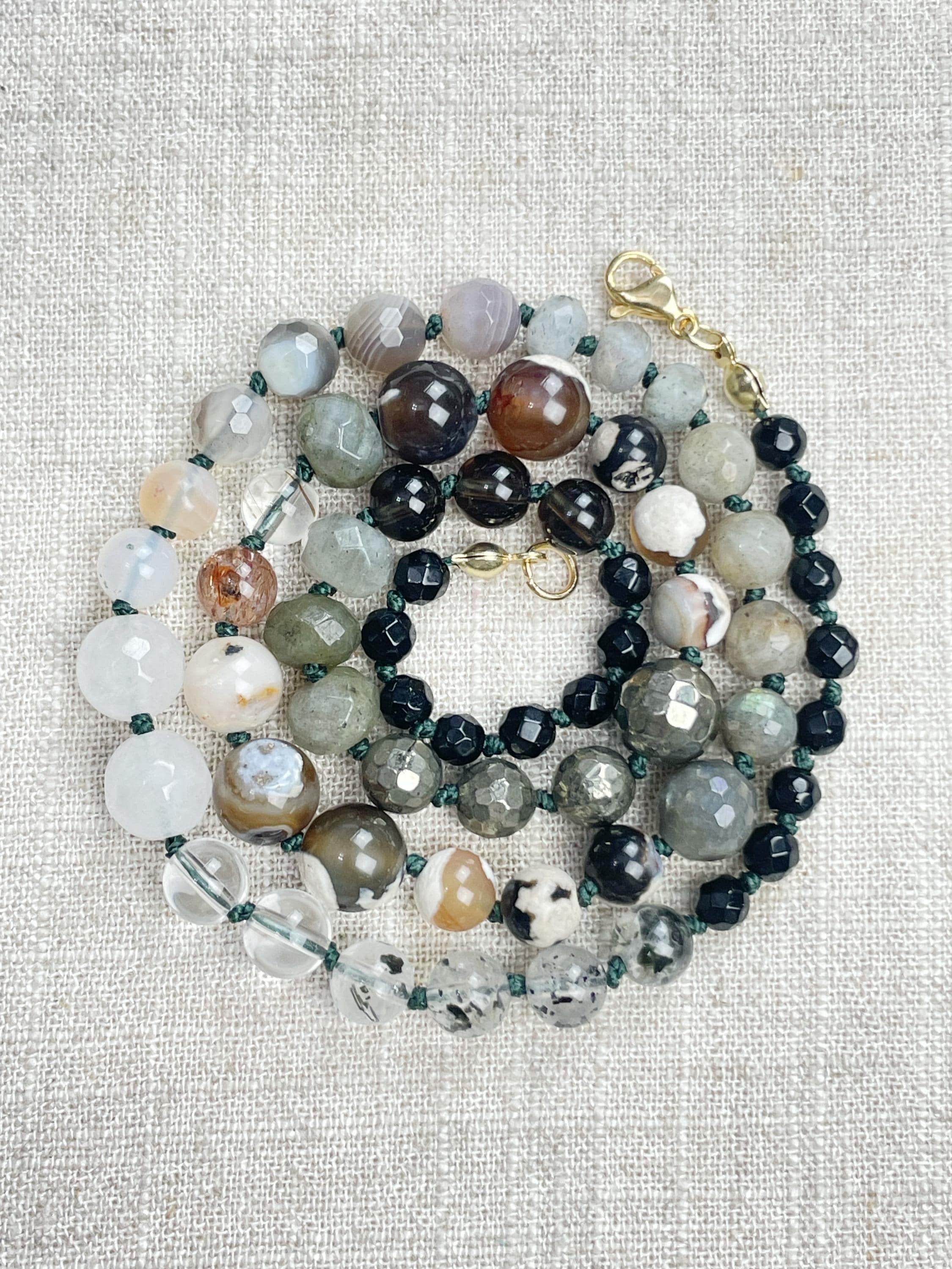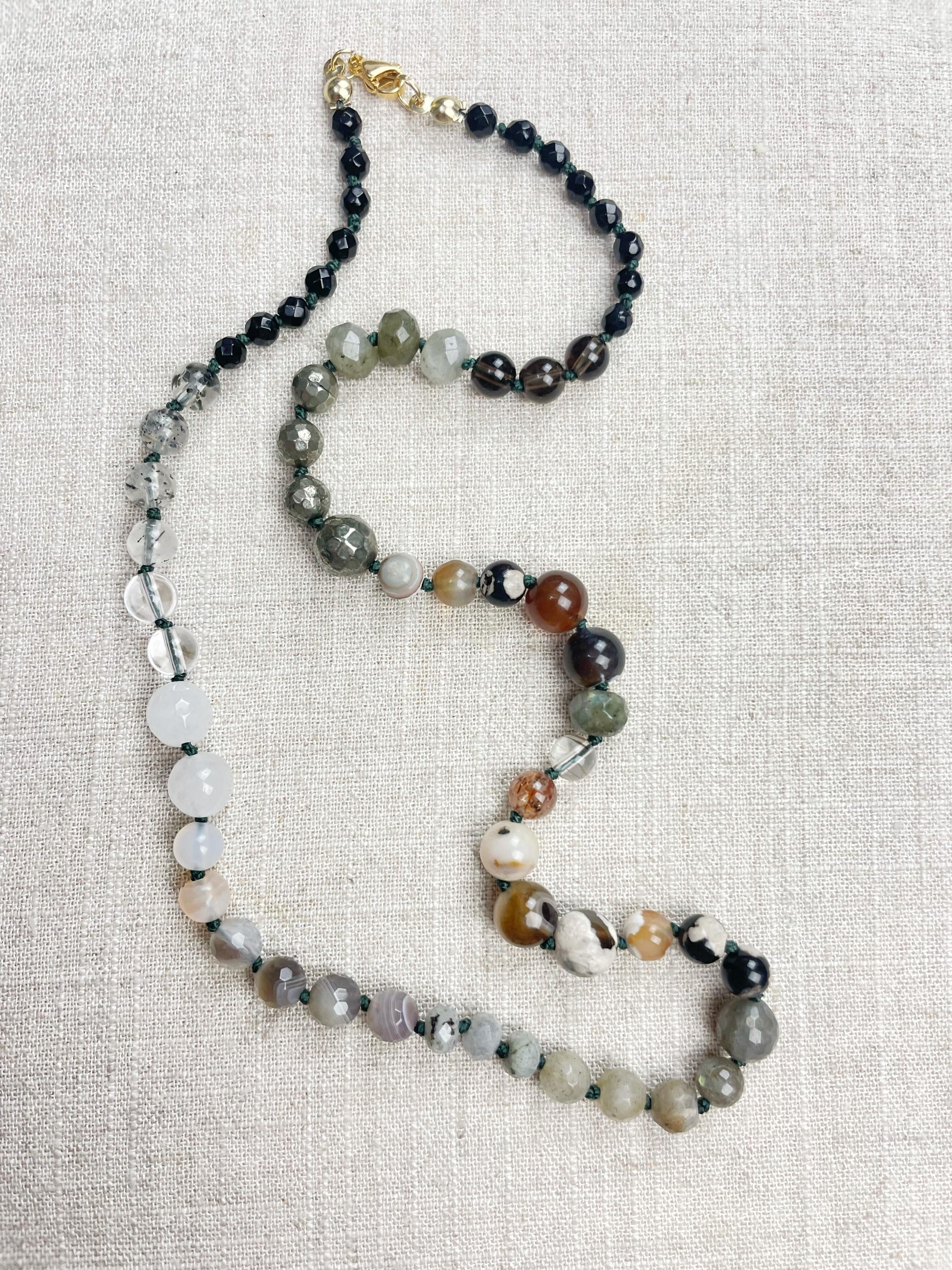 This necklace is made with gemstone beads. The beads range from 4mm to 8mm in size. The necklace includes: black agate, smoky quartz, labradorite, pyrite, orca agate, included quartz, jade, clear quartz, tourmaline included quartz. The beads are strung on a nylon cording. The necklace is hand-knotted in between each bead. The necklace is finished off with a gold plated stainless steel clasp and logo charm.