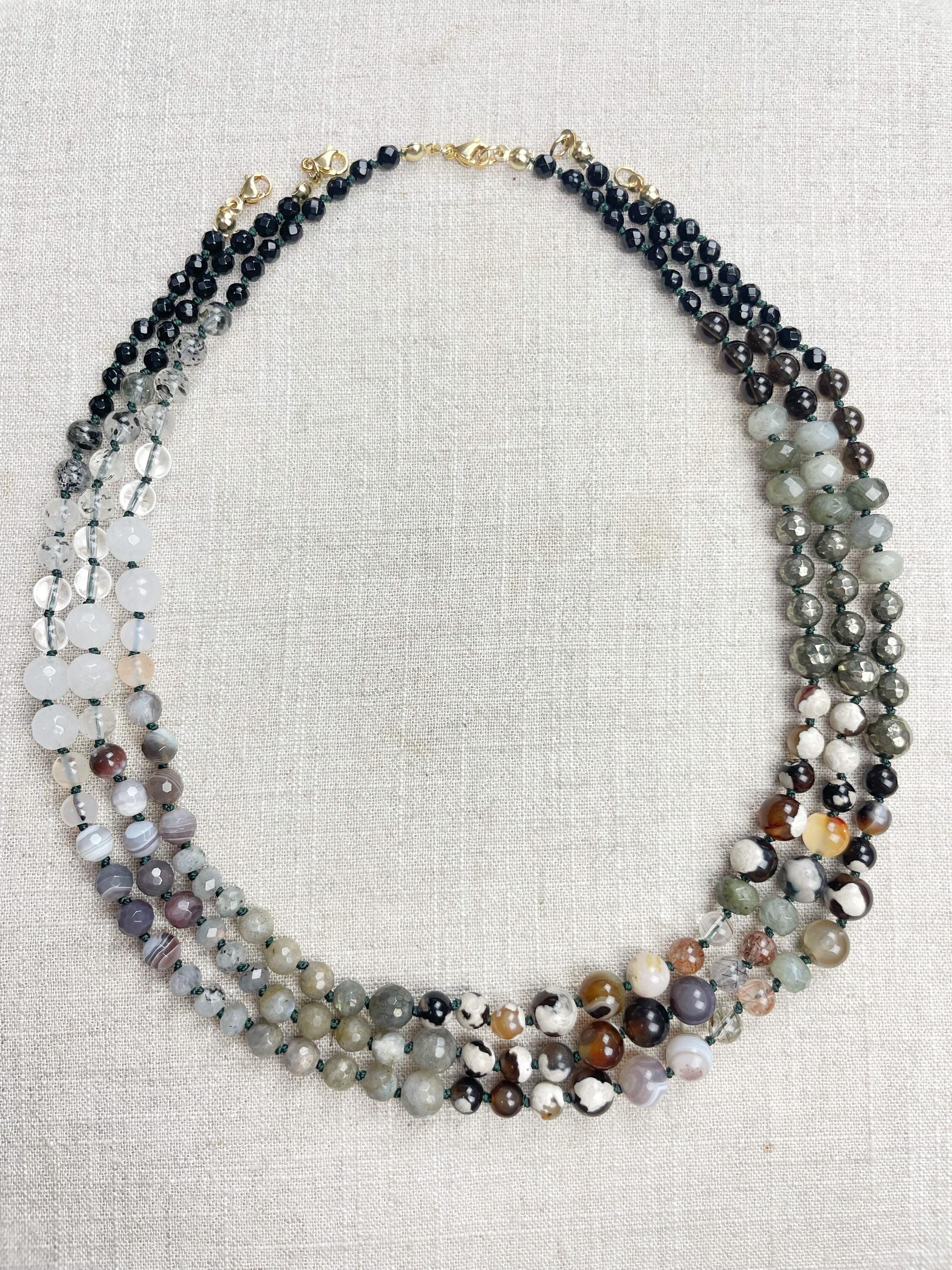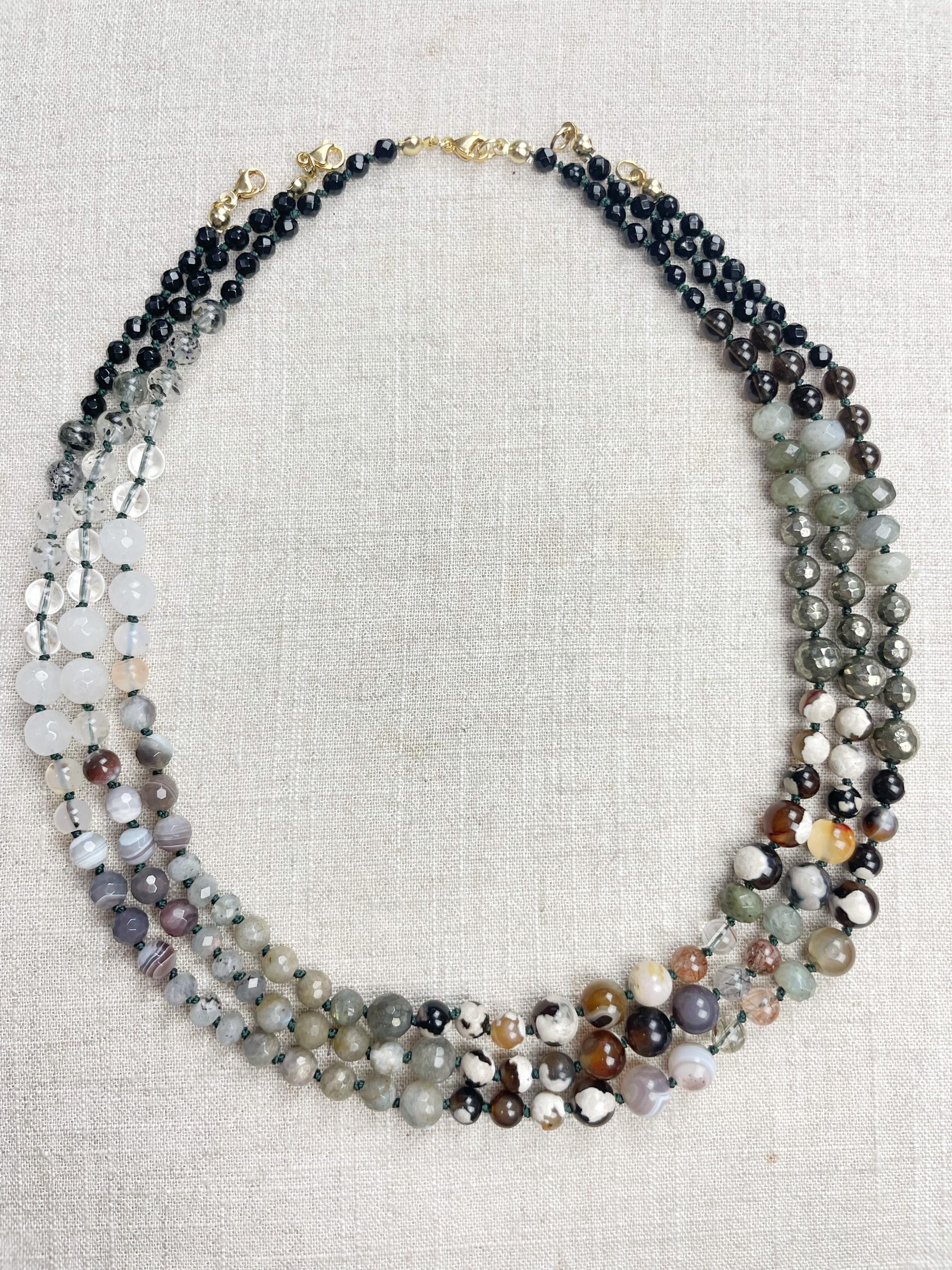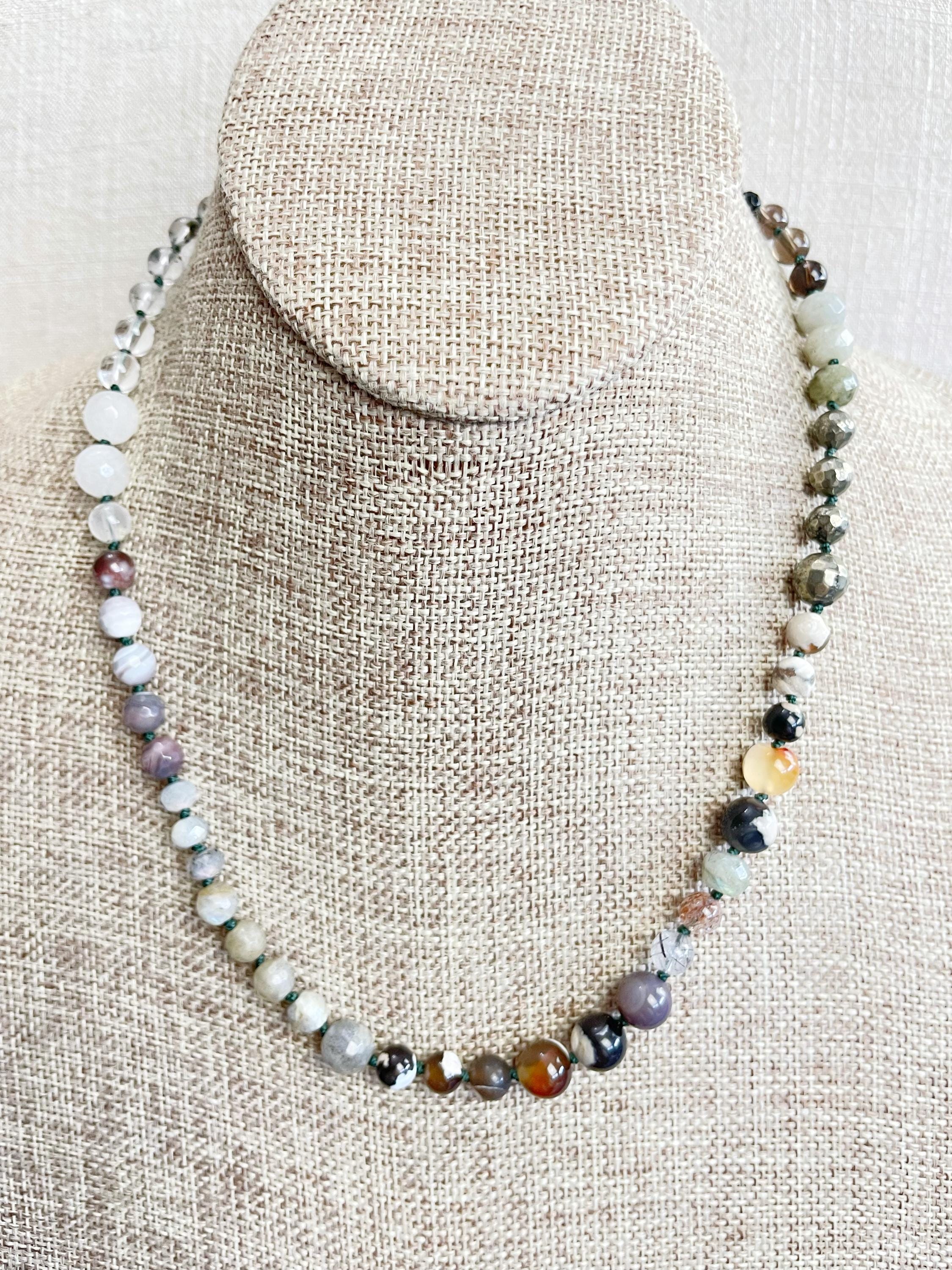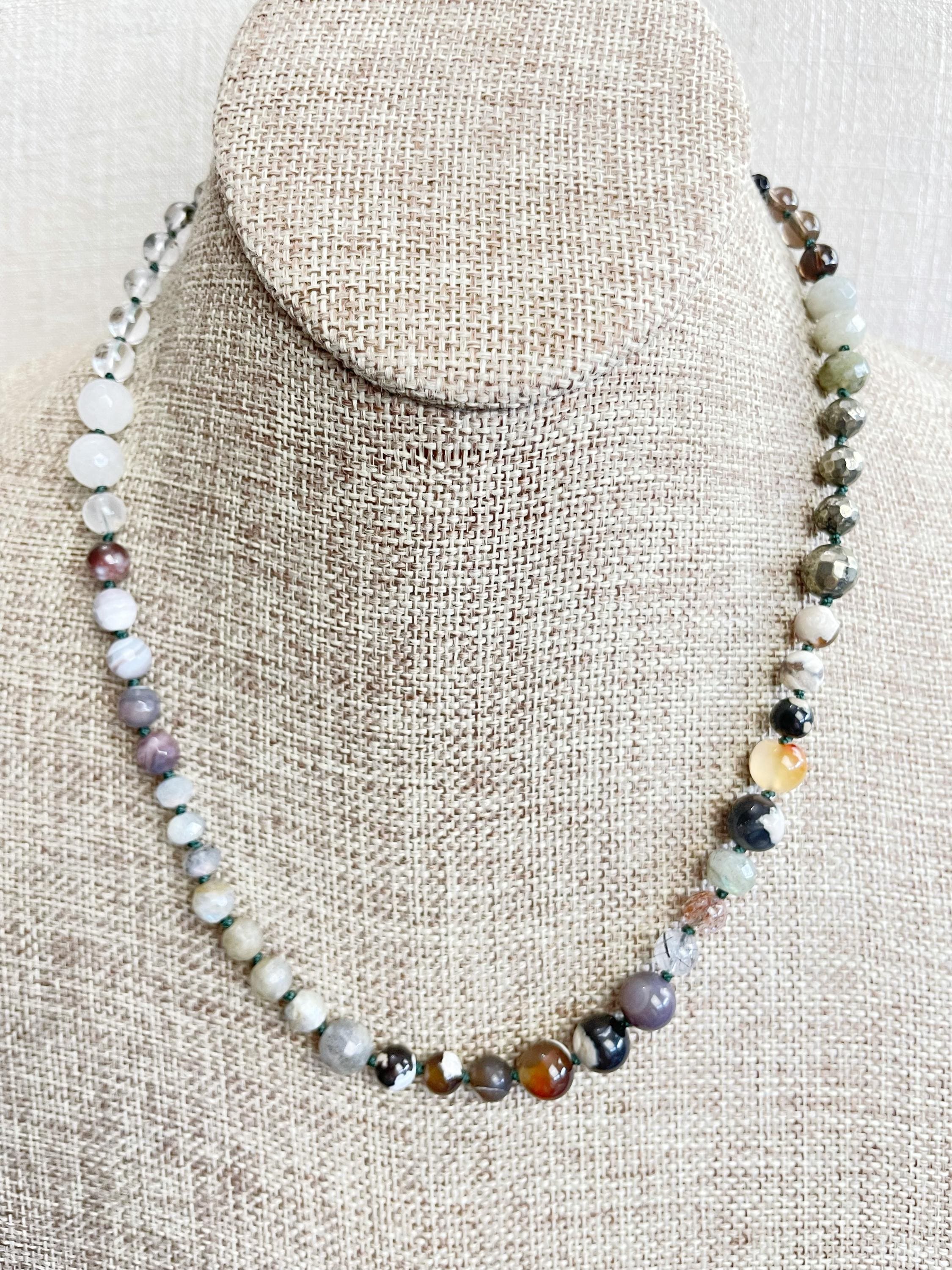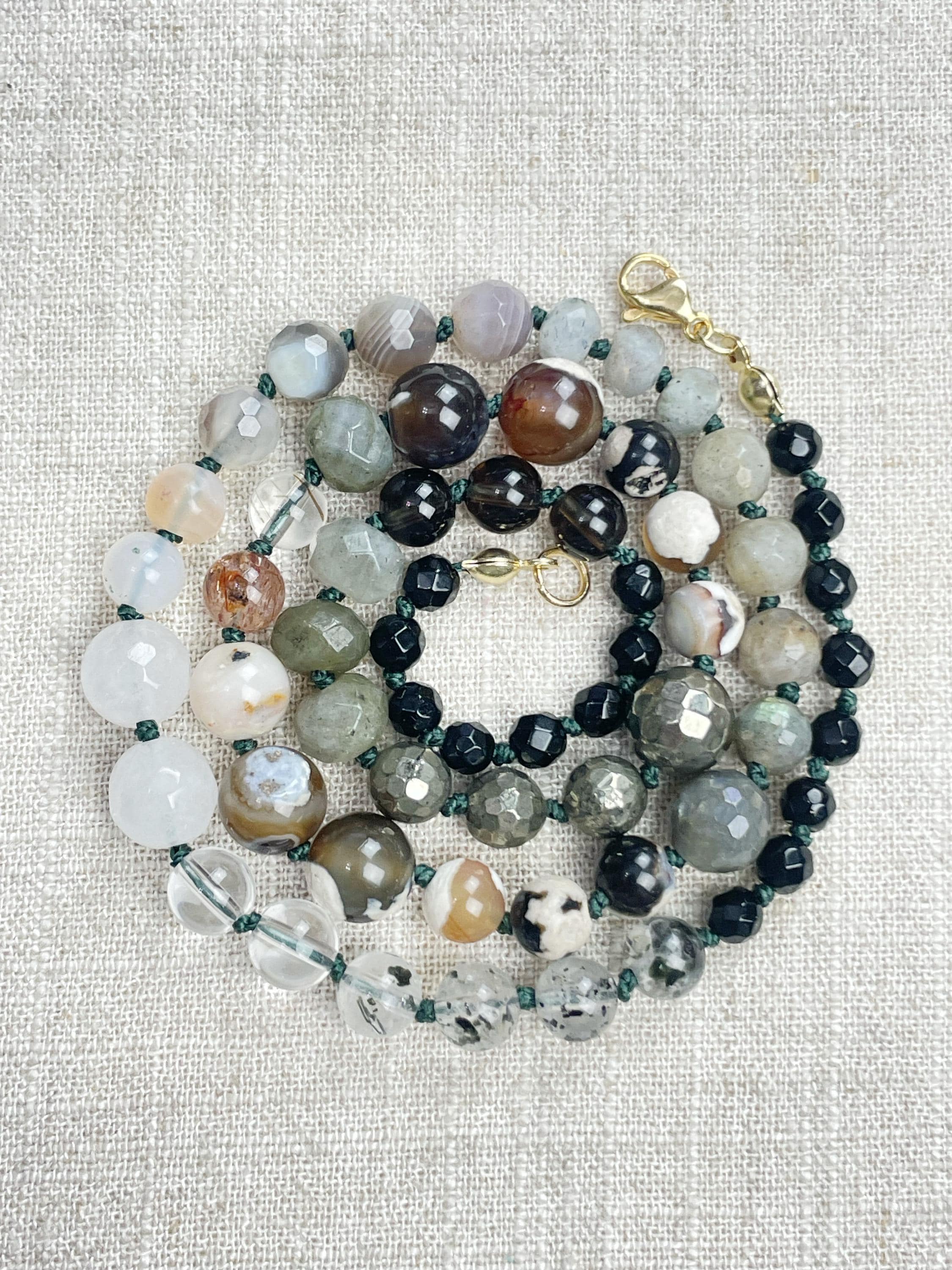 This necklace is made with gemstone beads. The beads range from 4mm to 8mm in size. The necklace includes: black agate, smoky quartz, labradorite, pyrite, orca agate, included quartz, jade, clear quartz, tourmaline included quartz. The beads are strung on a nylon cording. The necklace is hand-knotted in between each bead. The necklace is finished off with a gold plated stainless steel clasp and logo charm.