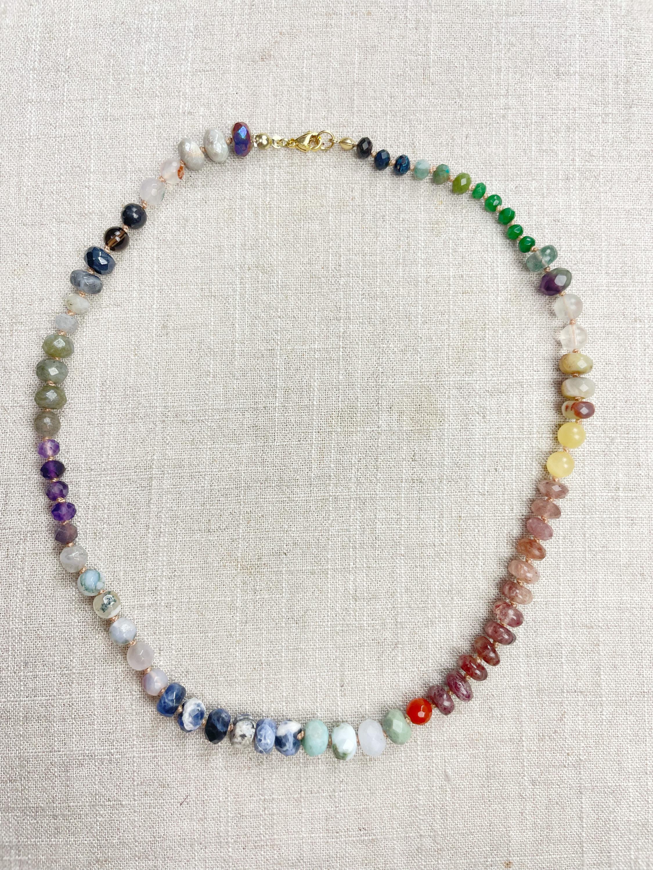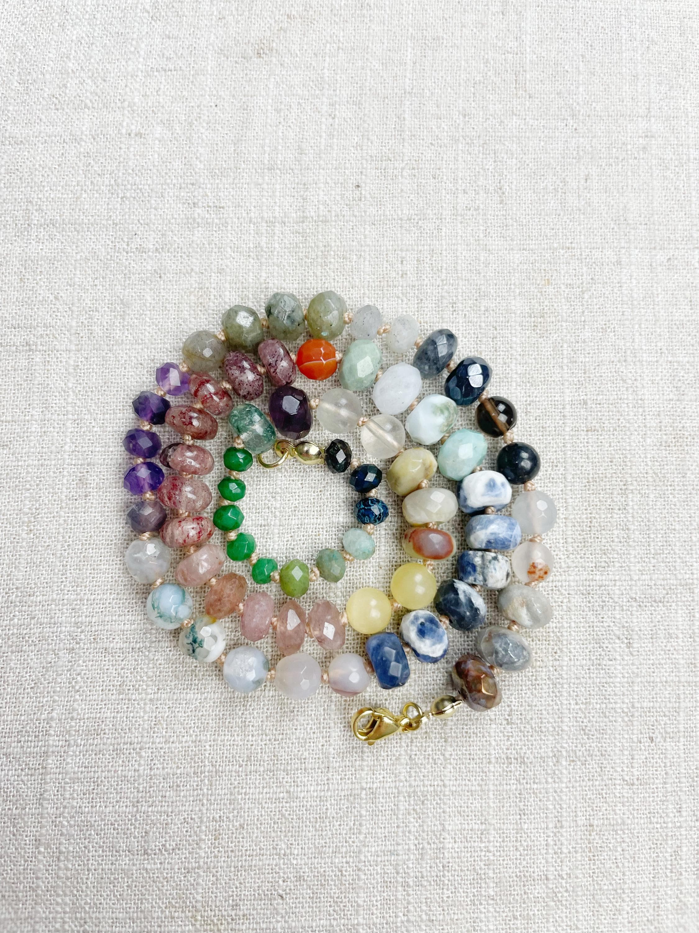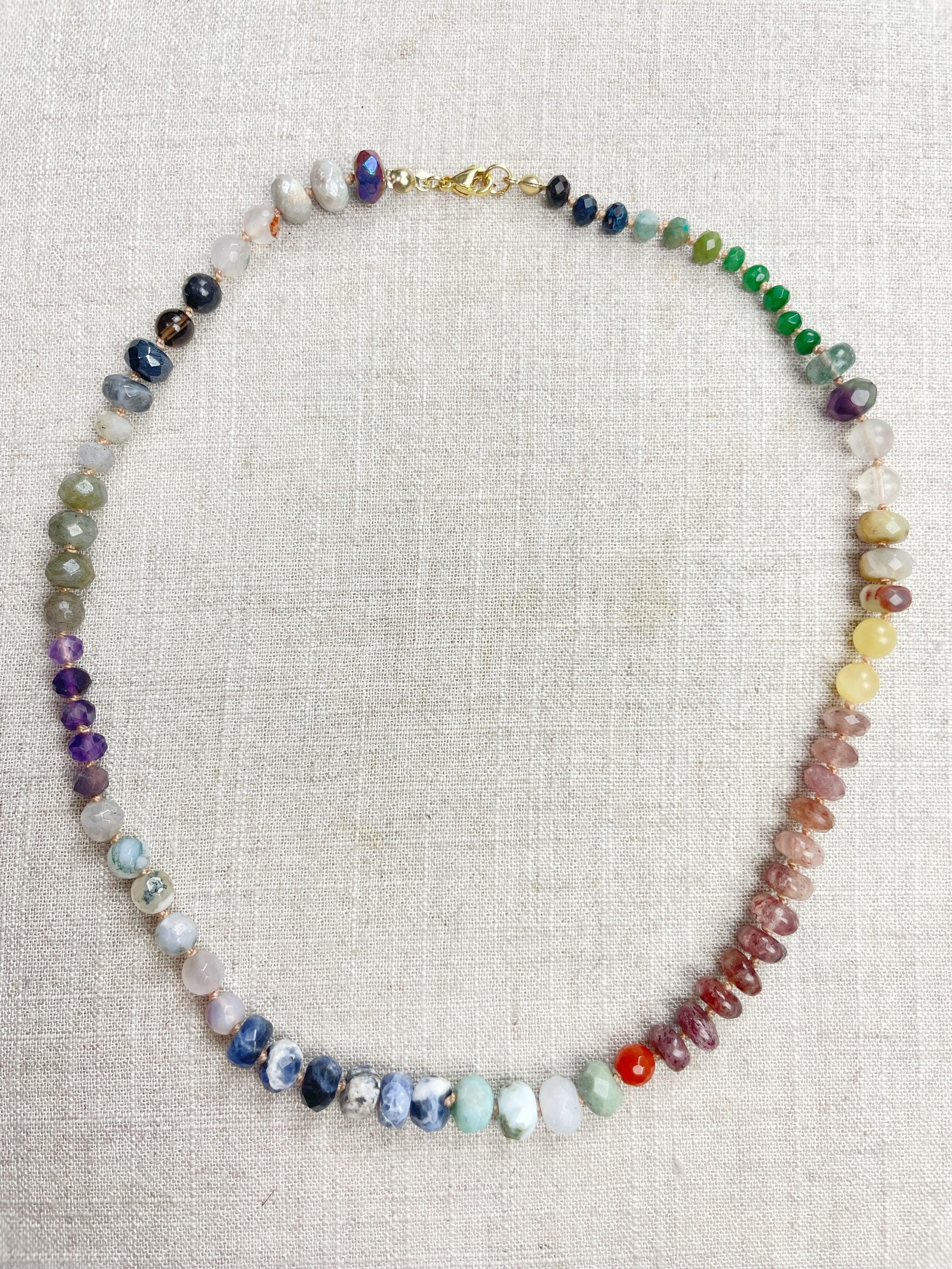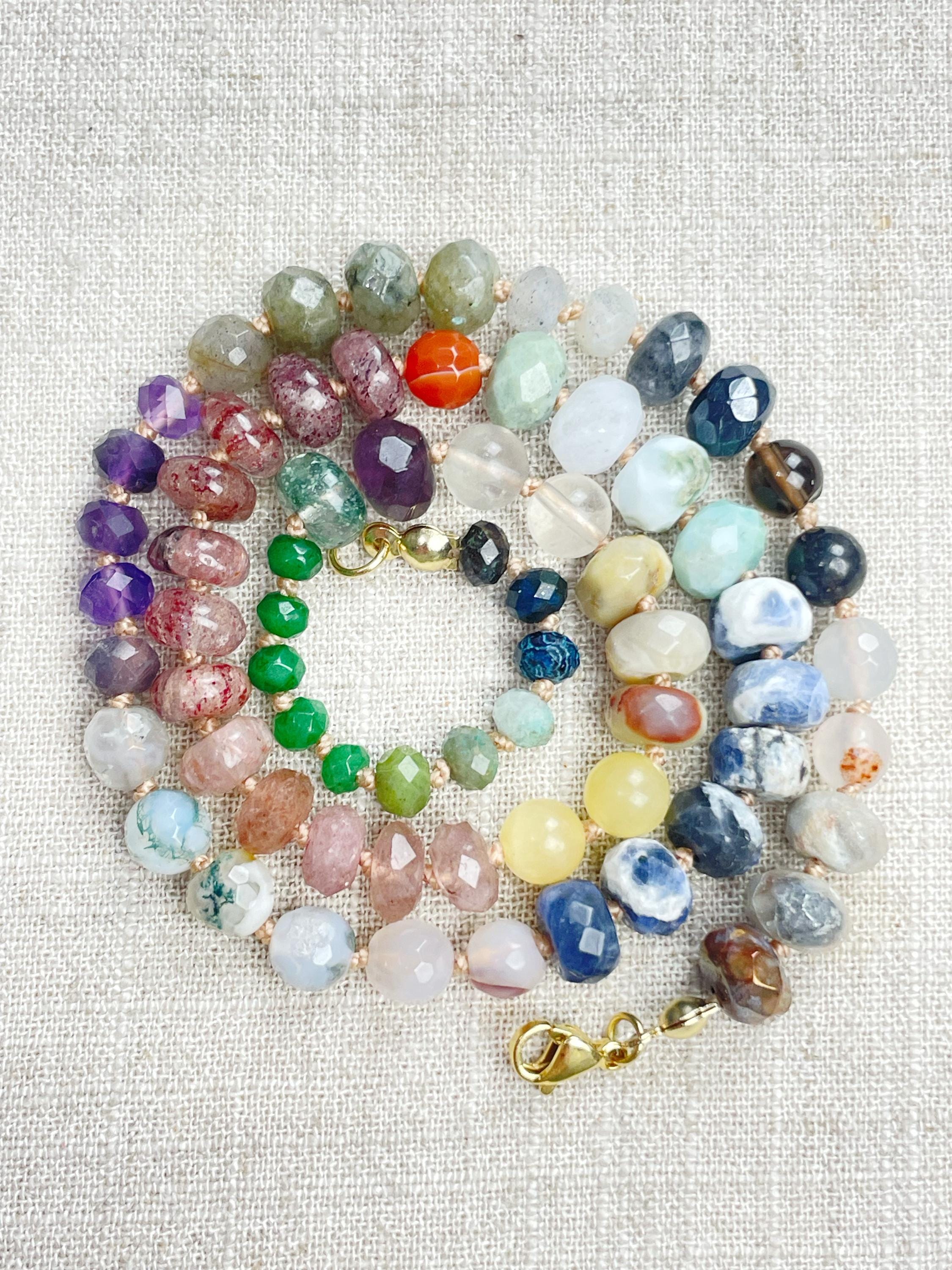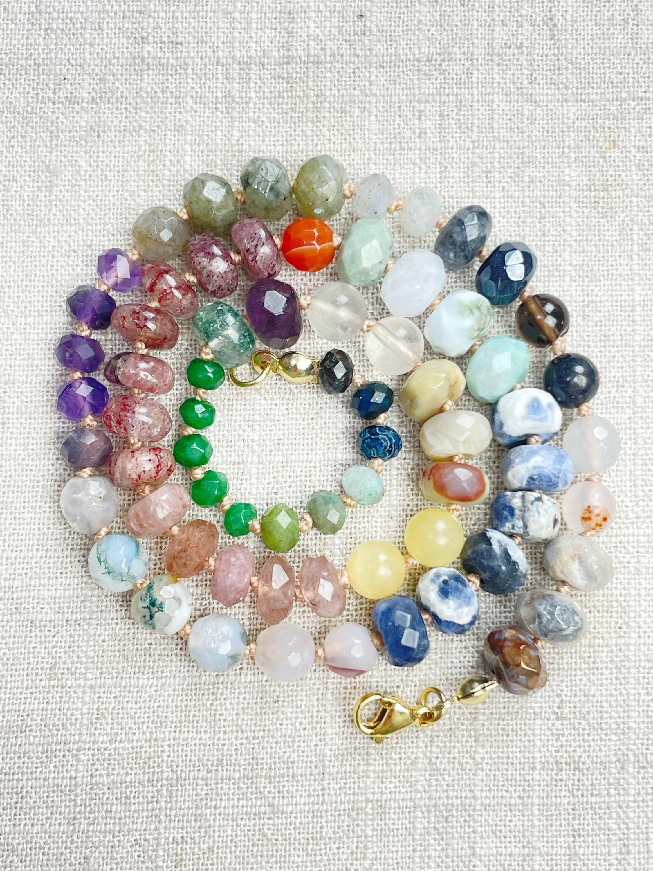 This necklace is made with gemstone beads. The beads range from 4mm to 8mm in size. The necklace includes: aura coated amazonite, agate, rhodonite, tigers eye, labradorite, amethyst, moss agate, sodalite, larimar, aquamarine, carnelian, strawberry quartz, fluorite, chlorite quartz, green jade, chrysocolla. The beads are strung on a nylon cording. The necklace is hand-knotted in between each bead. The necklace is finished off with a gold plated stainless steel clasp and logo charm.