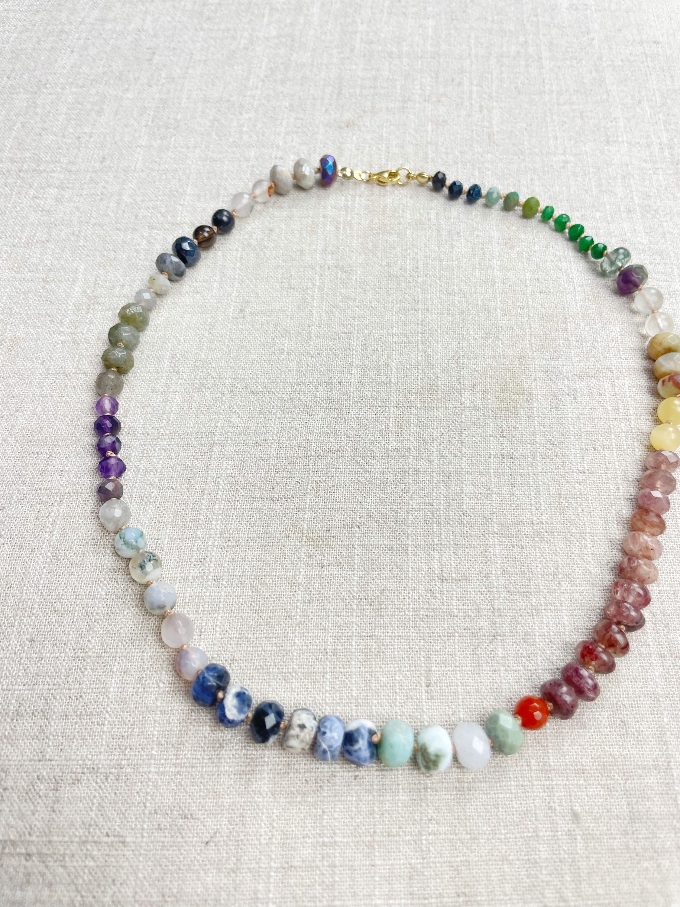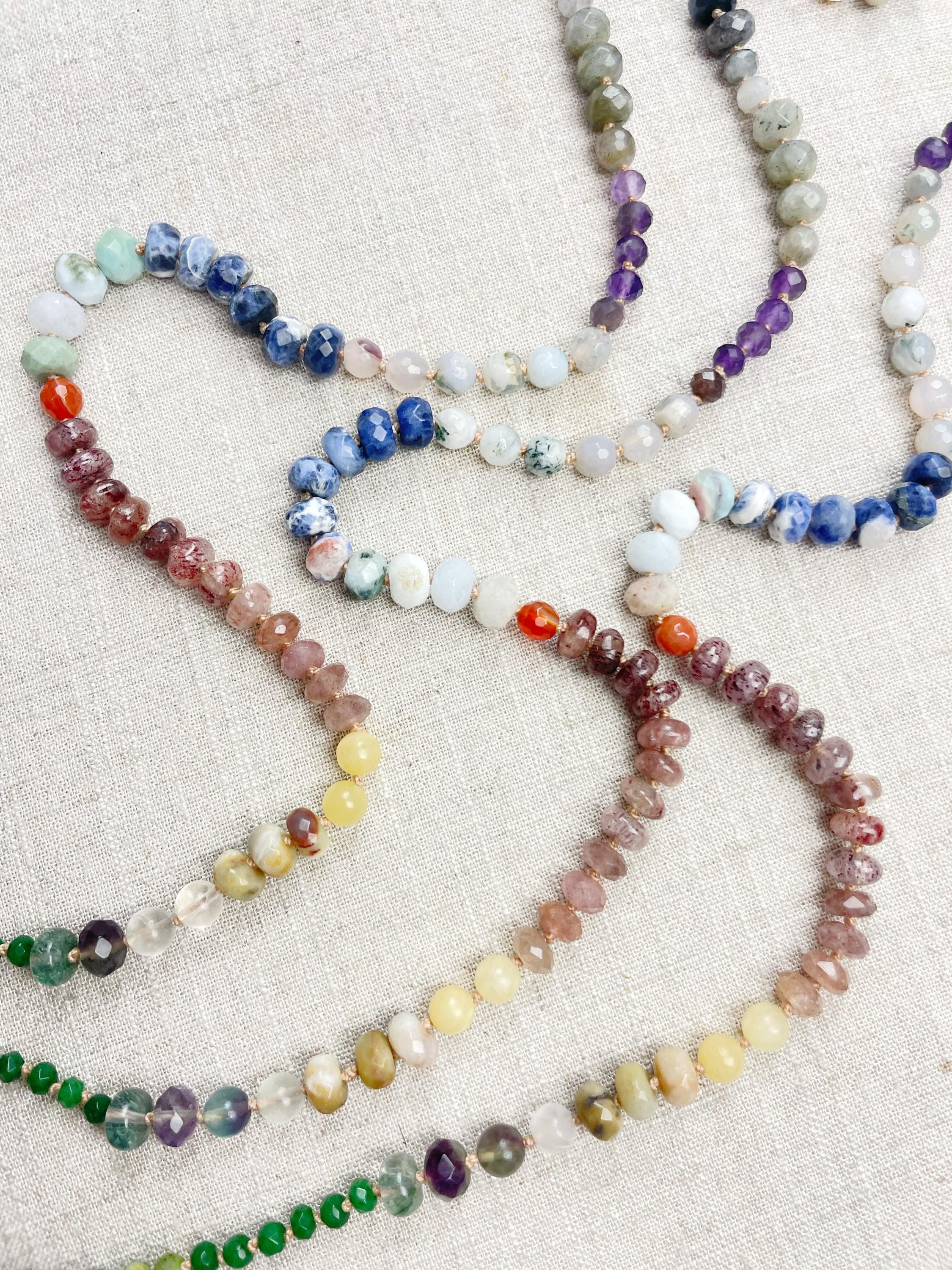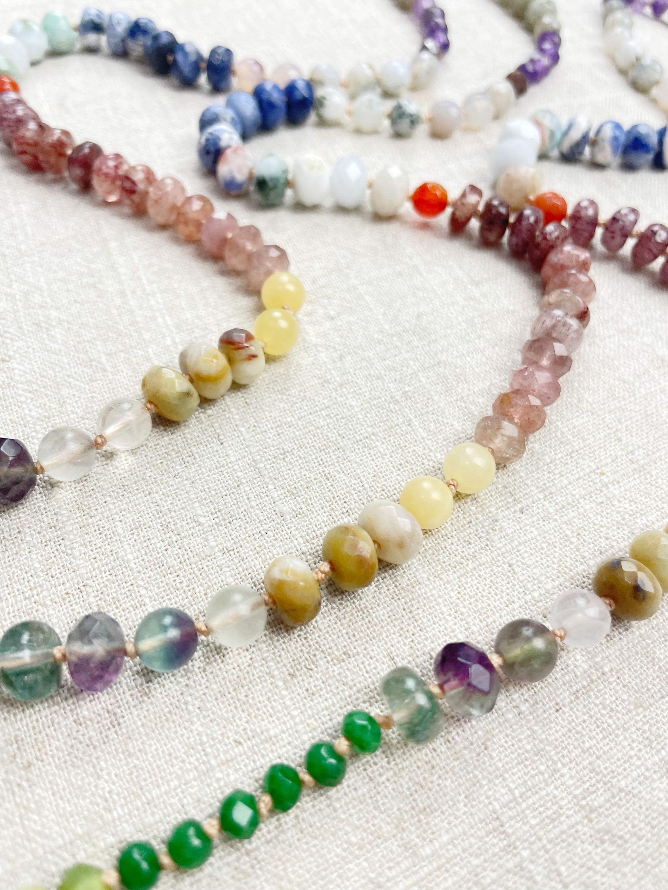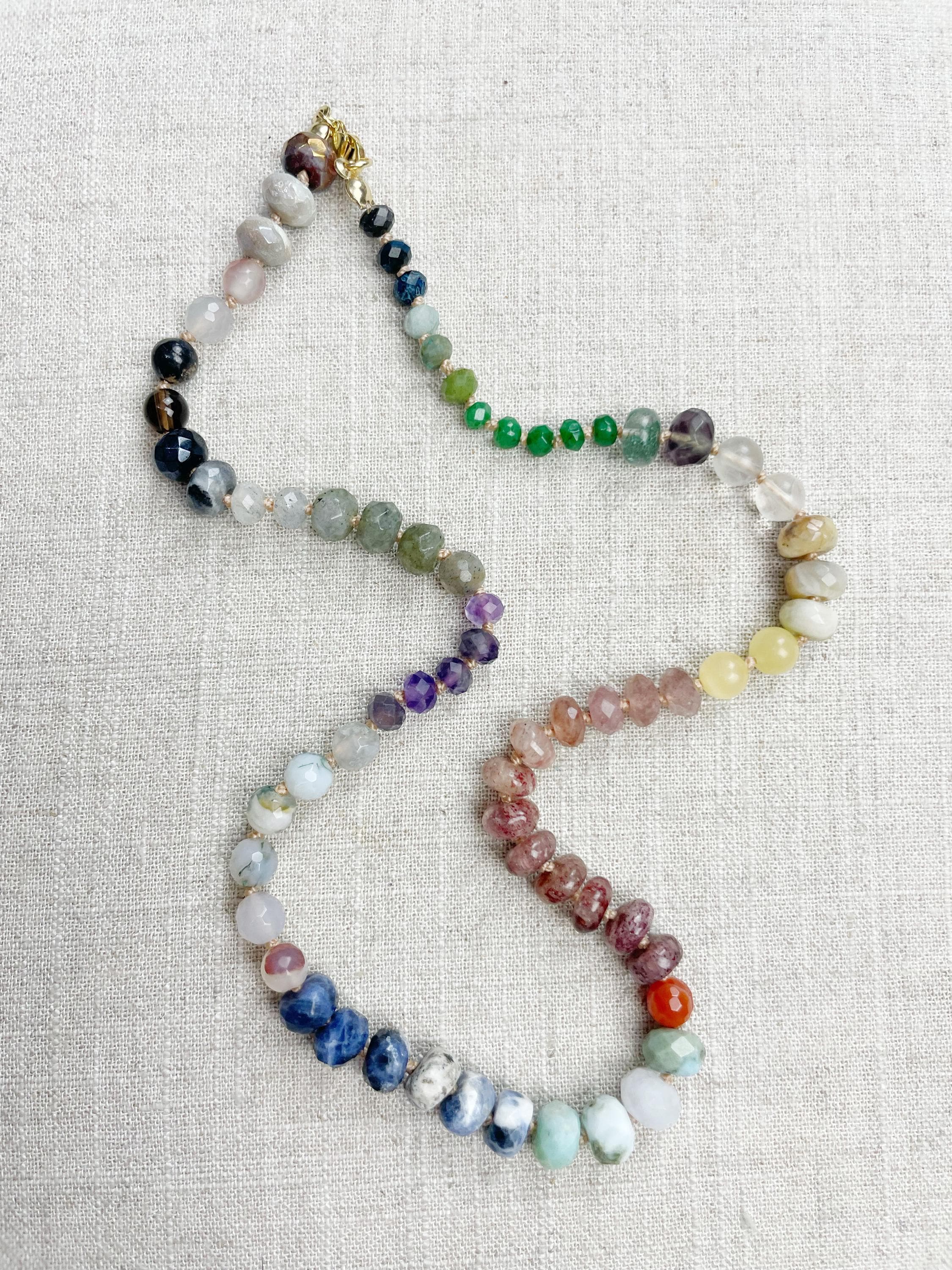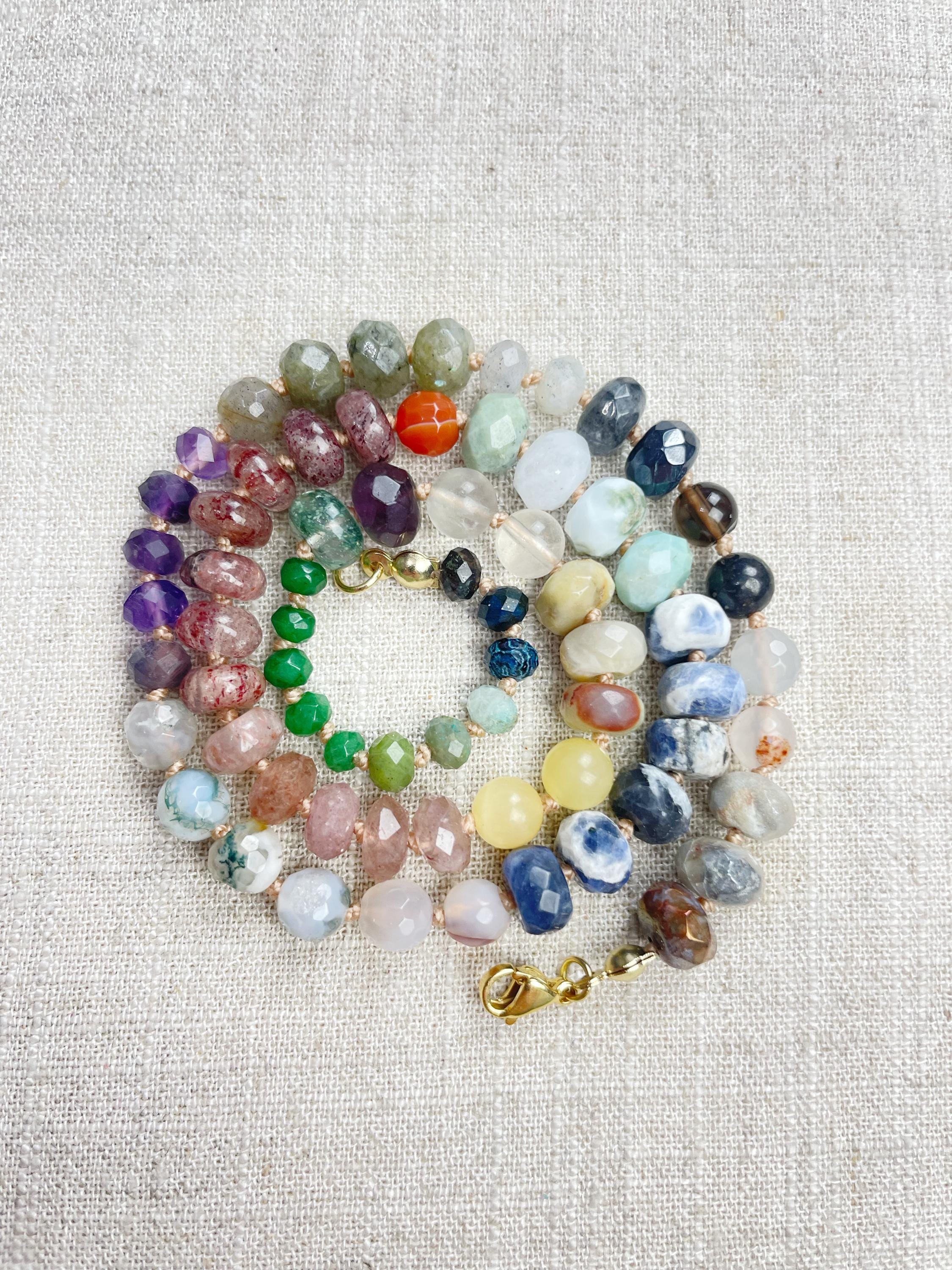 This necklace is made with gemstone beads. The beads range from 4mm to 8mm in size. The necklace includes: aura coated amazonite, agate, rhodonite, tigers eye, labradorite, amethyst, moss agate, sodalite, larimar, aquamarine, carnelian, strawberry quartz, fluorite, chlorite quartz, green jade, chrysocolla. The beads are strung on a nylon cording. The necklace is hand-knotted in between each bead. The necklace is finished off with a gold plated stainless steel clasp and logo charm.