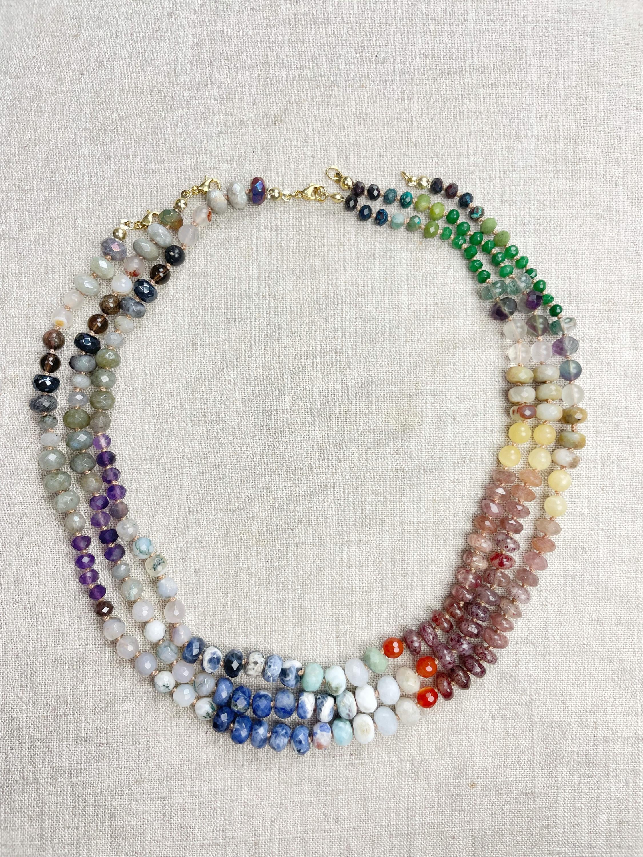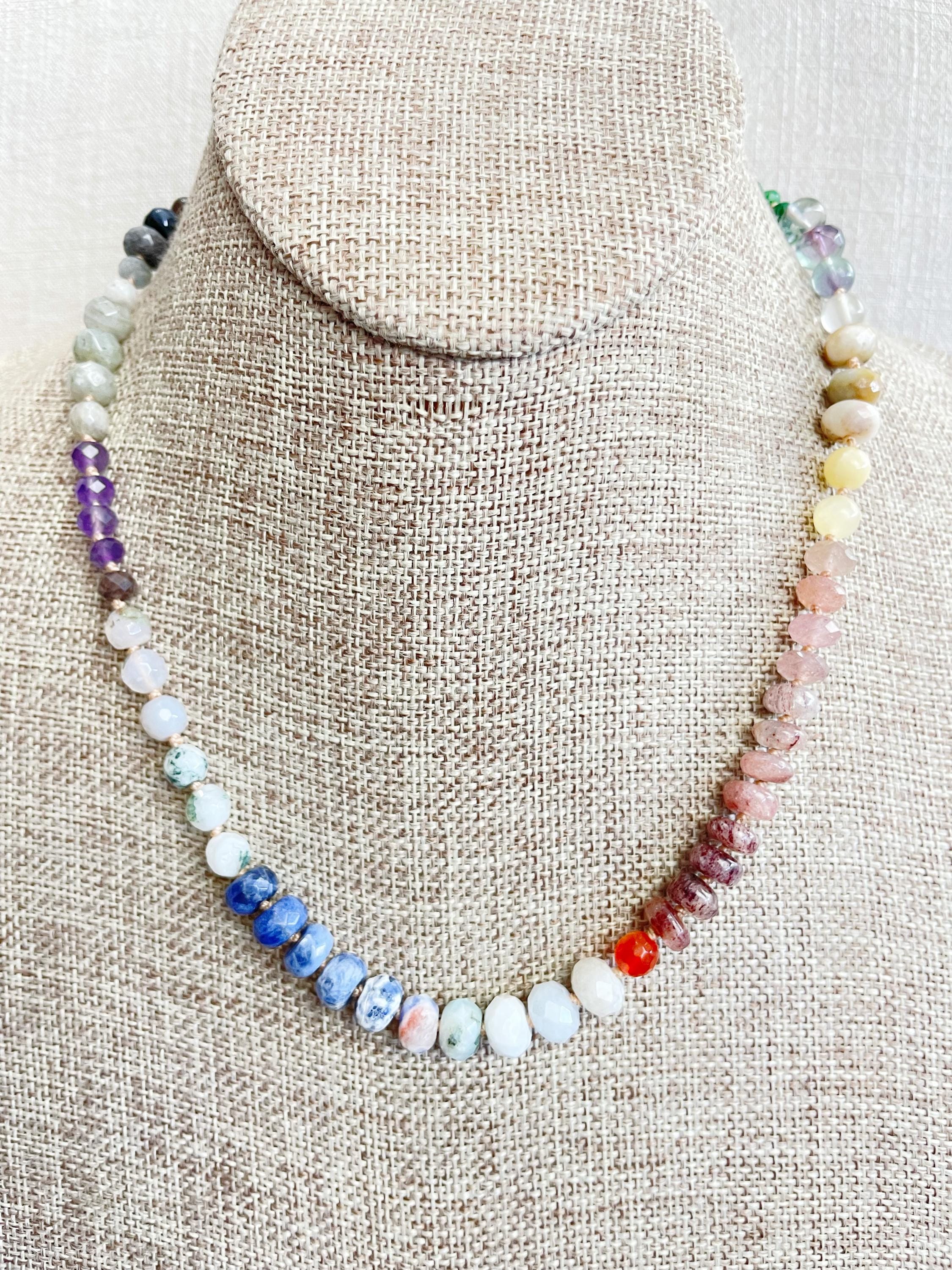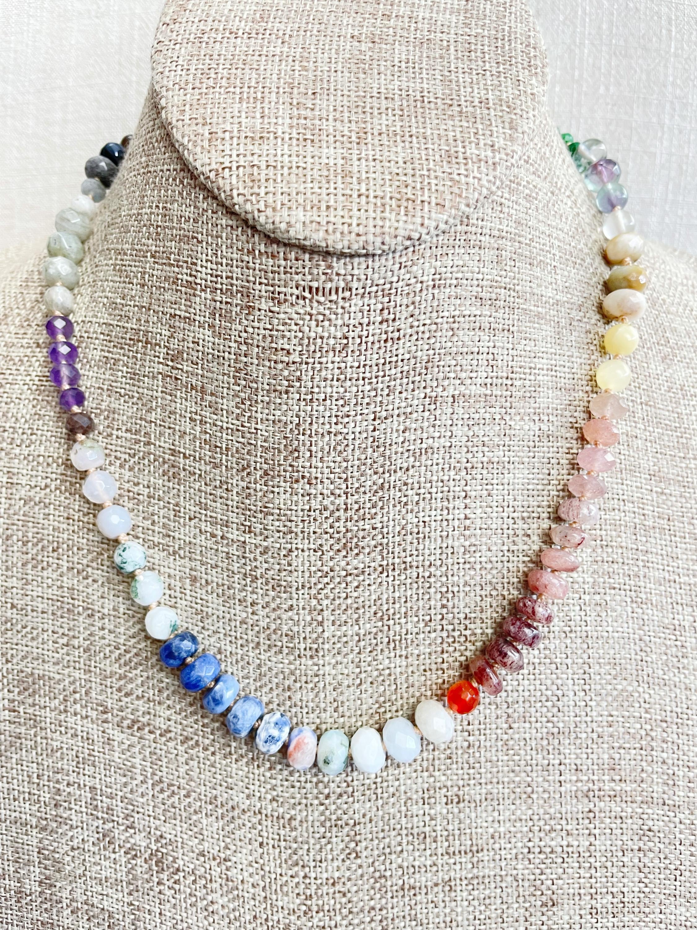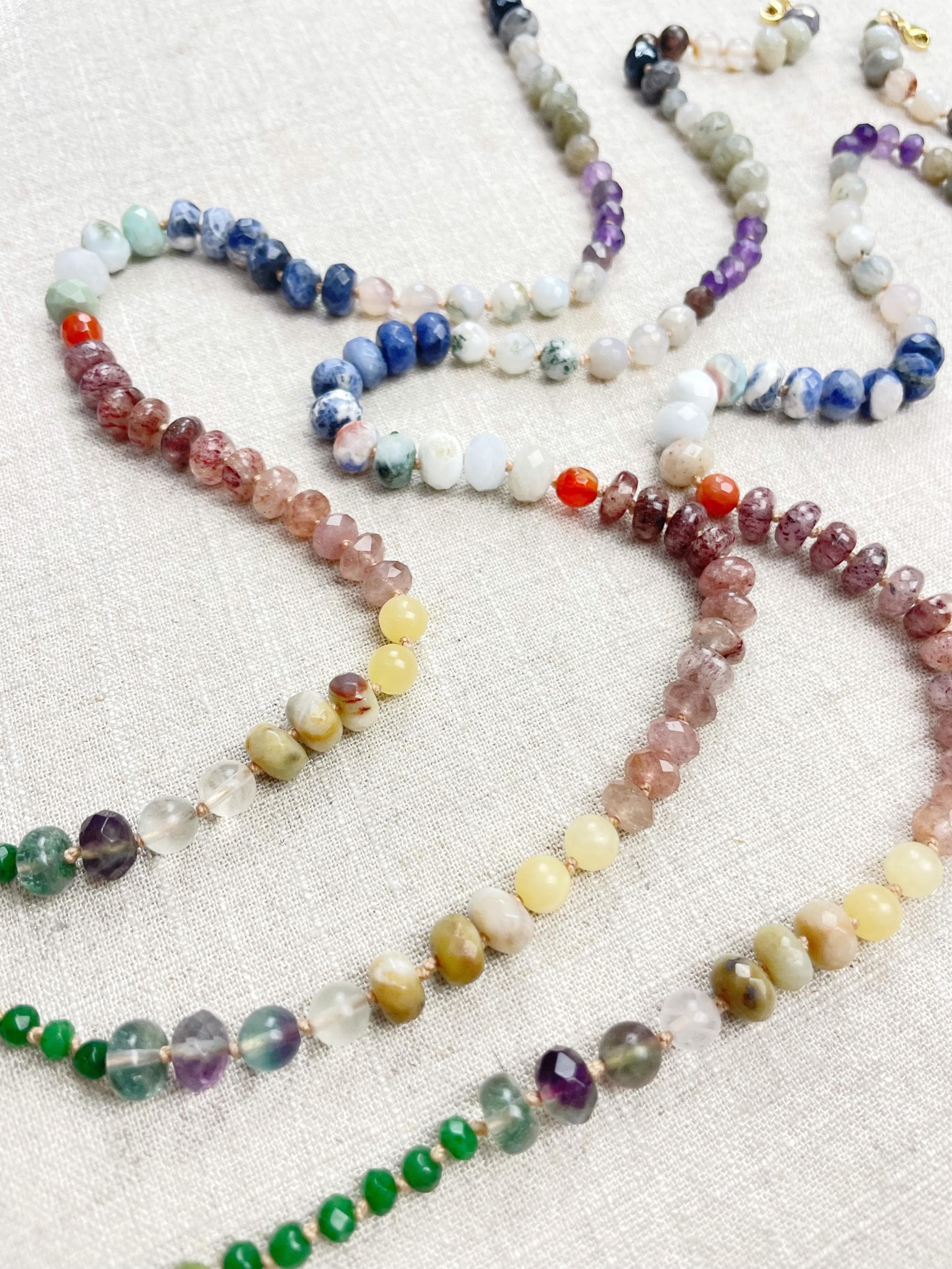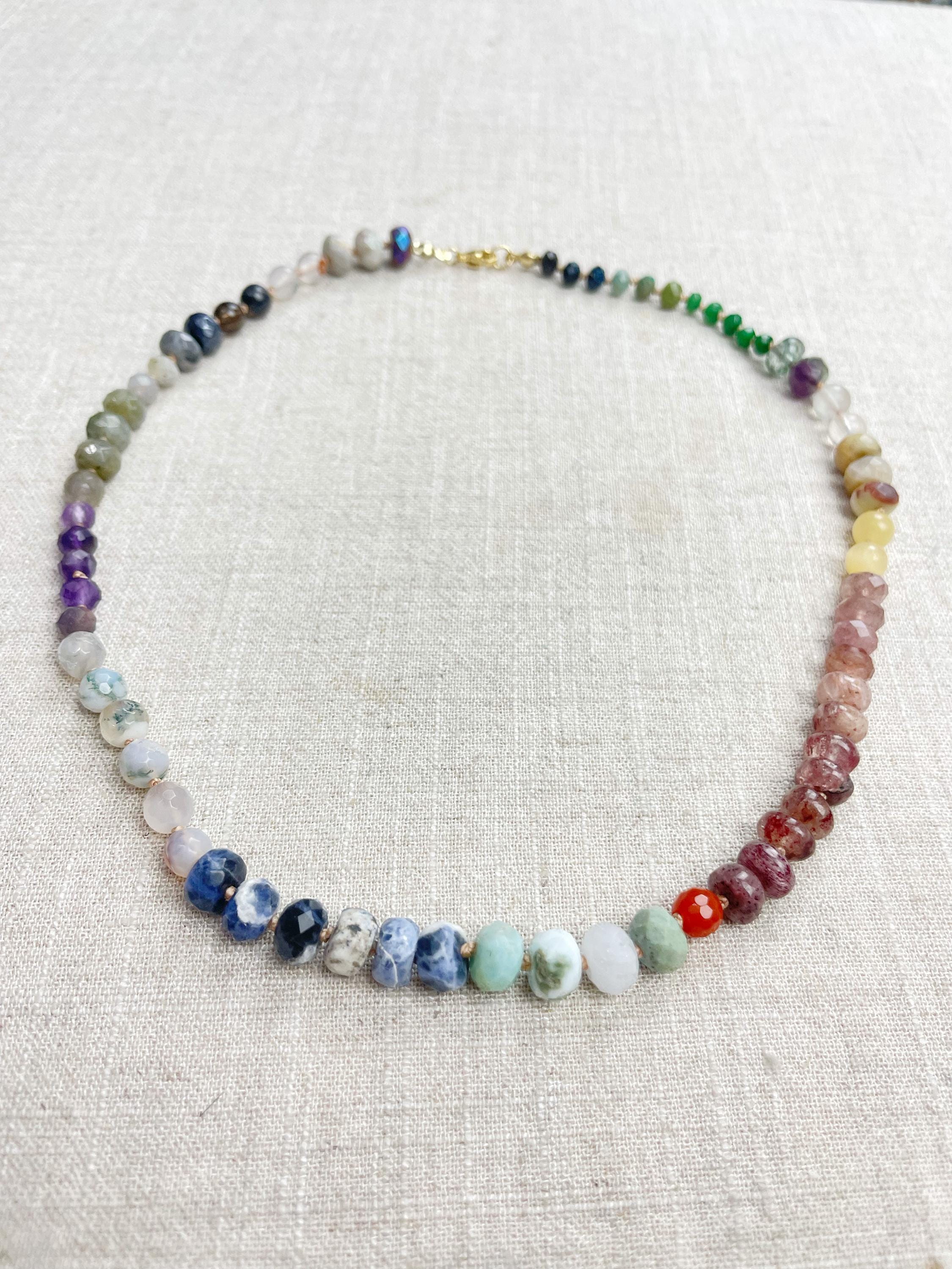 This necklace is made with gemstone beads. The beads range from 4mm to 8mm in size. The necklace includes: aura coated amazonite, agate, rhodonite, tigers eye, labradorite, amethyst, moss agate, sodalite, larimar, aquamarine, carnelian, strawberry quartz, fluorite, chlorite quartz, green jade, chrysocolla. The beads are strung on a nylon cording. The necklace is hand-knotted in between each bead. The necklace is finished off with a gold plated stainless steel clasp and logo charm.