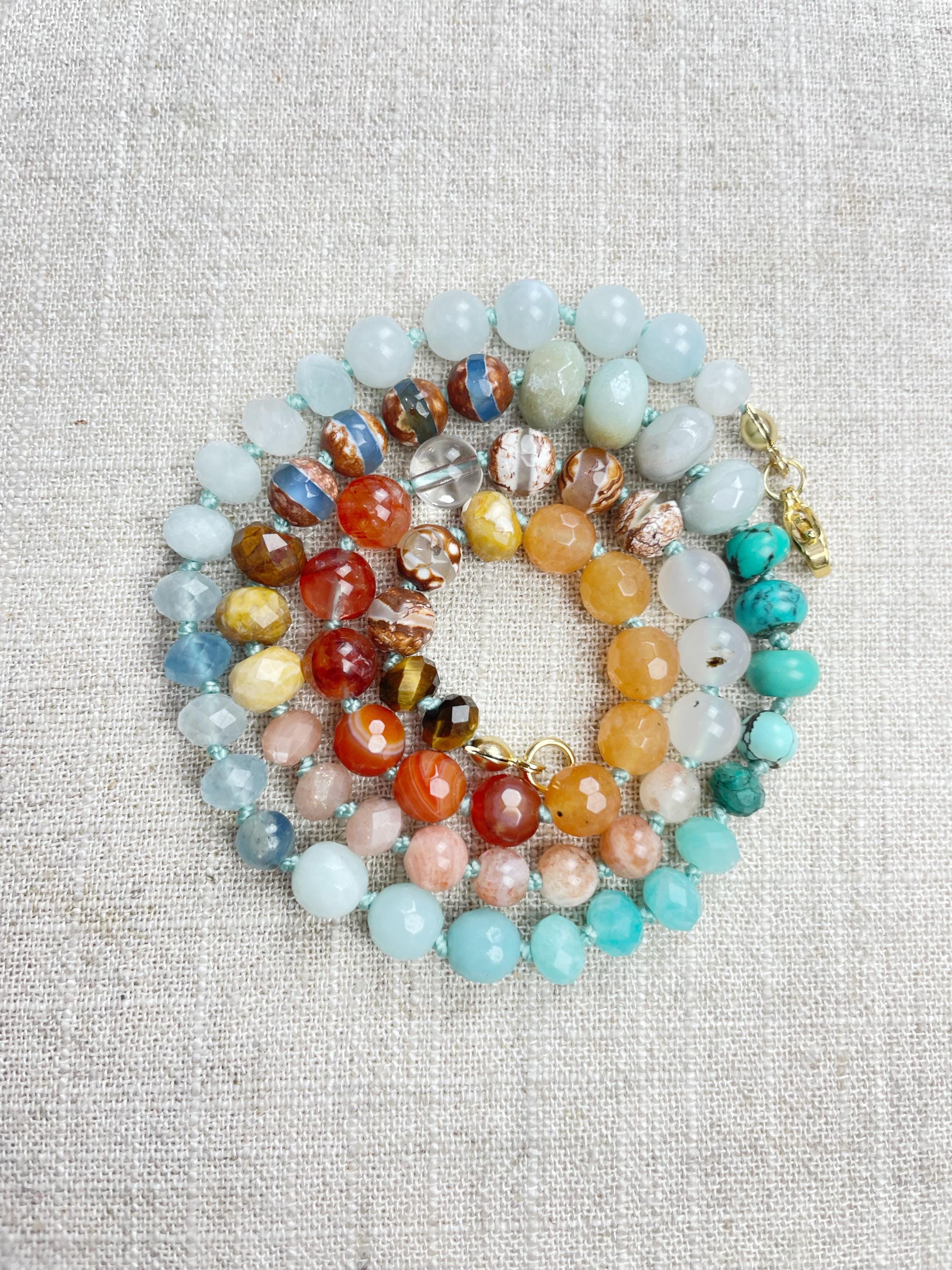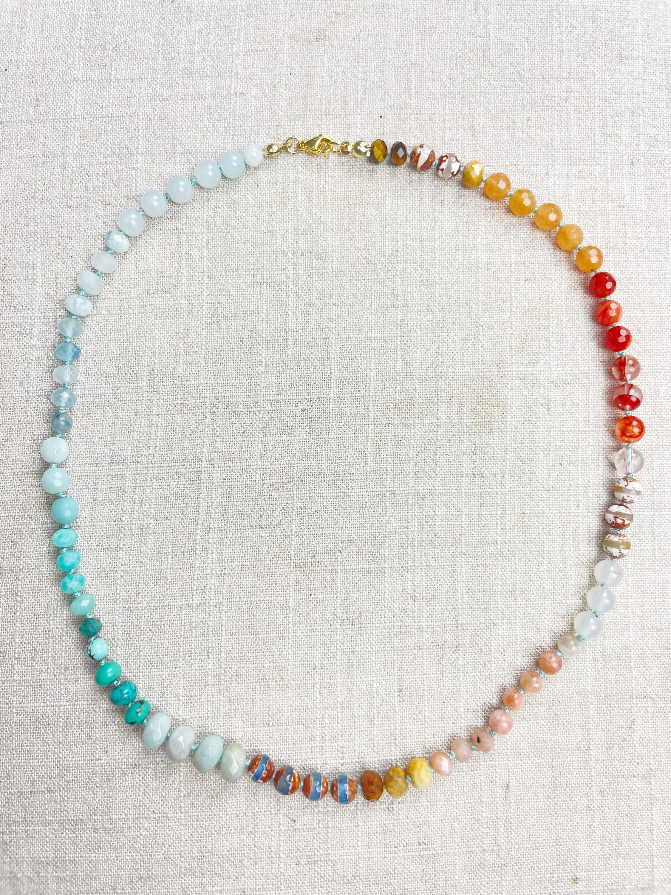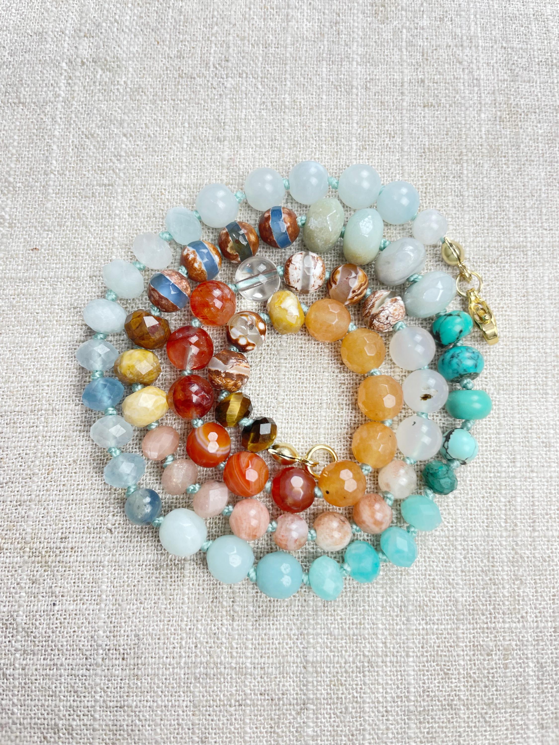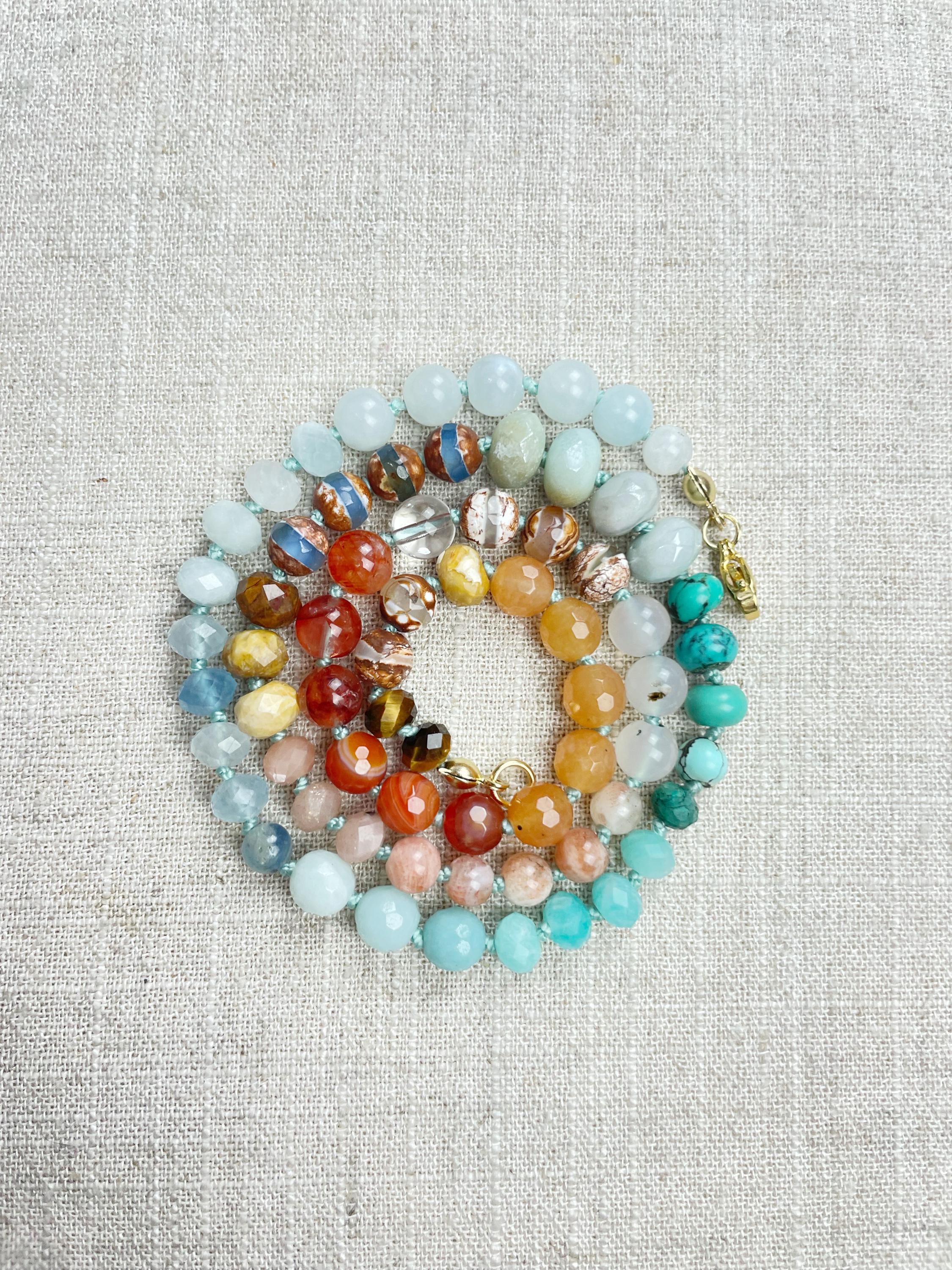 This necklace is made with gemstone beads. The beads range from 4mm to 8mm in size. The necklace includes: dyed jade, aquamarine, kyanite, amazonite, chrysocolla, turquoise, aura coated amazonite, tibetan agate, fossilized coral, sunstone, agatem fire quartz, carnelian, orange aventurine, tiger's eye. The beads are strung on a nylon cording. The necklace is hand-knotted in between each bead. The necklace is finished off with a gold plated stainless steel clasp and logo charm.