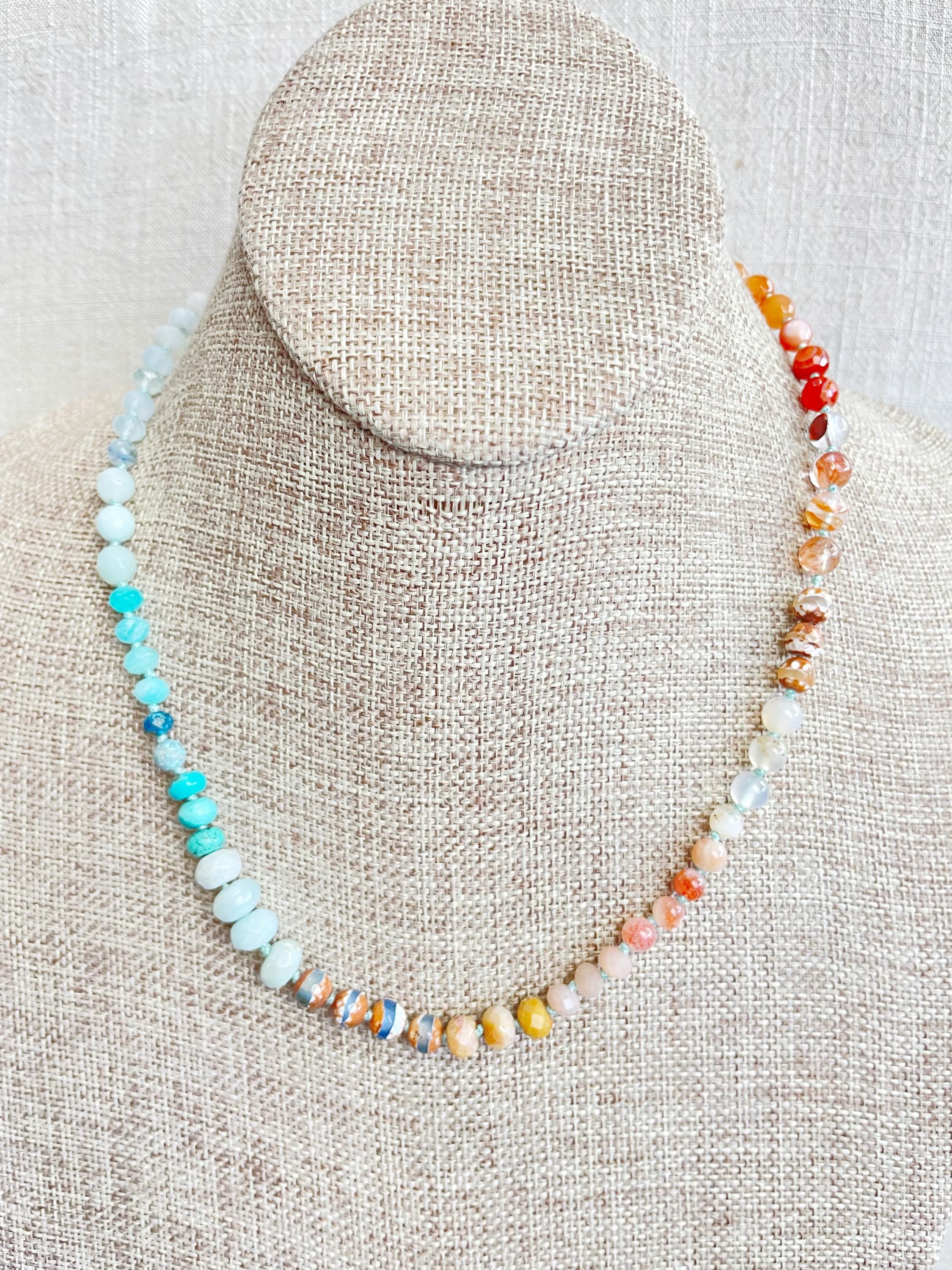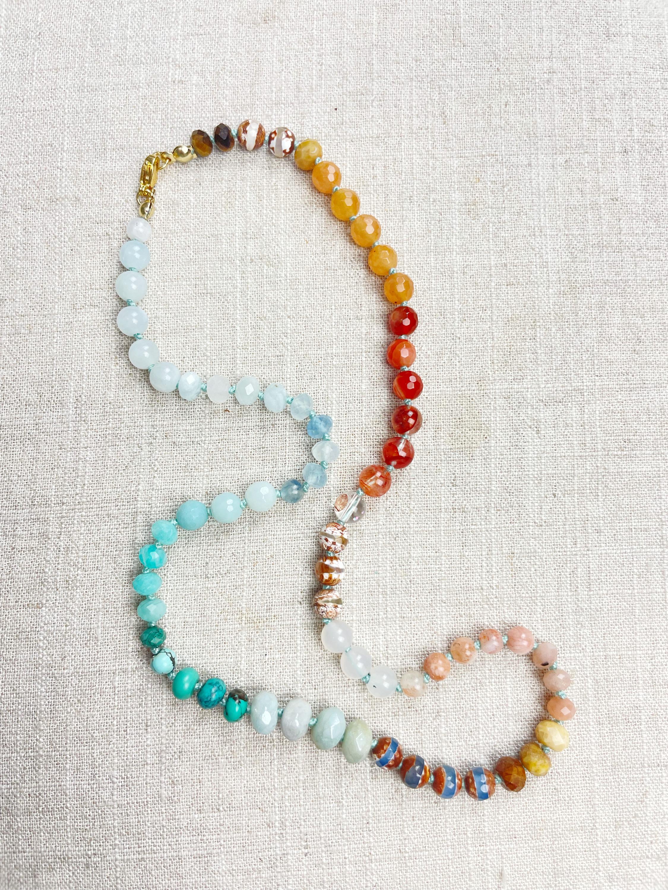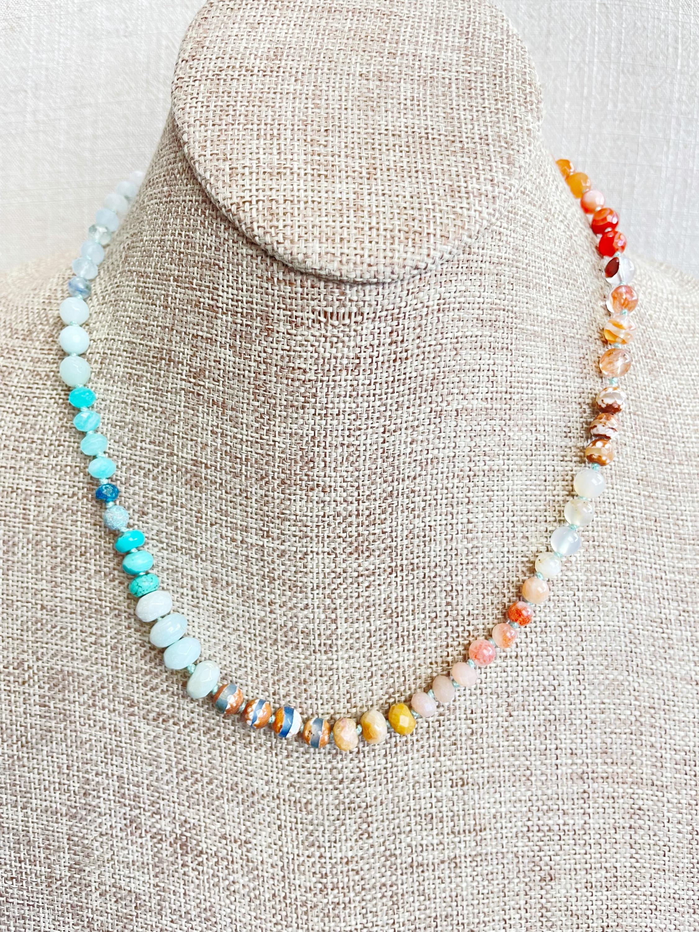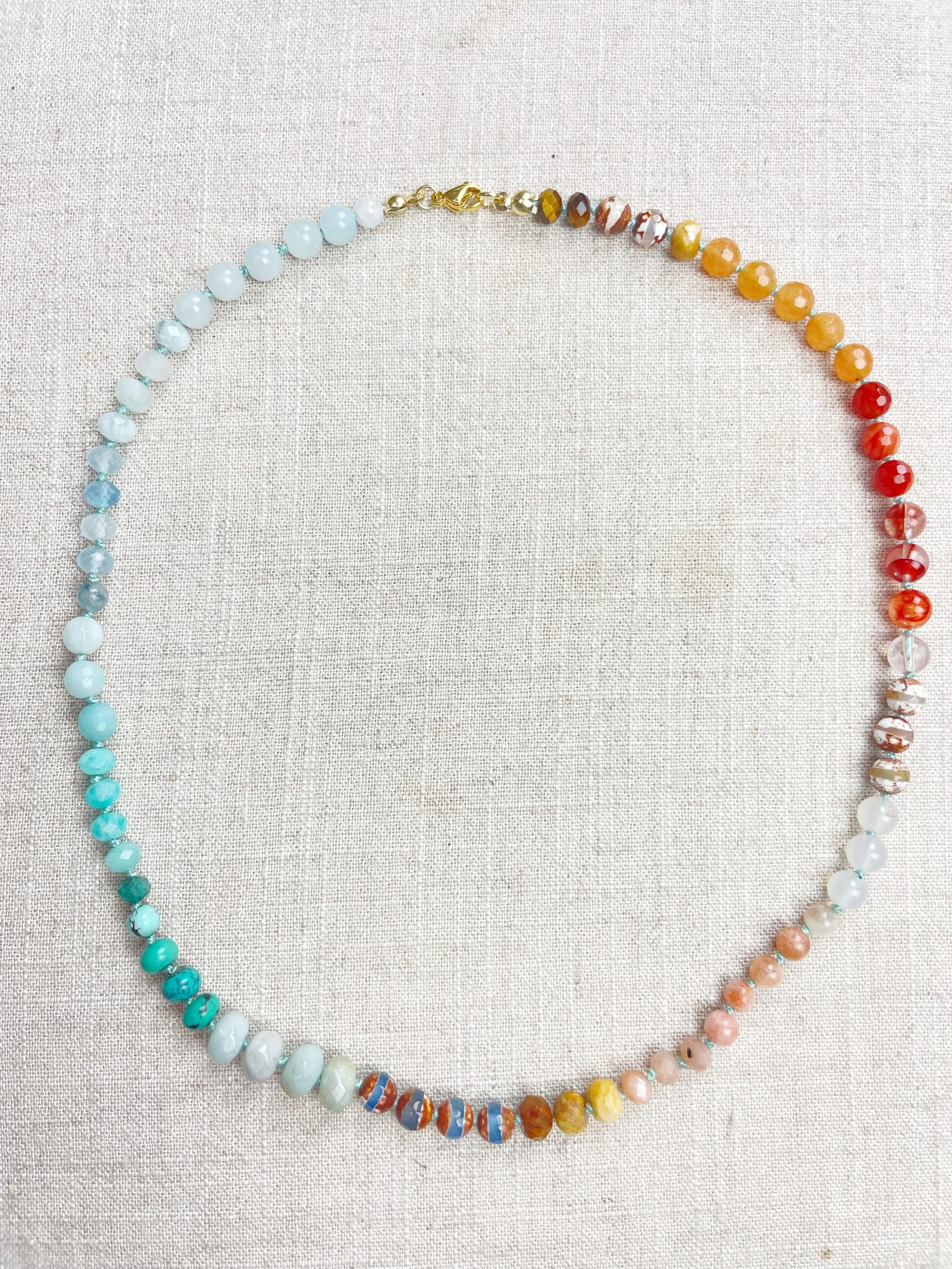 This necklace is made with gemstone beads. The beads range from 4mm to 8mm in size. The necklace includes: dyed jade, aquamarine, kyanite, amazonite, chrysocolla, turquoise, aura coated amazonite, tibetan agate, fossilized coral, sunstone, agatem fire quartz, carnelian, orange aventurine, tiger's eye. The beads are strung on a nylon cording. The necklace is hand-knotted in between each bead. The necklace is finished off with a gold plated stainless steel clasp and logo charm.