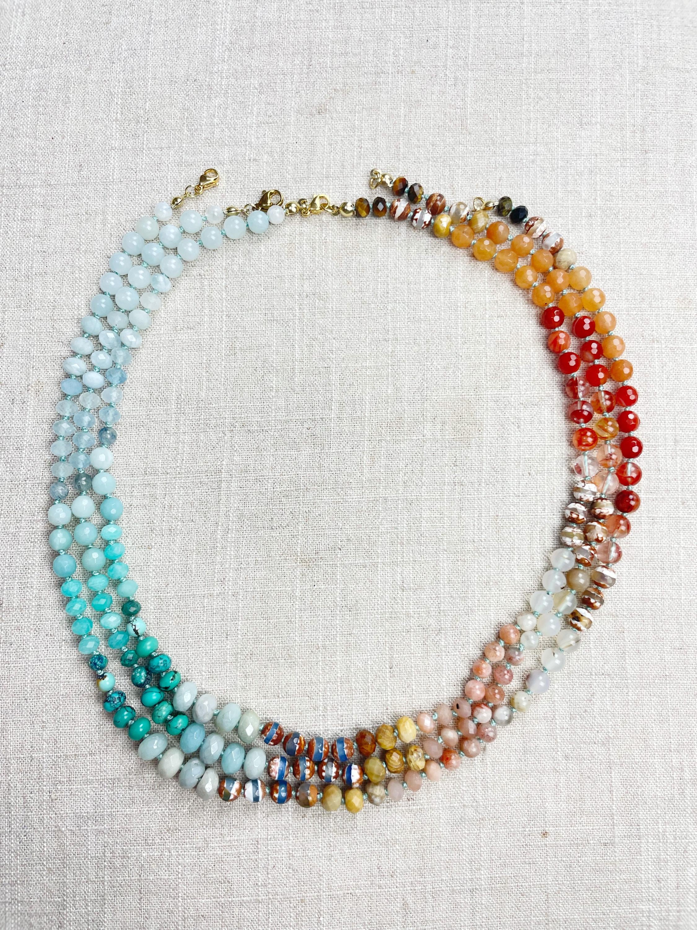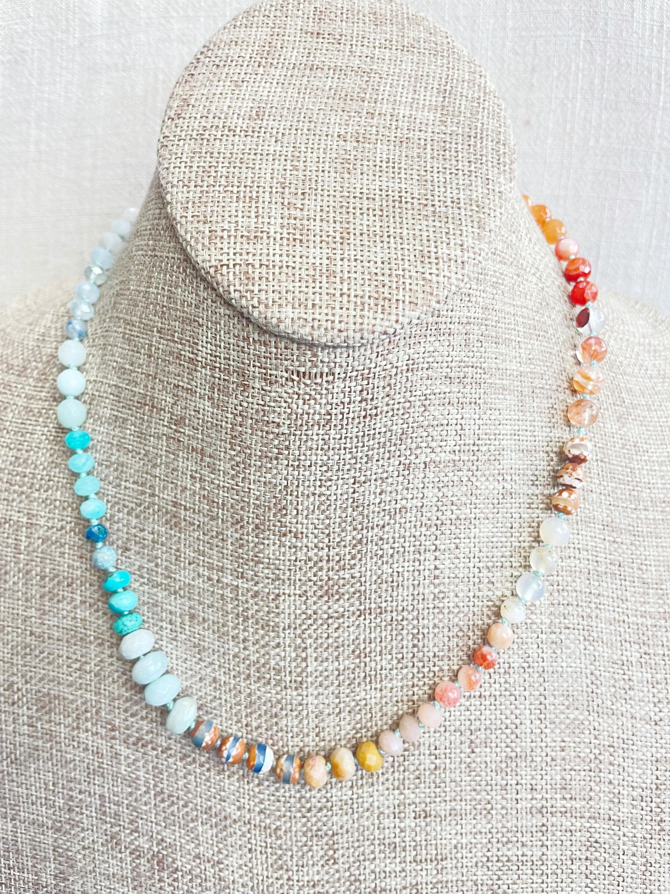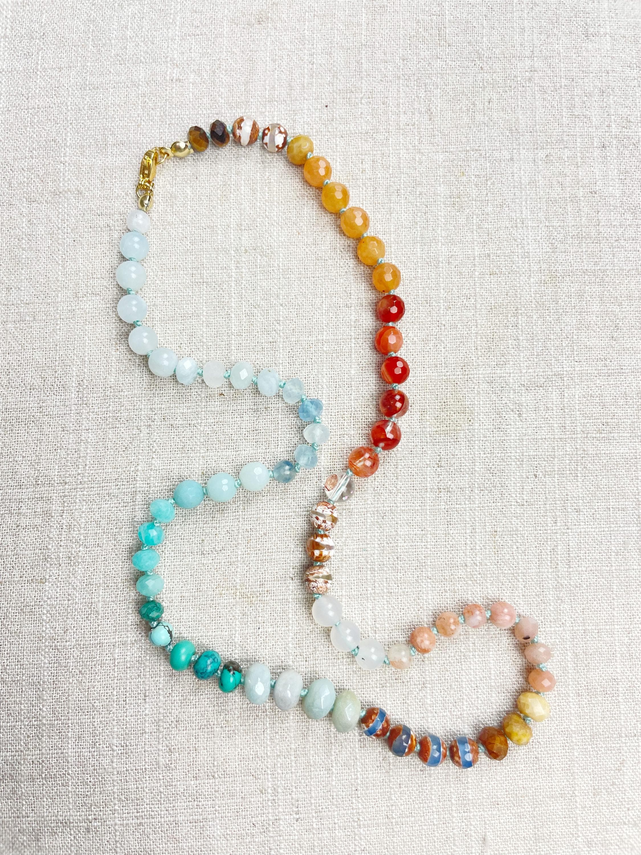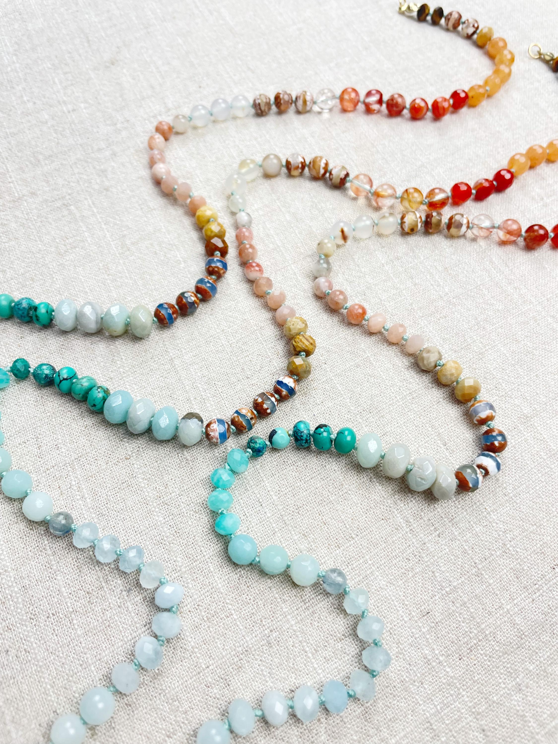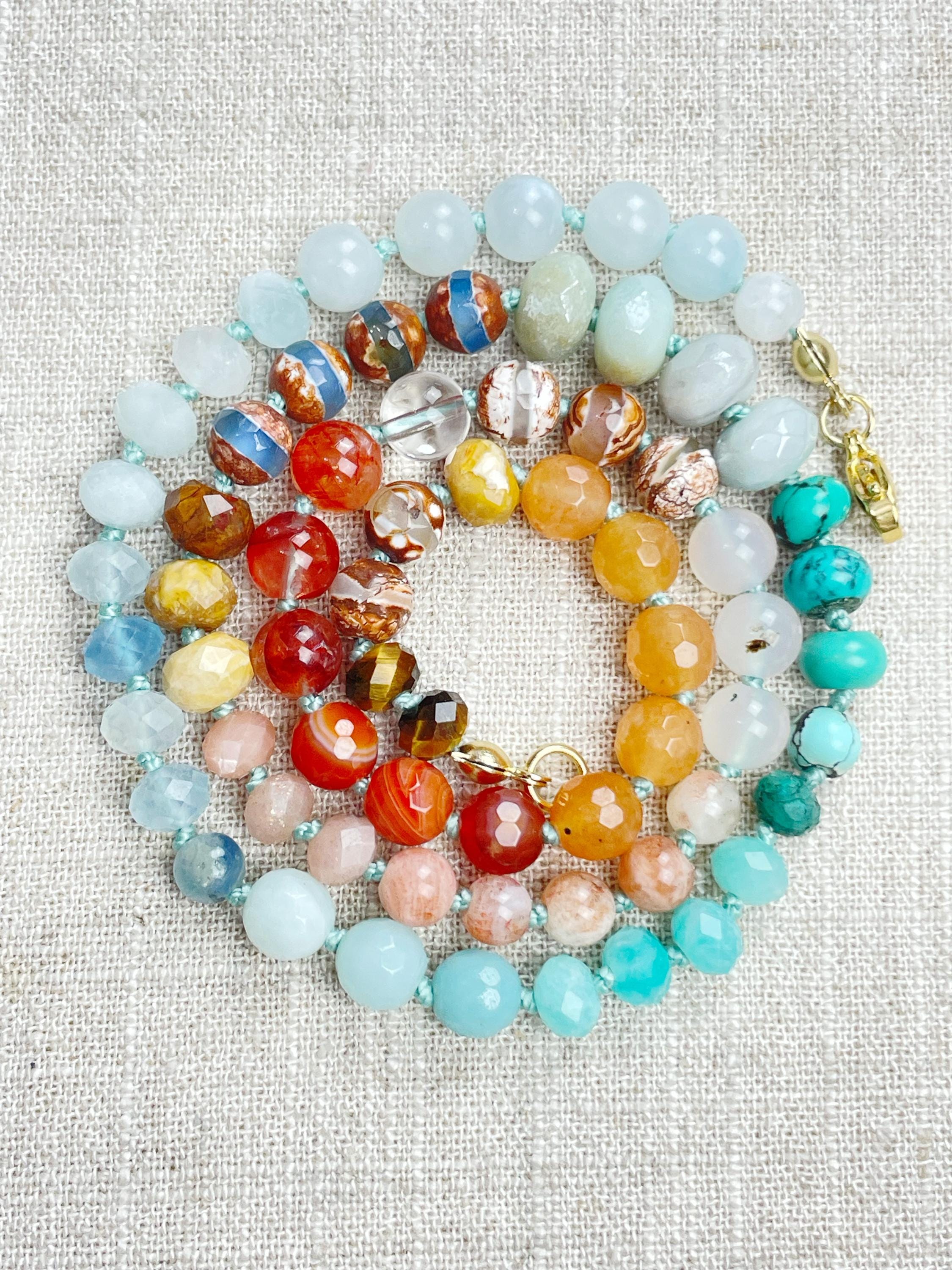 This necklace is made with gemstone beads. The beads range from 4mm to 8mm in size. The necklace includes: dyed jade, aquamarine, kyanite, amazonite, chrysocolla, turquoise, aura coated amazonite, tibetan agate, fossilized coral, sunstone, agatem fire quartz, carnelian, orange aventurine, tiger's eye. The beads are strung on a nylon cording. The necklace is hand-knotted in between each bead. The necklace is finished off with a gold plated stainless steel clasp and logo charm.