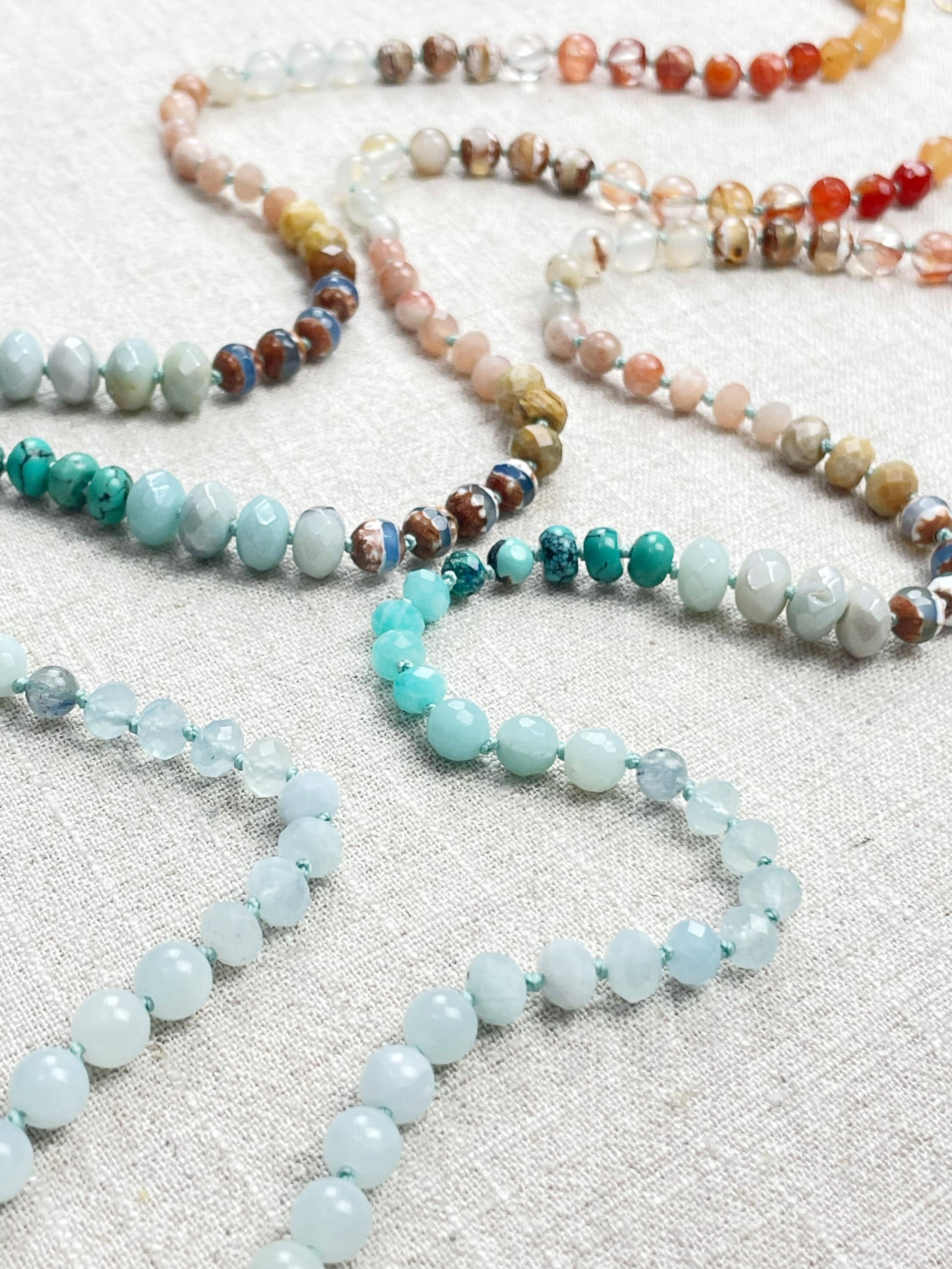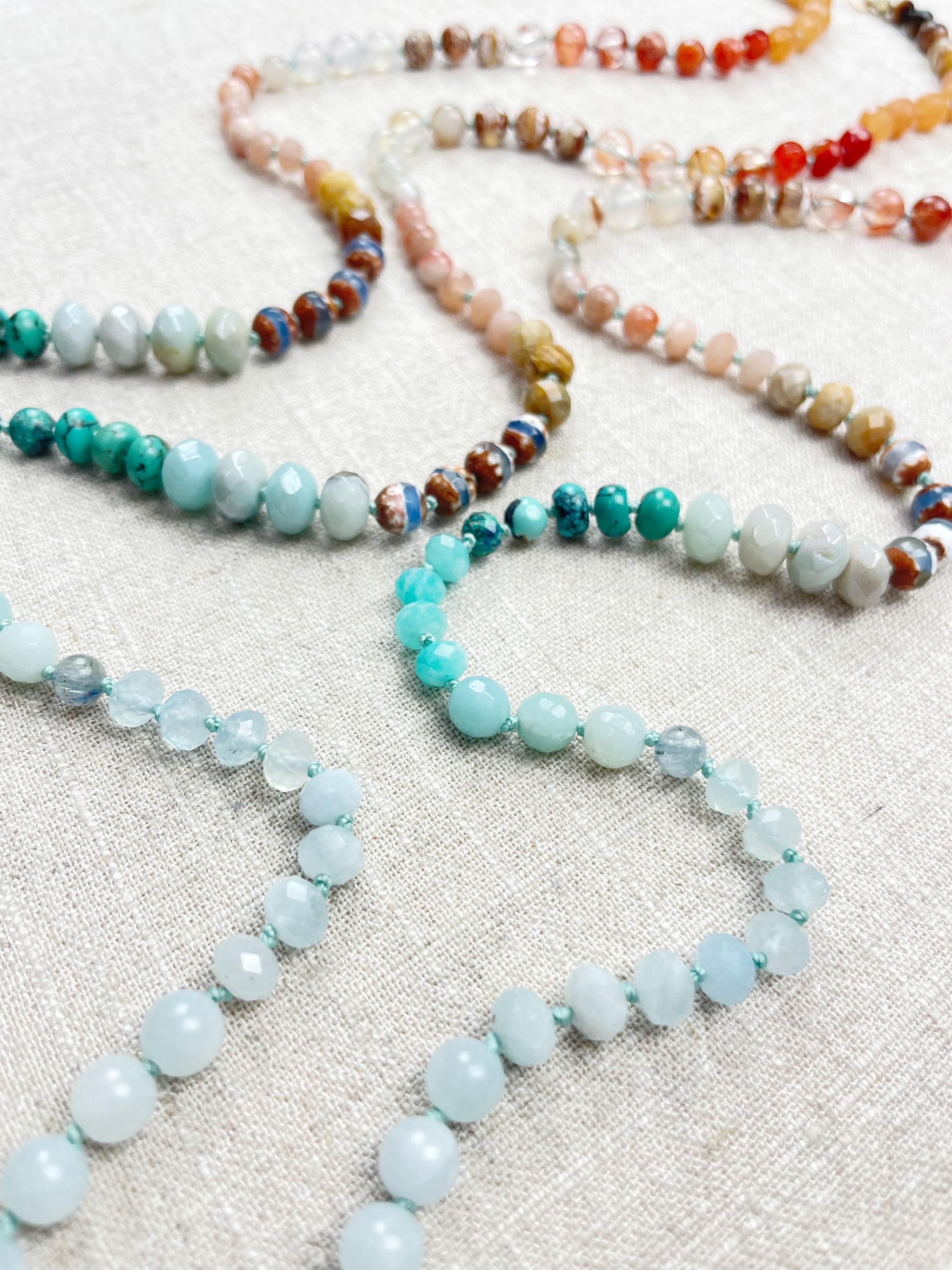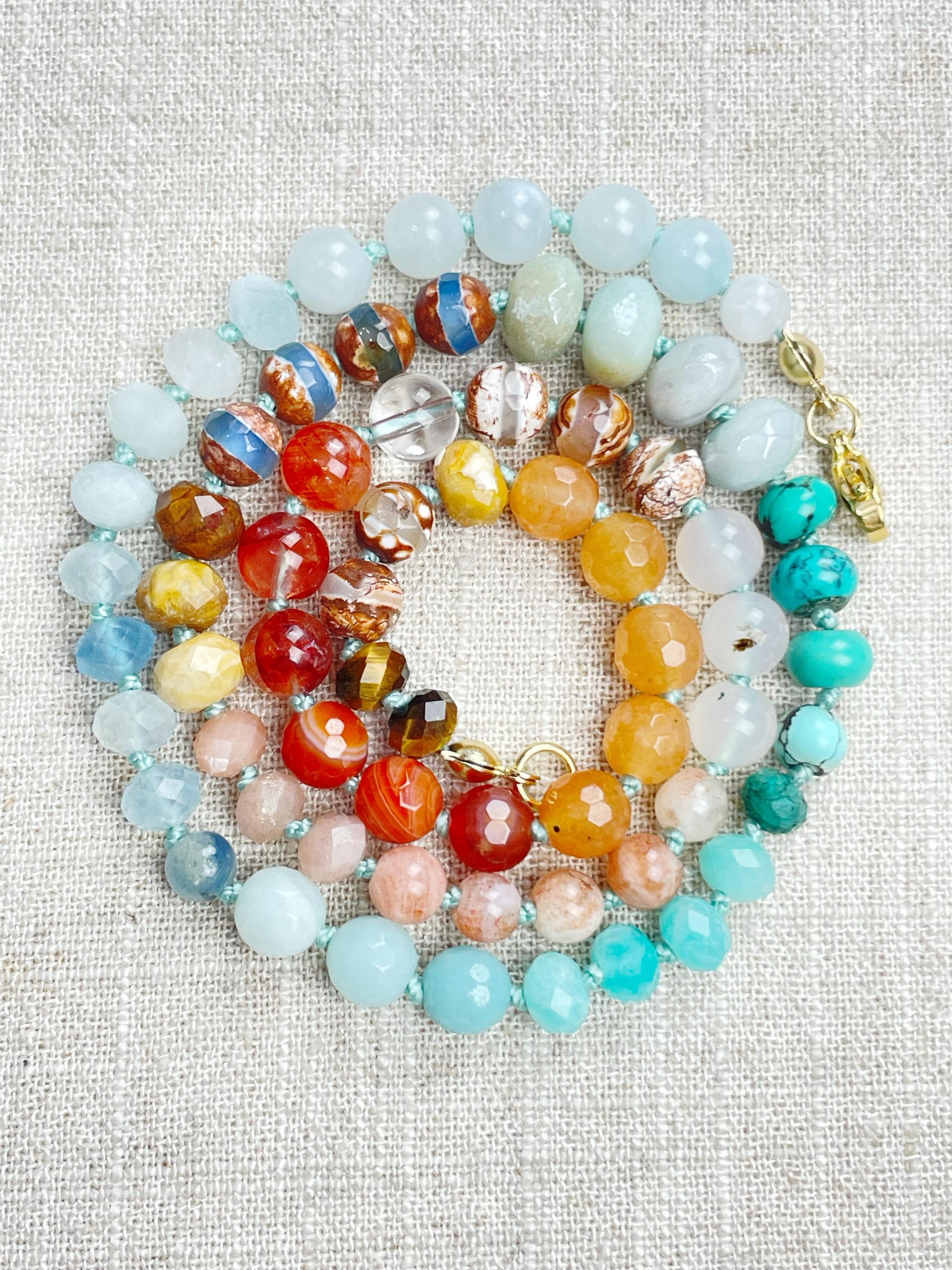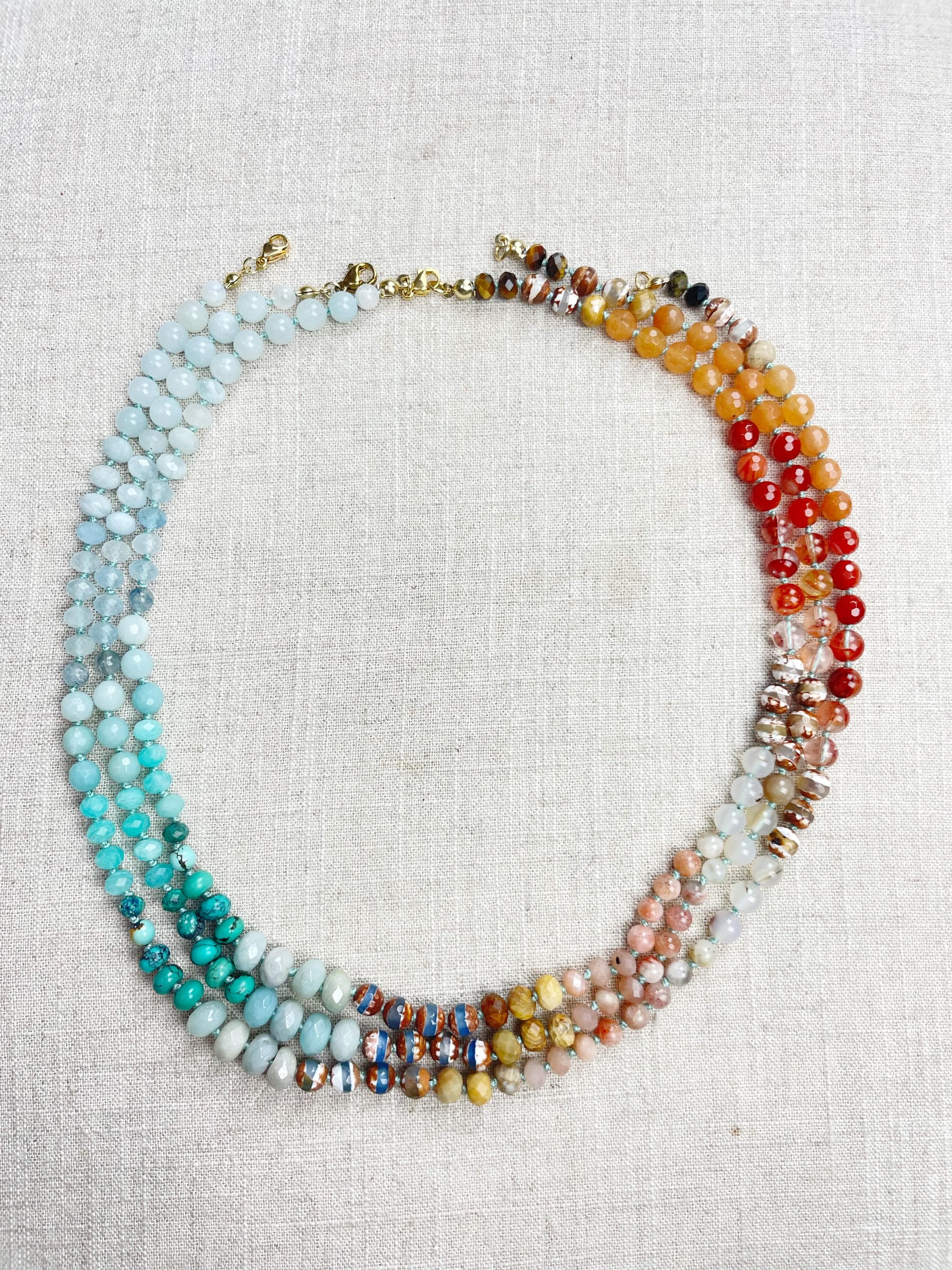 This necklace is made with gemstone beads. The beads range from 4mm to 8mm in size. The necklace includes: dyed jade, aquamarine, kyanite, amazonite, chrysocolla, turquoise, aura coated amazonite, tibetan agate, fossilized coral, sunstone, agatem fire quartz, carnelian, orange aventurine, tiger's eye. The beads are strung on a nylon cording. The necklace is hand-knotted in between each bead. The necklace is finished off with a gold plated stainless steel clasp and logo charm.