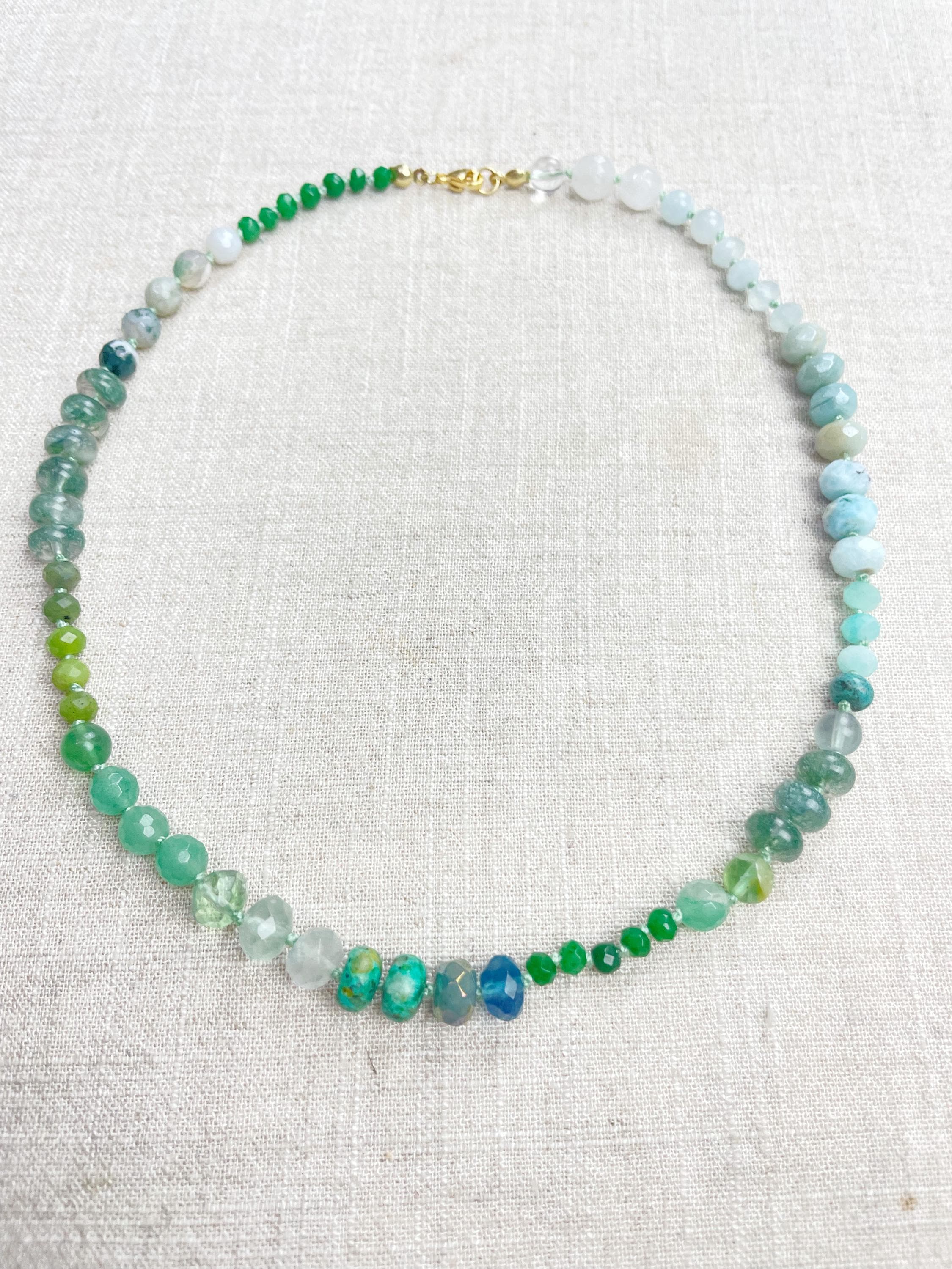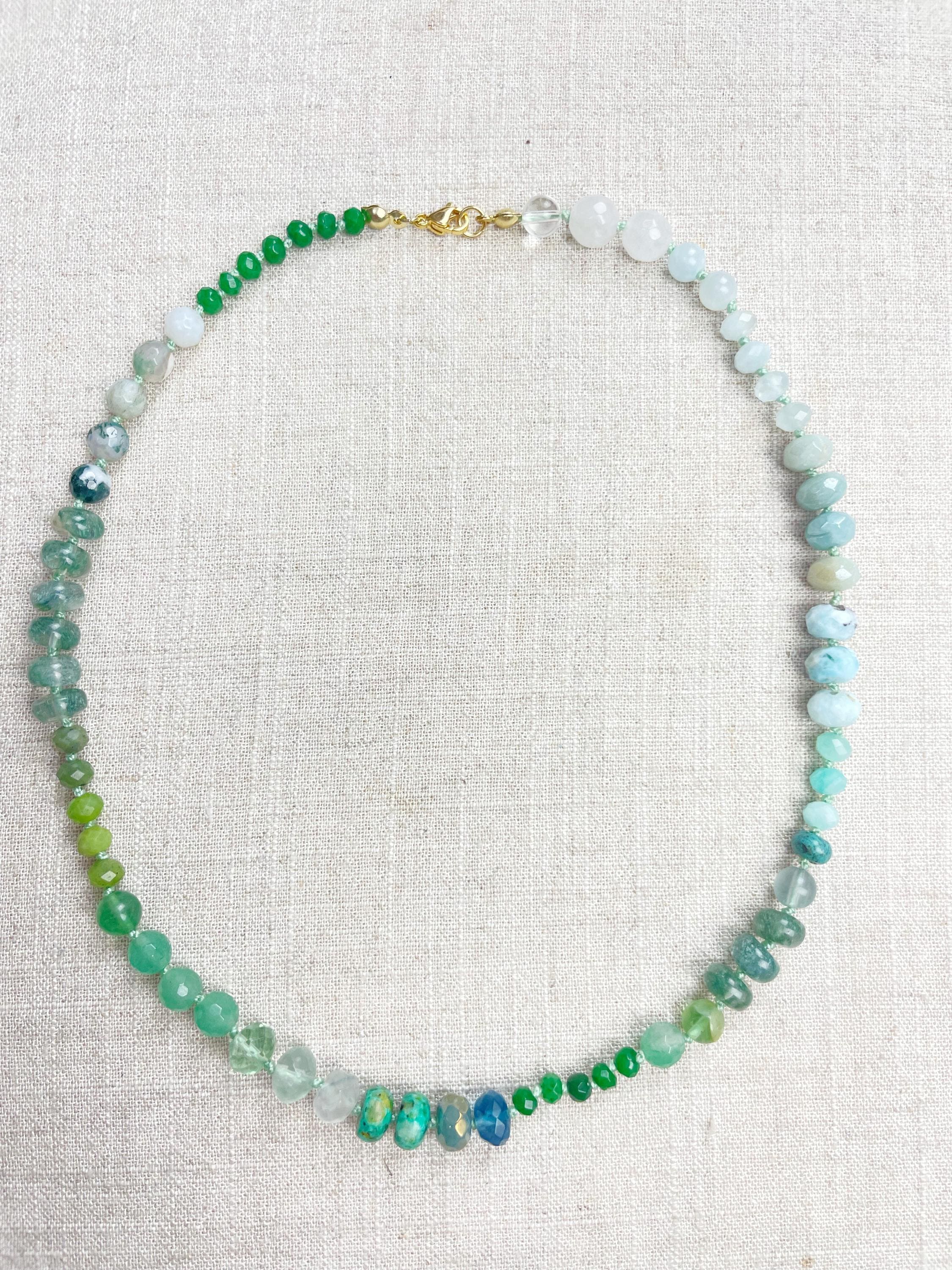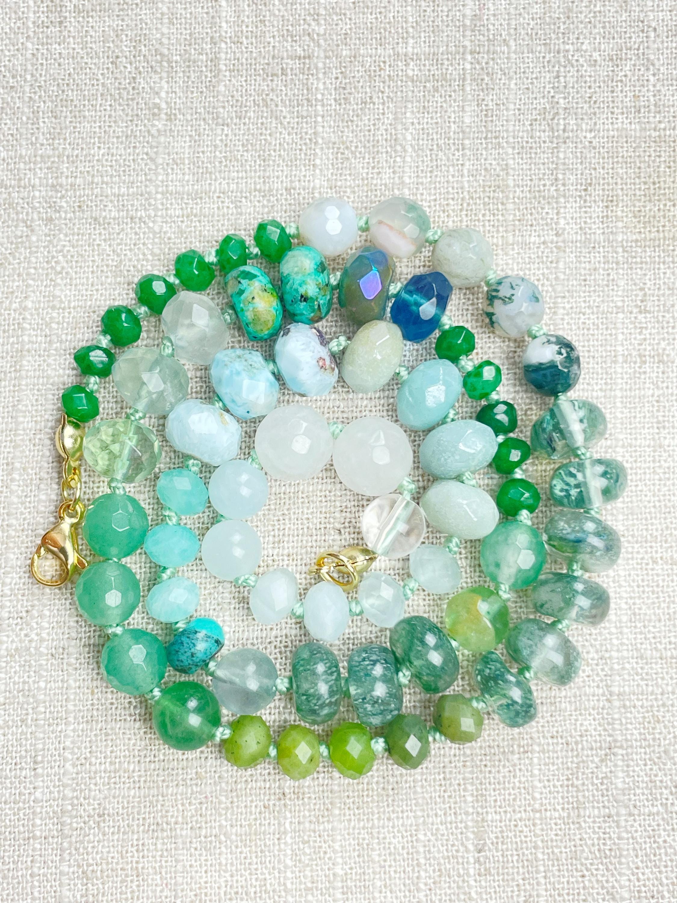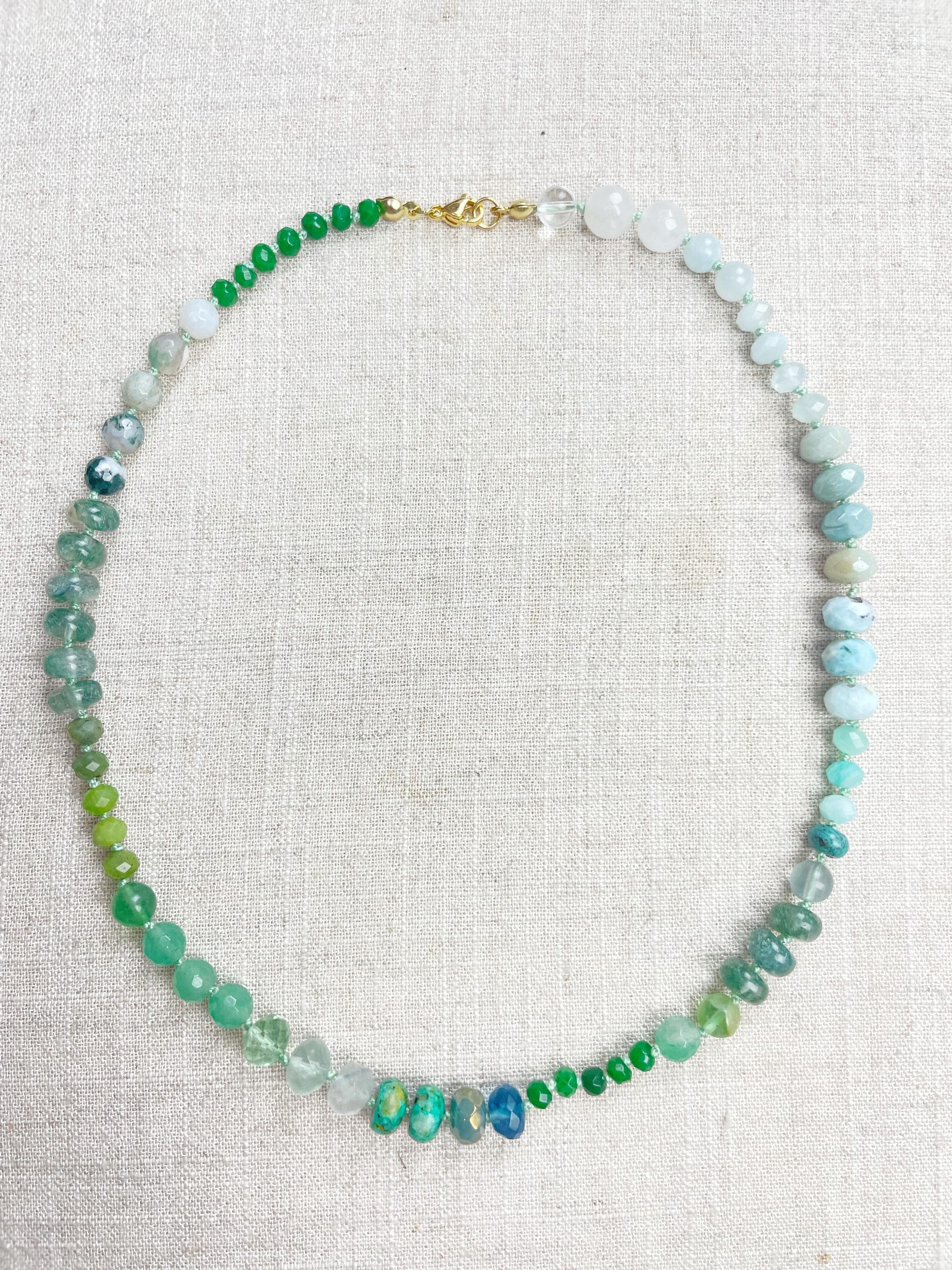 This necklace is made with gemstone beads. The beads range from 4mm to 8mm in size. The necklace includes: dyed jade, moss agate, chlorite quartz, jadeite, fluorite, green avenurine, african turquoise, aura coated amazonite, turquoise, aquamarine, larimar, and clear quartz. The beads are strung on a nylon cording. The necklace is hand-knotted in between each bead. The necklace is finished off with a gold plated stainless steel clasp and logo charm.