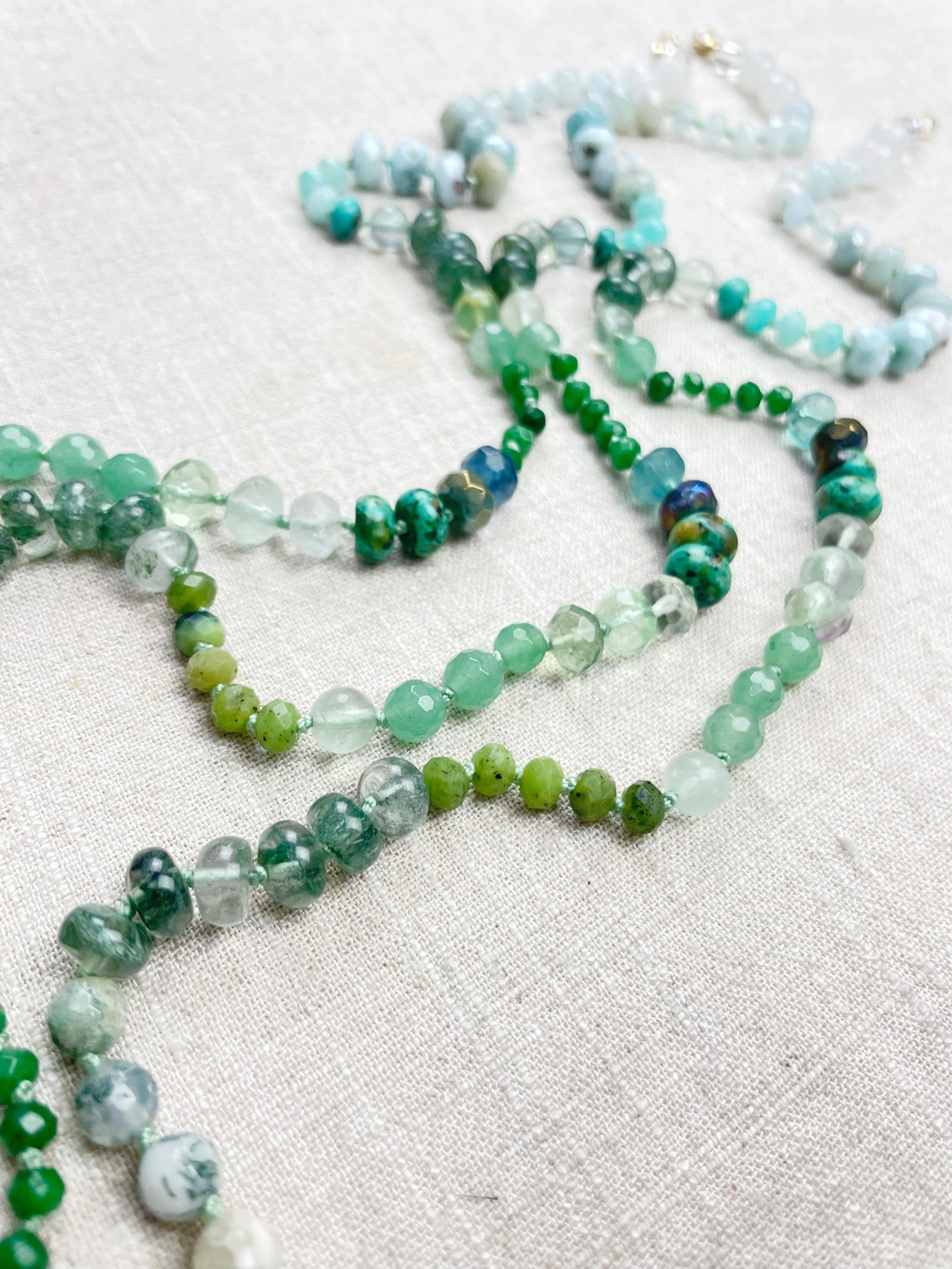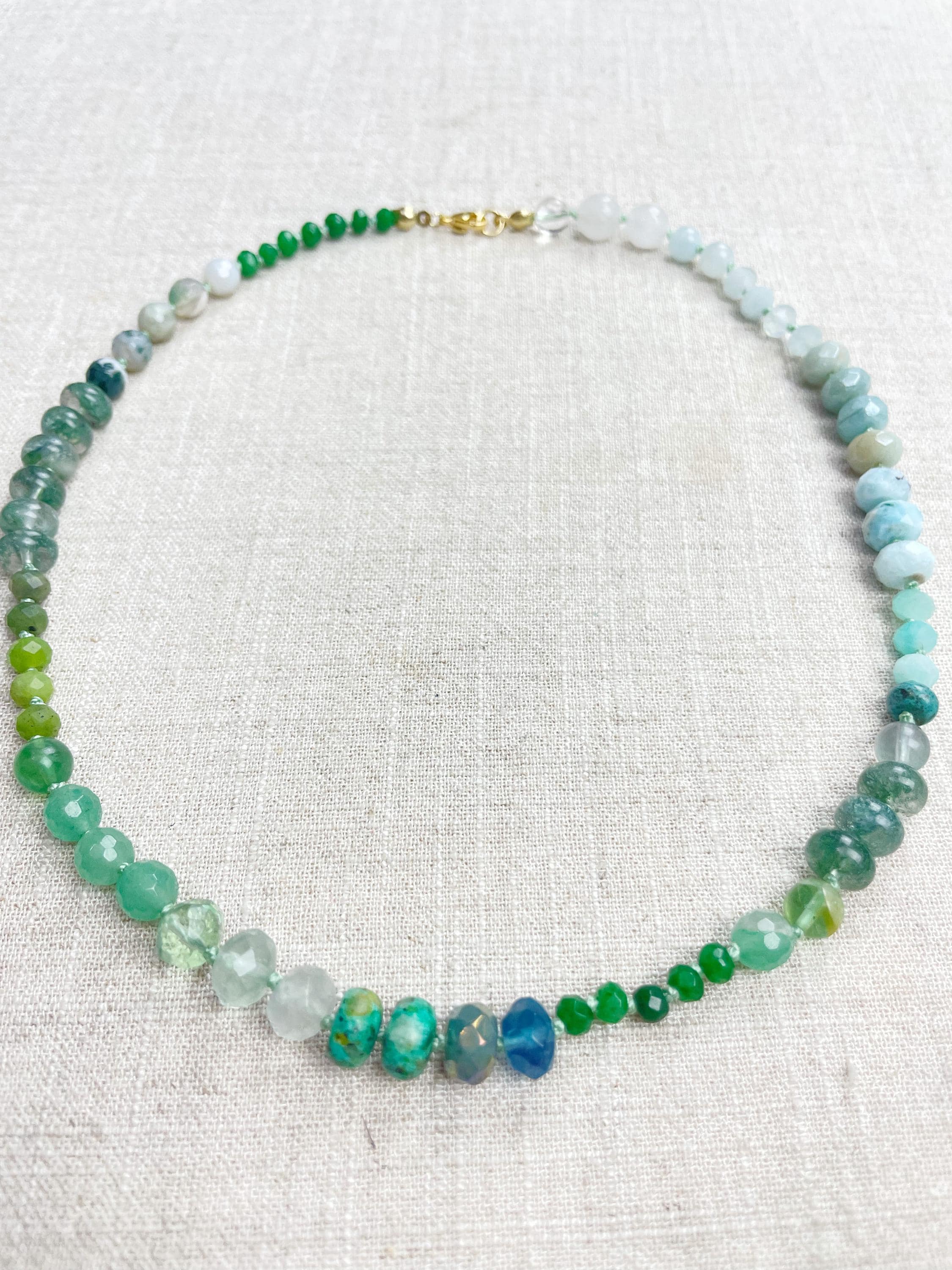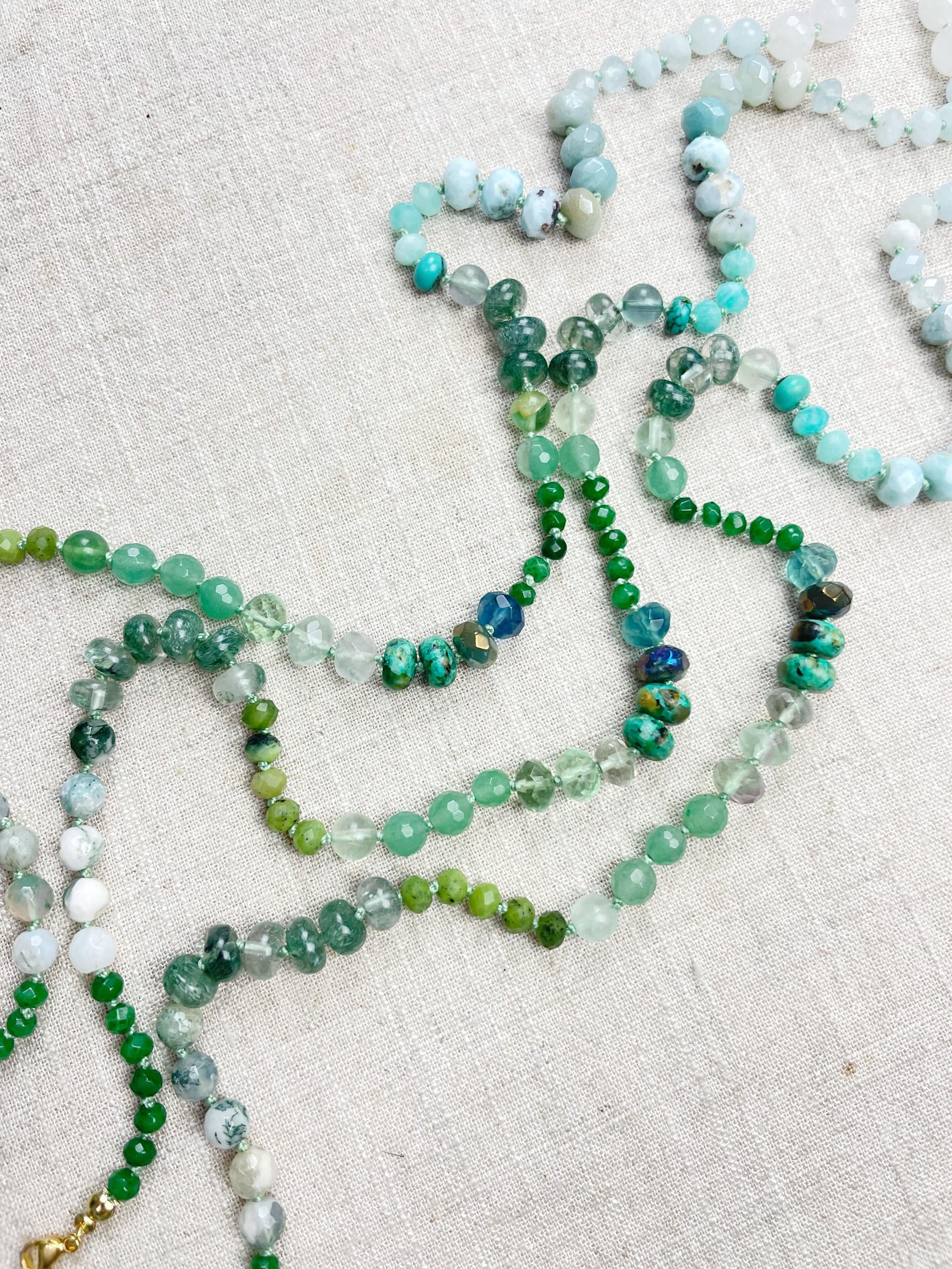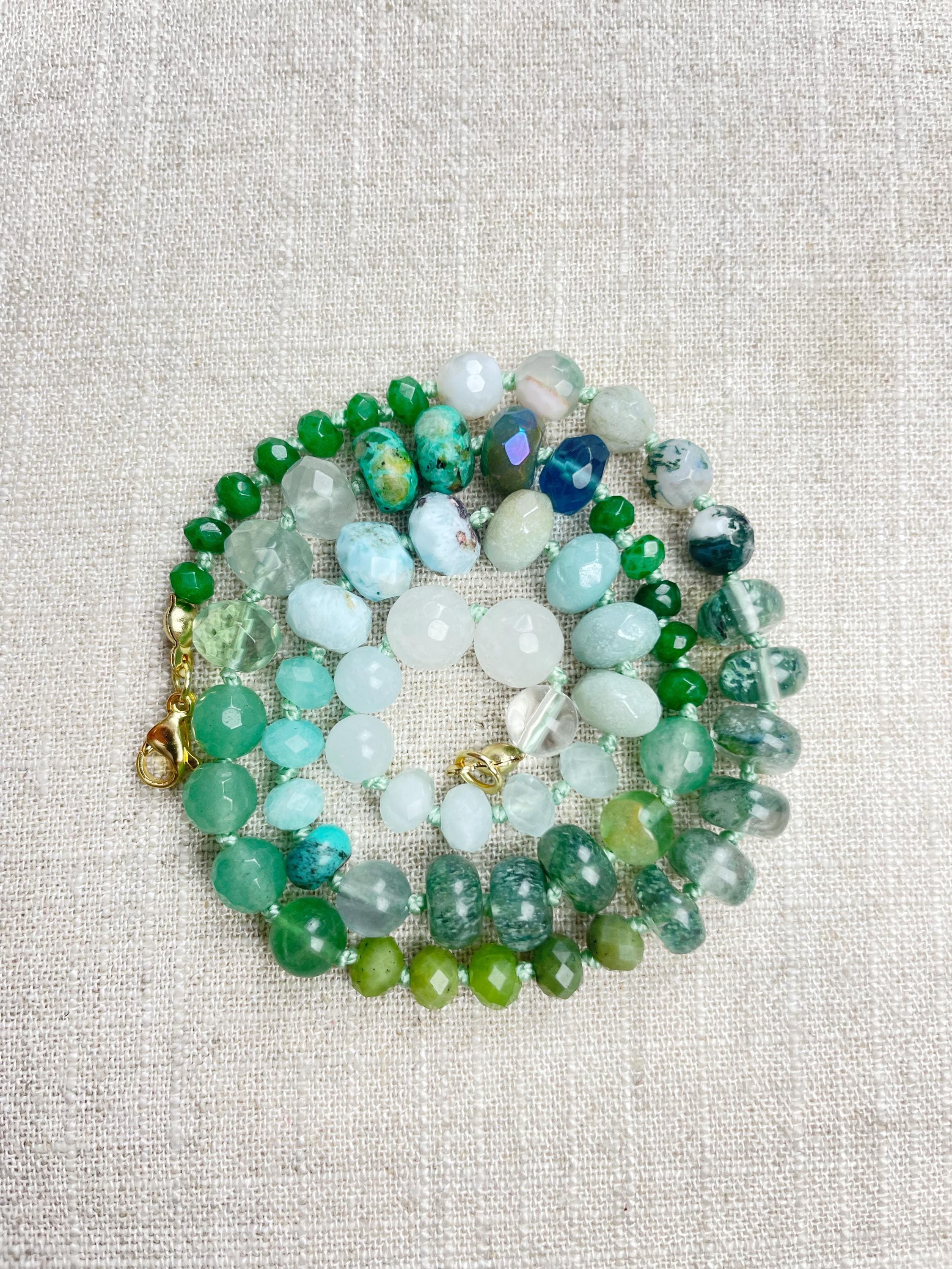This necklace is made with gemstone beads. The beads range from 4mm to 8mm in size. The necklace includes: dyed jade, moss agate, chlorite quartz, jadeite, fluorite, green avenurine, african turquoise, aura coated amazonite, turquoise, aquamarine, larimar, and clear quartz. The beads are strung on a nylon cording. The necklace is hand-knotted in between each bead. The necklace is finished off with a gold plated stainless steel clasp and logo charm.