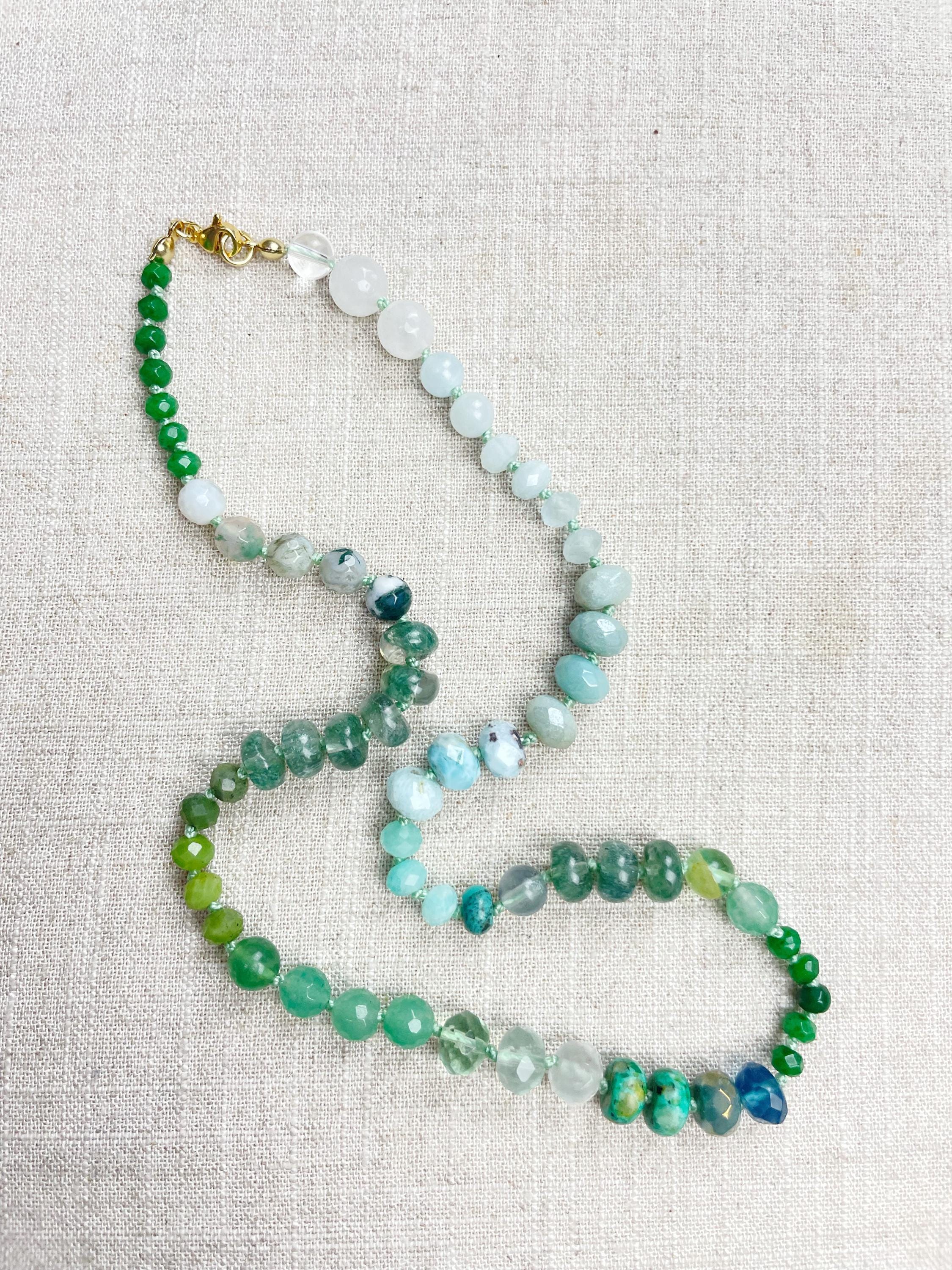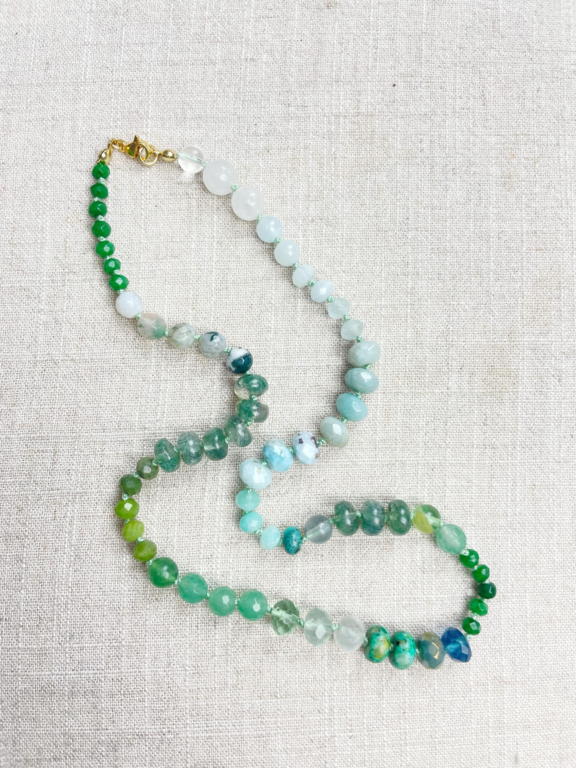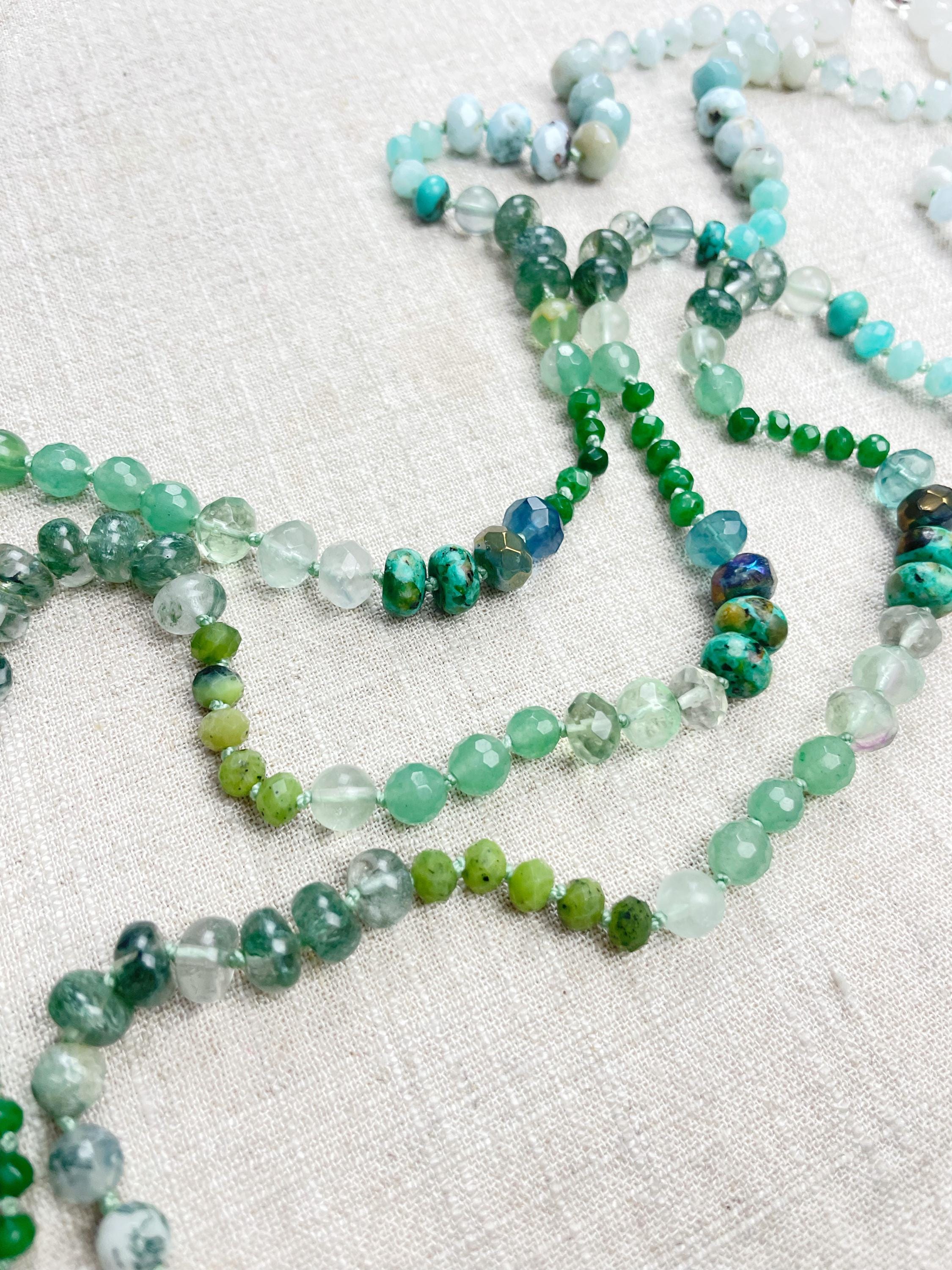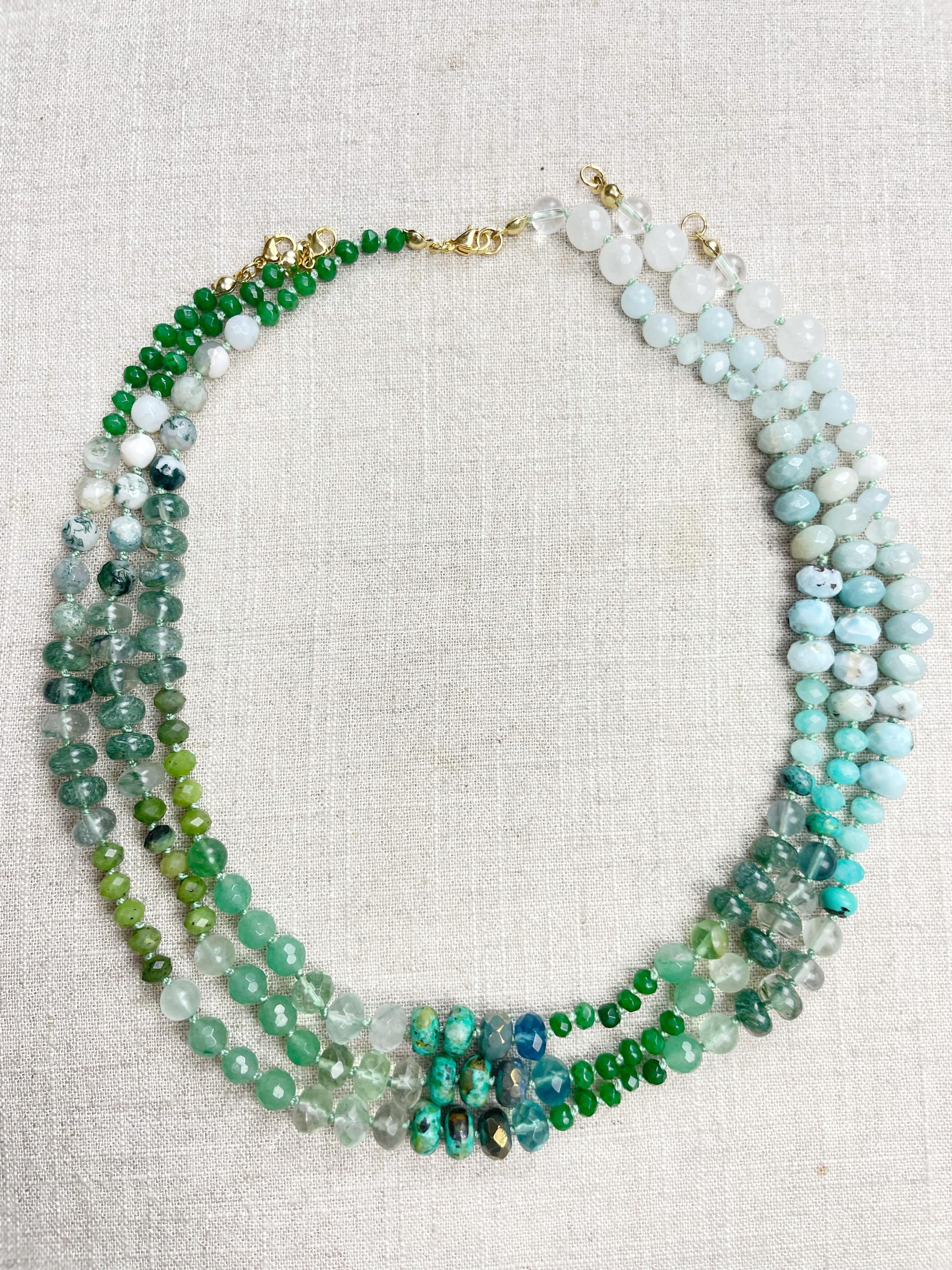 This necklace is made with gemstone beads. The beads range from 4mm to 8mm in size. The necklace includes: dyed jade, moss agate, chlorite quartz, jadeite, fluorite, green avenurine, african turquoise, aura coated amazonite, turquoise, aquamarine, larimar, and clear quartz. The beads are strung on a nylon cording. The necklace is hand-knotted in between each bead. The necklace is finished off with a gold plated stainless steel clasp and logo charm.