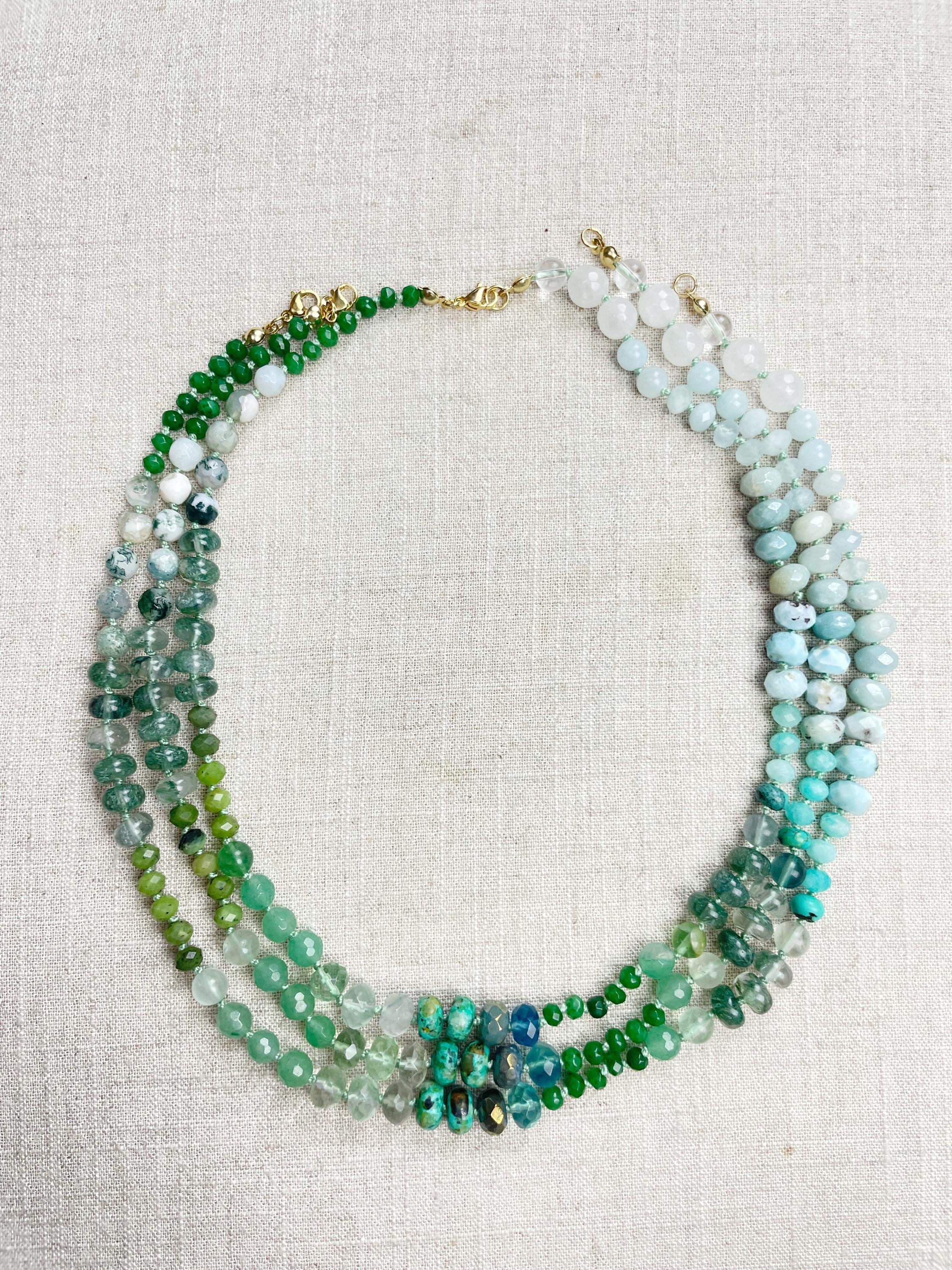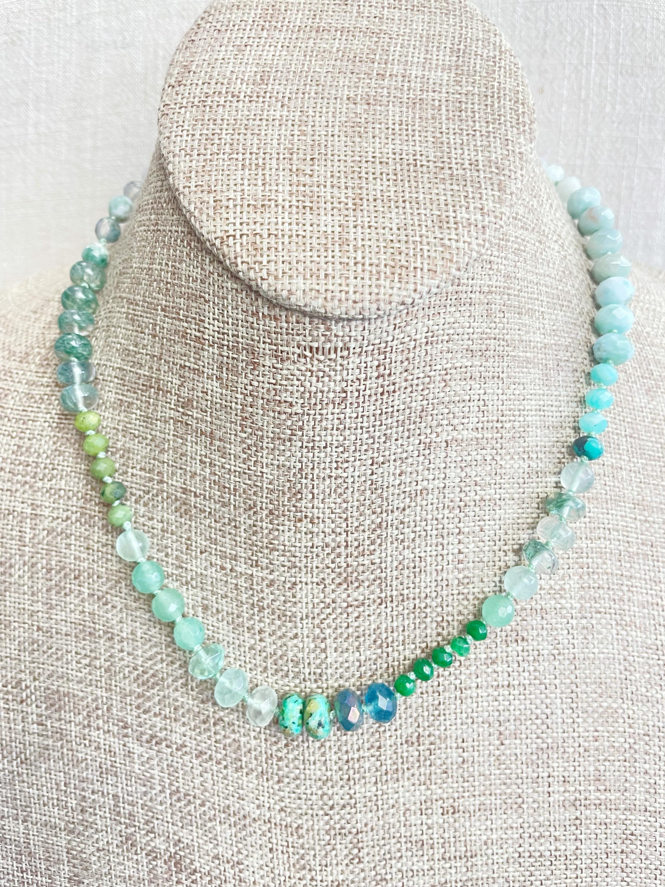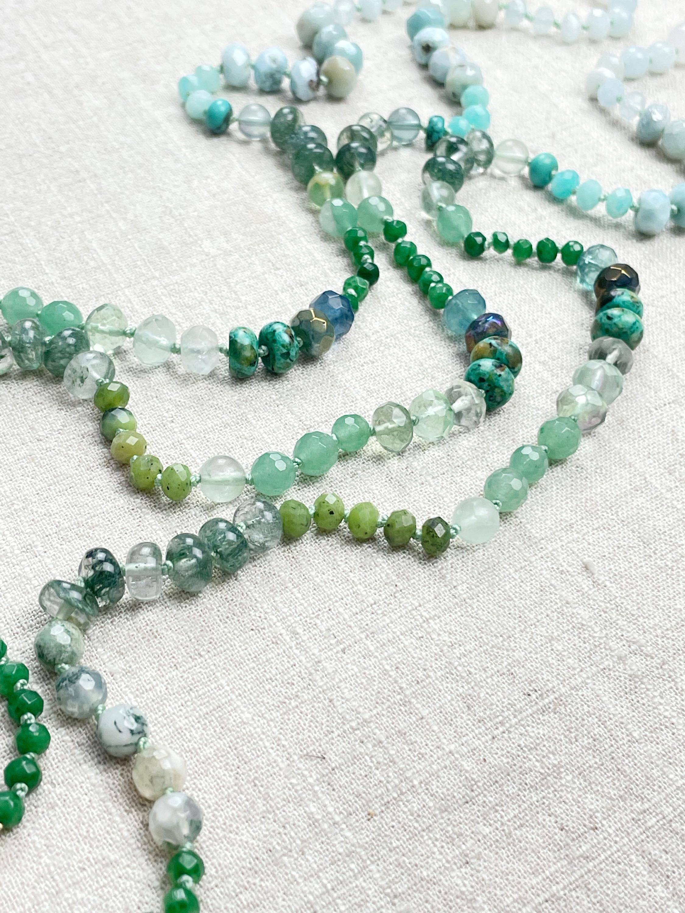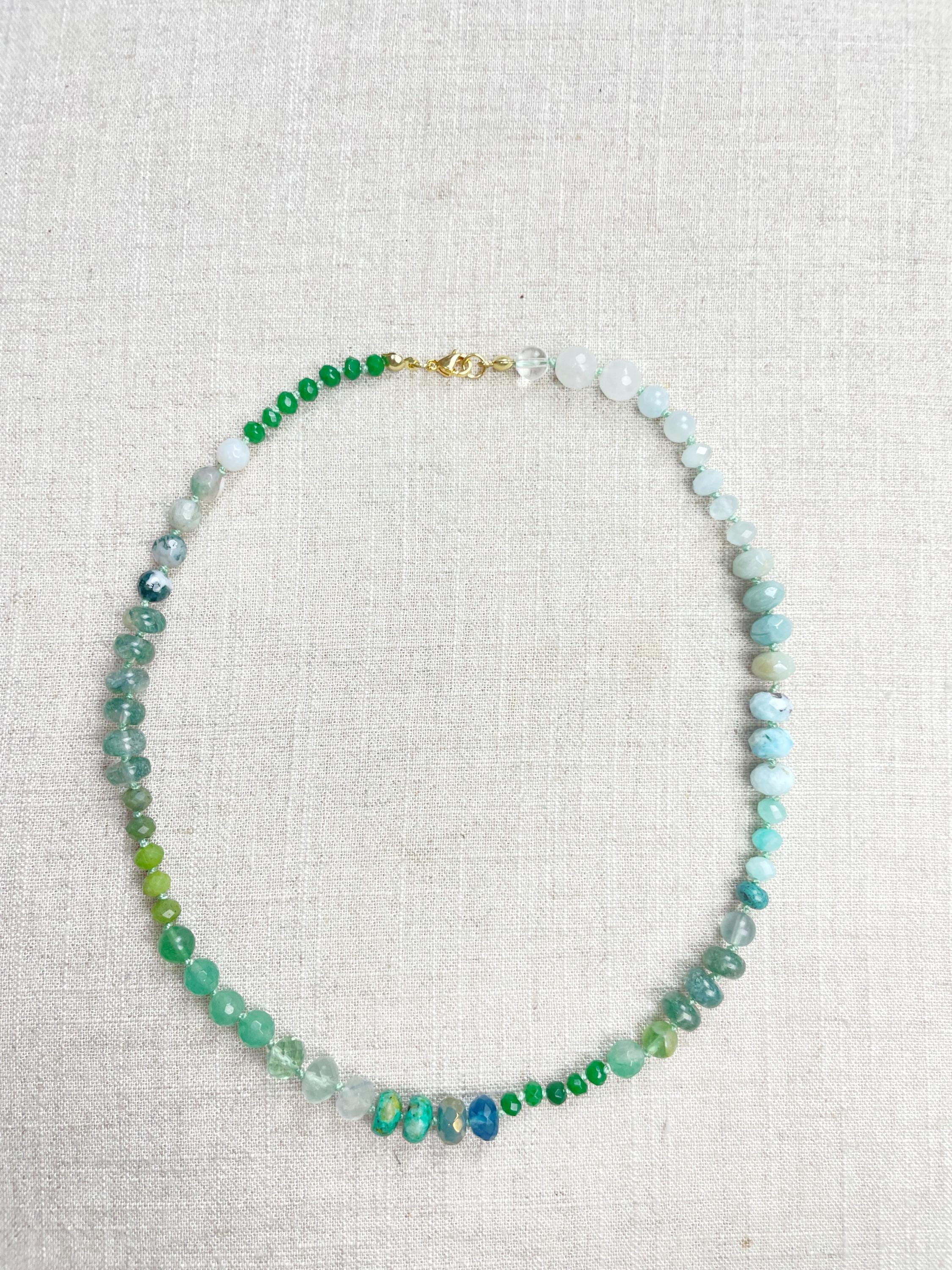 This necklace is made with gemstone beads. The beads range from 4mm to 8mm in size. The necklace includes: dyed jade, moss agate, chlorite quartz, jadeite, fluorite, green avenurine, african turquoise, aura coated amazonite, turquoise, aquamarine, larimar, and clear quartz. The beads are strung on a nylon cording. The necklace is hand-knotted in between each bead. The necklace is finished off with a gold plated stainless steel clasp and logo charm.