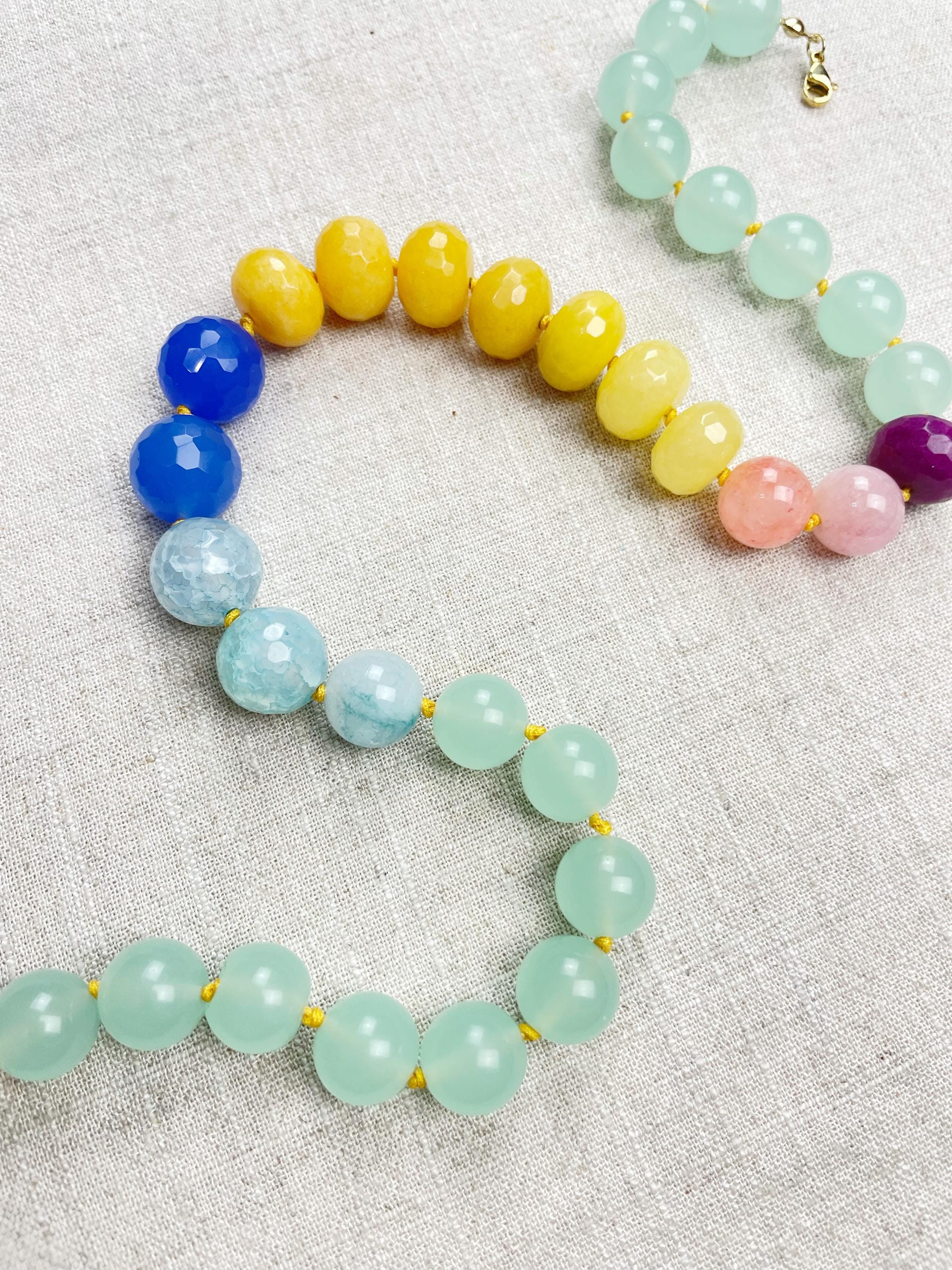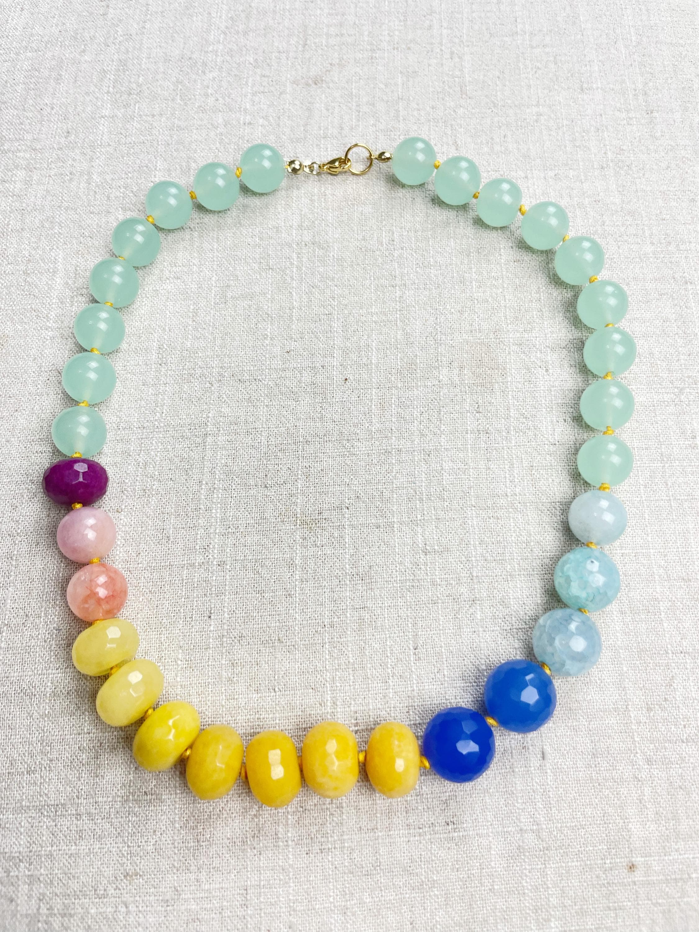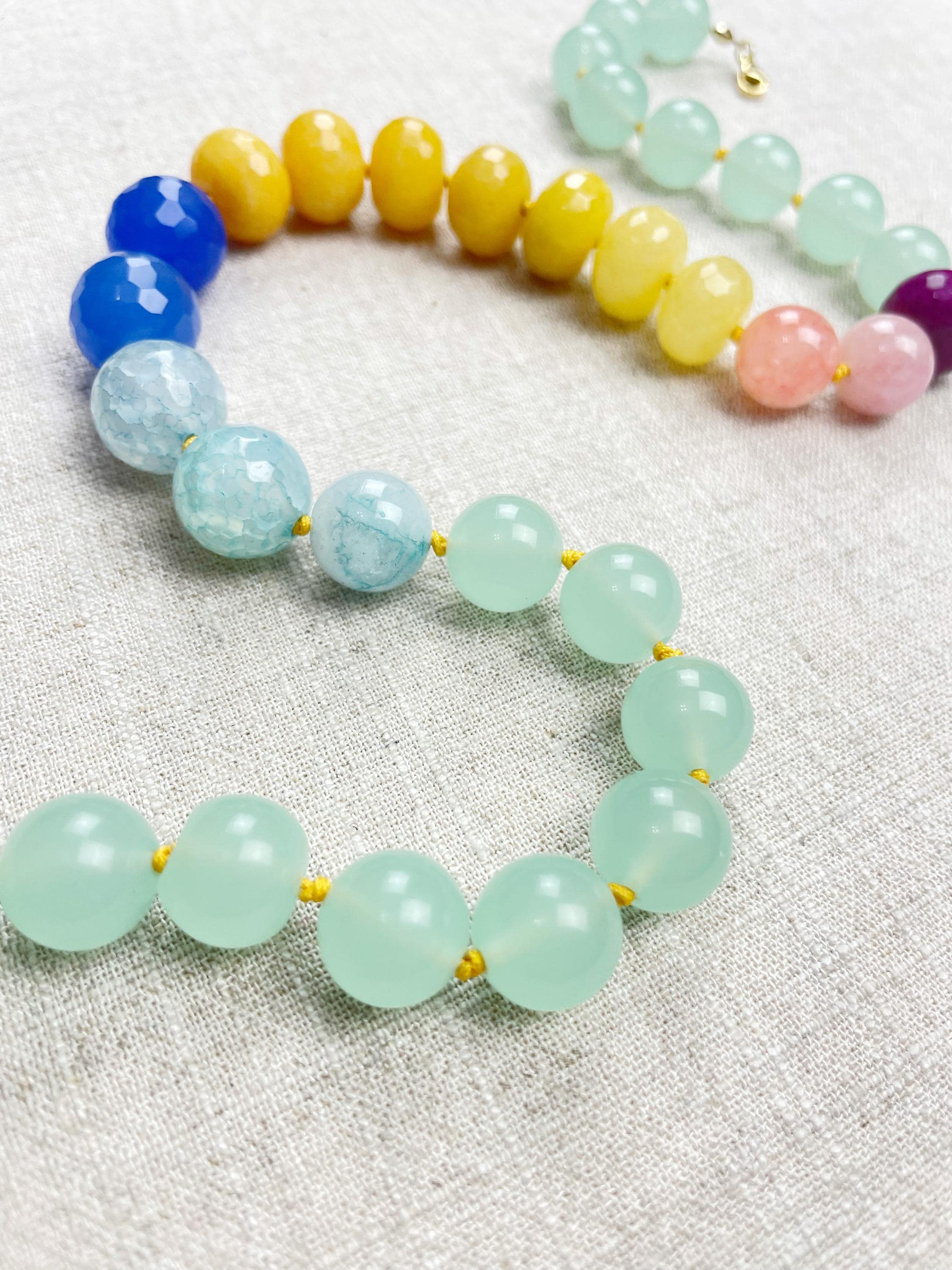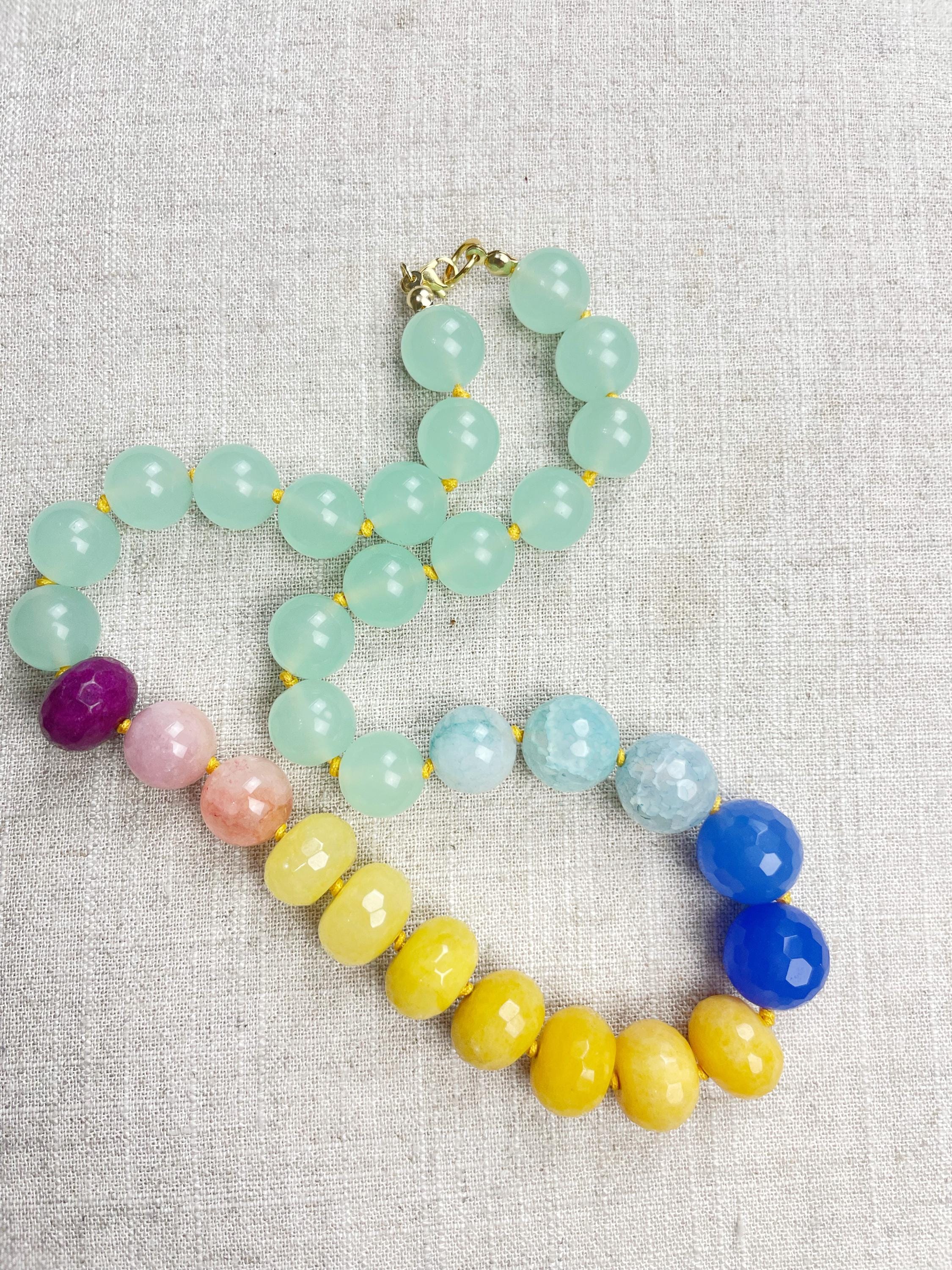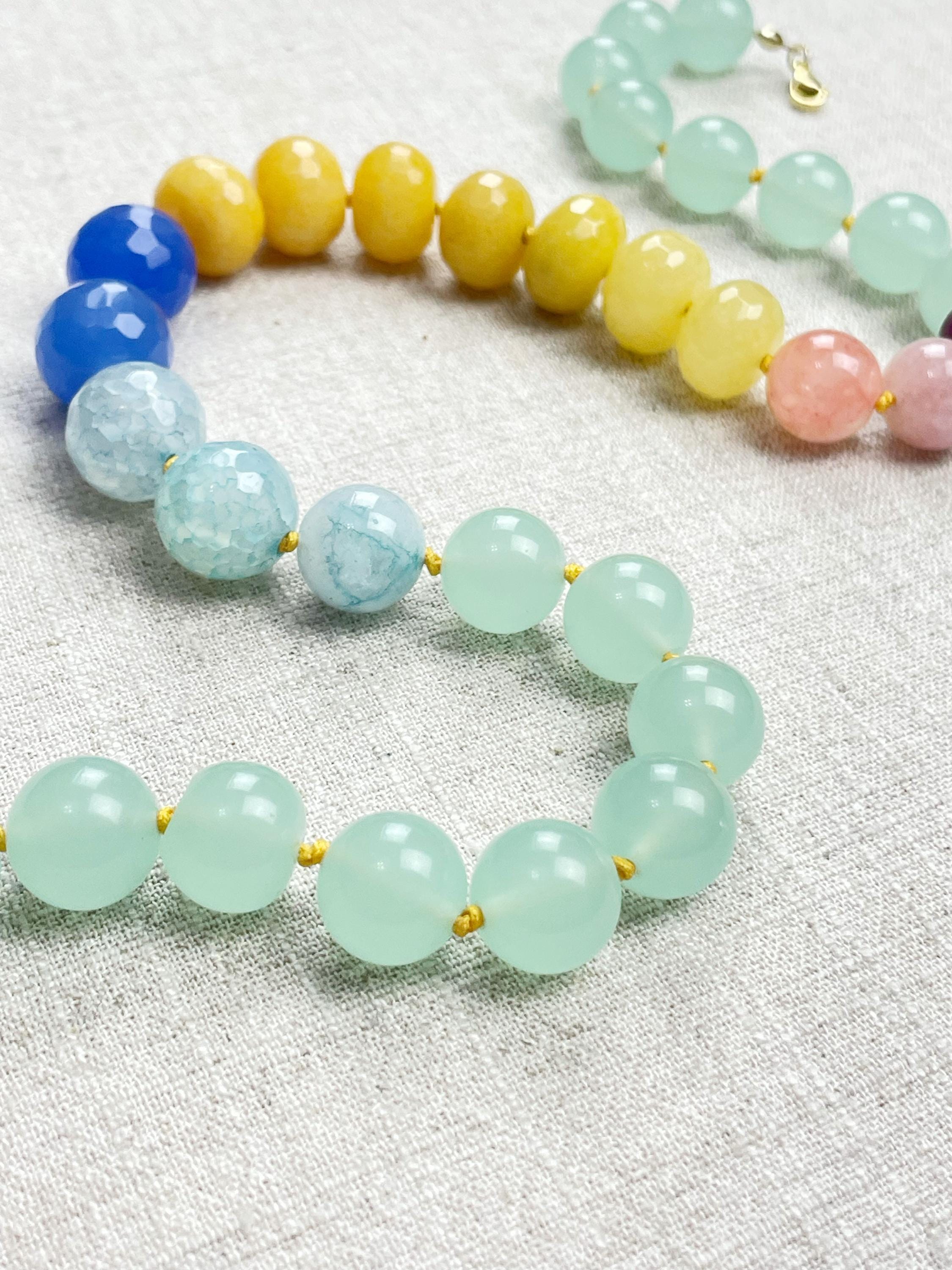 This necklace is made with dyed jade and dyed agate beads. The smaller beads are 12mm and the larger 14mm. Some are smooth and some are faceted. The beads are strung on a nylon cording. The necklace is hand-knotted in between each bead. The necklace is finished off with a gold plated stainless steel clasp and logo charm.