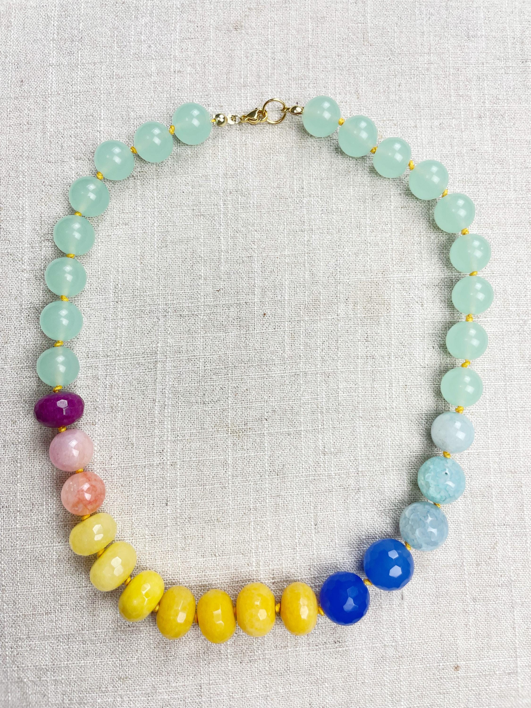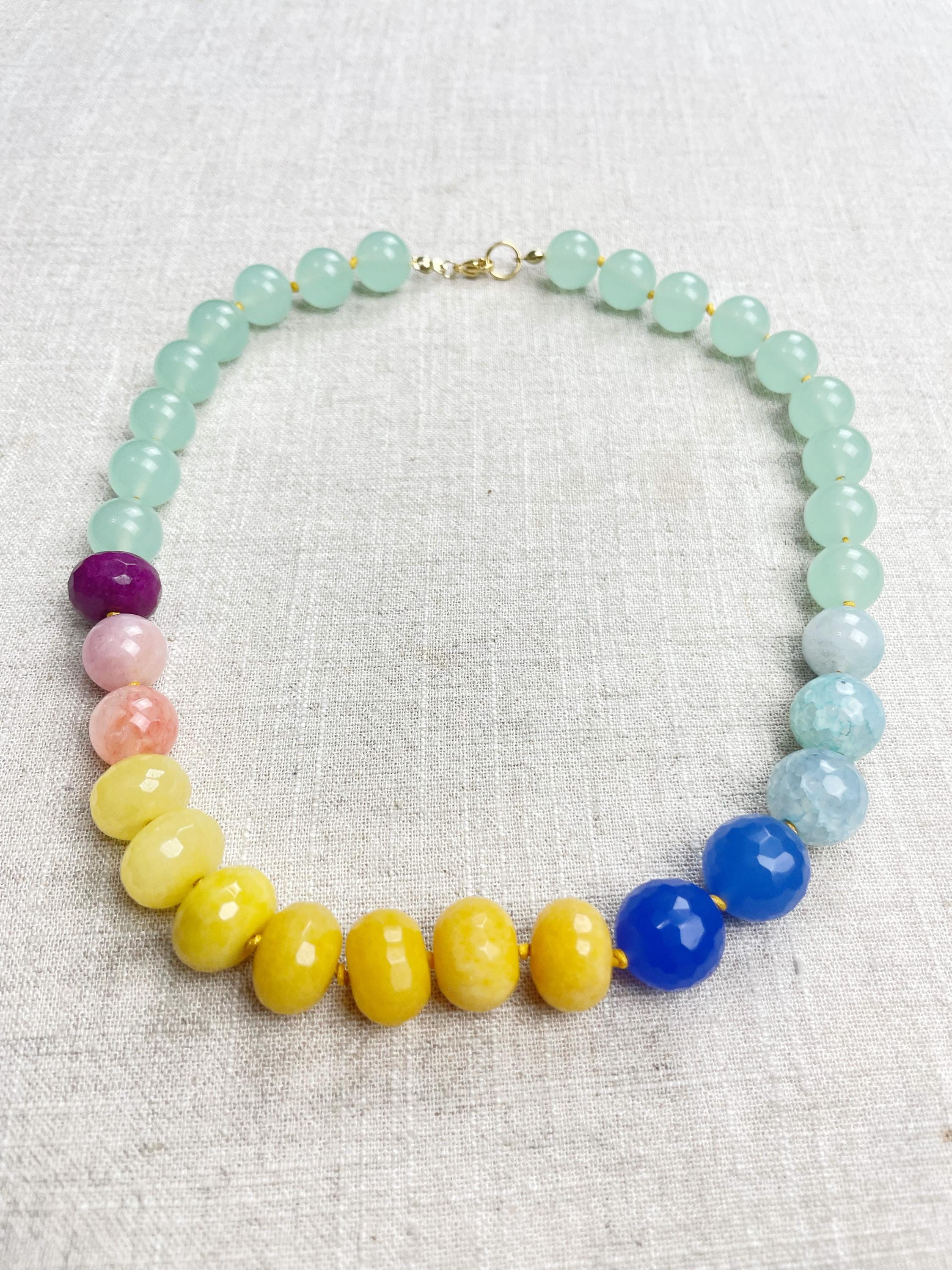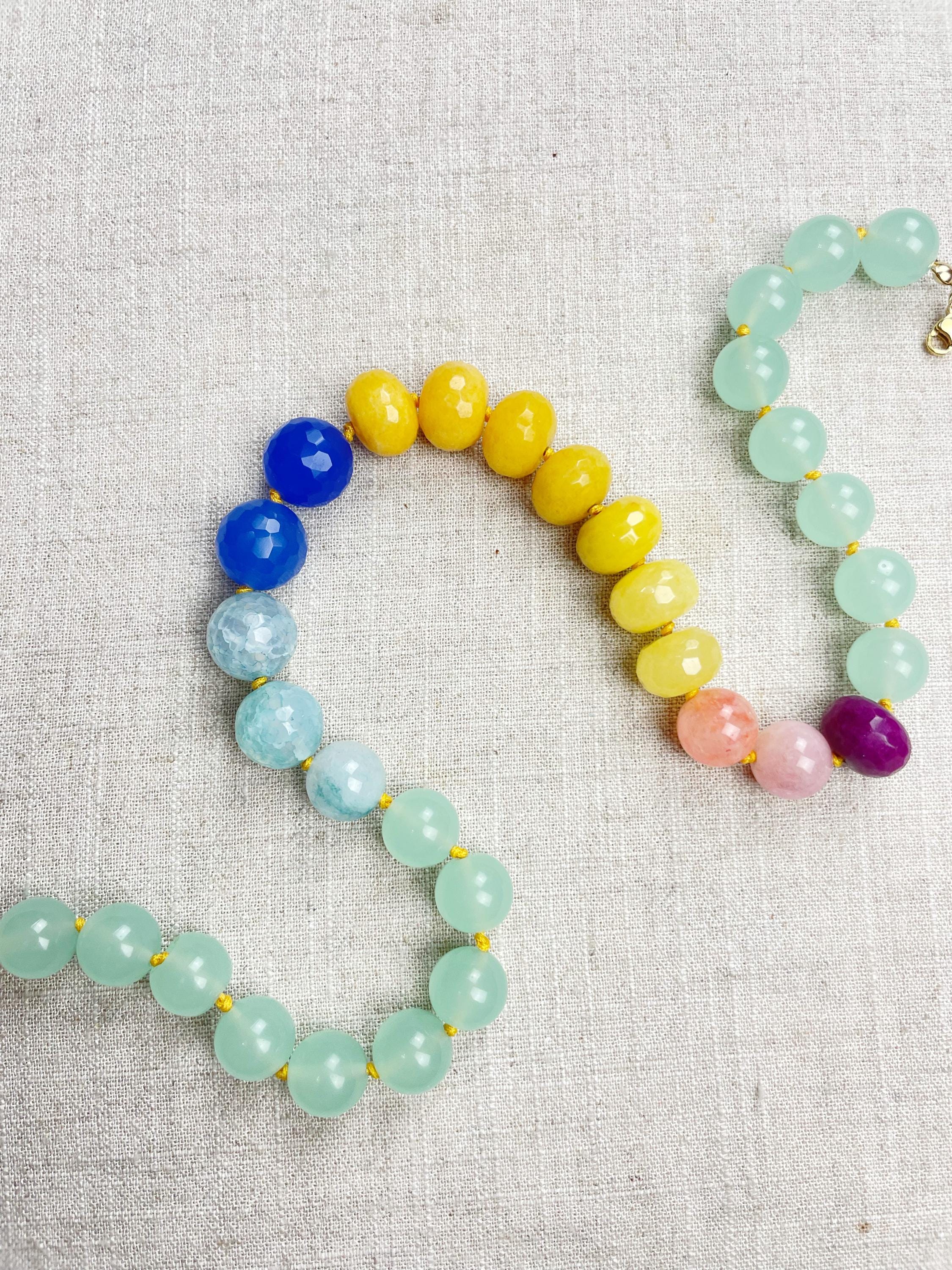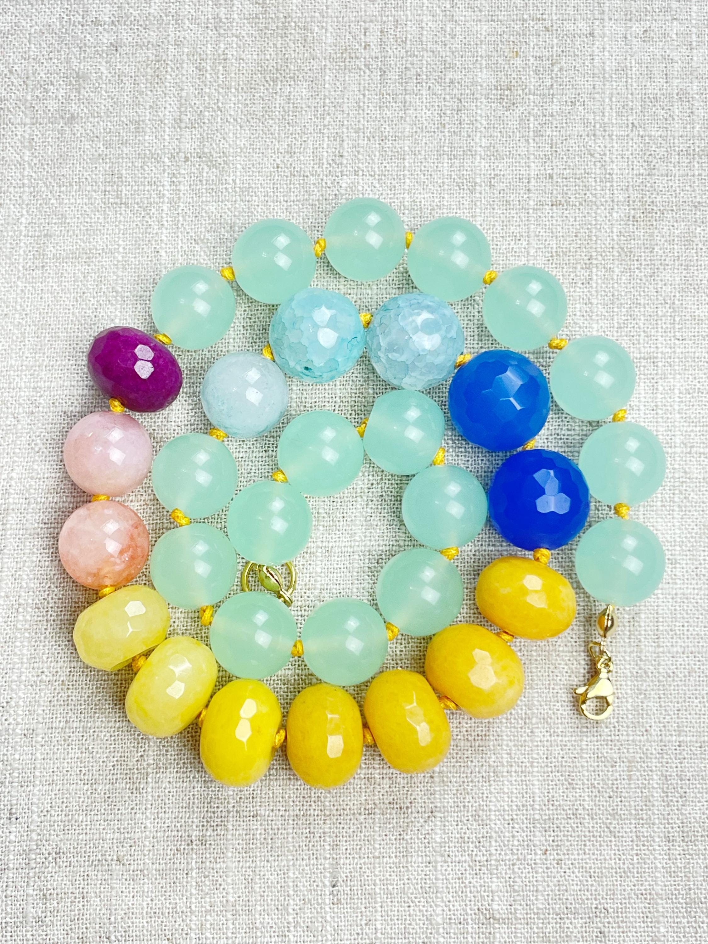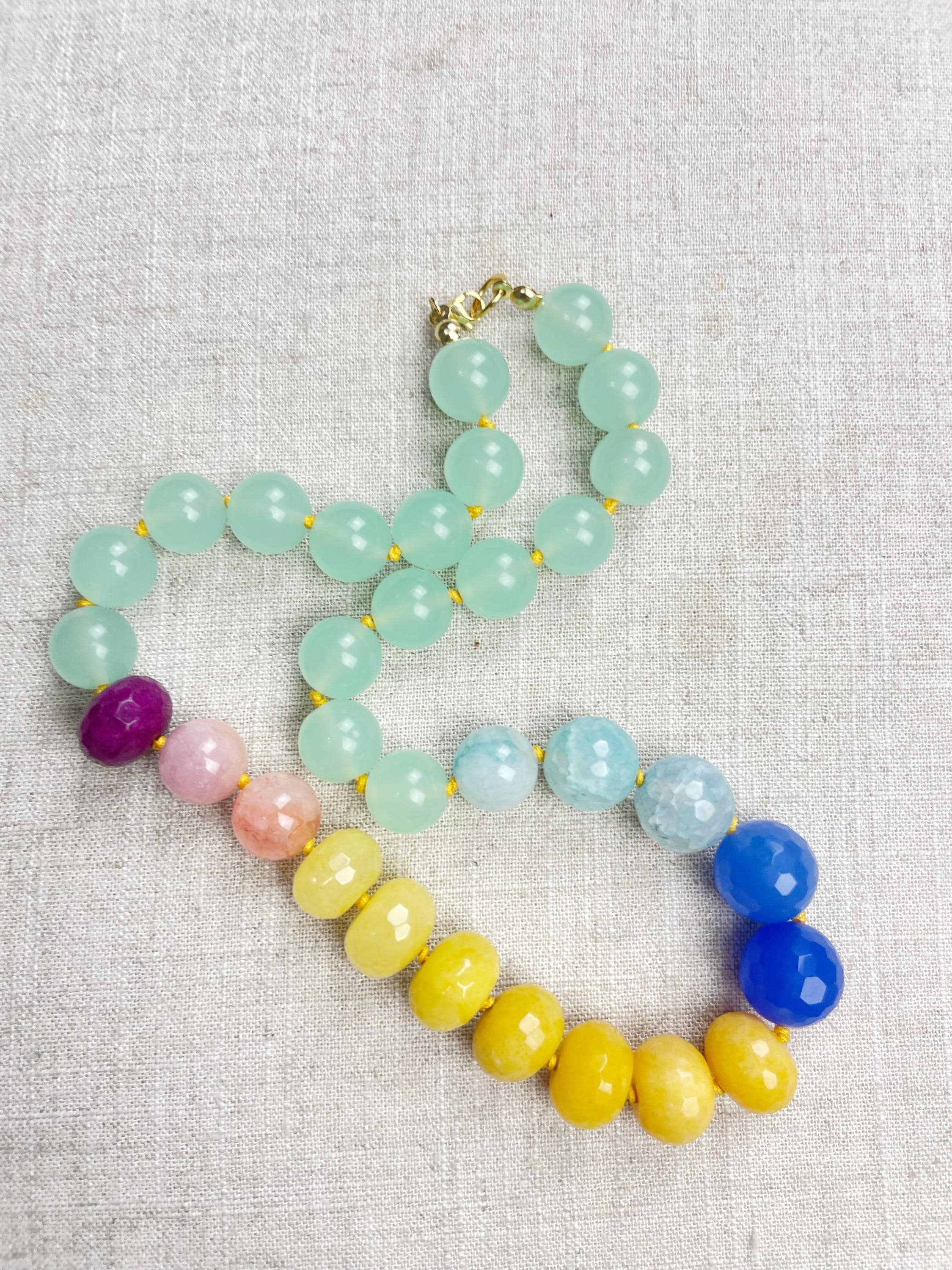 This necklace is made with dyed jade and dyed agate beads. The smaller beads are 12mm and the larger 14mm. Some are smooth and some are faceted. The beads are strung on a nylon cording. The necklace is hand-knotted in between each bead. The necklace is finished off with a gold plated stainless steel clasp and logo charm.