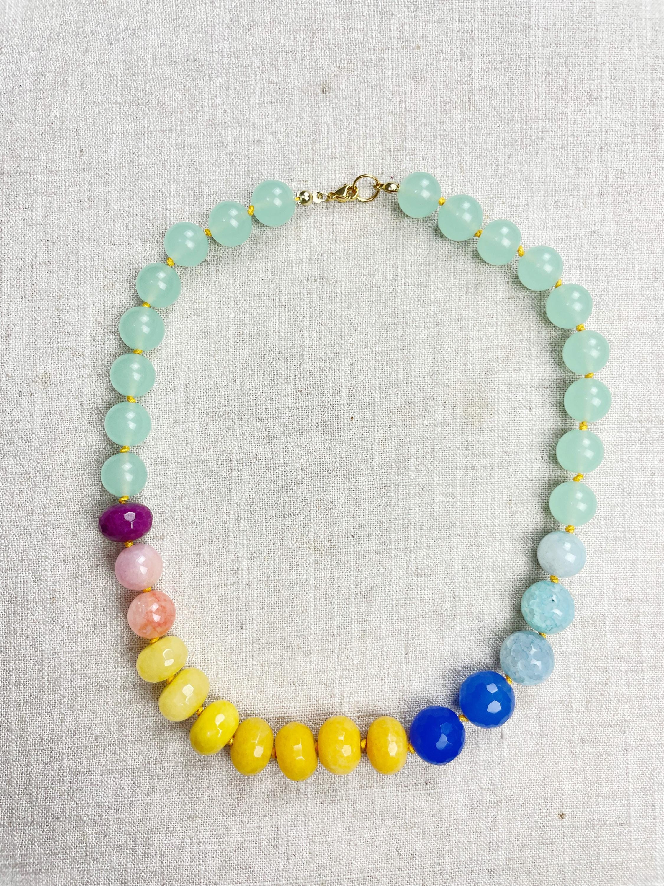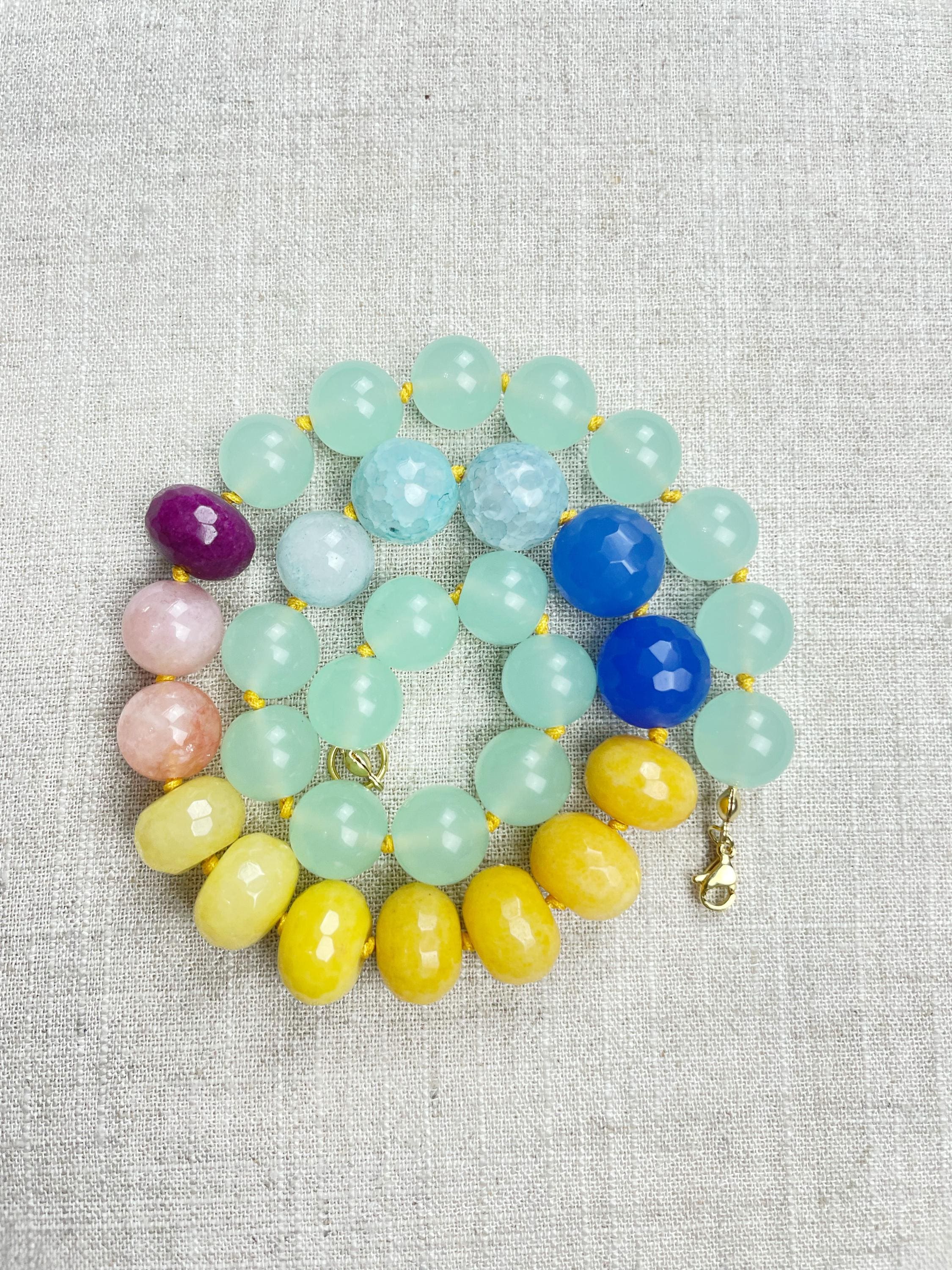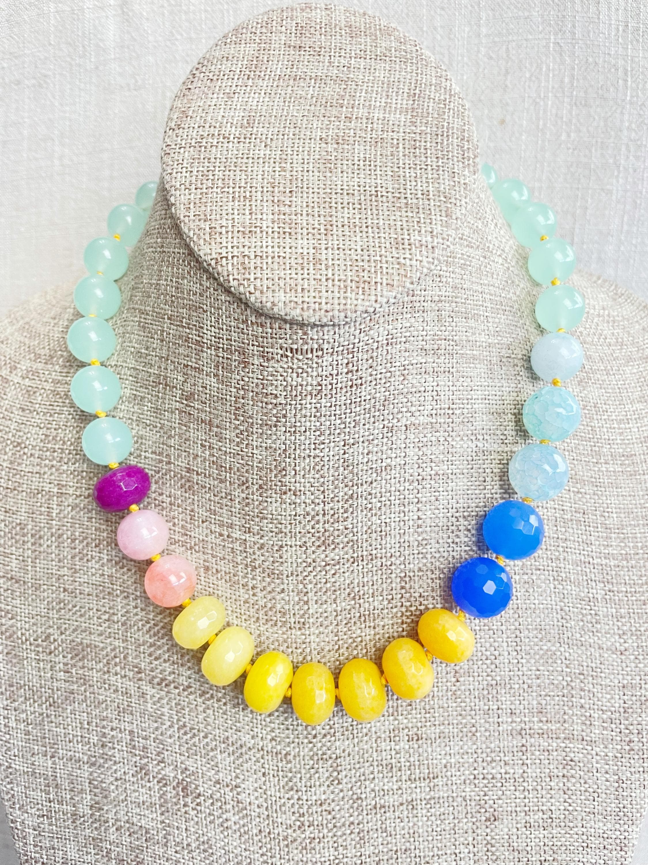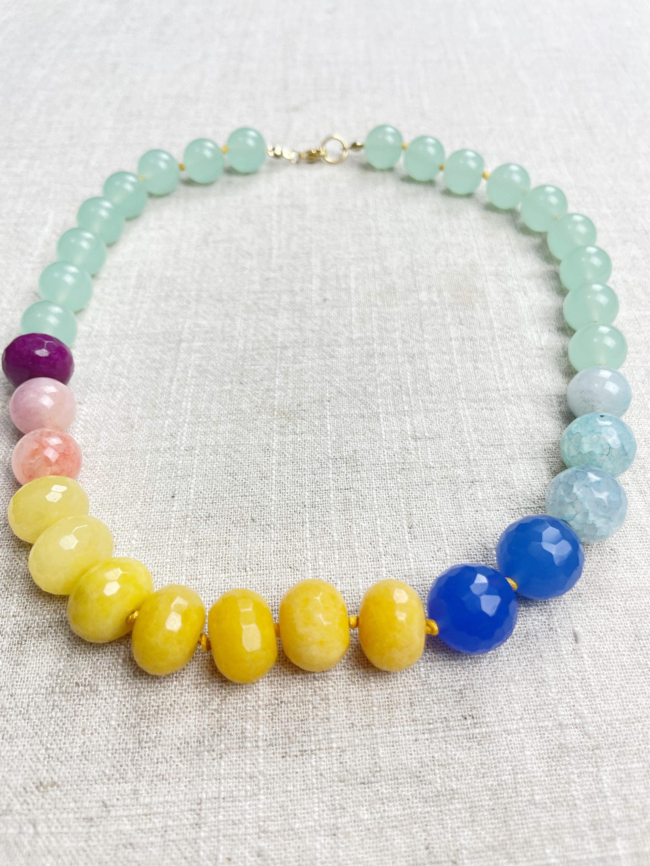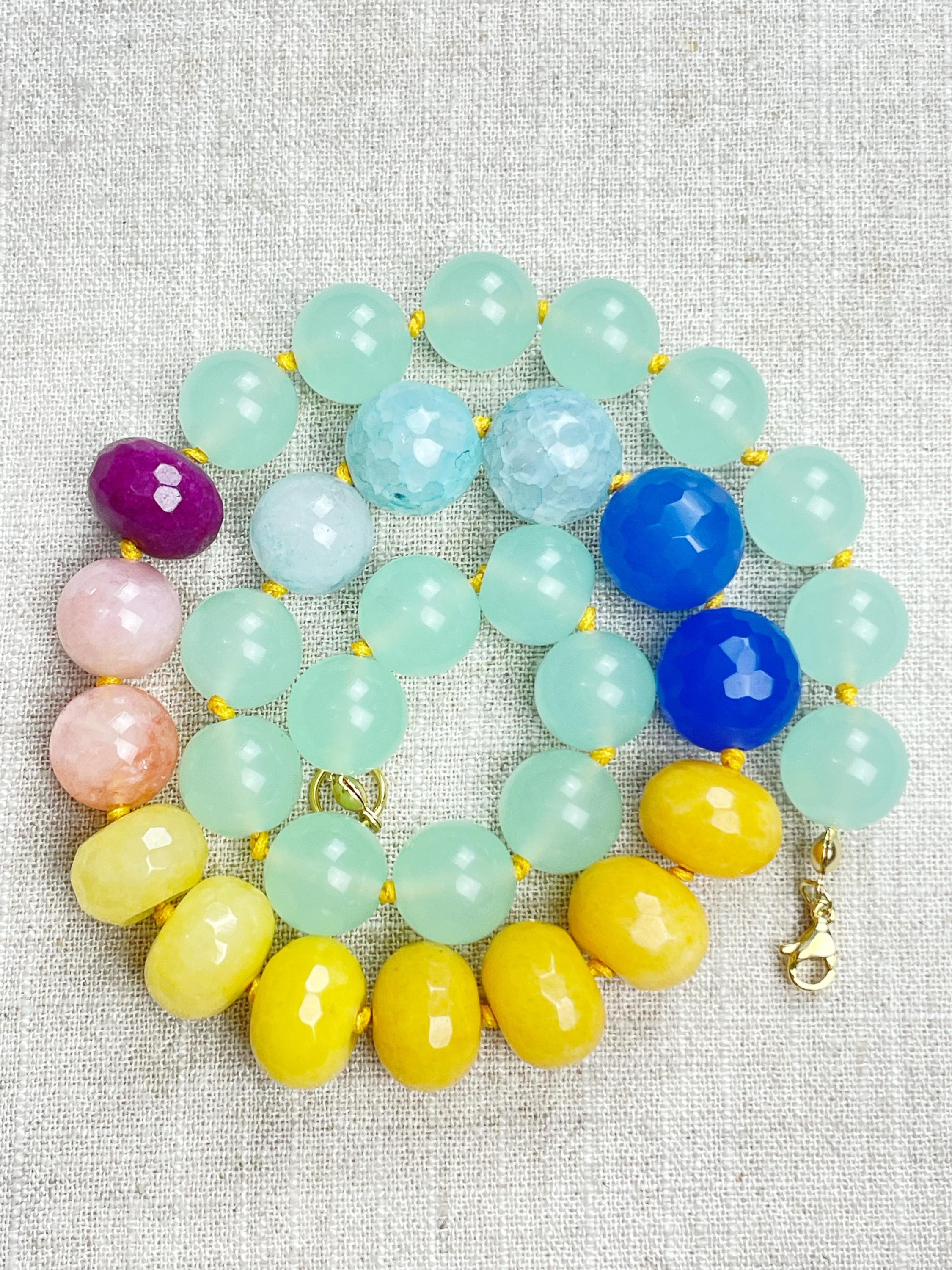 This necklace is made with dyed jade and dyed agate beads. The smaller beads are 12mm and the larger 14mm. Some are smooth and some are faceted. The beads are strung on a nylon cording. The necklace is hand-knotted in between each bead. The necklace is finished off with a gold plated stainless steel clasp and logo charm.