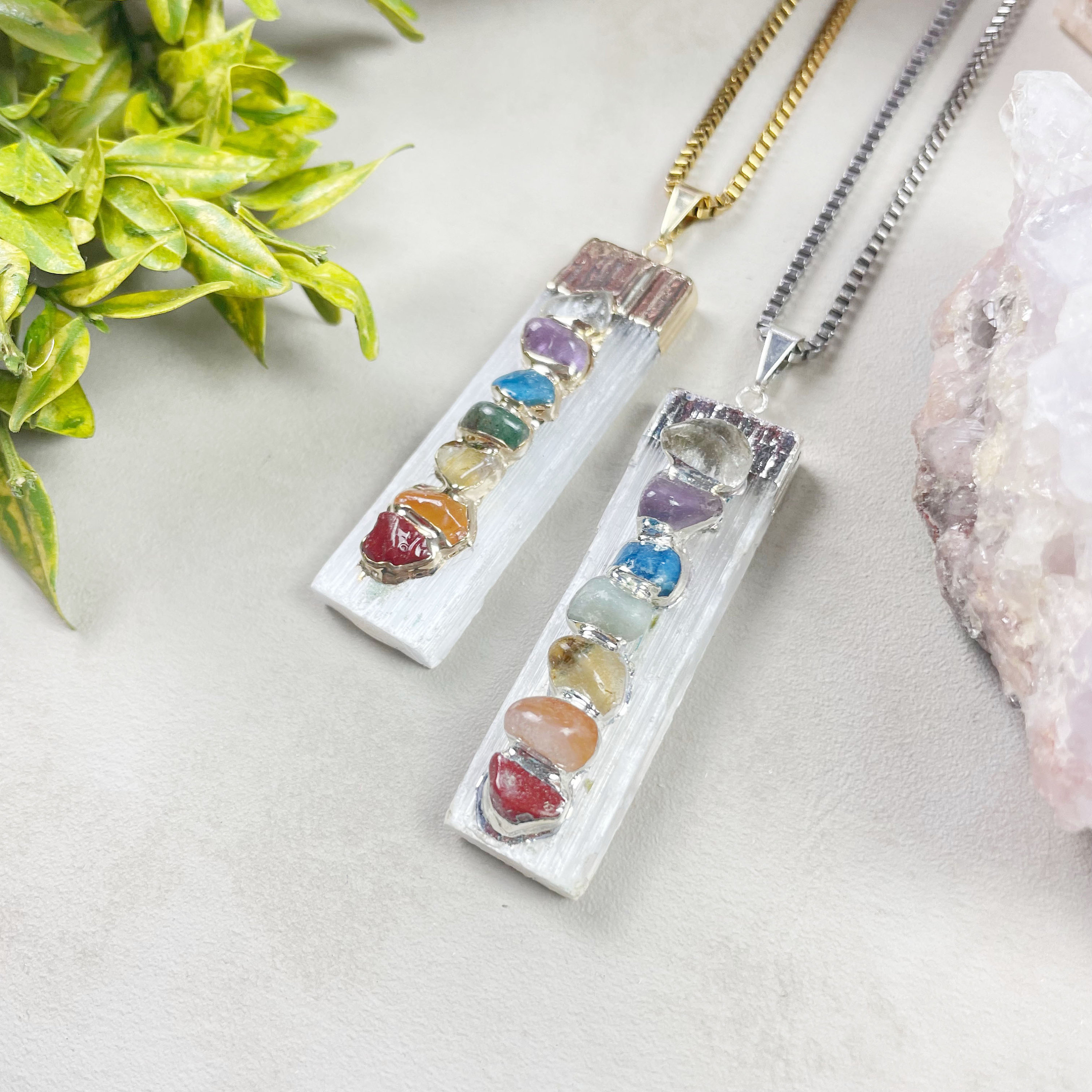 This necklace is made from a selenite stone. The stone pendant has 7 chakra stones that are attached. The top of the selenite and around the chakra stones the pendant is plated with 24k gold or silver. The pendant hangs from a stainless steel gold or silver plated chain.