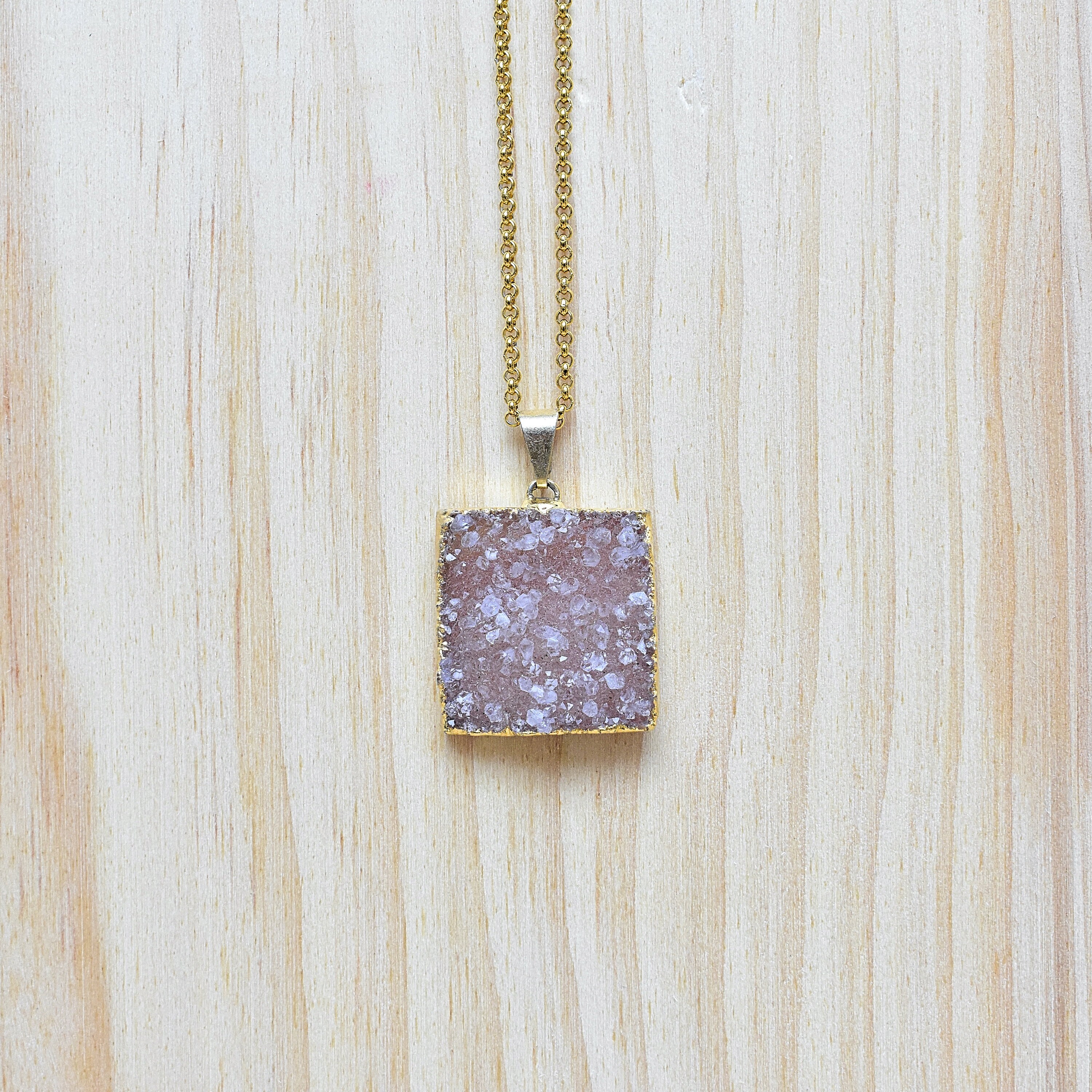 This necklace is made from a natural quartz druzy which has been cut into a square shape. The stone is plated with 24k gold on the edges and hangs from a gold stainless steel chain.