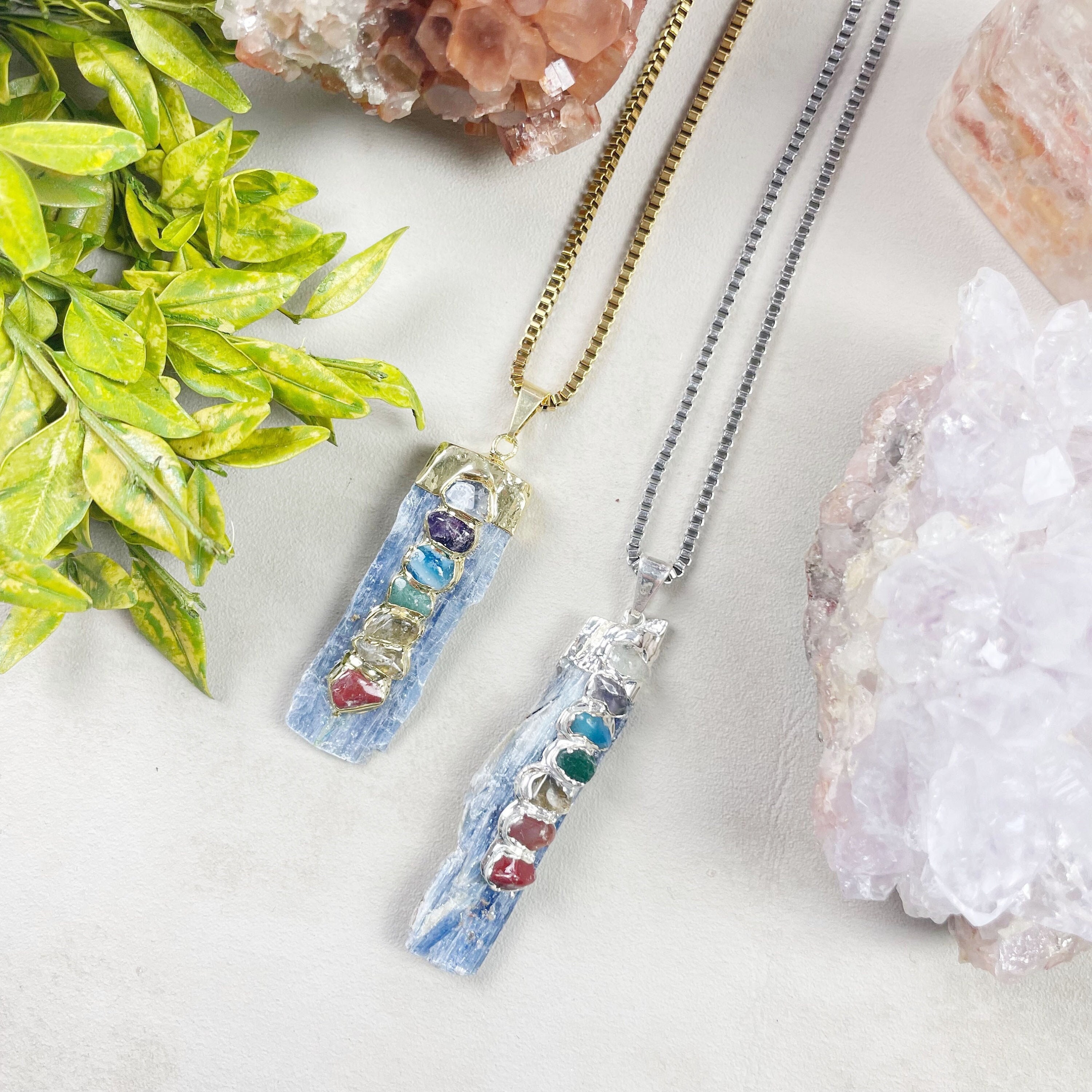 This necklace is made from blue kyanite stone. The stone pendant has 7 chakra stones that are attached. The top of the kyanite and around the chakra stones the pendant is plated with 24k gold or silver. The pendant hangs from a stainless steel gold or silver plated chain.