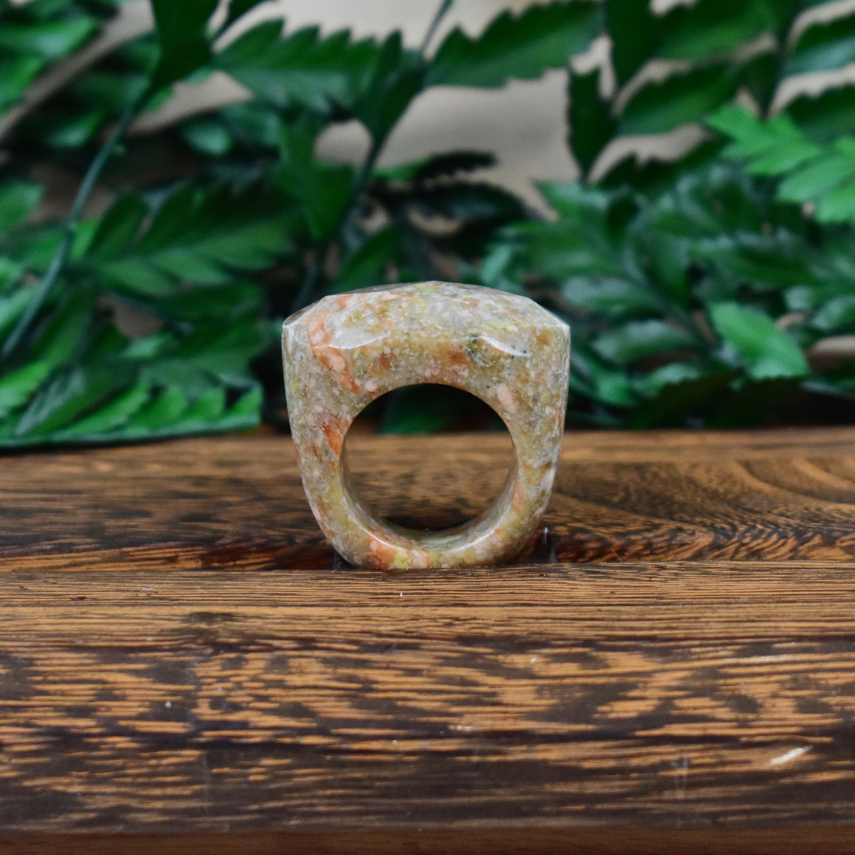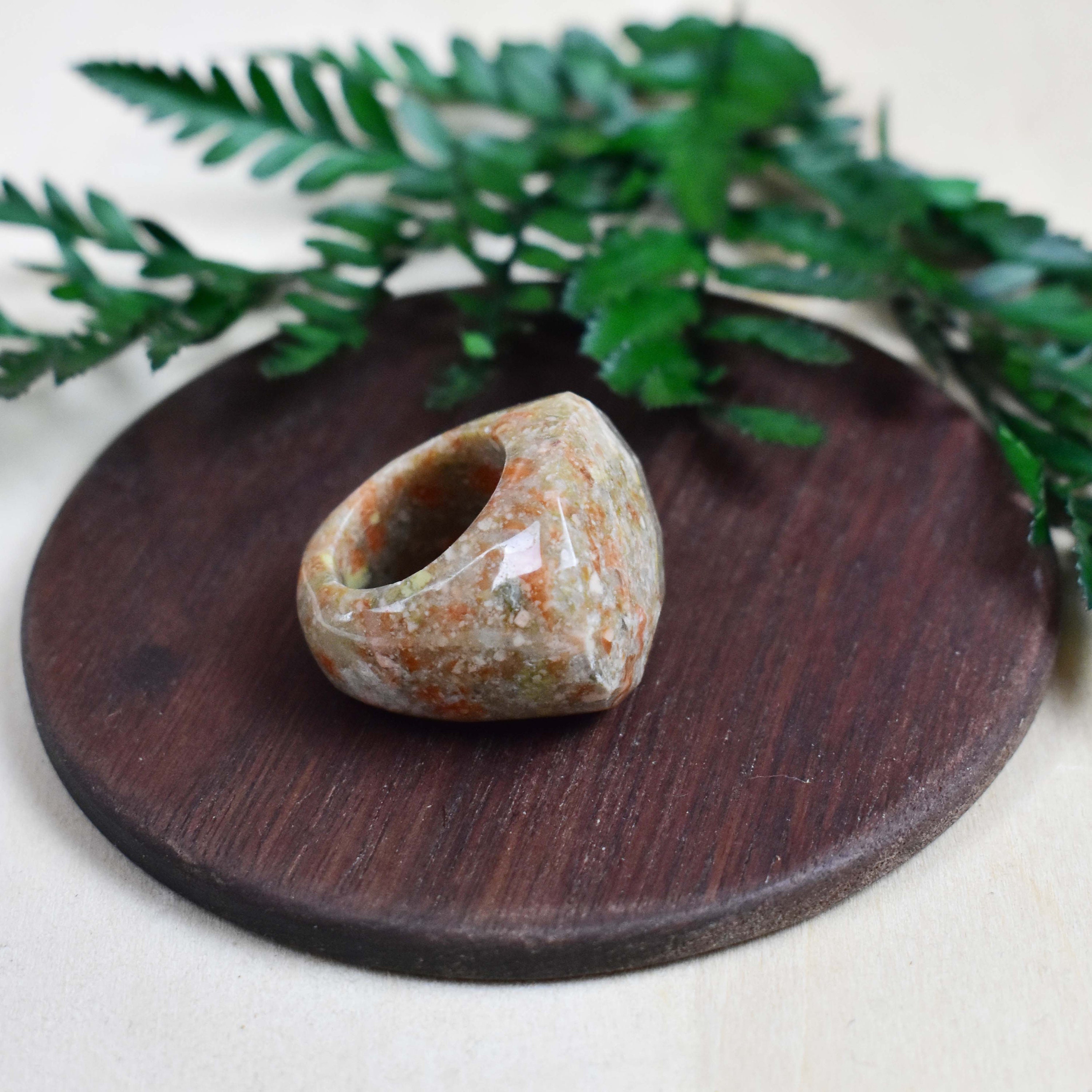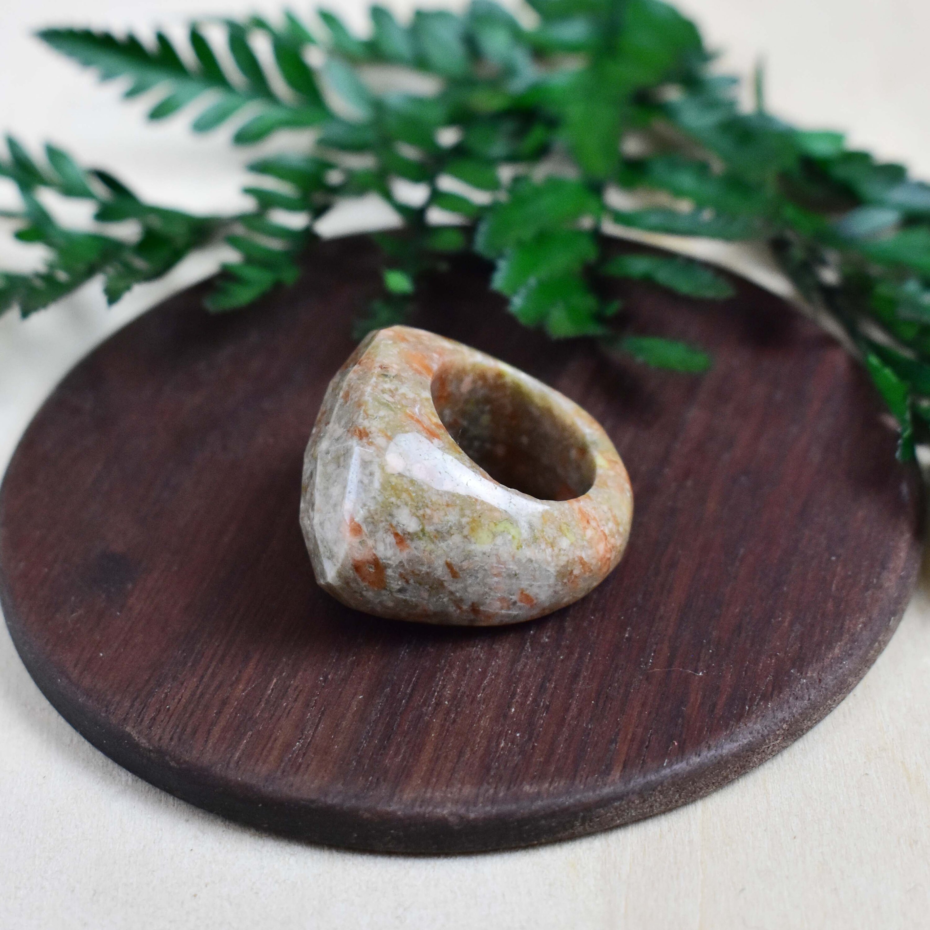 This ring is made from a natural autumn jasper stone. The stone is carved into a chunky ring with a faceted top.