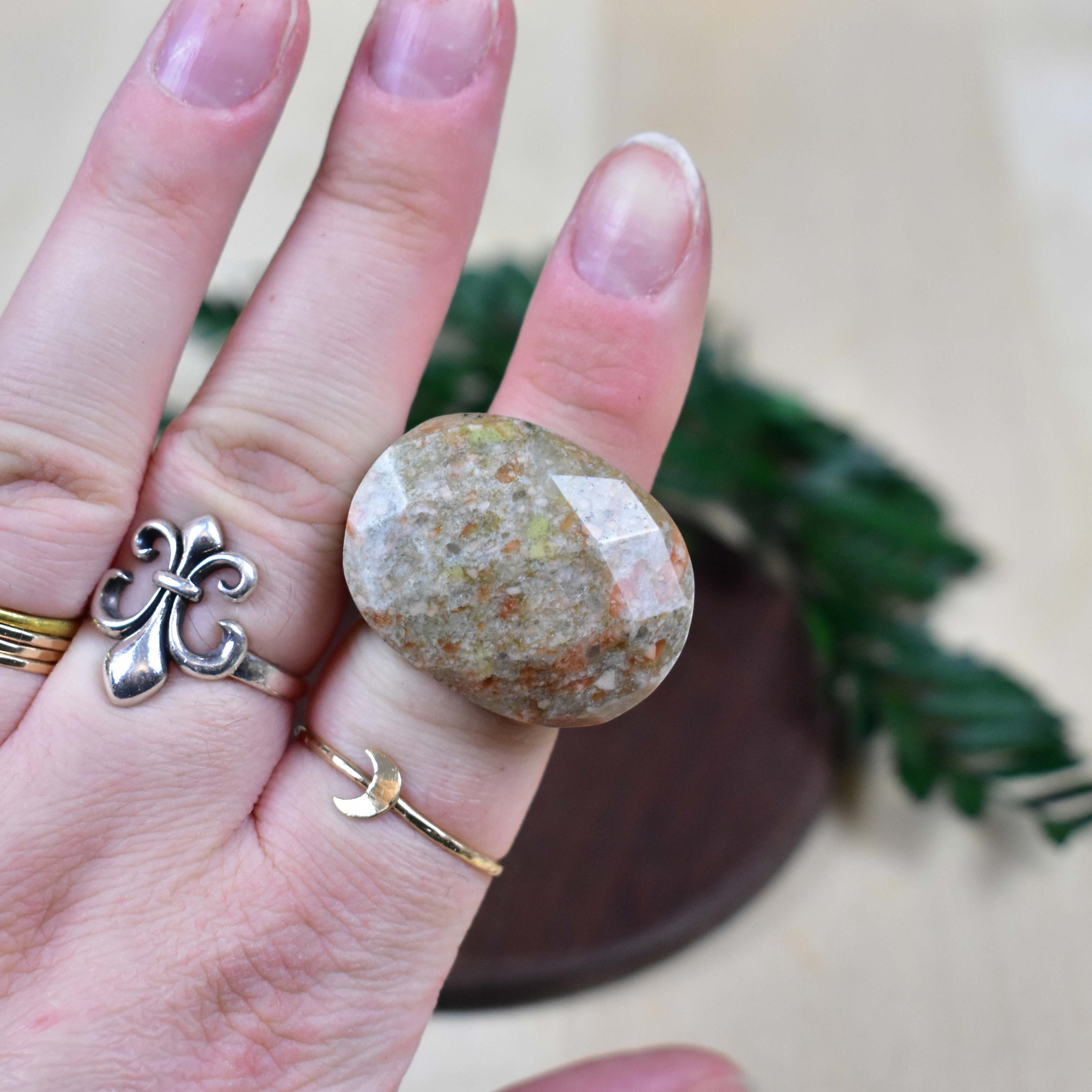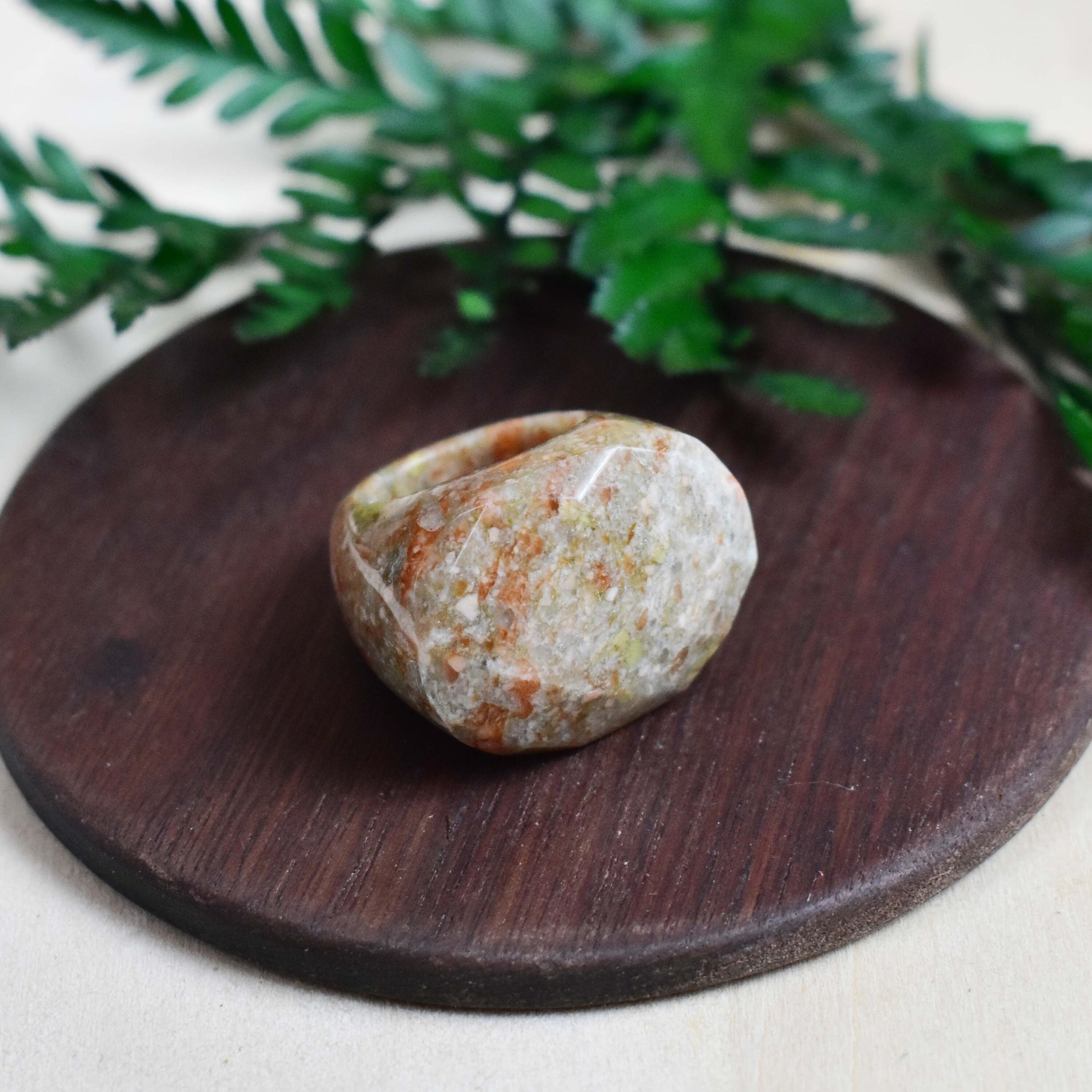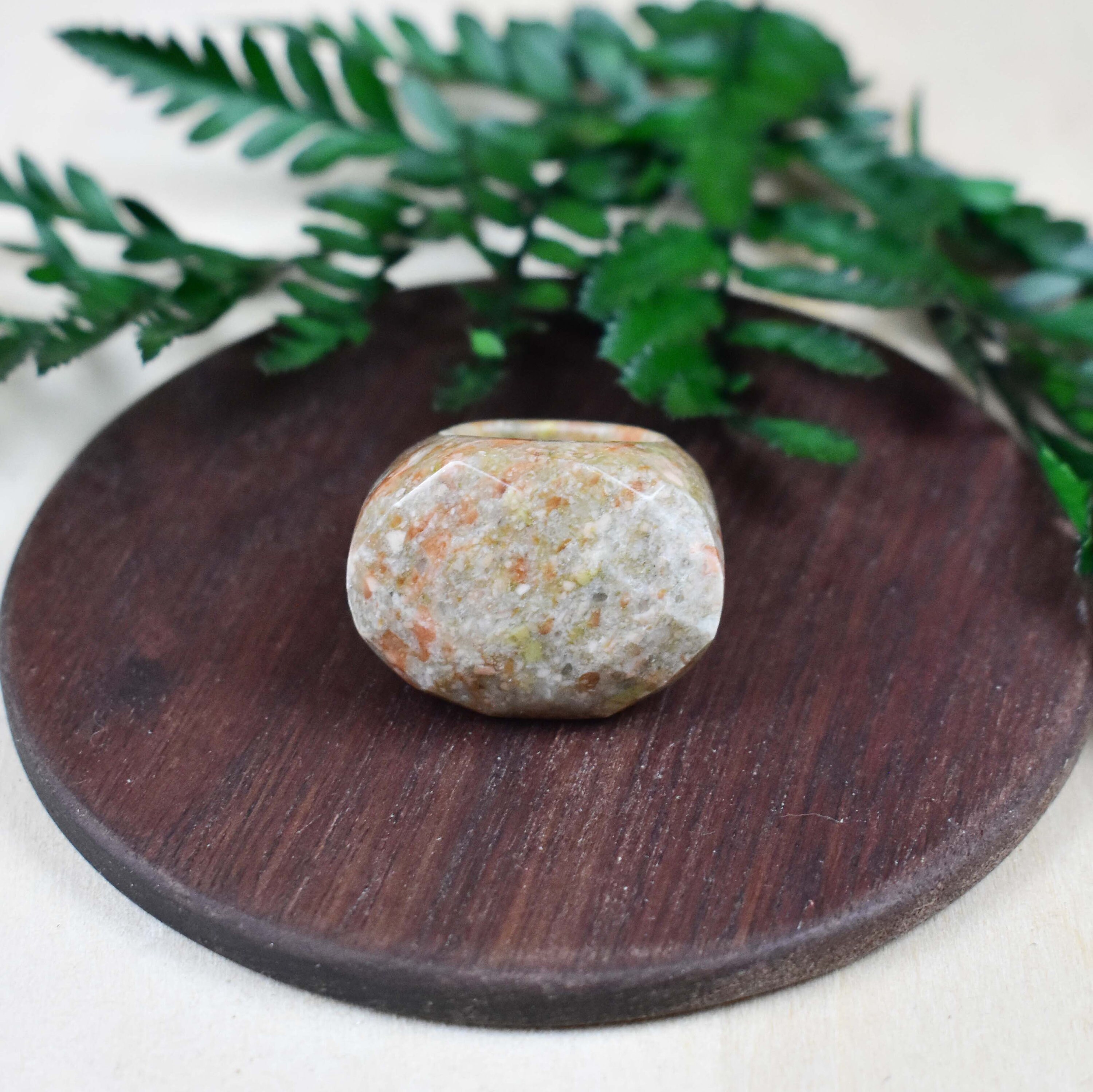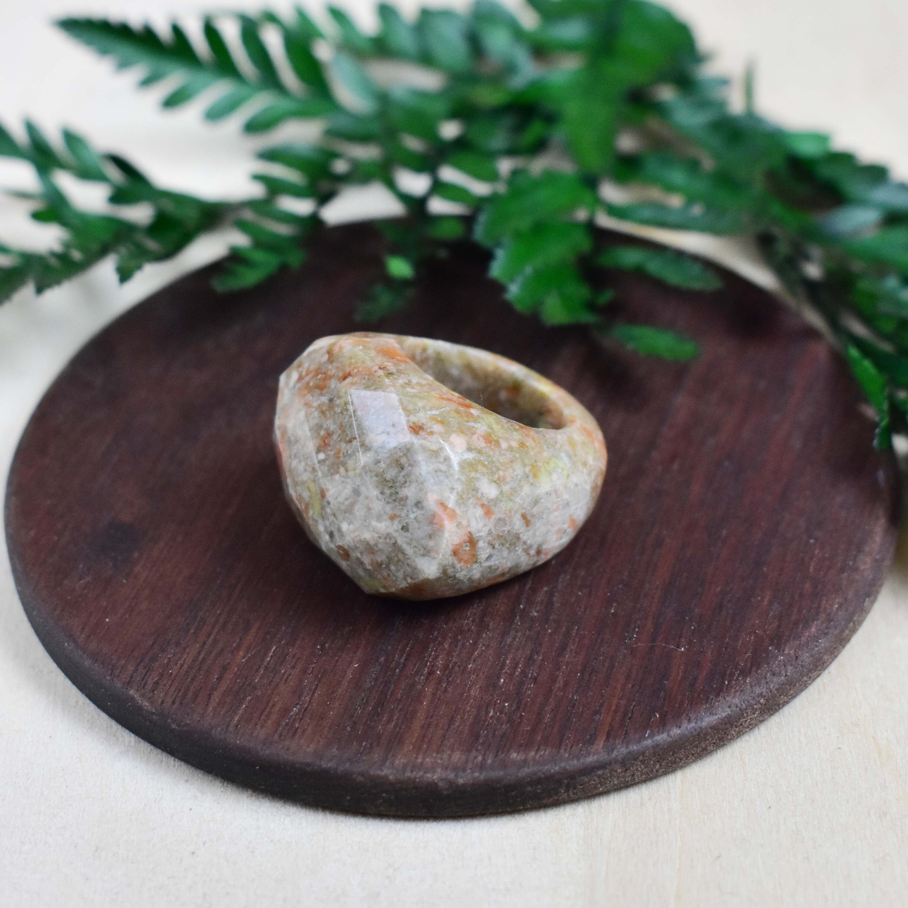 This ring is made from a natural autumn jasper stone. The stone is carved into a chunky ring with a faceted top.